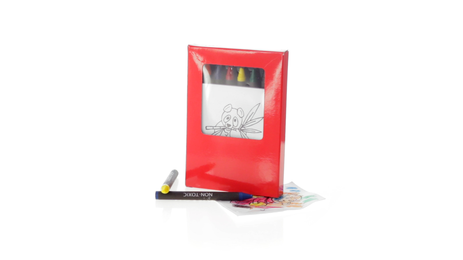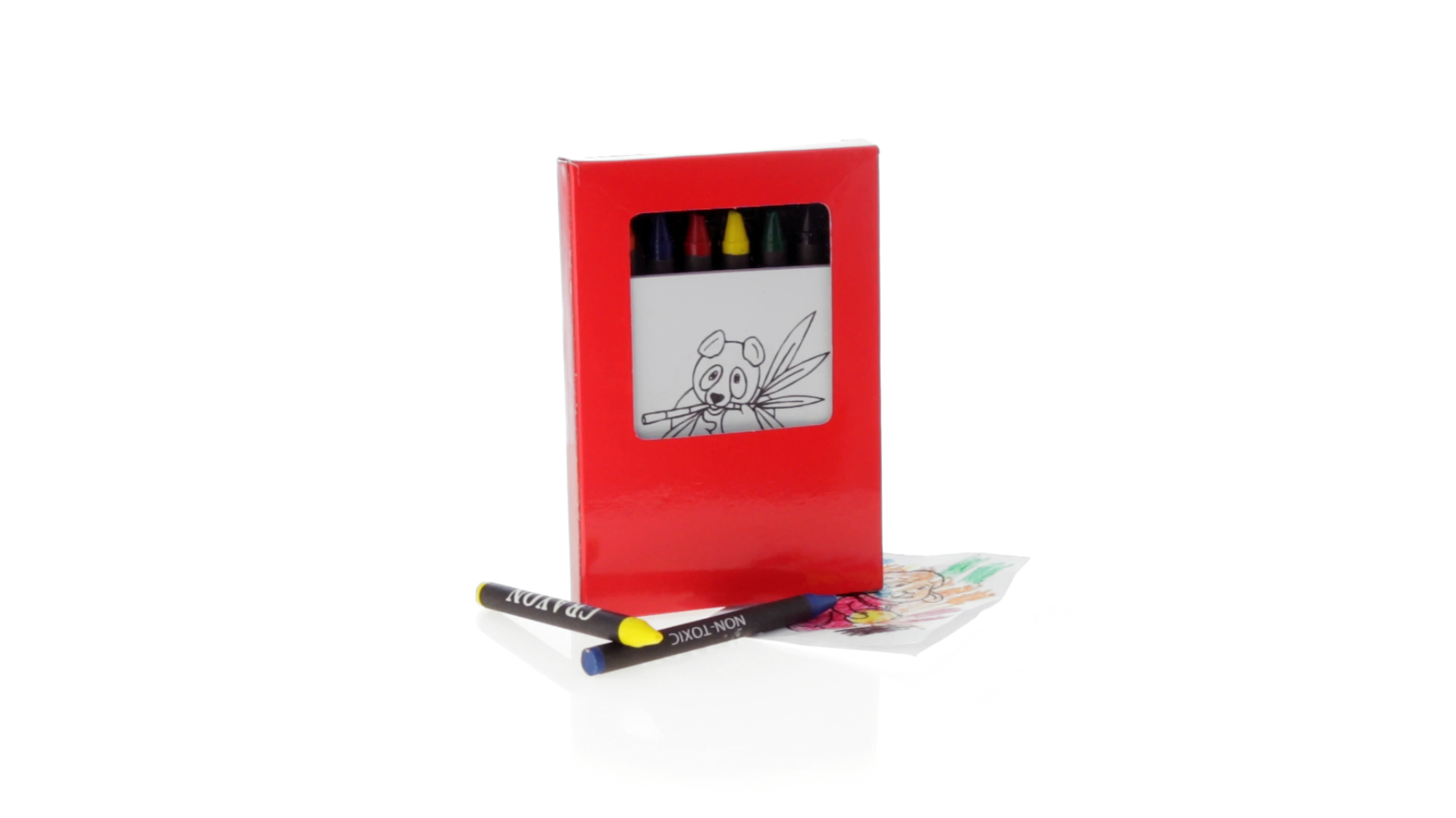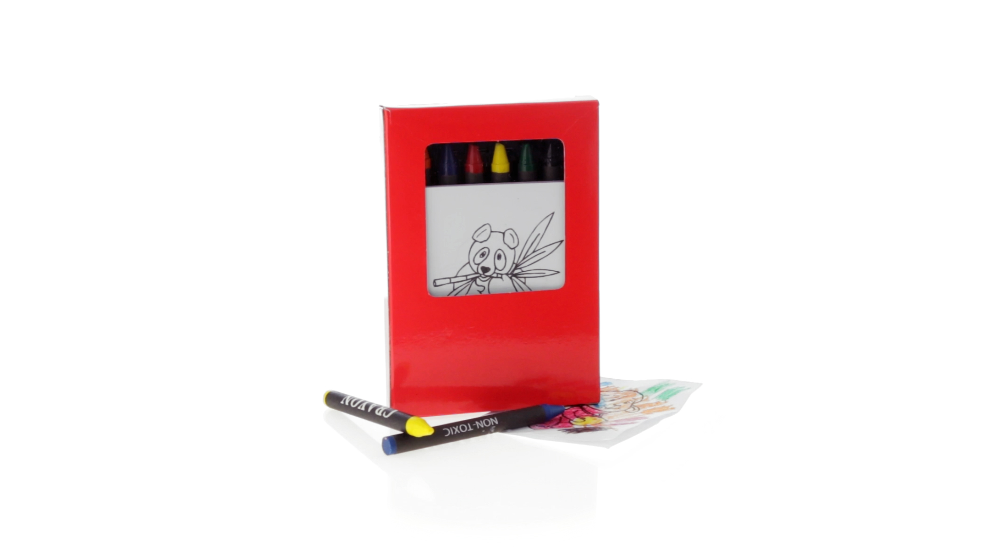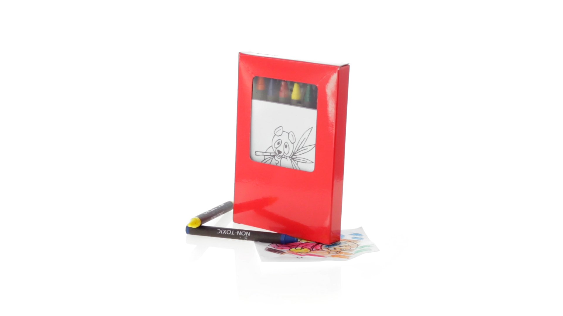 7-teiliges Mal-Set, präsentiert in einer Kartonschachtel in lebendigen Farben. Enthält 6 Wachsmalstifte mit zylinderförmigem Gehäuse in verschiedenen Farben und einen Block mit lustigen Motiven zum Ausmalen.