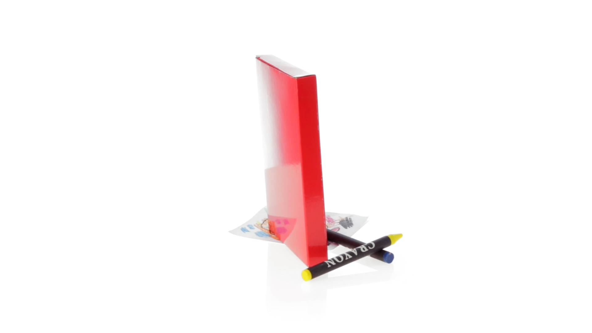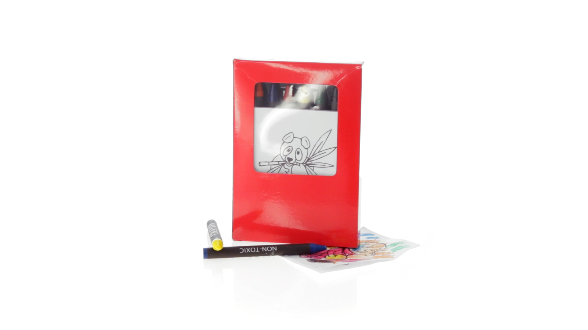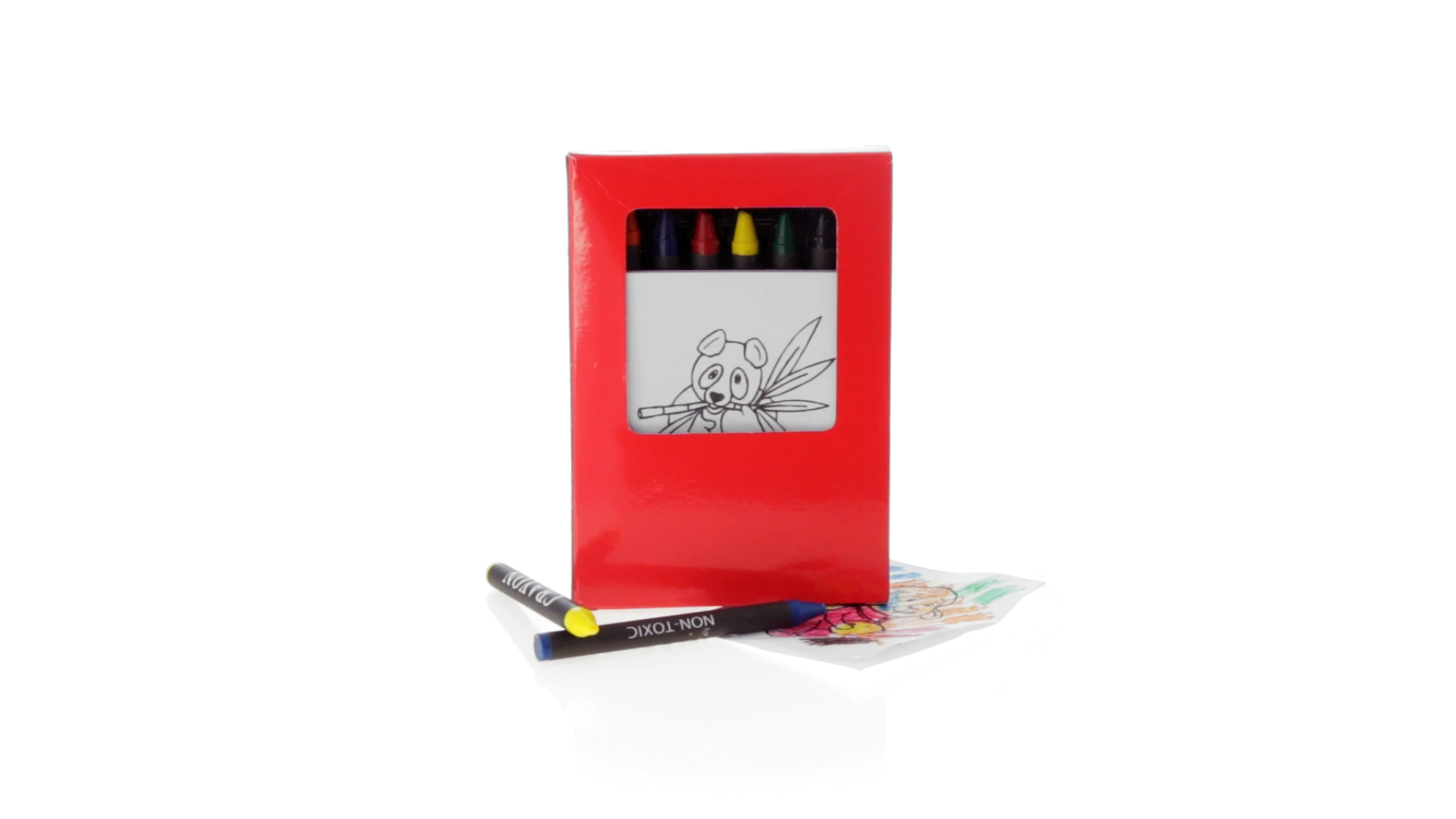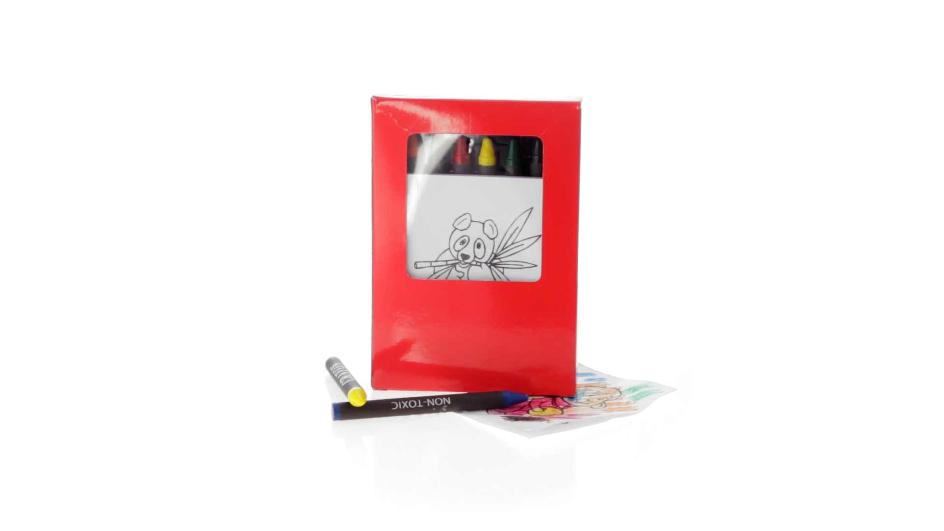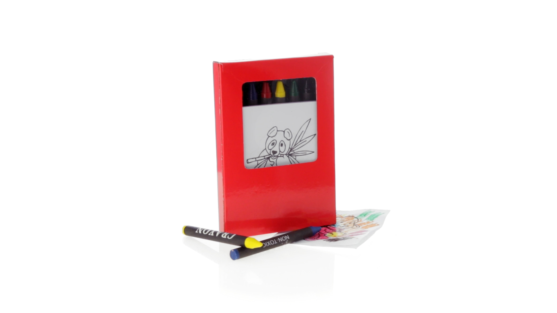 7-teiliges Mal-Set, präsentiert in einer Kartonschachtel in lebendigen Farben. Enthält 6 Wachsmalstifte mit zylinderförmigem Gehäuse in verschiedenen Farben und einen Block mit lustigen Motiven zum Ausmalen.