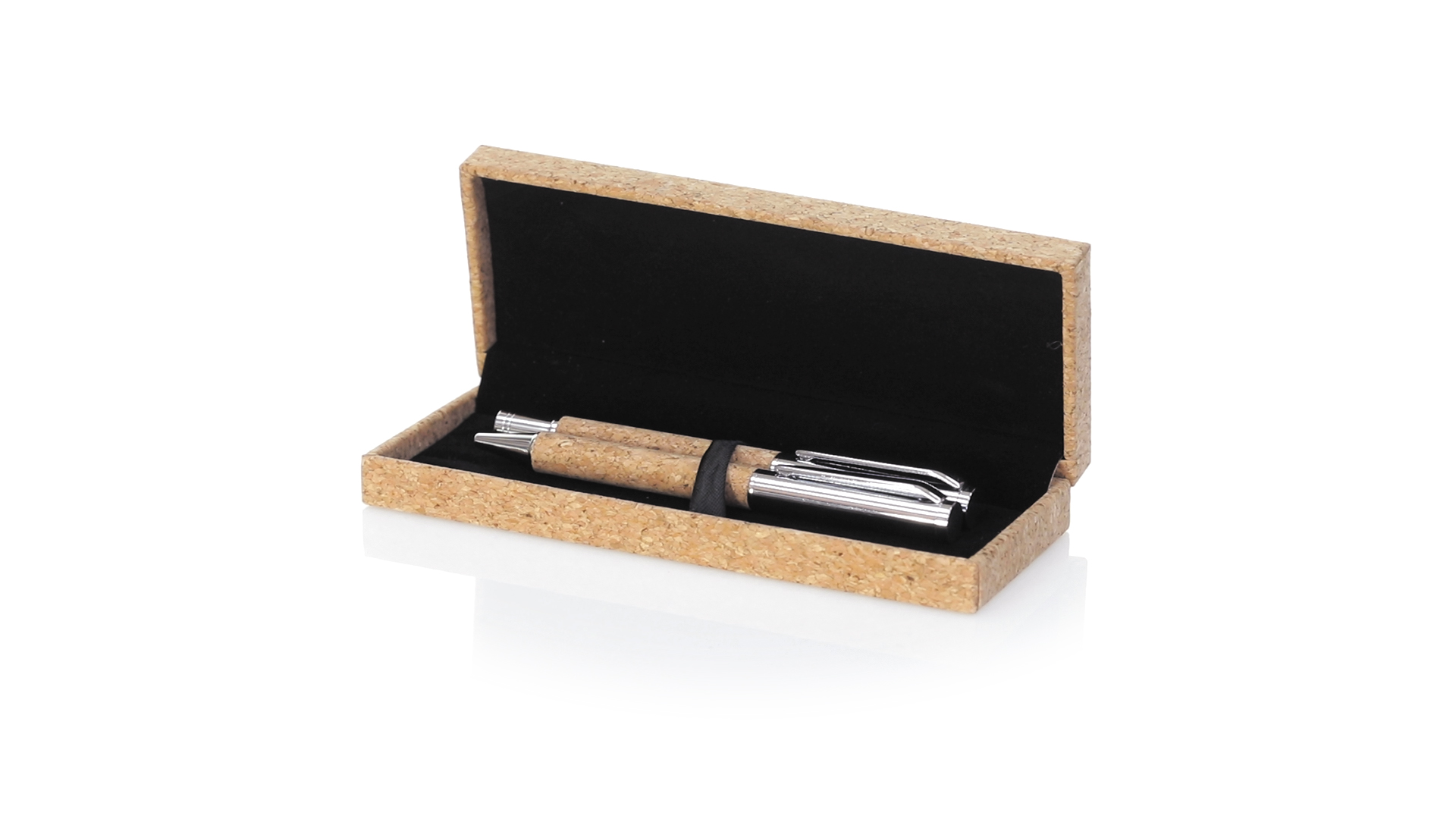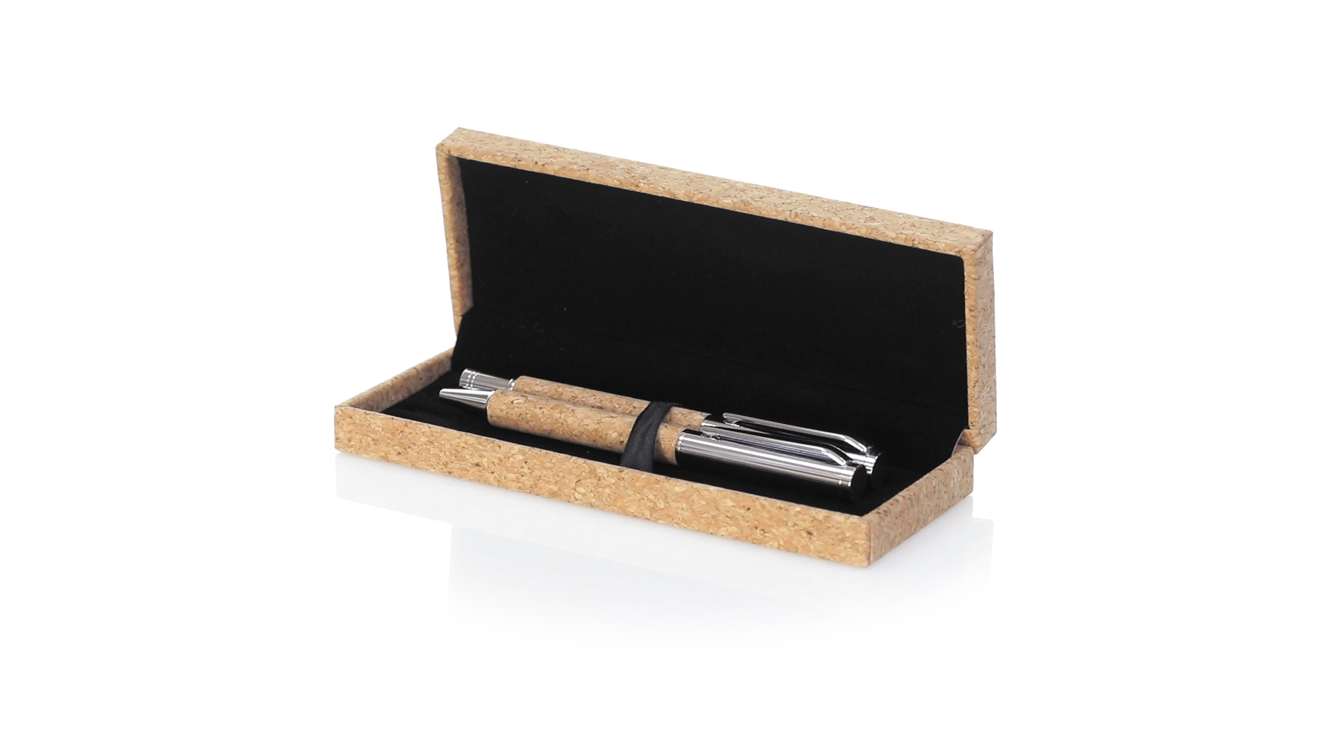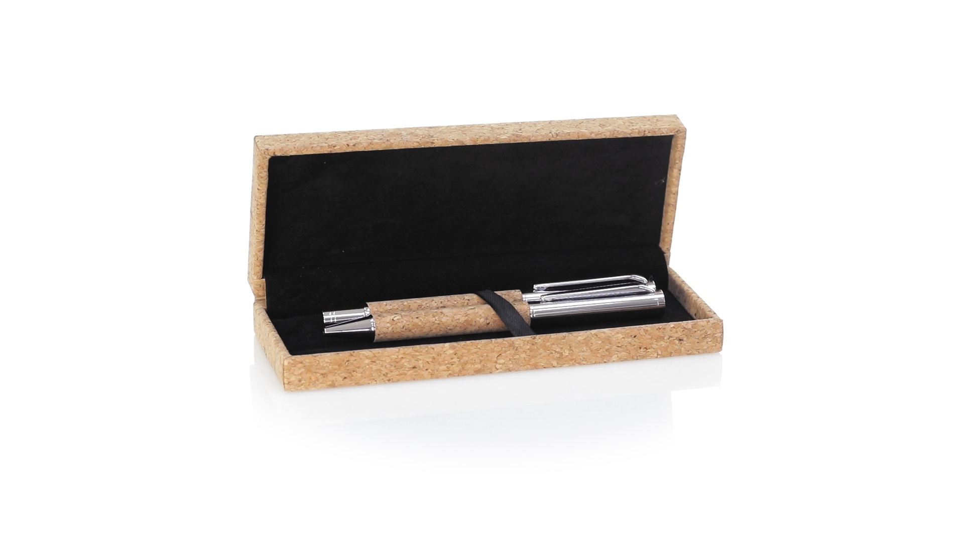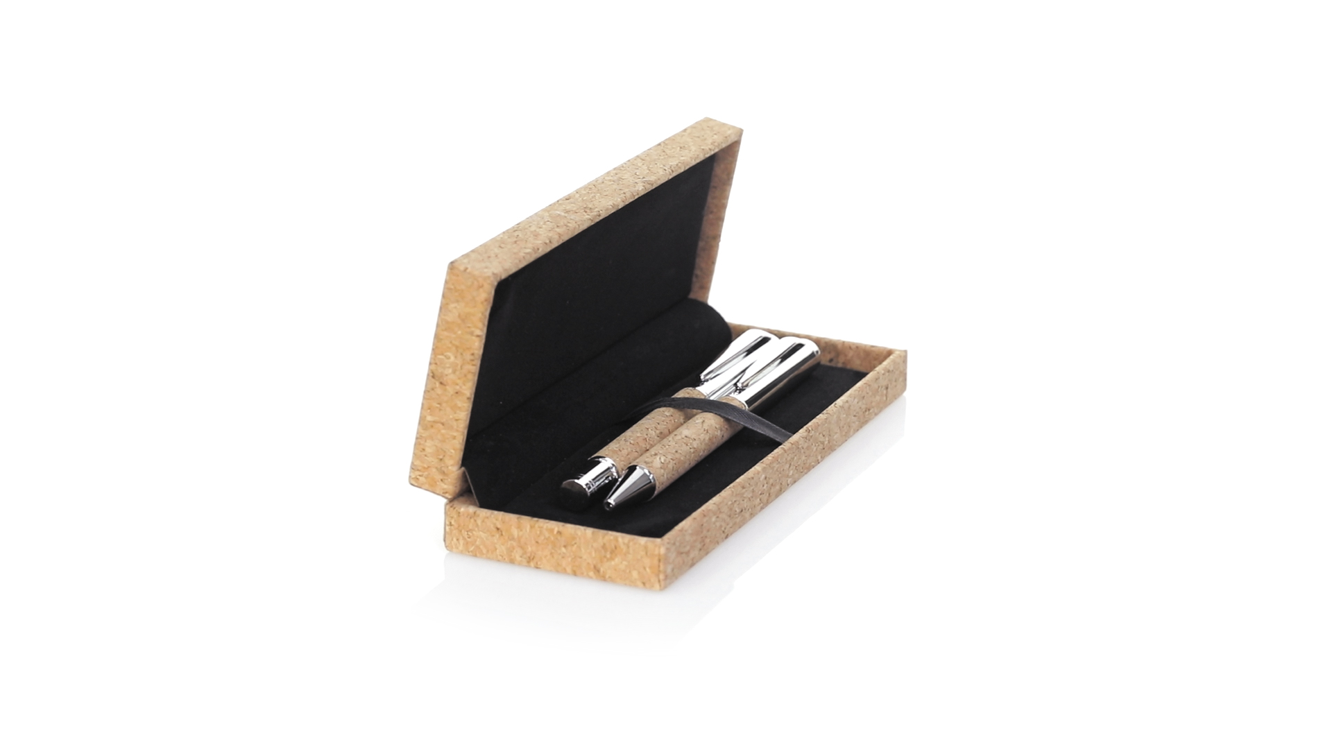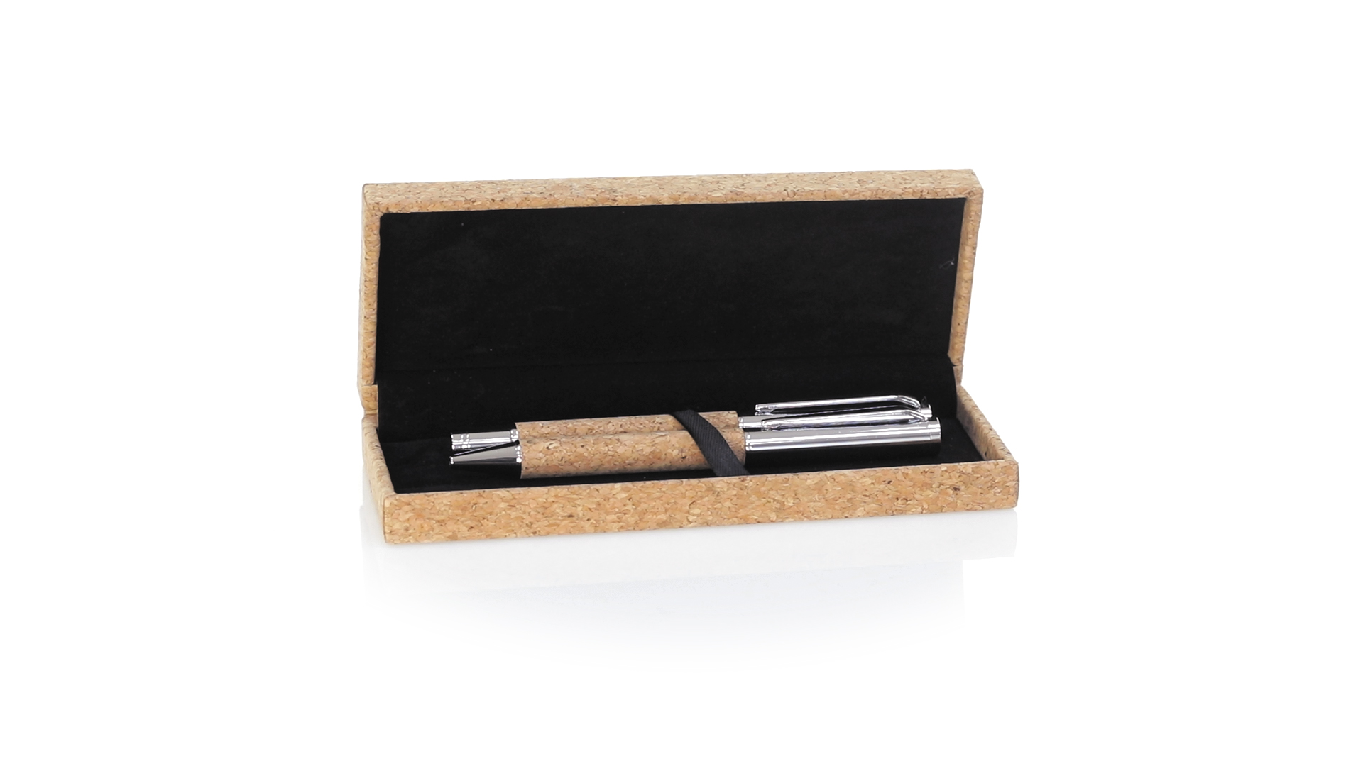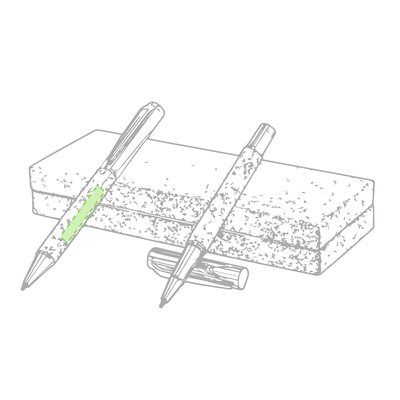 Linie "Natur" Kugelschreiber- und Rollerpenset. Hergestellt aus einer Kombination von Naturkork und Metall, um die Verwendung von natürlichen Rohstoffen zu fördern und Schadstoffemissionen zu reduzieren. Kugelschreiber mit Drehmechanik in blauer Tinte. Rollerpen mit Kappe und Gel-Tinte in Blau, mit Metall-Jumbo-Patrone. Präsentiert in einem individuellen Korketui mit Wildlederinnenseite.