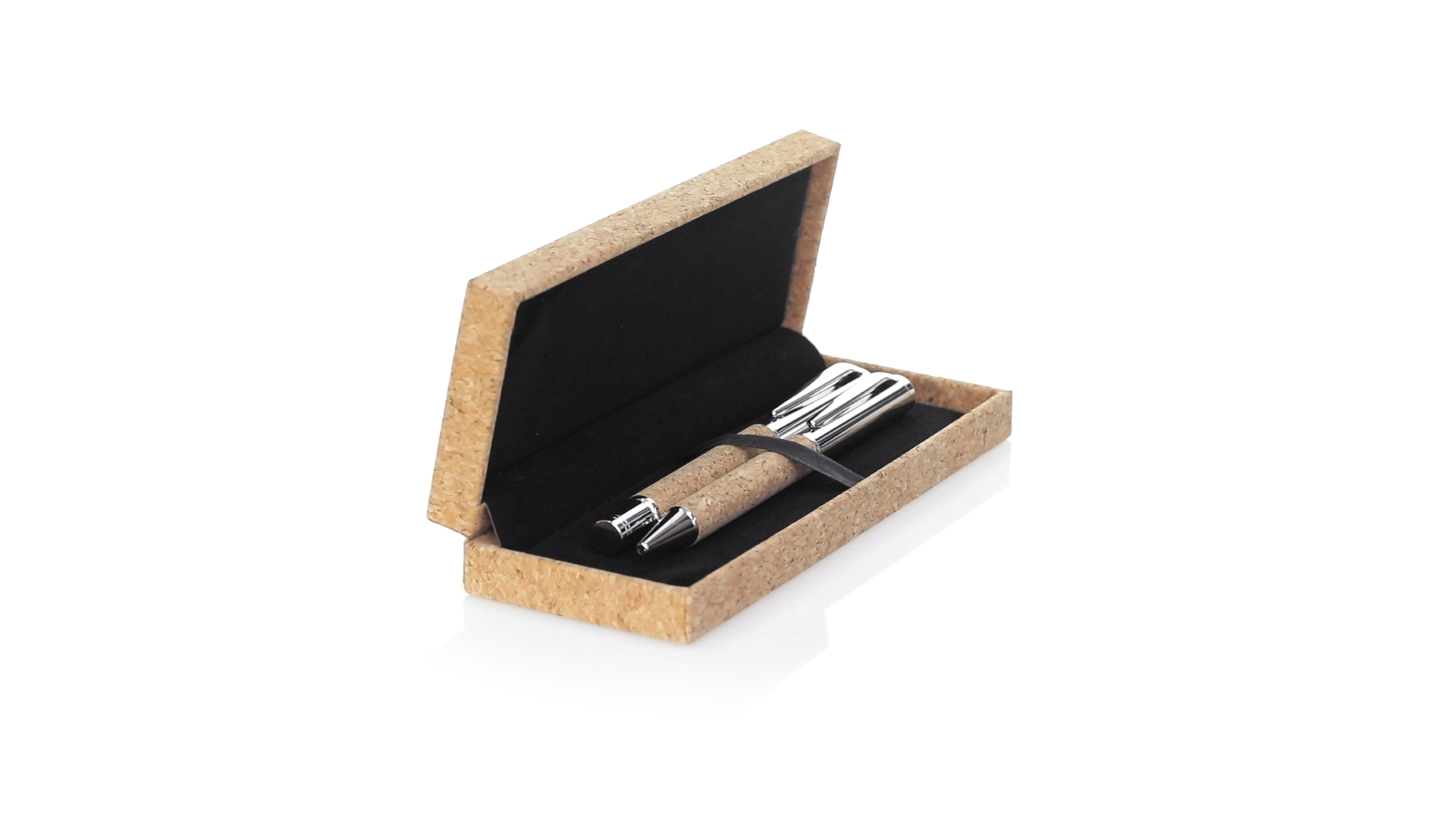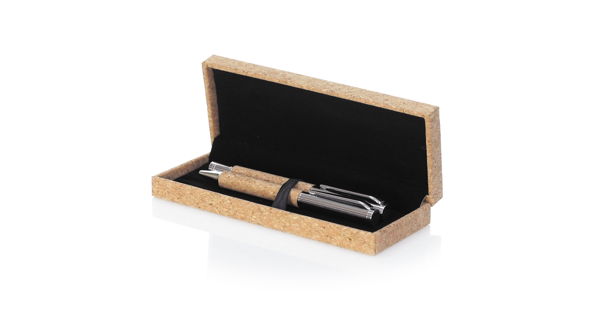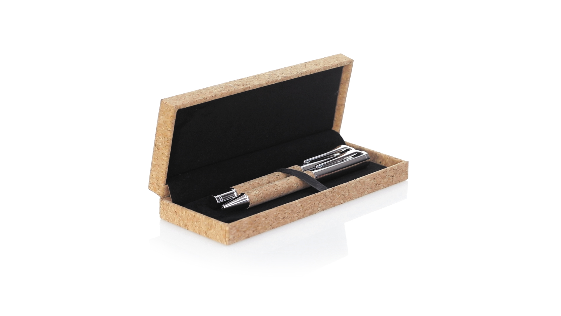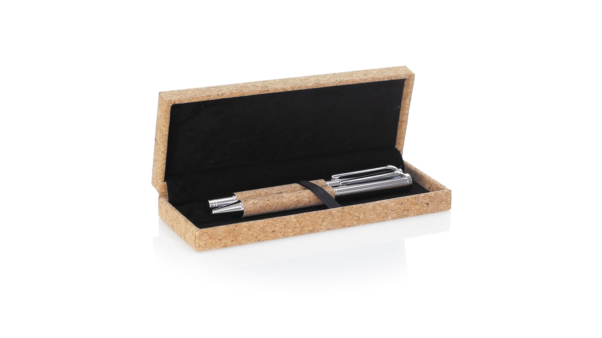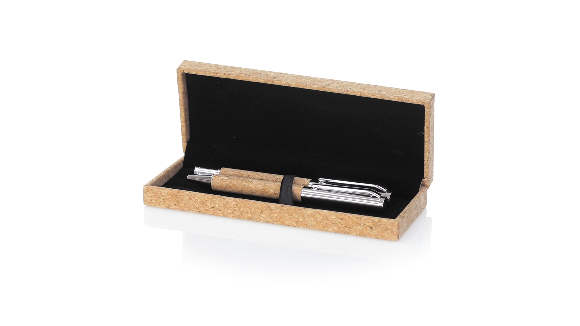 Linie "Natur" Kugelschreiber- und Rollerpenset. Hergestellt aus einer Kombination von Naturkork und Metall, um die Verwendung von natürlichen Rohstoffen zu fördern und Schadstoffemissionen zu reduzieren. Kugelschreiber mit Drehmechanik in blauer Tinte. Rollerpen mit Kappe und Gel-Tinte in Blau, mit Metall-Jumbo-Patrone. Präsentiert in einem individuellen Korketui mit Wildlederinnenseite.