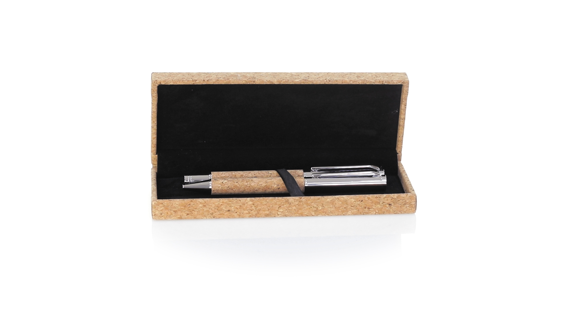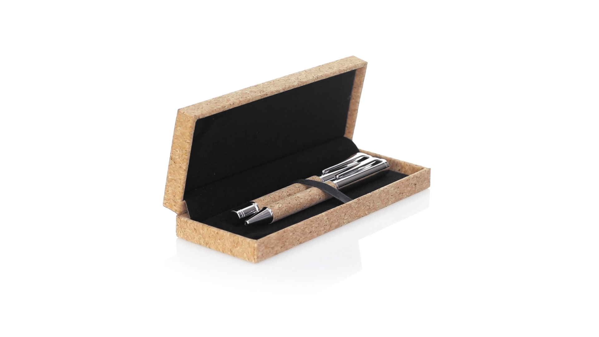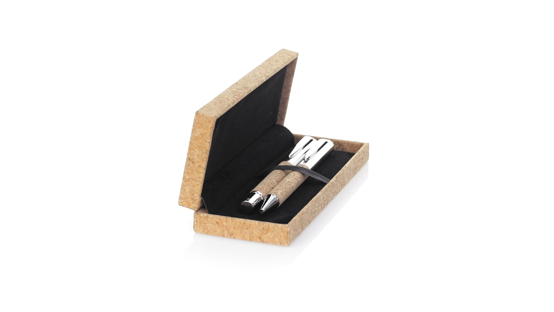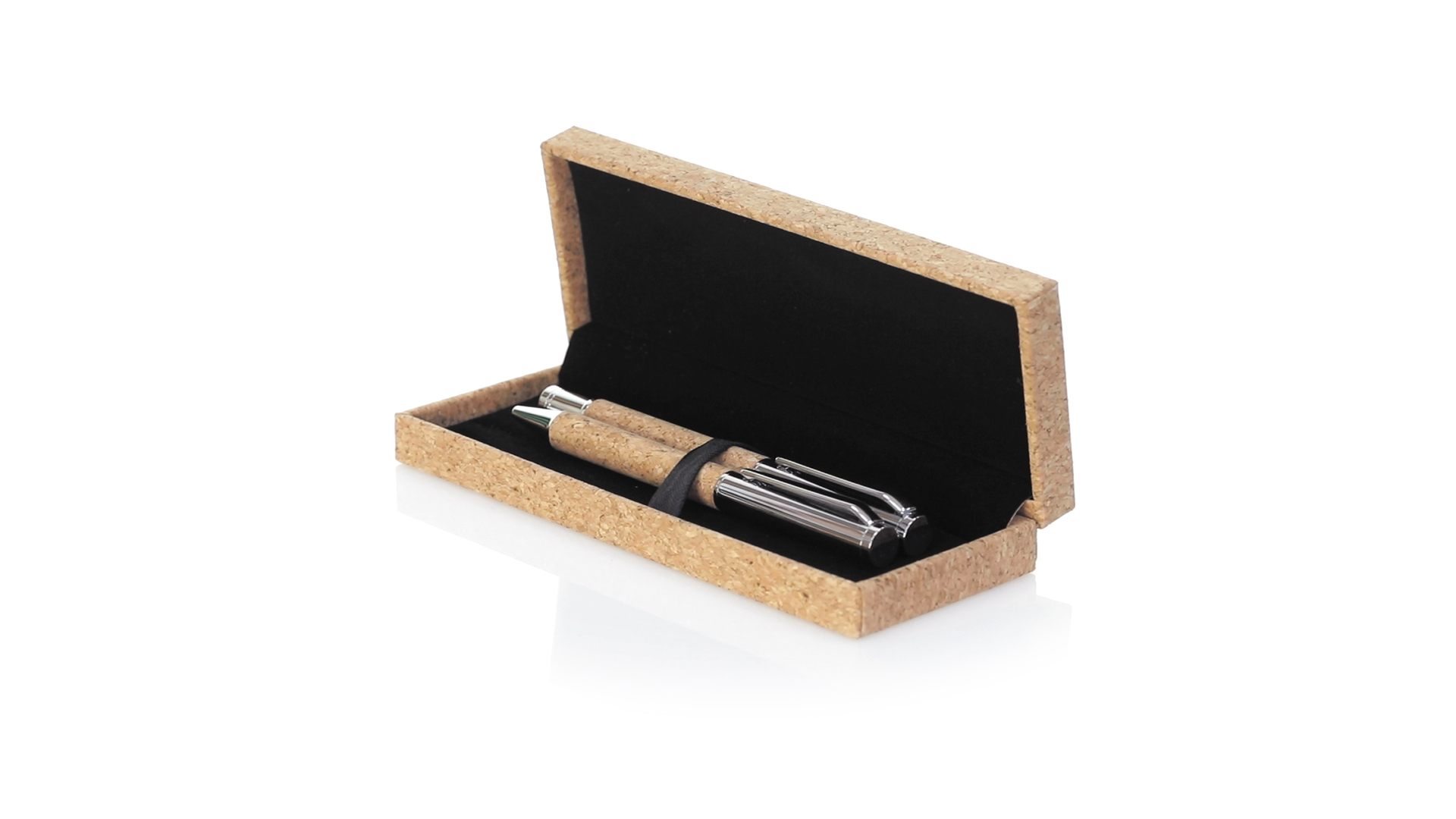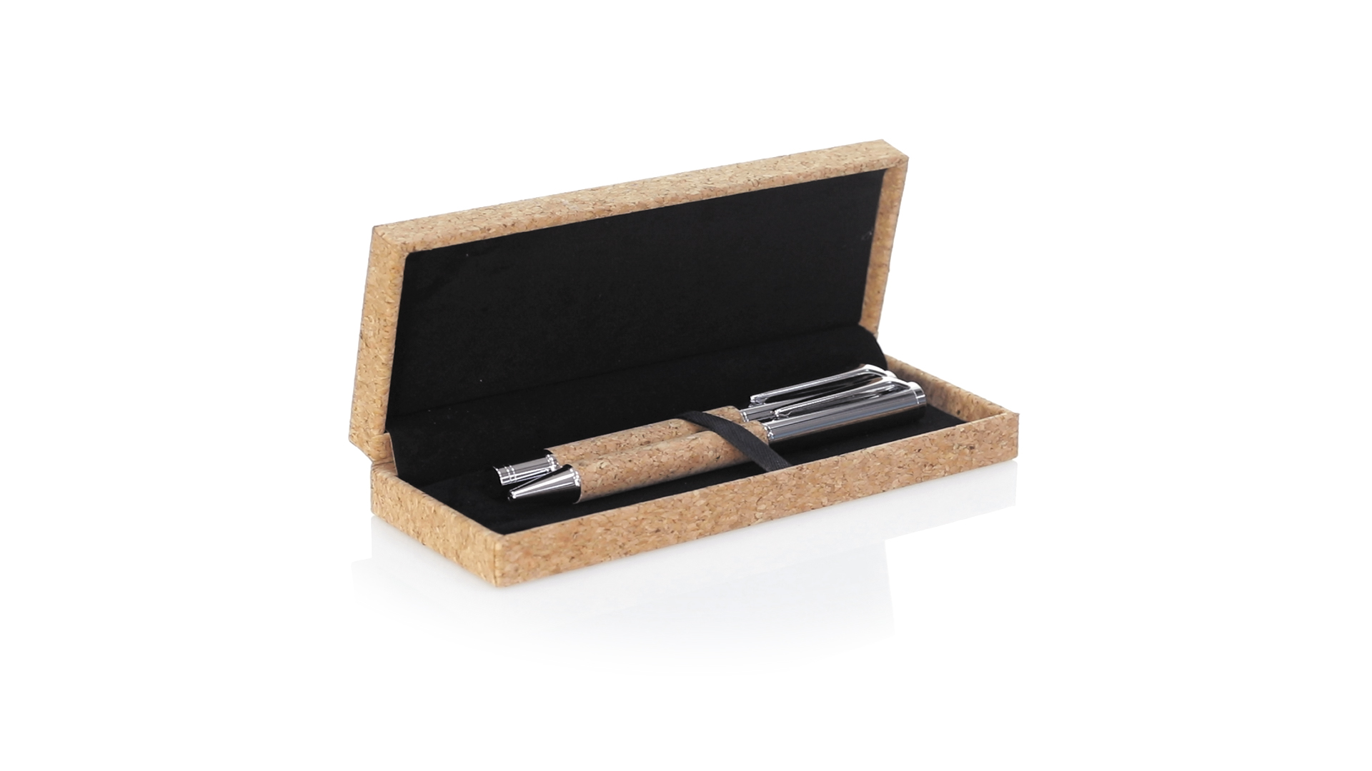 Linie "Natur" Kugelschreiber- und Rollerpenset. Hergestellt aus einer Kombination von Naturkork und Metall, um die Verwendung von natürlichen Rohstoffen zu fördern und Schadstoffemissionen zu reduzieren. Kugelschreiber mit Drehmechanik in blauer Tinte. Rollerpen mit Kappe und Gel-Tinte in Blau, mit Metall-Jumbo-Patrone. Präsentiert in einem individuellen Korketui mit Wildlederinnenseite.