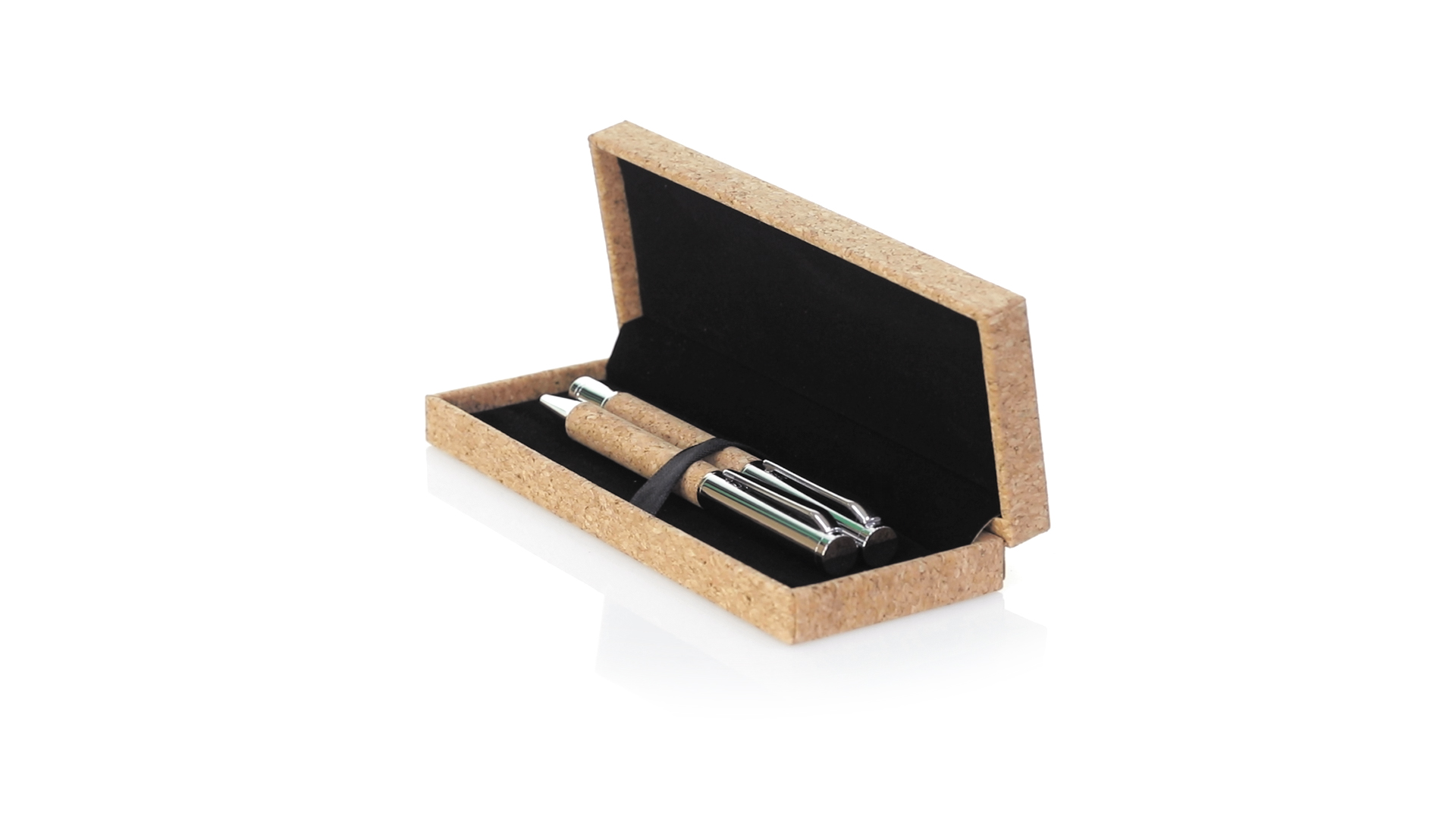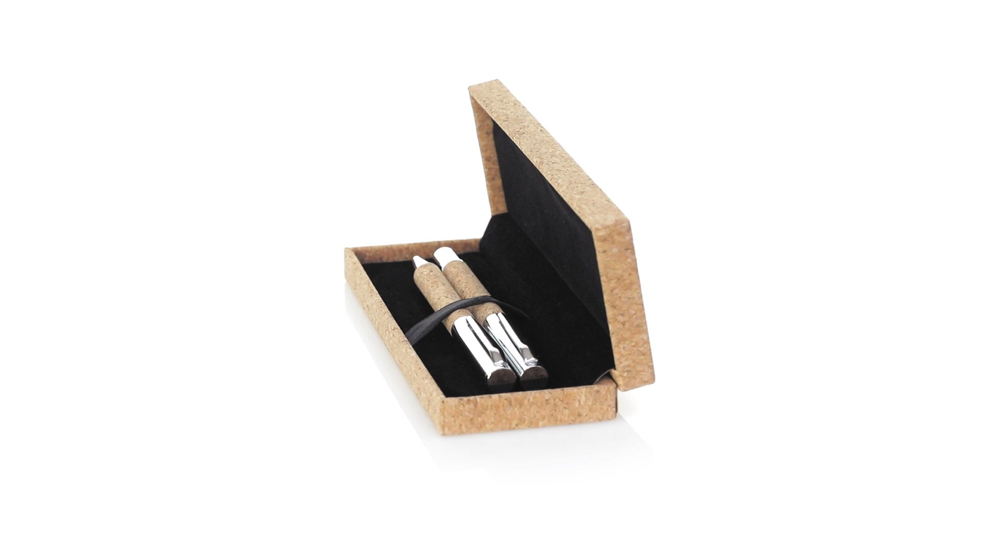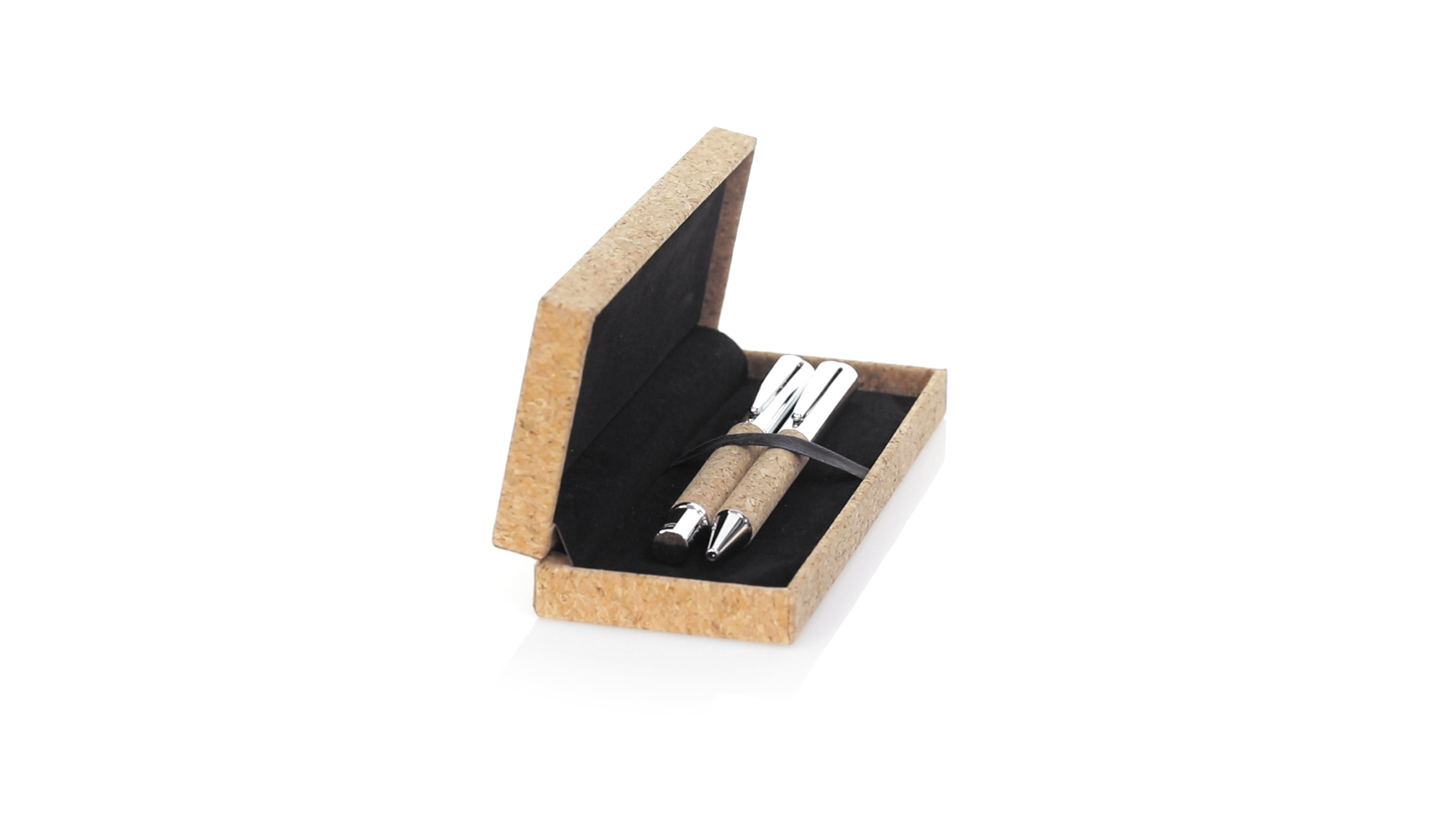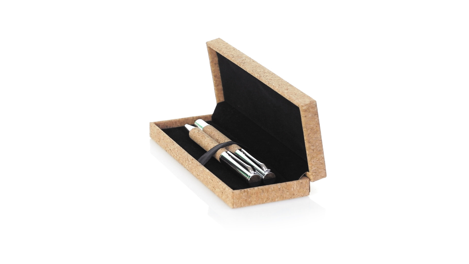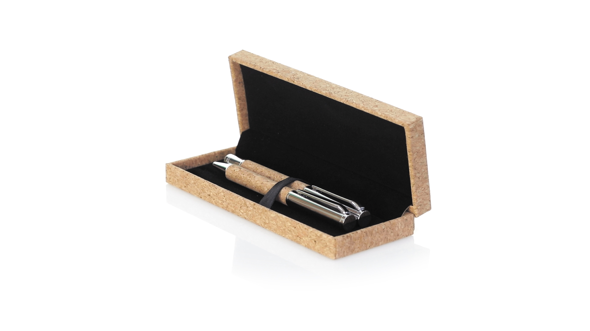 Linie "Natur" Kugelschreiber- und Rollerpenset. Hergestellt aus einer Kombination von Naturkork und Metall, um die Verwendung von natürlichen Rohstoffen zu fördern und Schadstoffemissionen zu reduzieren. Kugelschreiber mit Drehmechanik in blauer Tinte. Rollerpen mit Kappe und Gel-Tinte in Blau, mit Metall-Jumbo-Patrone. Präsentiert in einem individuellen Korketui mit Wildlederinnenseite.
