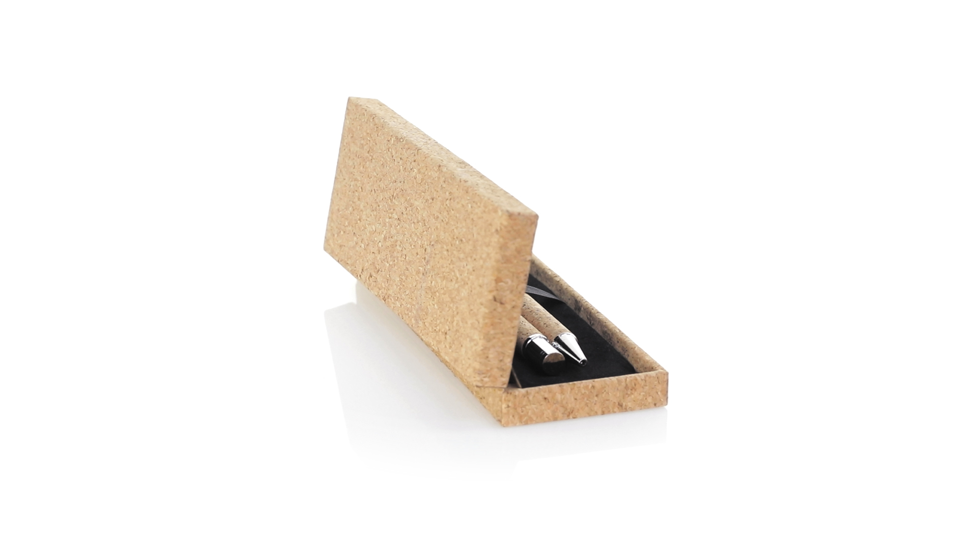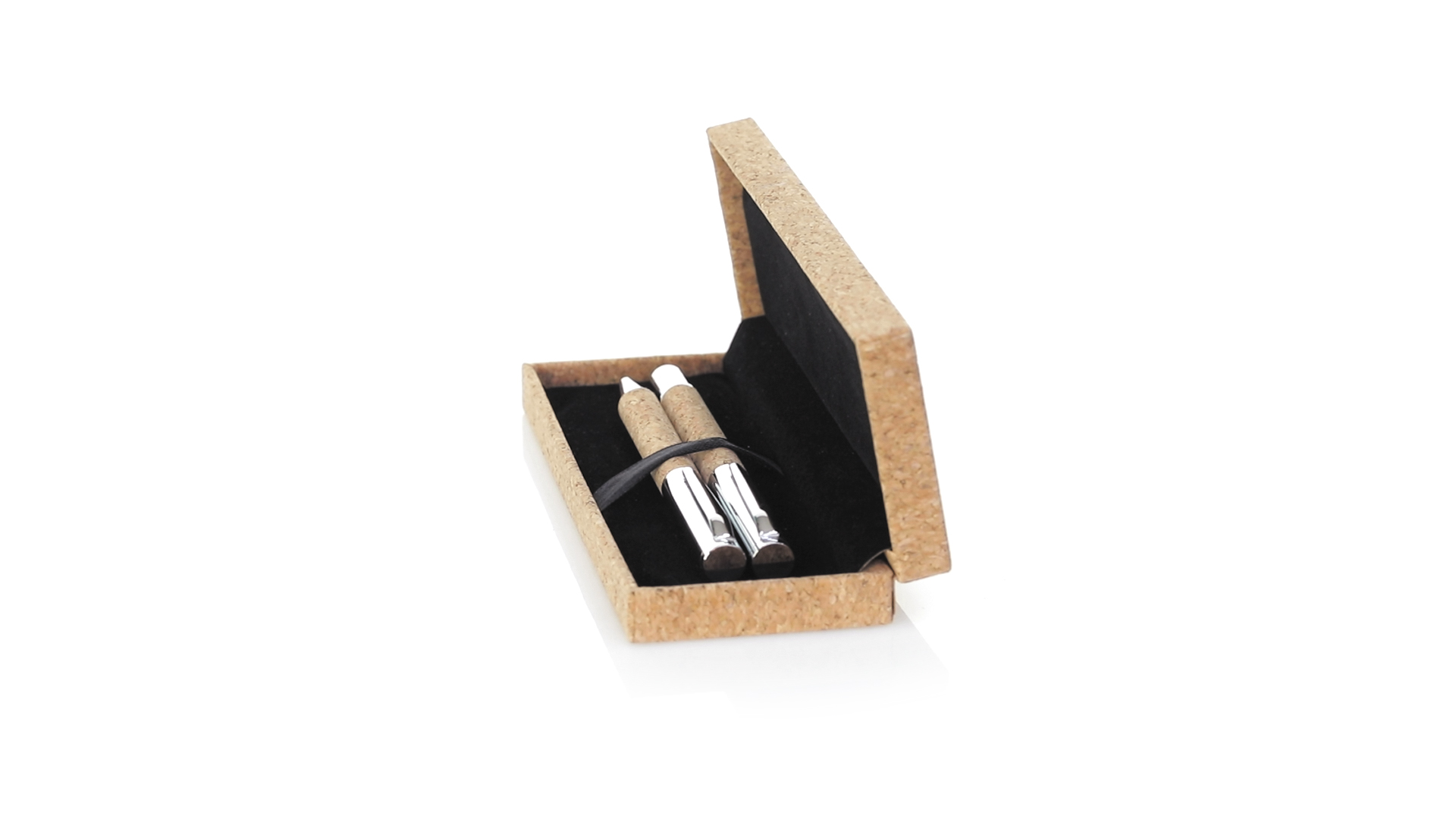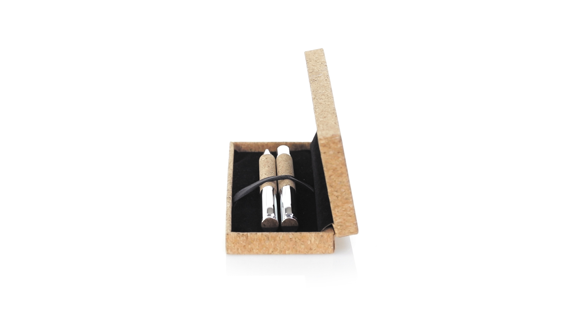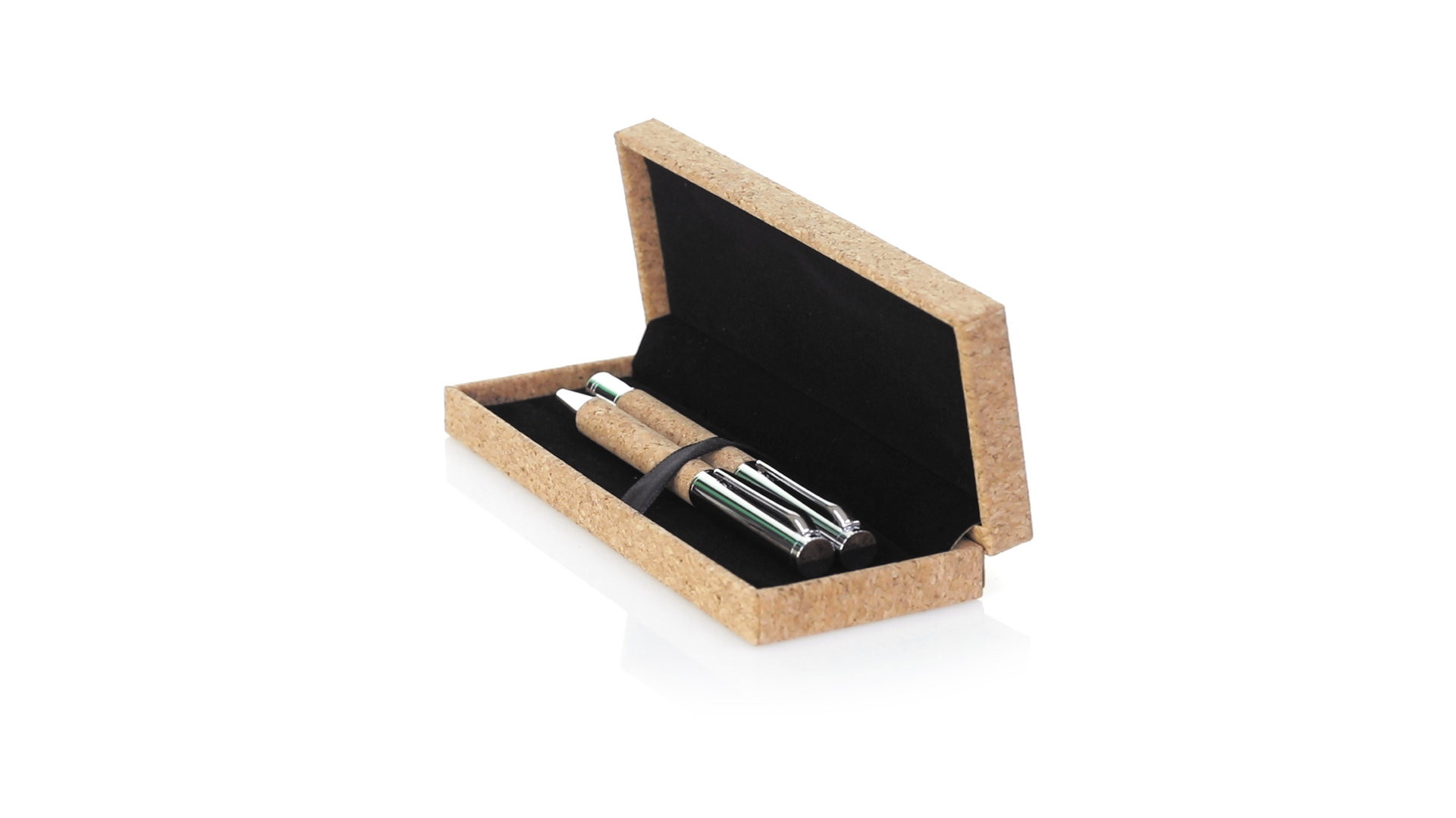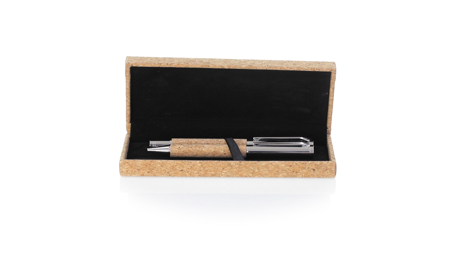 Linie "Natur" Kugelschreiber- und Rollerpenset. Hergestellt aus einer Kombination von Naturkork und Metall, um die Verwendung von natürlichen Rohstoffen zu fördern und Schadstoffemissionen zu reduzieren. Kugelschreiber mit Drehmechanik in blauer Tinte. Rollerpen mit Kappe und Gel-Tinte in Blau, mit Metall-Jumbo-Patrone. Präsentiert in einem individuellen Korketui mit Wildlederinnenseite.