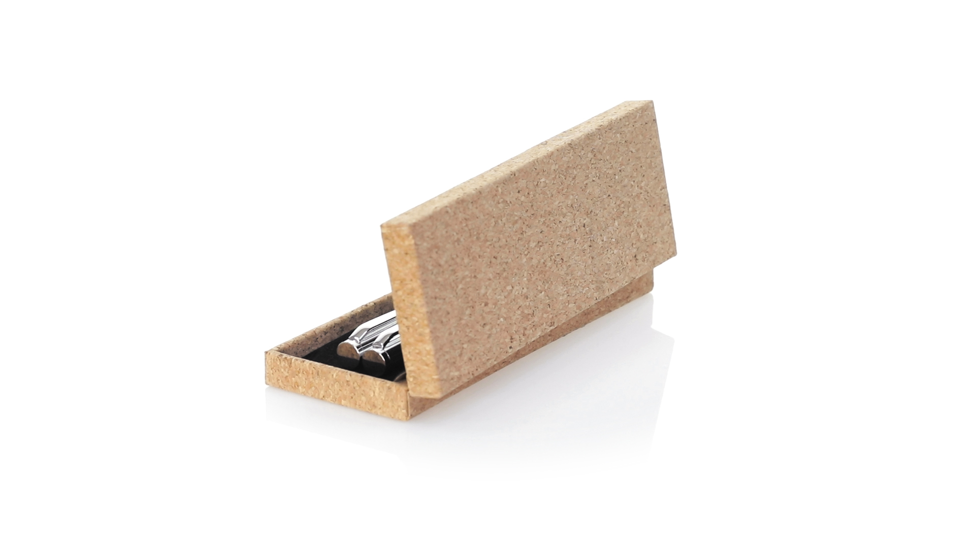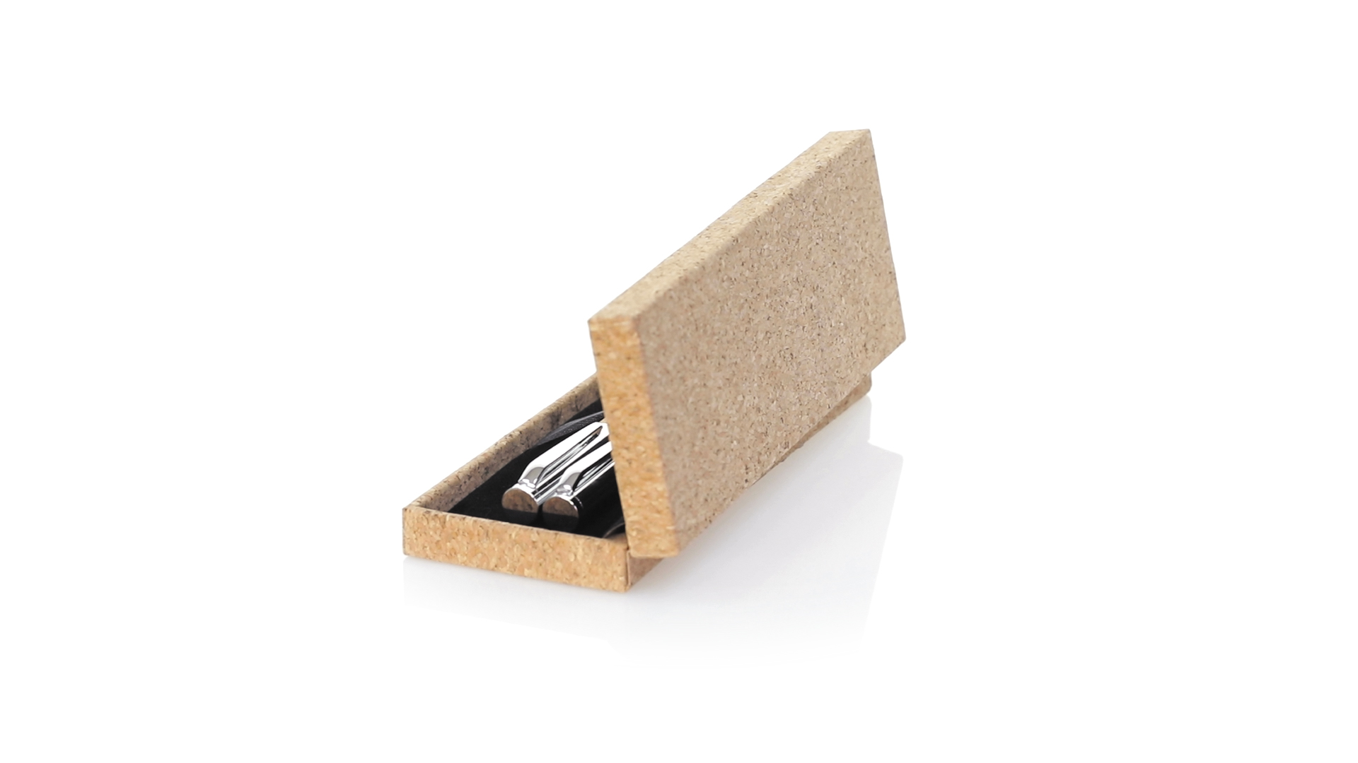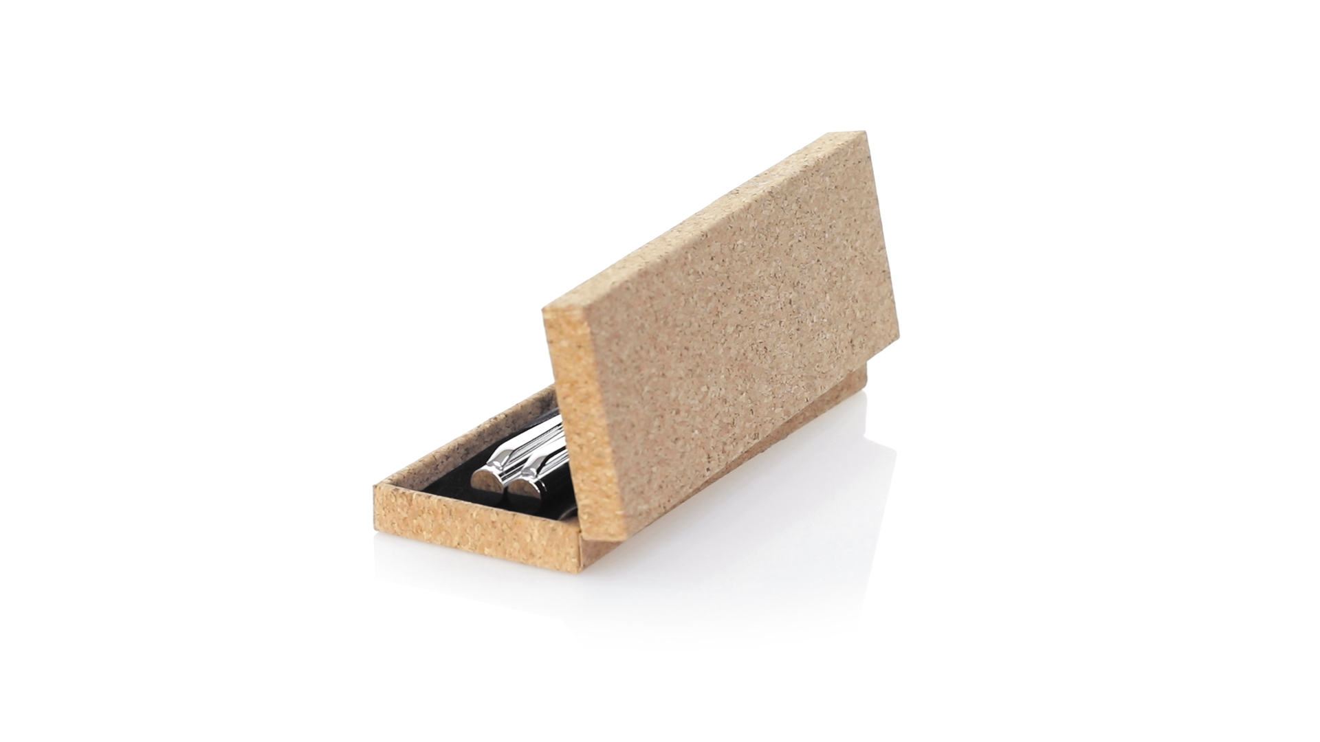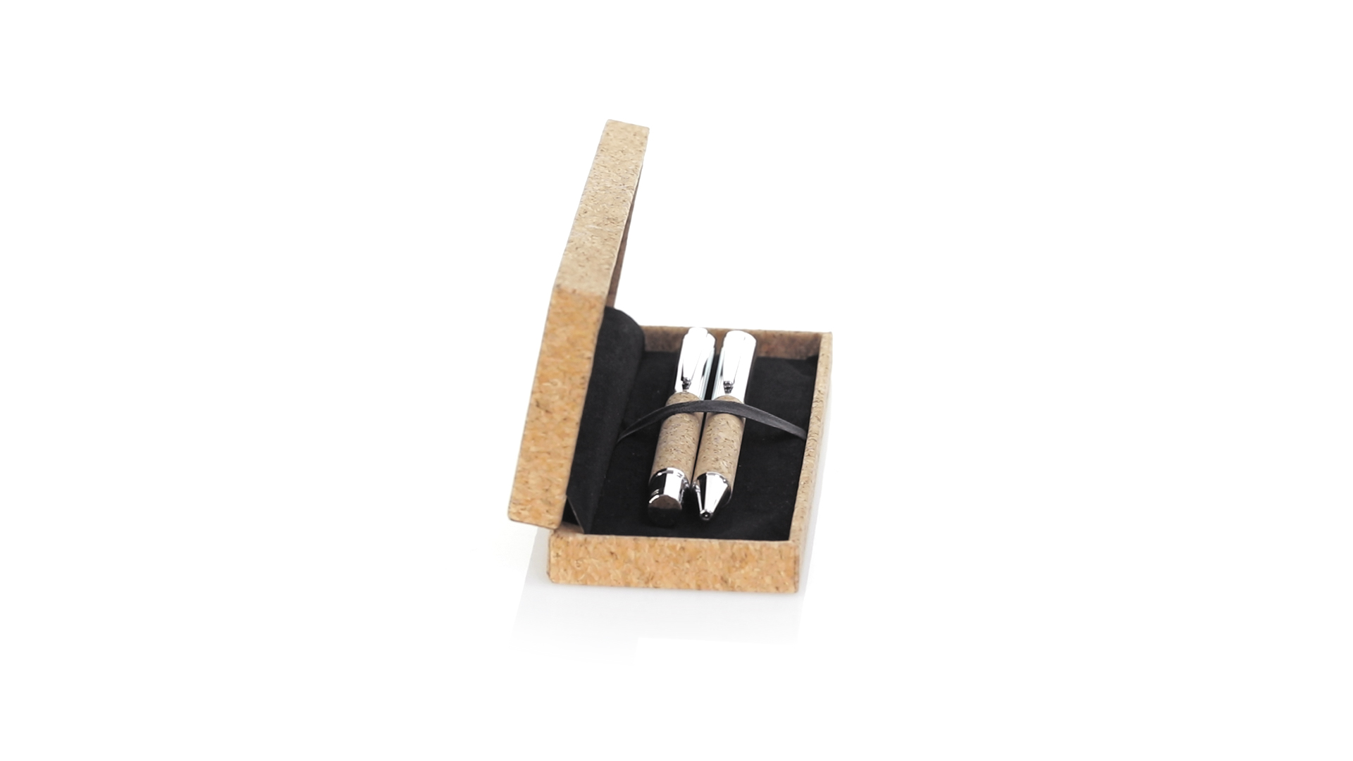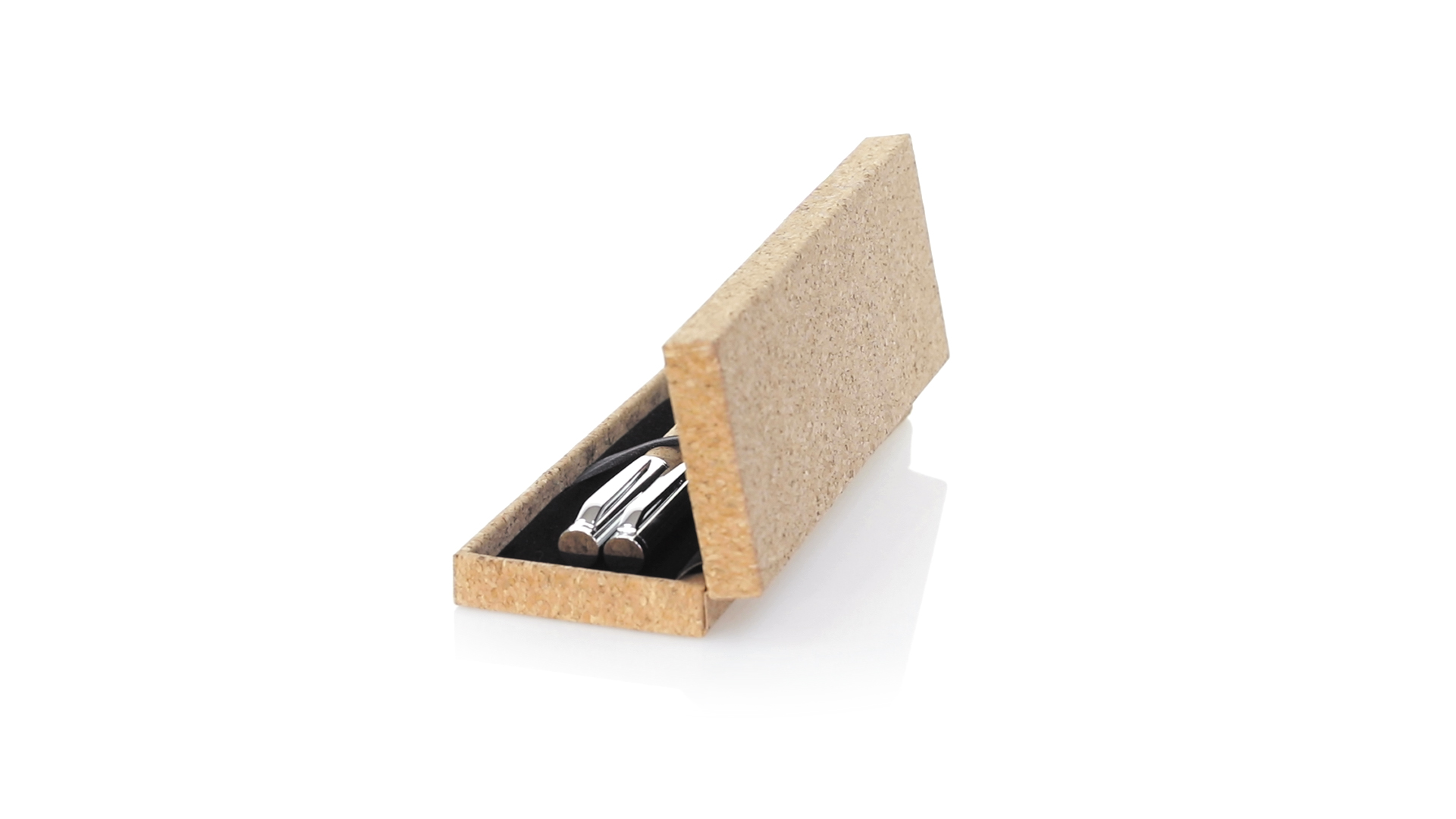 Linie "Natur" Kugelschreiber- und Rollerpenset. Hergestellt aus einer Kombination von Naturkork und Metall, um die Verwendung von natürlichen Rohstoffen zu fördern und Schadstoffemissionen zu reduzieren. Kugelschreiber mit Drehmechanik in blauer Tinte. Rollerpen mit Kappe und Gel-Tinte in Blau, mit Metall-Jumbo-Patrone. Präsentiert in einem individuellen Korketui mit Wildlederinnenseite.