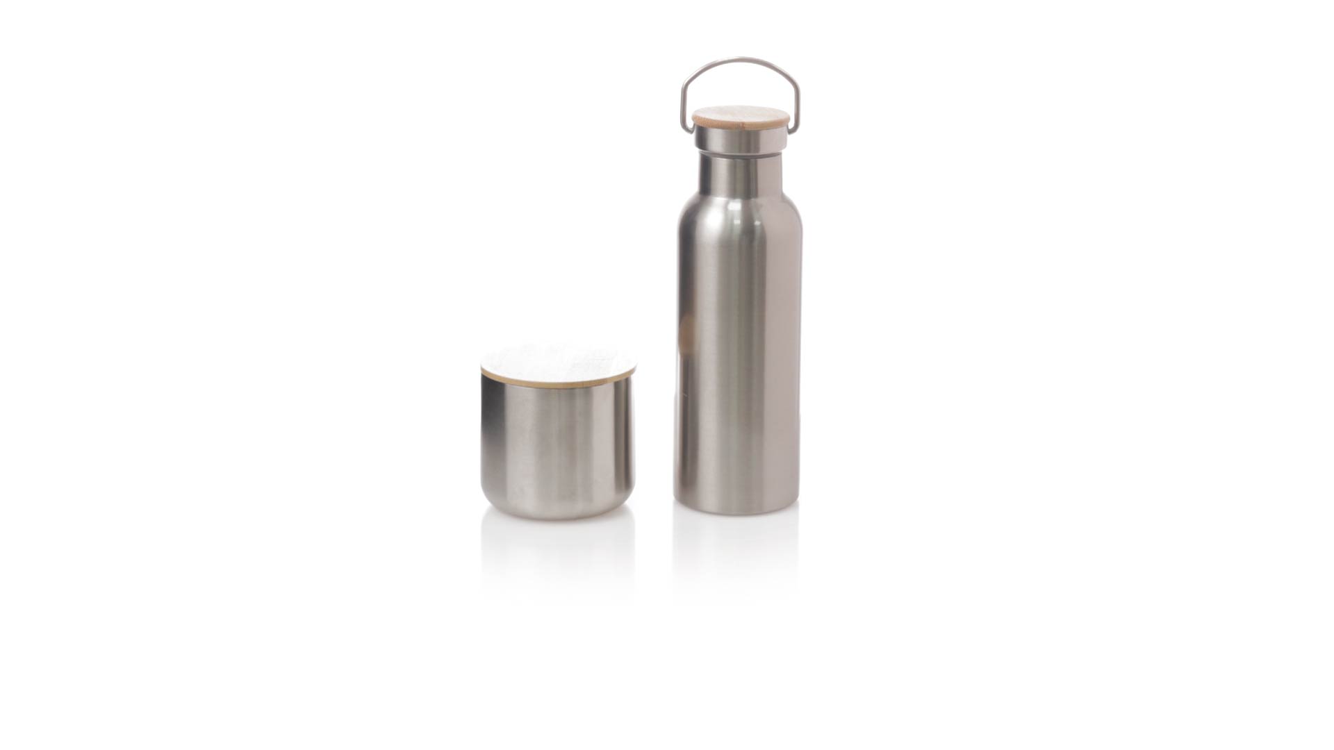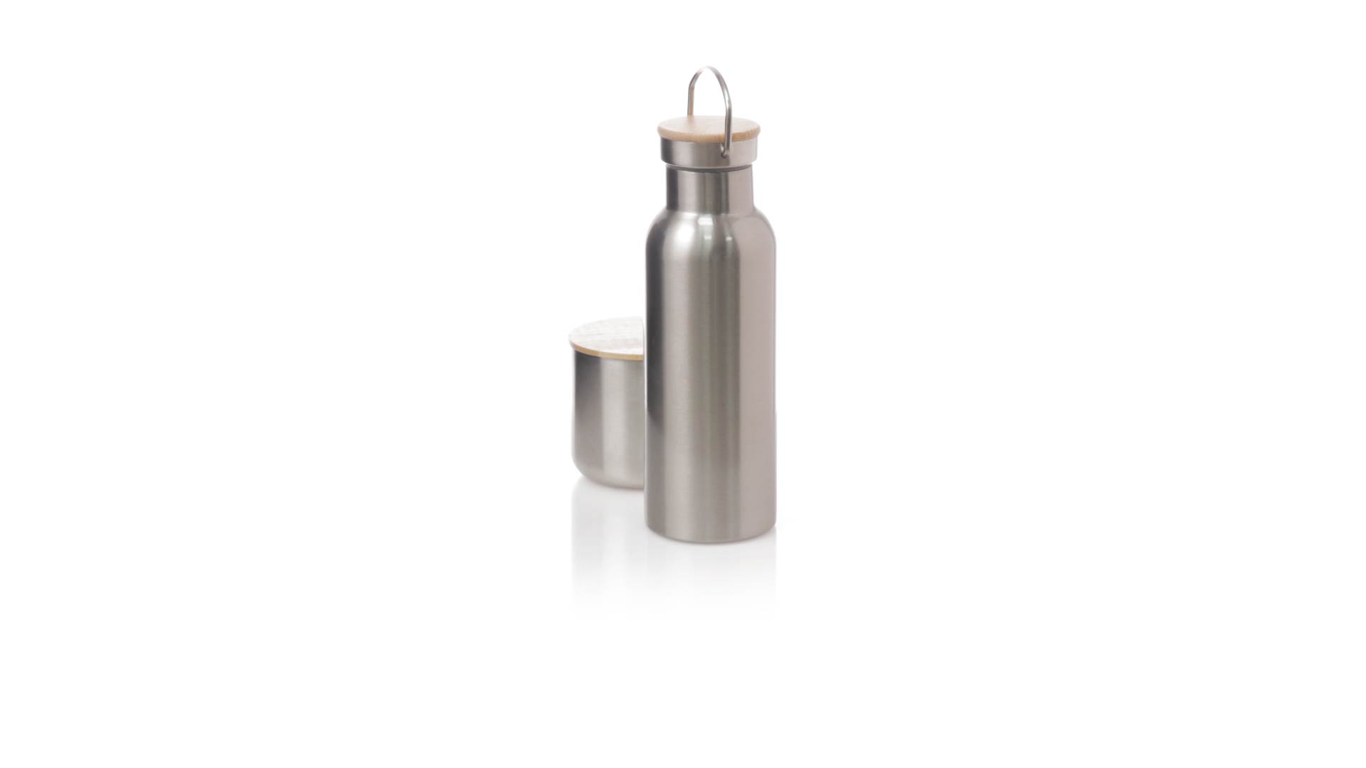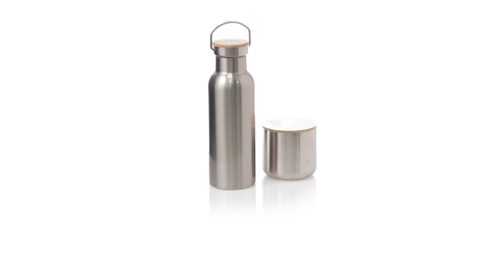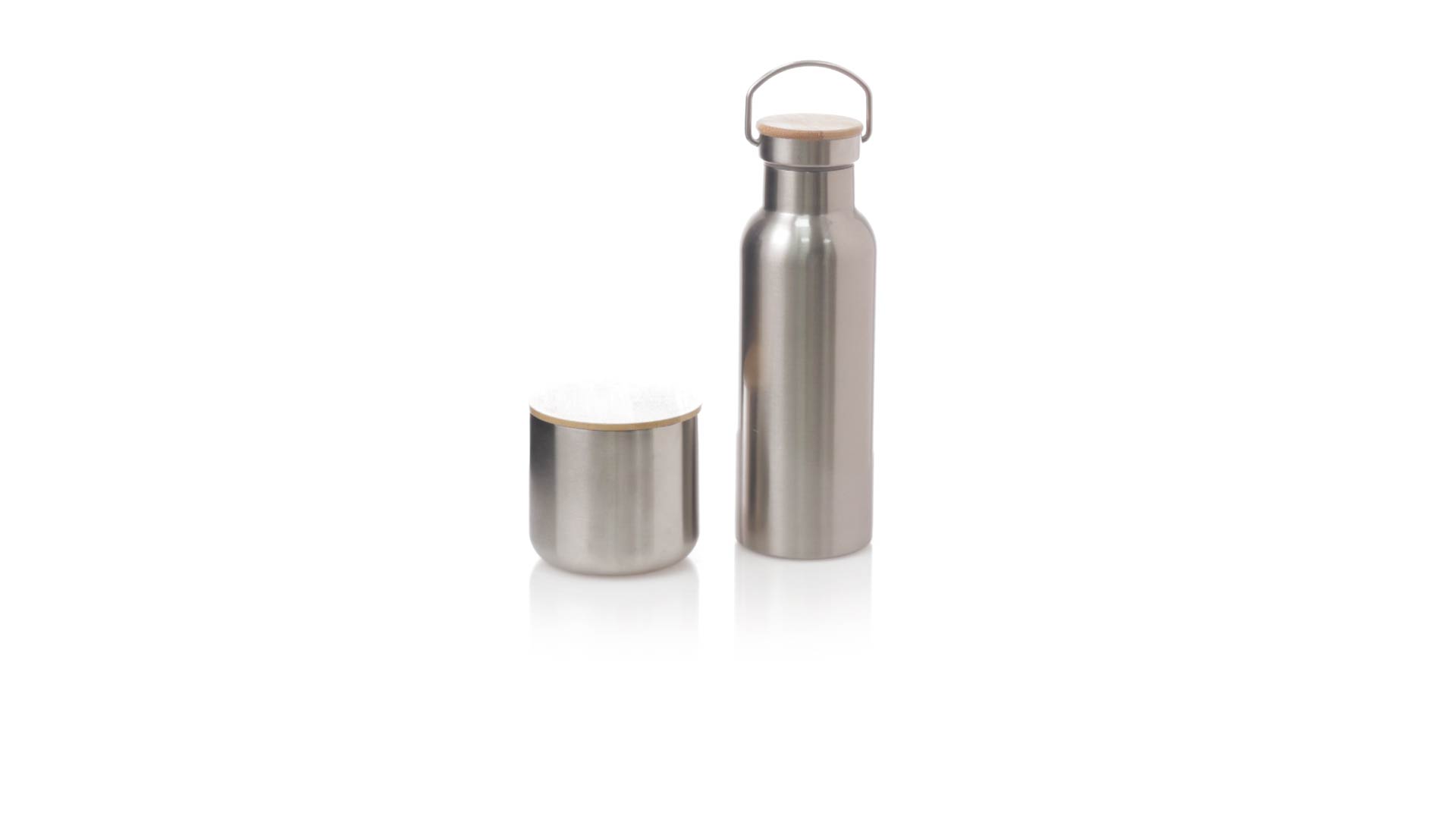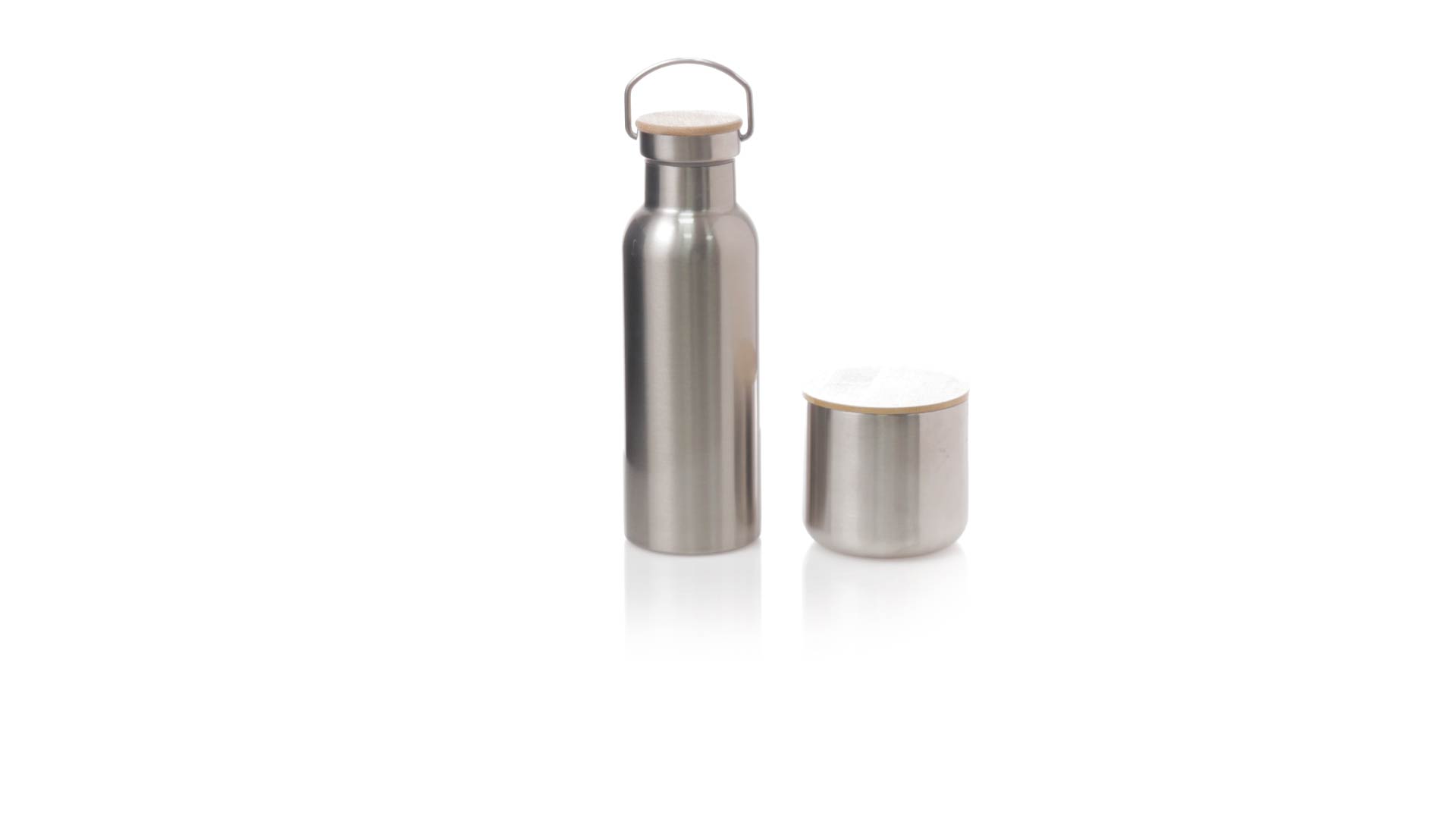 Praktisches Trink- und Thermobecher-Set aus Edelstahl. Inklusive, 500ml Thermoflasche aus Edelstahl, Schraubverschluss mit Bambusbasis und Tragegriff. Darüber hinaus enthält es 1 Becher mit einem Fassungsvermögen von 300 ml in Edelstahl und einen Bambusdeckel mit Druckverschluss. Präsentiert in einer Kraftbox.