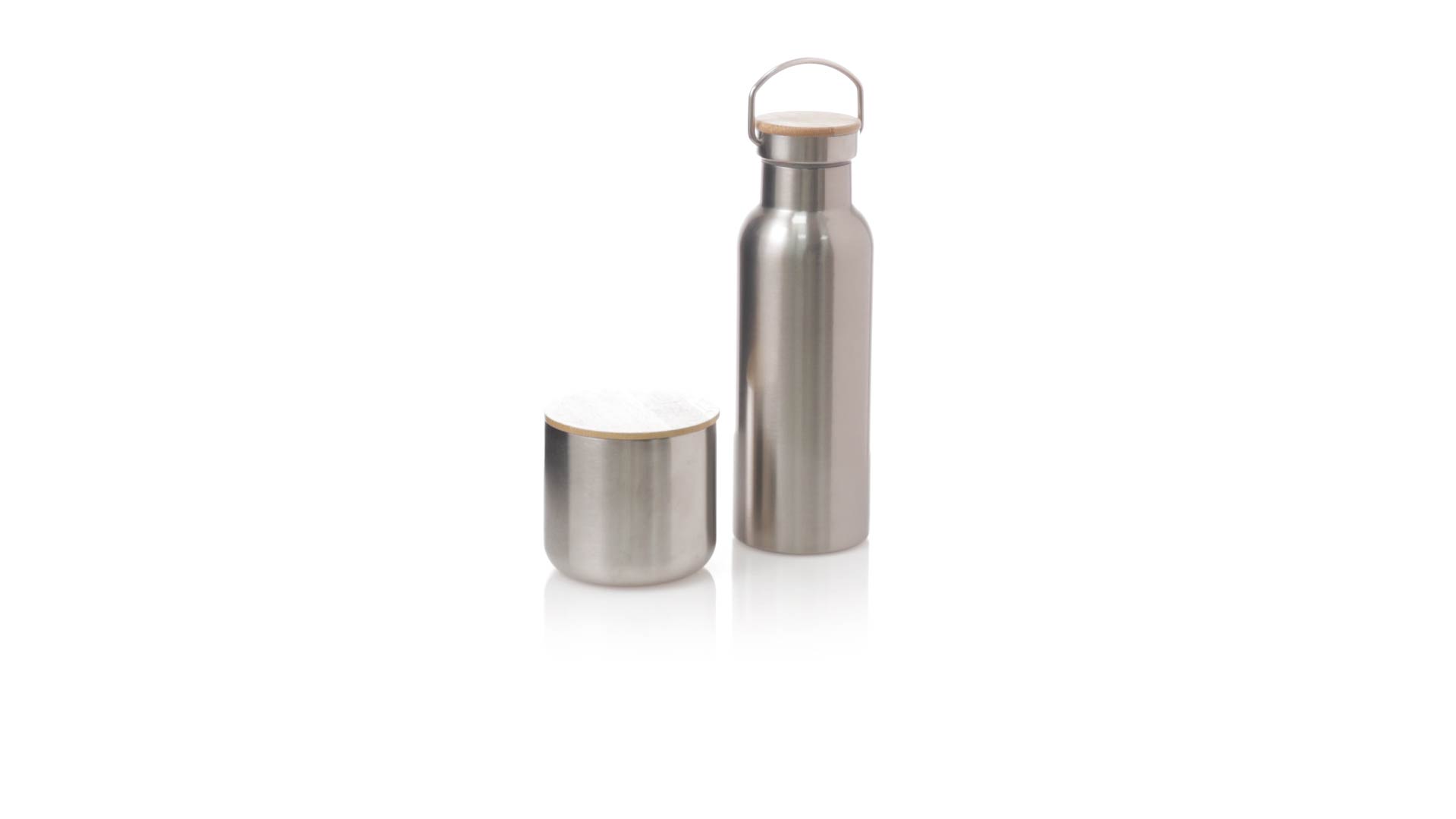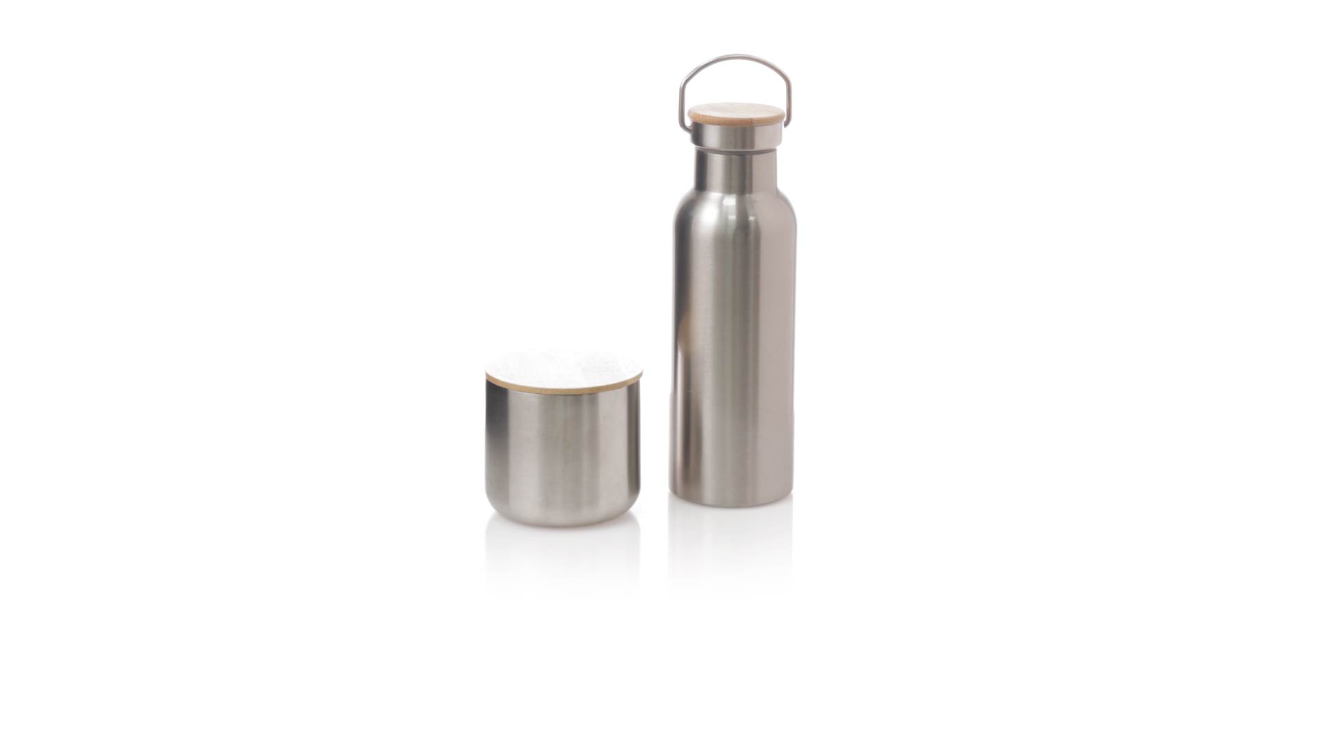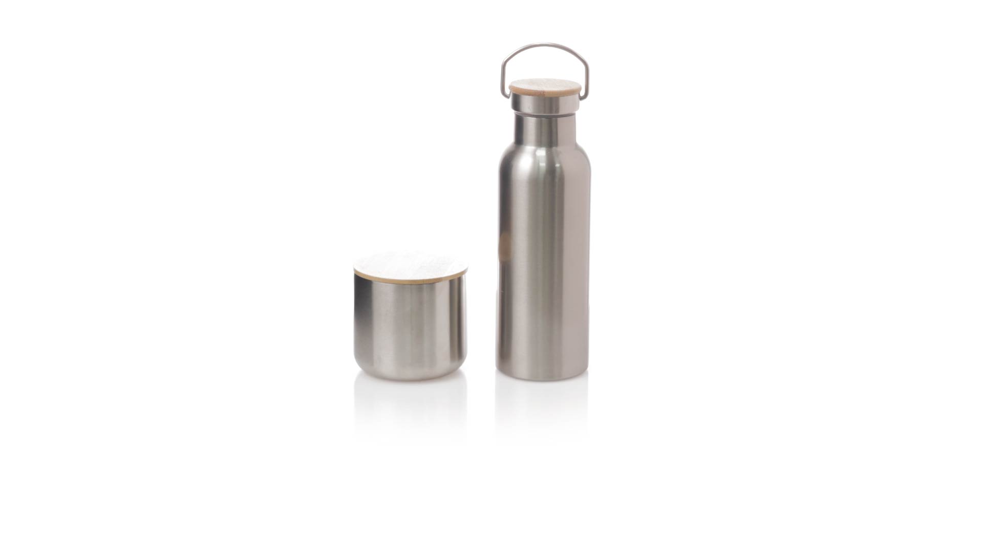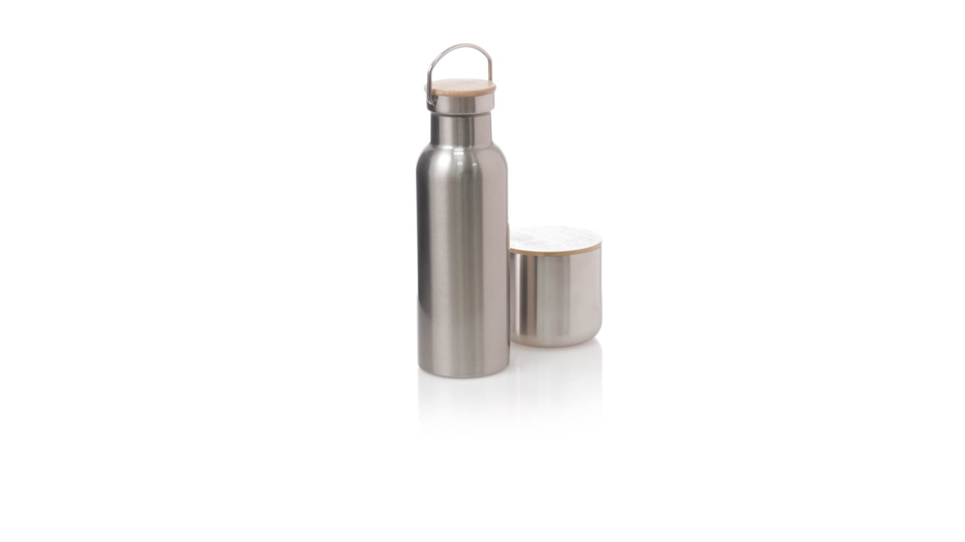 Praktisches Trink- und Thermobecher-Set aus Edelstahl. Inklusive, 500ml Thermoflasche aus Edelstahl, Schraubverschluss mit Bambusbasis und Tragegriff. Darüber hinaus enthält es 1 Becher mit einem Fassungsvermögen von 300 ml in Edelstahl und einen Bambusdeckel mit Druckverschluss. Präsentiert in einer Kraftbox.