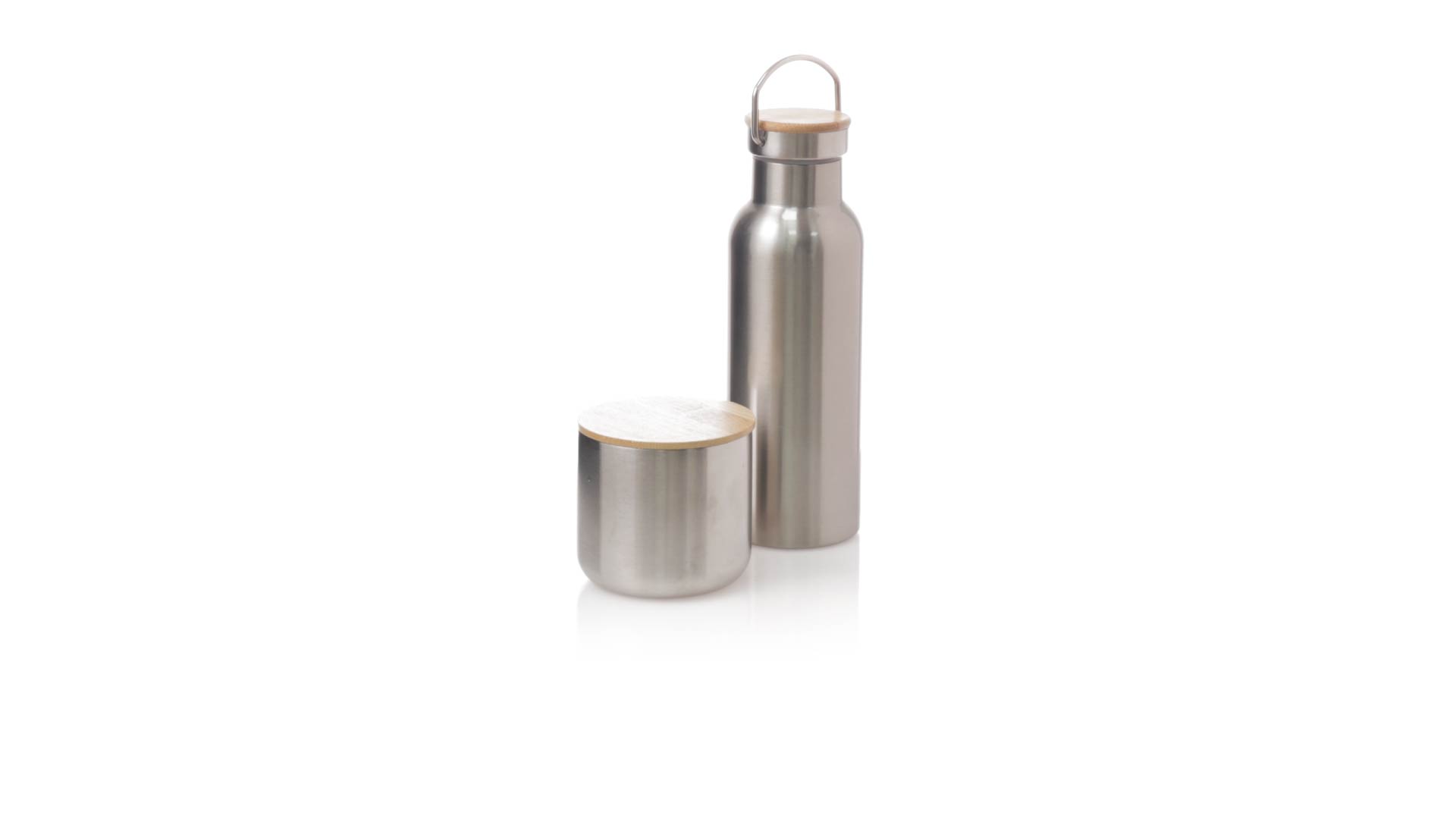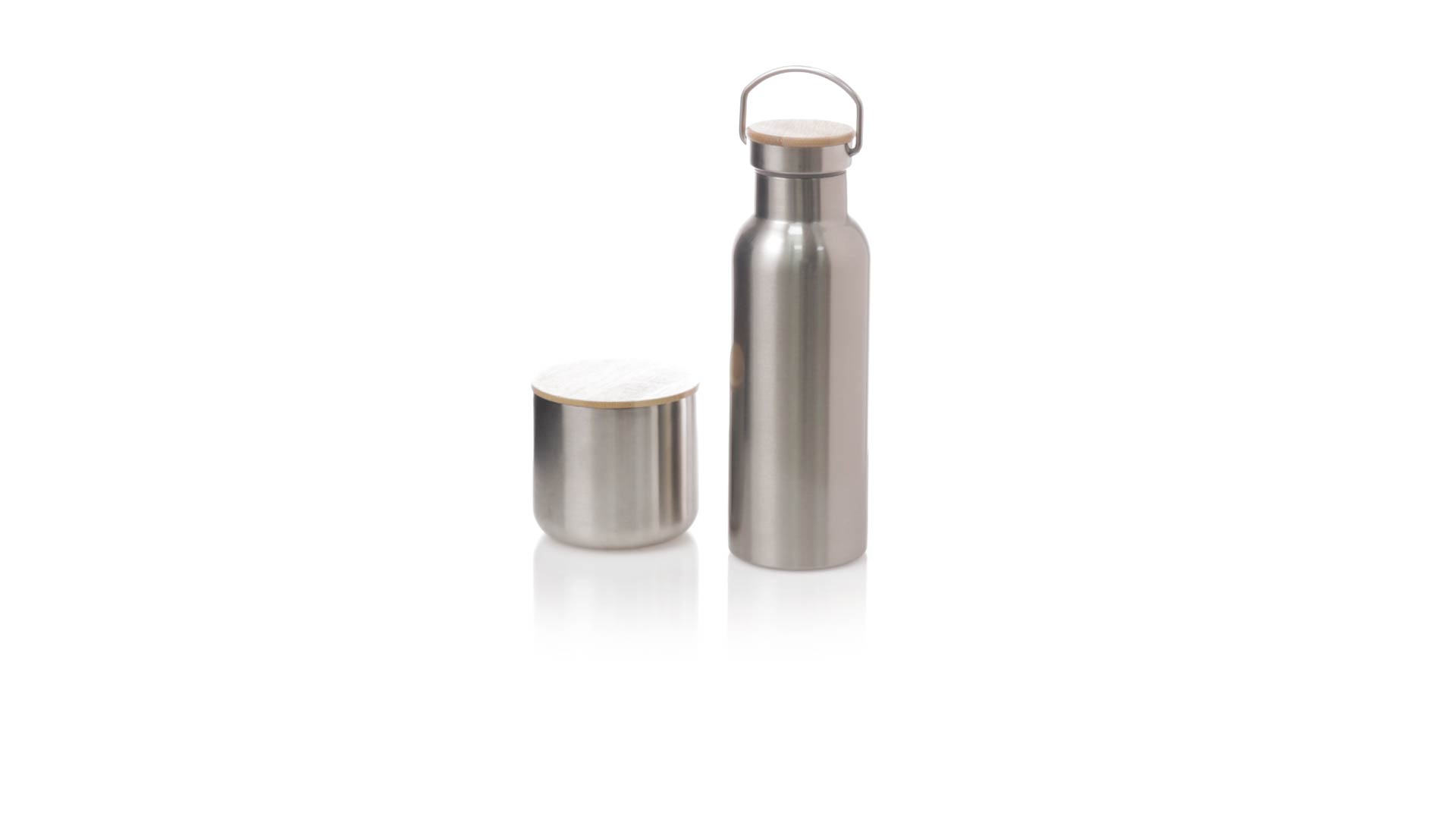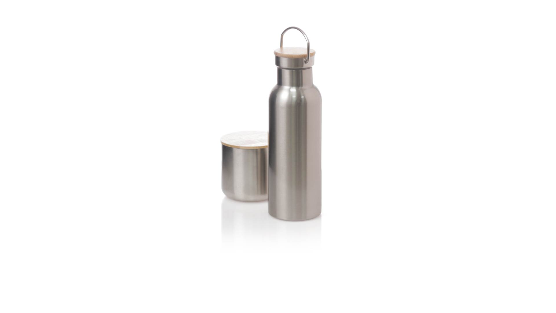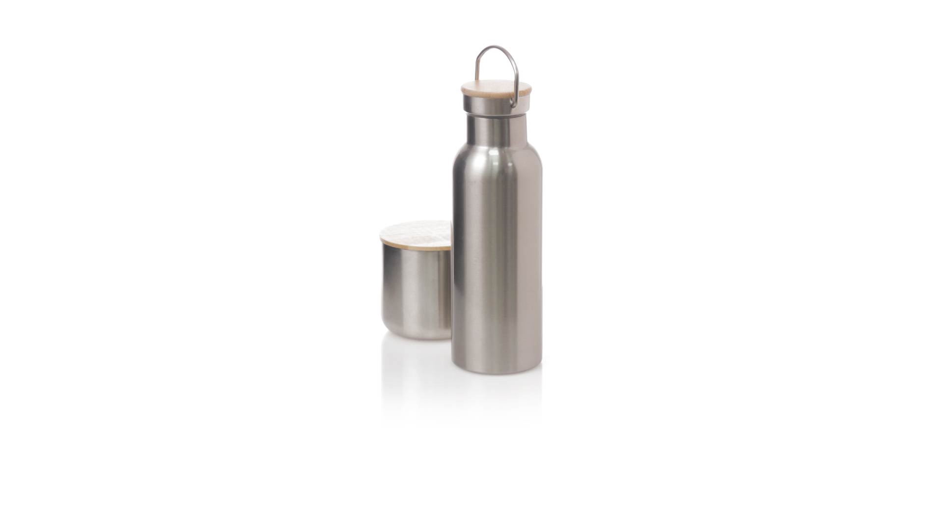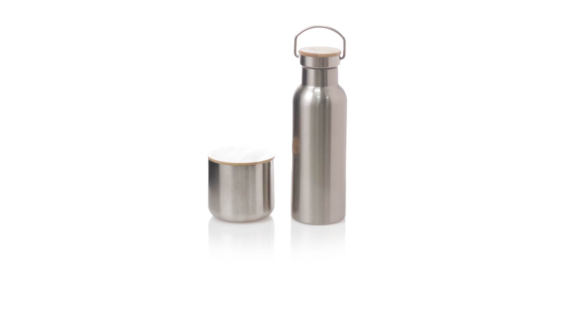 Praktisches Trink- und Thermobecher-Set aus Edelstahl. Inklusive, 500ml Thermoflasche aus Edelstahl, Schraubverschluss mit Bambusbasis und Tragegriff. Darüber hinaus enthält es 1 Becher mit einem Fassungsvermögen von 300 ml in Edelstahl und einen Bambusdeckel mit Druckverschluss. Präsentiert in einer Kraftbox.