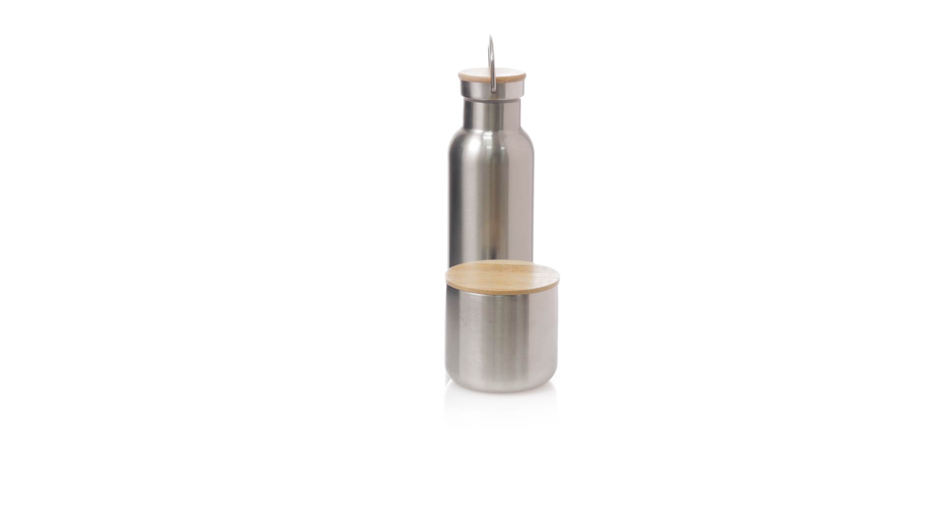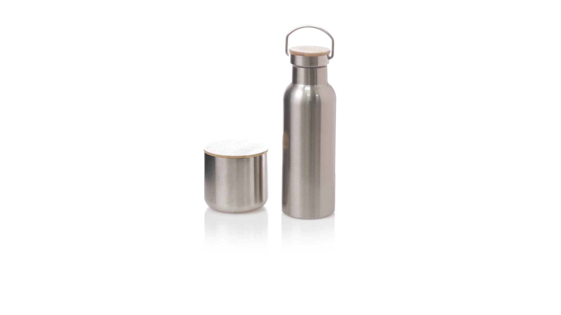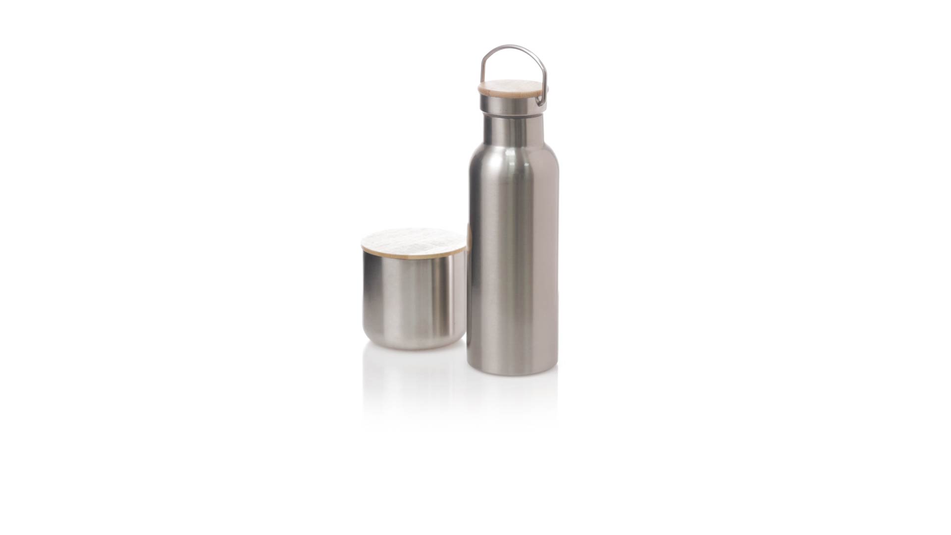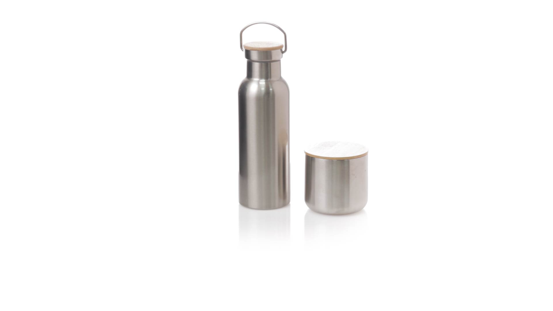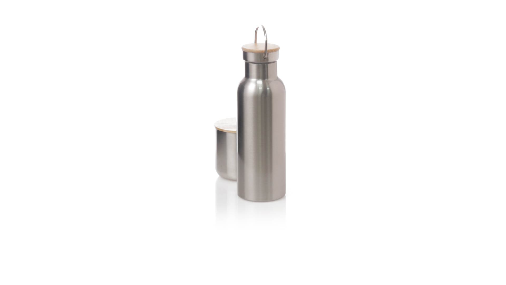 Praktisches Trink- und Thermobecher-Set aus Edelstahl. Inklusive, 500ml Thermoflasche aus Edelstahl, Schraubverschluss mit Bambusbasis und Tragegriff. Darüber hinaus enthält es 1 Becher mit einem Fassungsvermögen von 300 ml in Edelstahl und einen Bambusdeckel mit Druckverschluss. Präsentiert in einer Kraftbox.