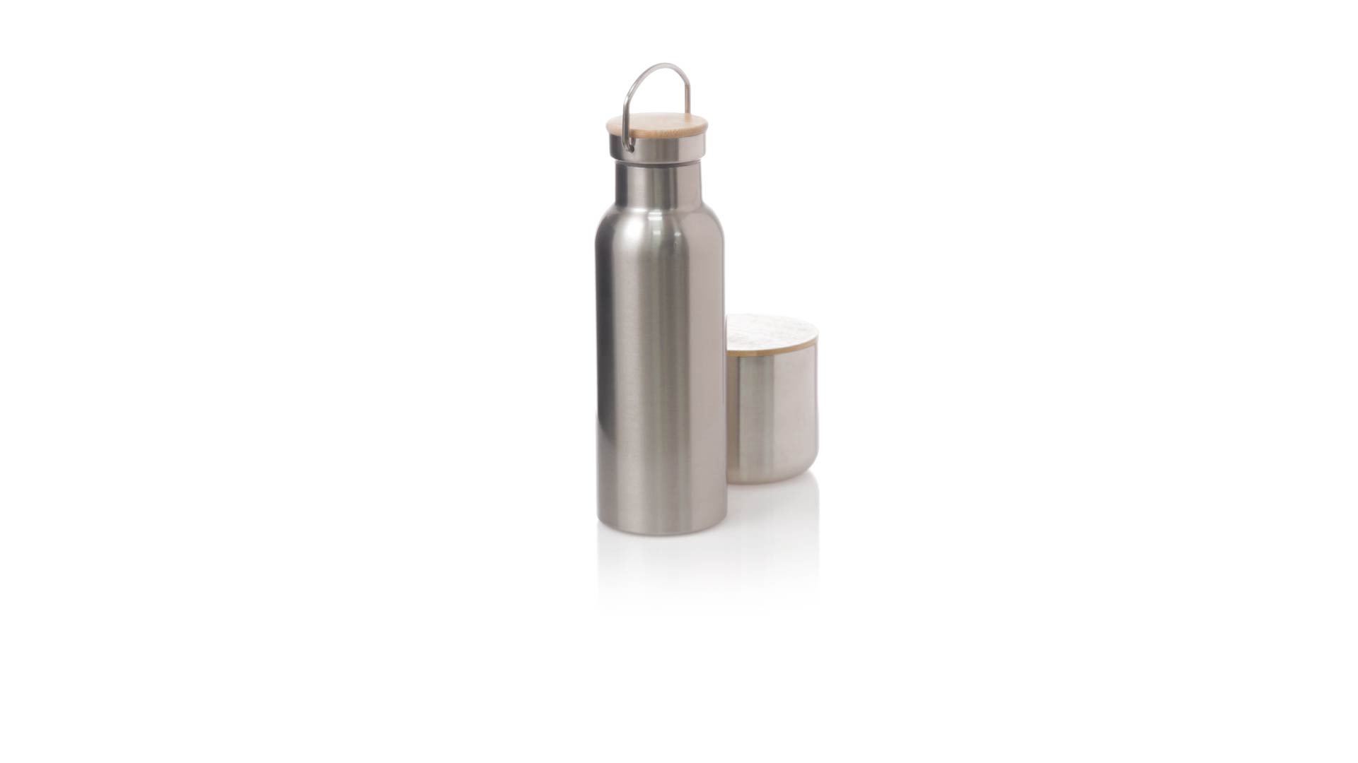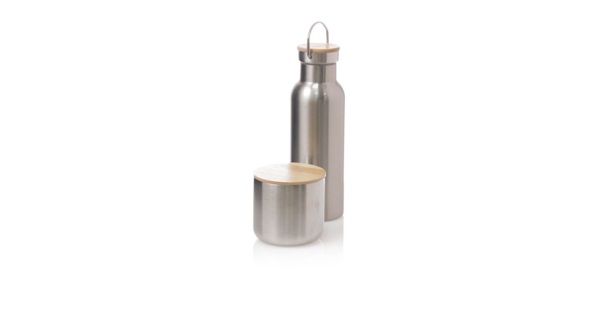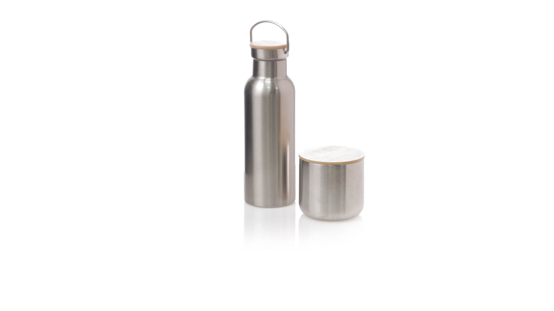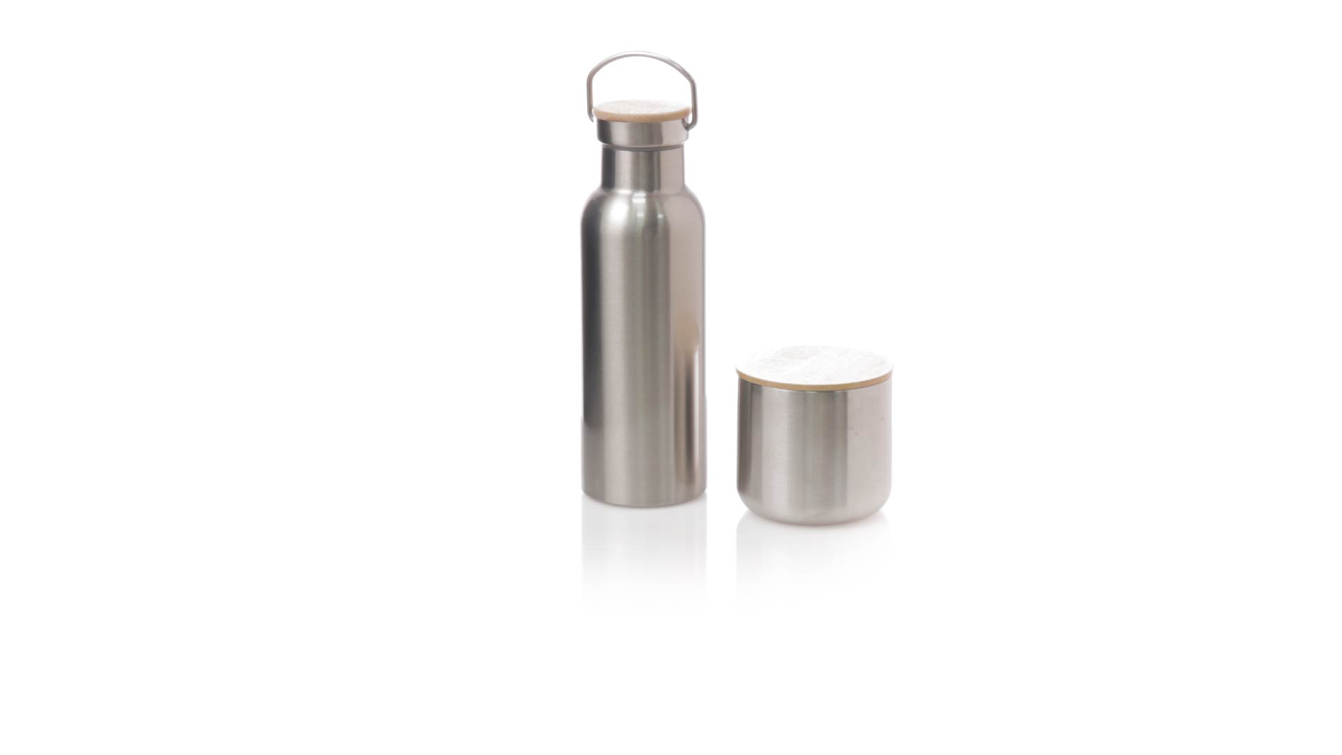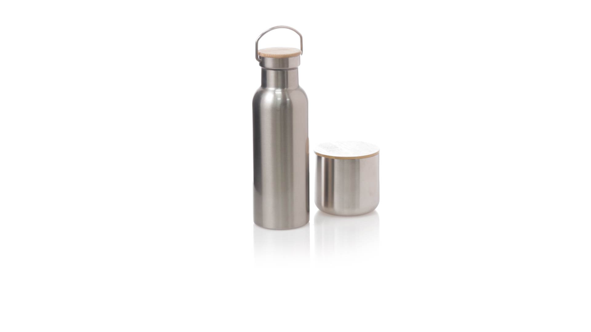 Praktisches Trink- und Thermobecher-Set aus Edelstahl. Inklusive, 500ml Thermoflasche aus Edelstahl, Schraubverschluss mit Bambusbasis und Tragegriff. Darüber hinaus enthält es 1 Becher mit einem Fassungsvermögen von 300 ml in Edelstahl und einen Bambusdeckel mit Druckverschluss. Präsentiert in einer Kraftbox.
