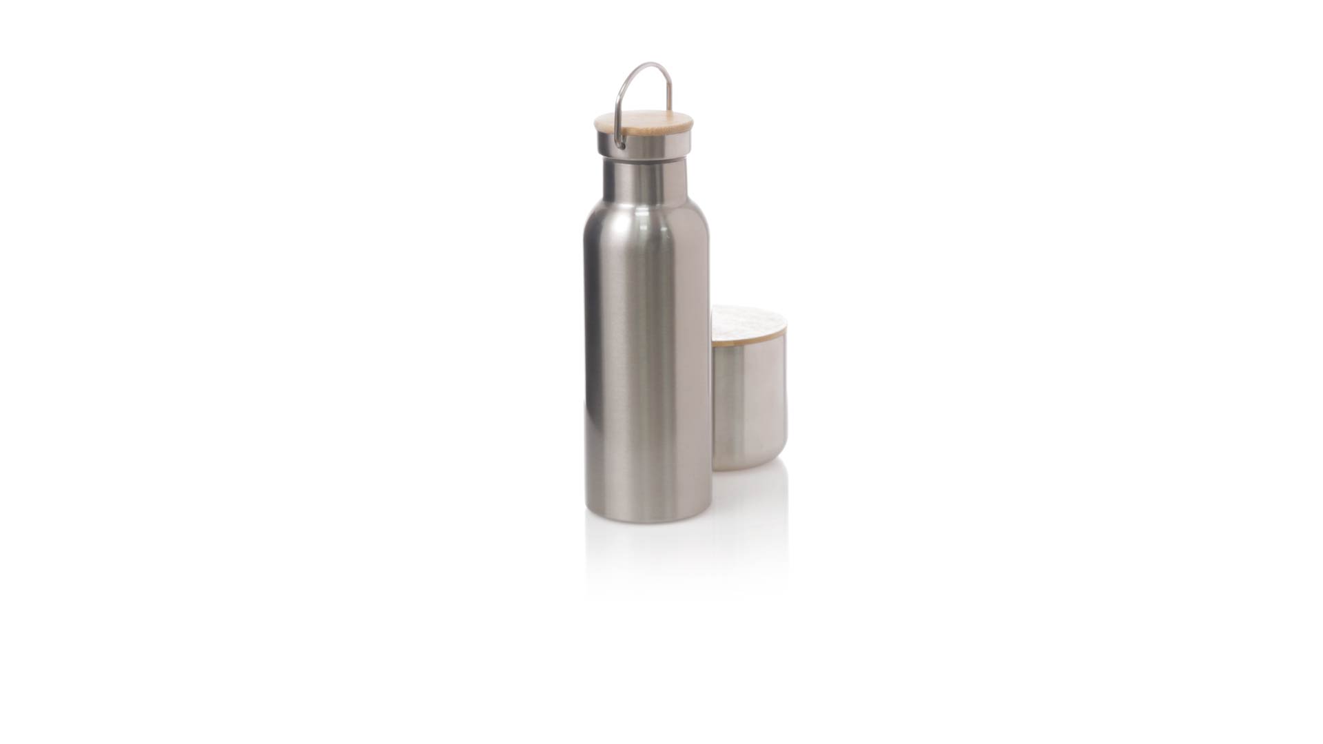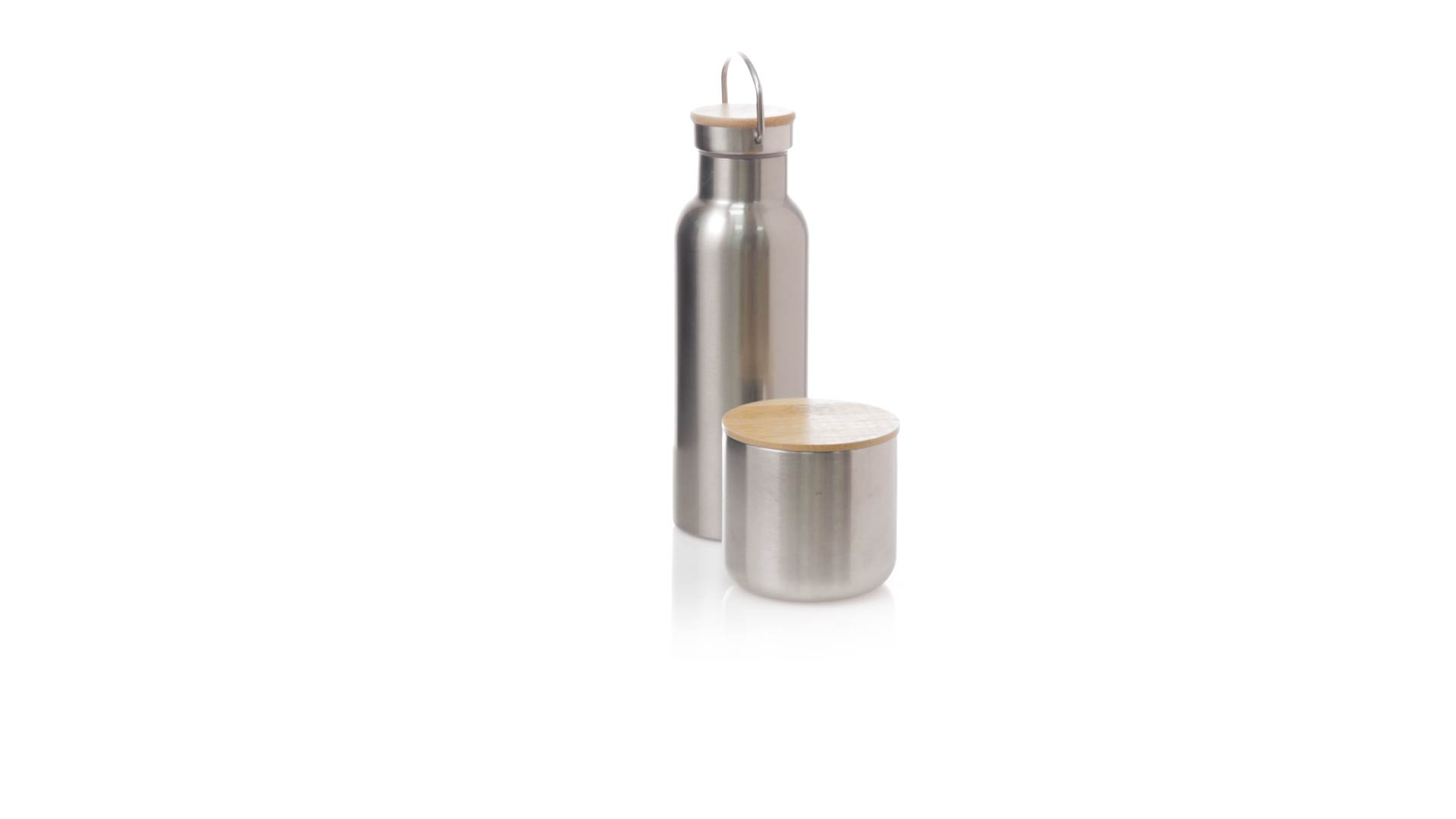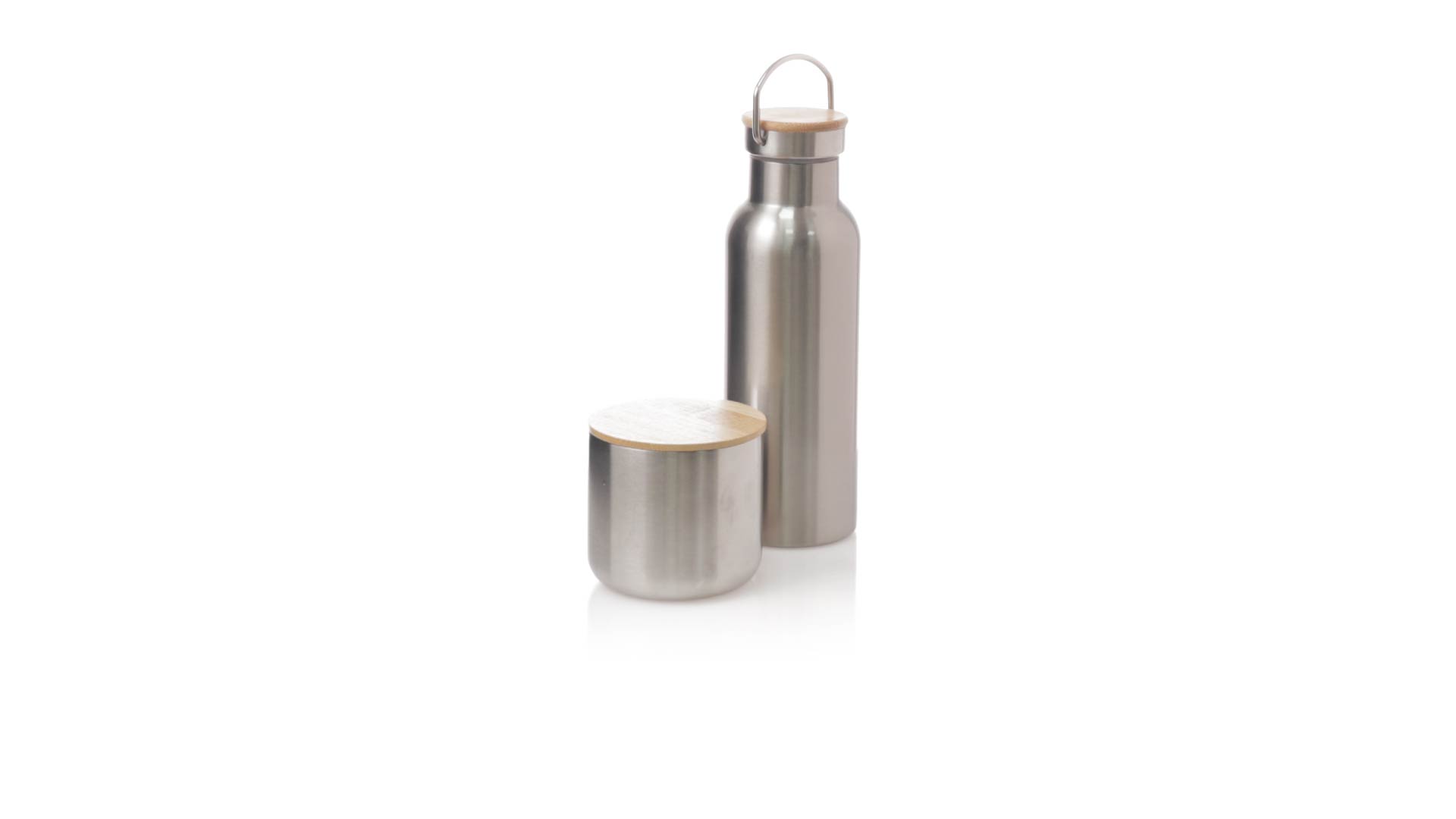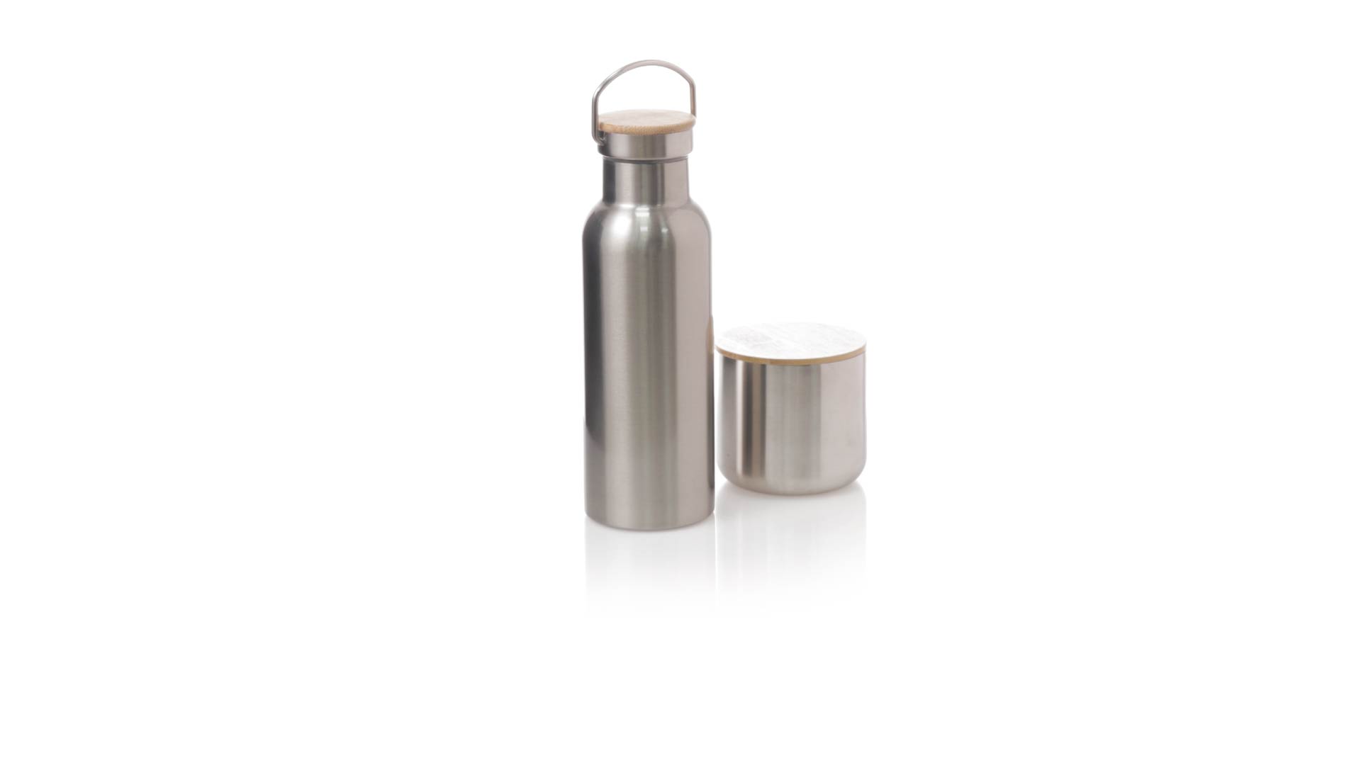Praktisches Trink- und Thermobecher-Set aus Edelstahl. Inklusive, 500ml Thermoflasche aus Edelstahl, Schraubverschluss mit Bambusbasis und Tragegriff. Darüber hinaus enthält es 1 Becher mit einem Fassungsvermögen von 300 ml in Edelstahl und einen Bambusdeckel mit Druckverschluss. Präsentiert in einer Kraftbox.