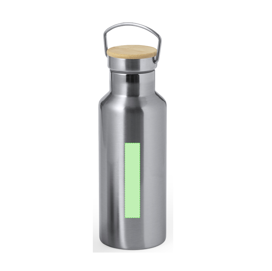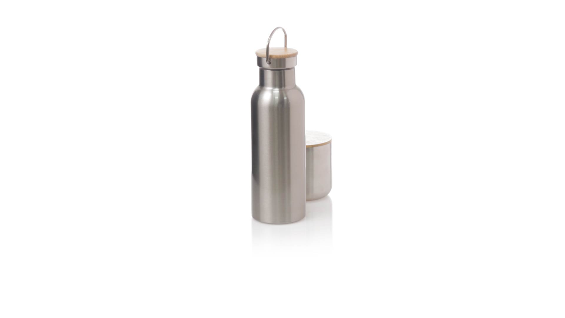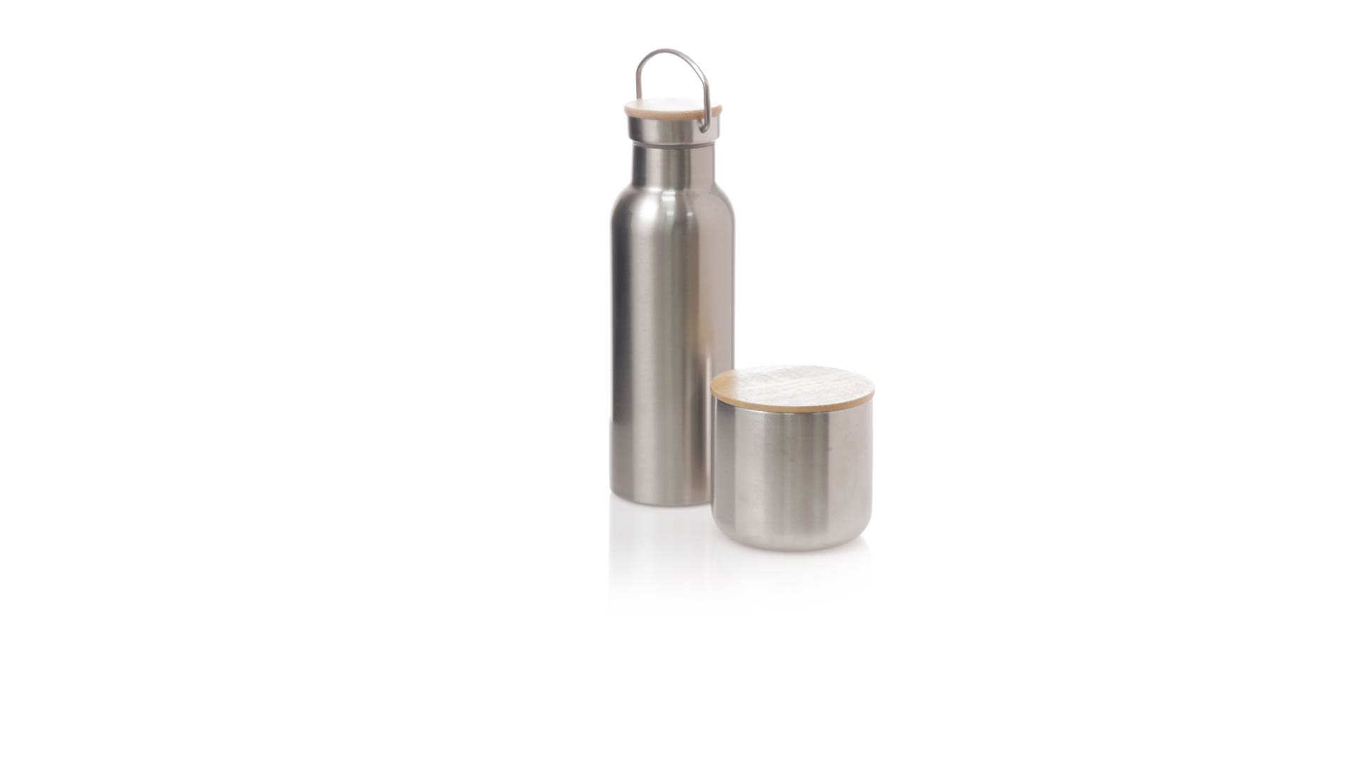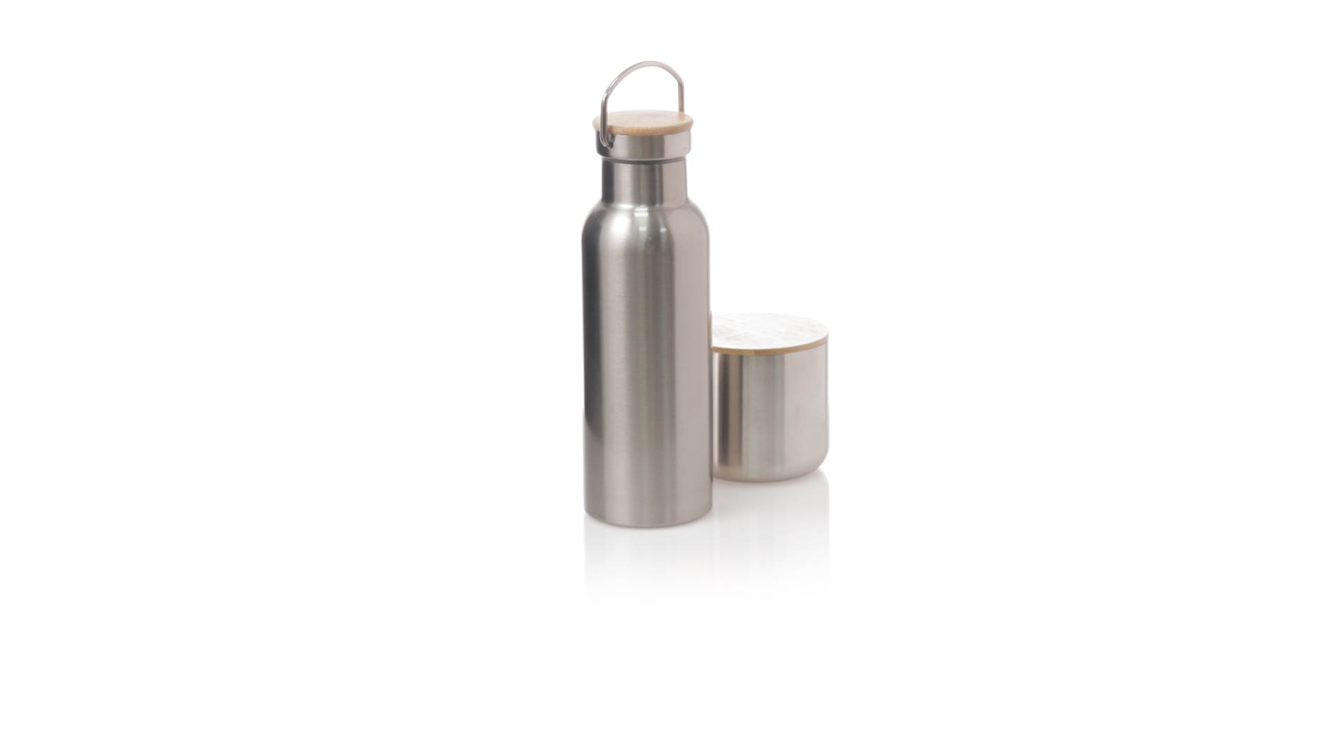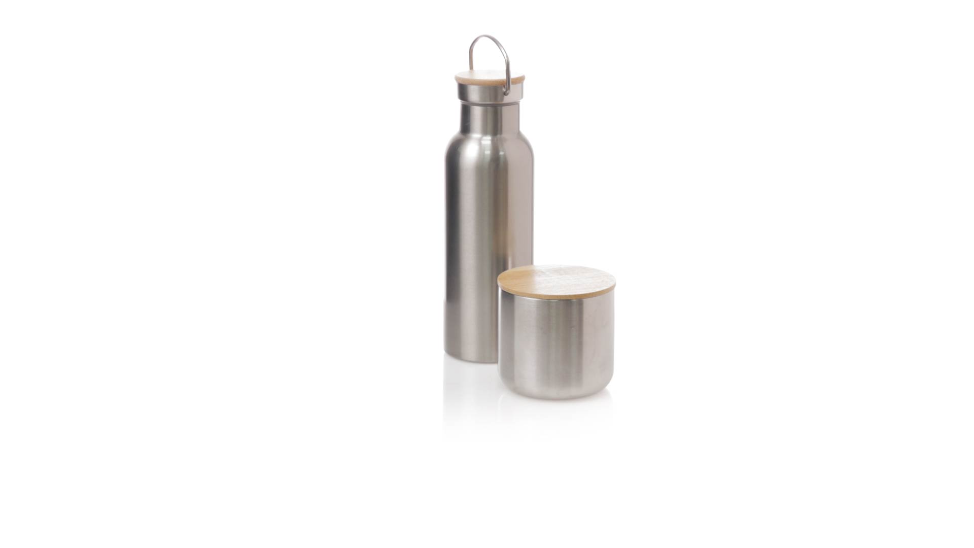 Praktisches Trink- und Thermobecher-Set aus Edelstahl. Inklusive, 500ml Thermoflasche aus Edelstahl, Schraubverschluss mit Bambusbasis und Tragegriff. Darüber hinaus enthält es 1 Becher mit einem Fassungsvermögen von 300 ml in Edelstahl und einen Bambusdeckel mit Druckverschluss. Präsentiert in einer Kraftbox.