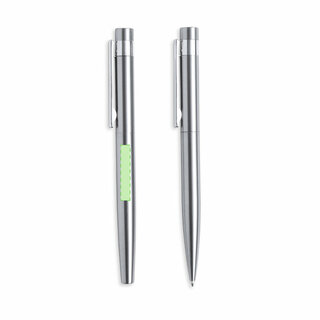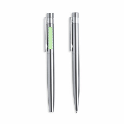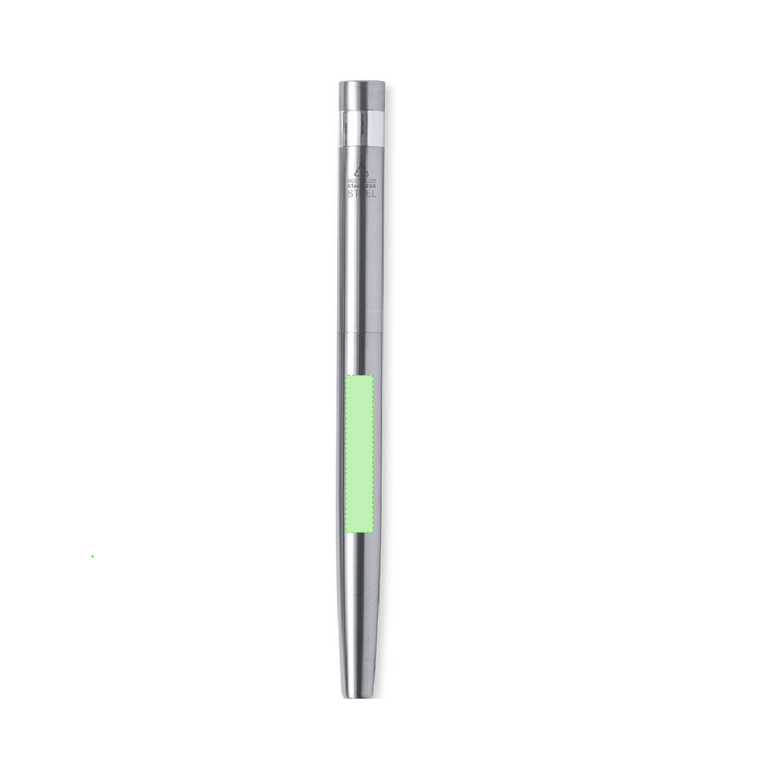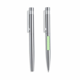 Umweltfreundliches Kugelschreiber- und Rollerball-Set, hergestellt aus recyceltem Edelstahl. Enthält:Kugelschreiber mit Drehmechanismus, versilbertem Gehäuse und verchromten Beschlägen. Metallclip und Logo für recycelten Edelstahl auf der Oberseite des Stiftes. Jumbo-Patrone und blauschreibende Tinte.Rollerball mit silberfarbenem Gehäuse und verchromten Beschlägen. Metallischer Clip und Logo für recycelten Edelstahl auf der Oberseite der Kappe. Jumbo-Patrone und blauschreibende Tinte.Das Set wird in einem individuellen Kraftkarton mit passender Hülle präsentiert.Stahl ist einer der begehrtesten Werkstoffe und fast überall zu finden, von Alltagsprodukten bis hin zu grossen Bauwerken. Es verfügt über zahlreiche Eigenschaften, darunter Langlebigkeit und ein hohes Mass an Wiederverwendbarkeit, was es zu einer hochgeschätzten Alternative für nachhaltige Lösungen macht. Richtig behandelt, lassen sich daraus neue Ressourcen von unendlichem Nutzen gewinnen.