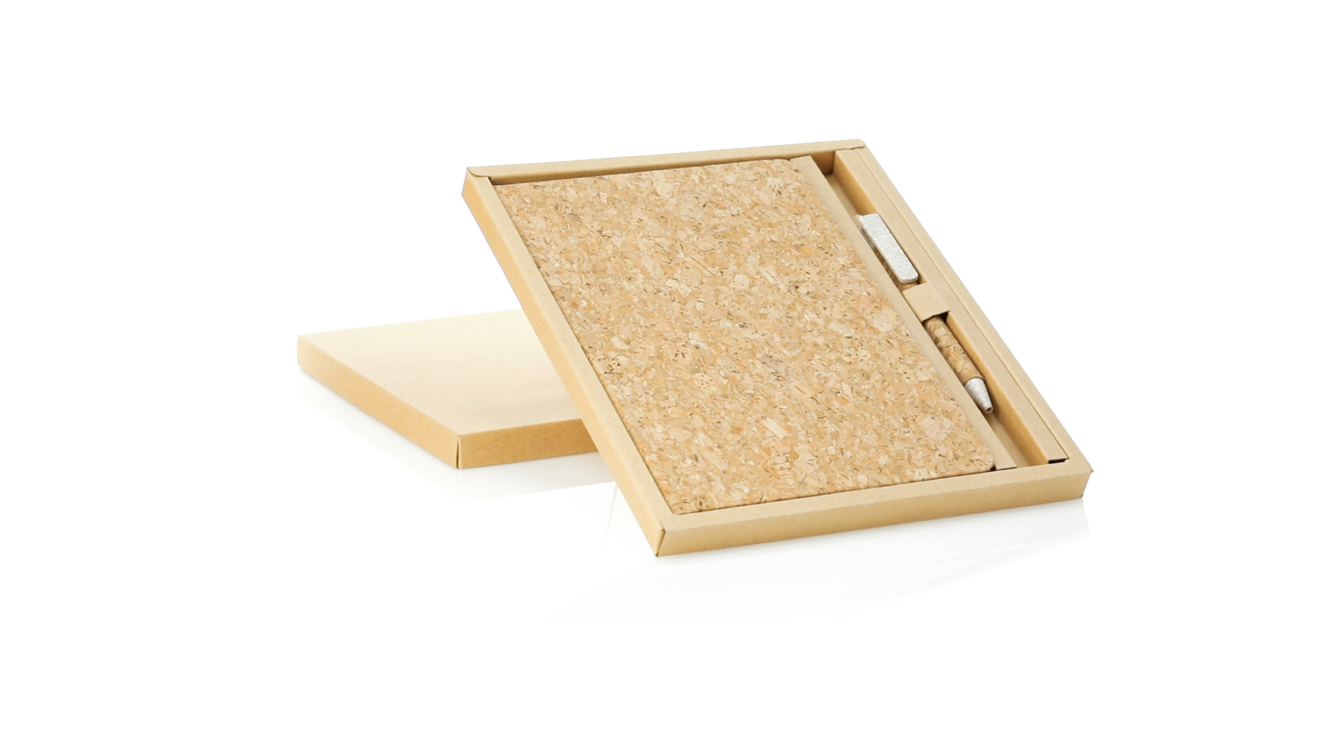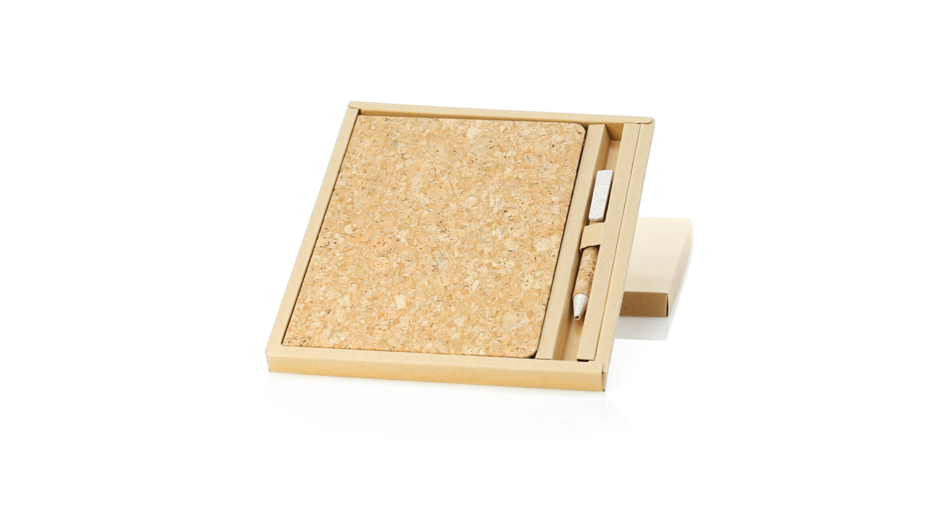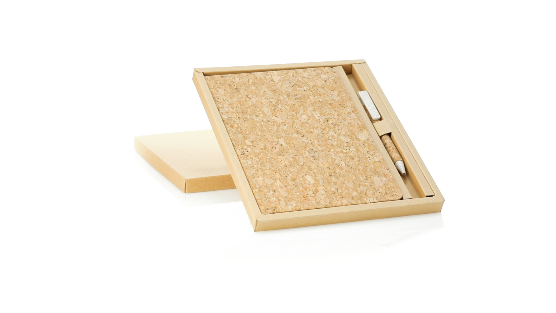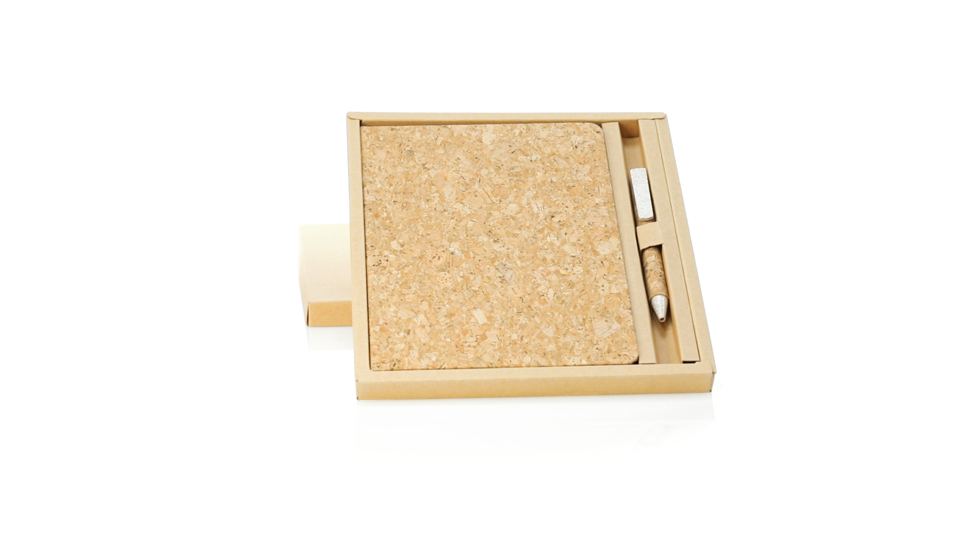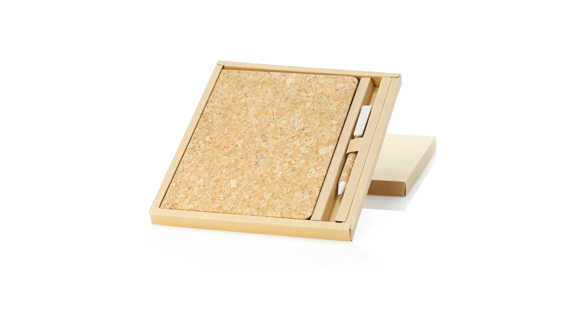 Notizblock und Kugelschreiber aus unserer Naturlinie. Notizbuch mit festem Einband aus Naturkork, mit 80 einfachen Blättern. Kugelschreiber mit Push-up-Mechanismus, mit Naturkorkkörper und Zubehör aus Weizenstroh, um die Verwendung natürlicher Rohstoffe zu fördern und die Schadstoffemissionen zu reduzieren. Präsentiert in einem gestanzten Kartonetui mit Öko-Design. Schwarze Tinte.