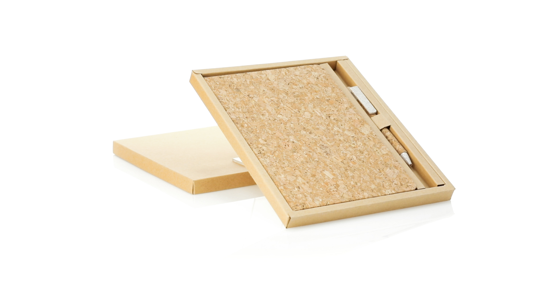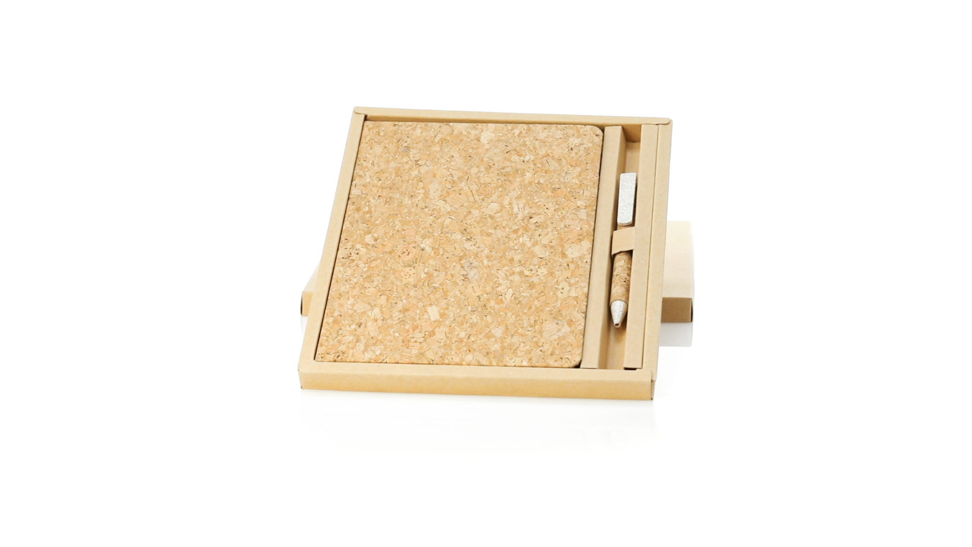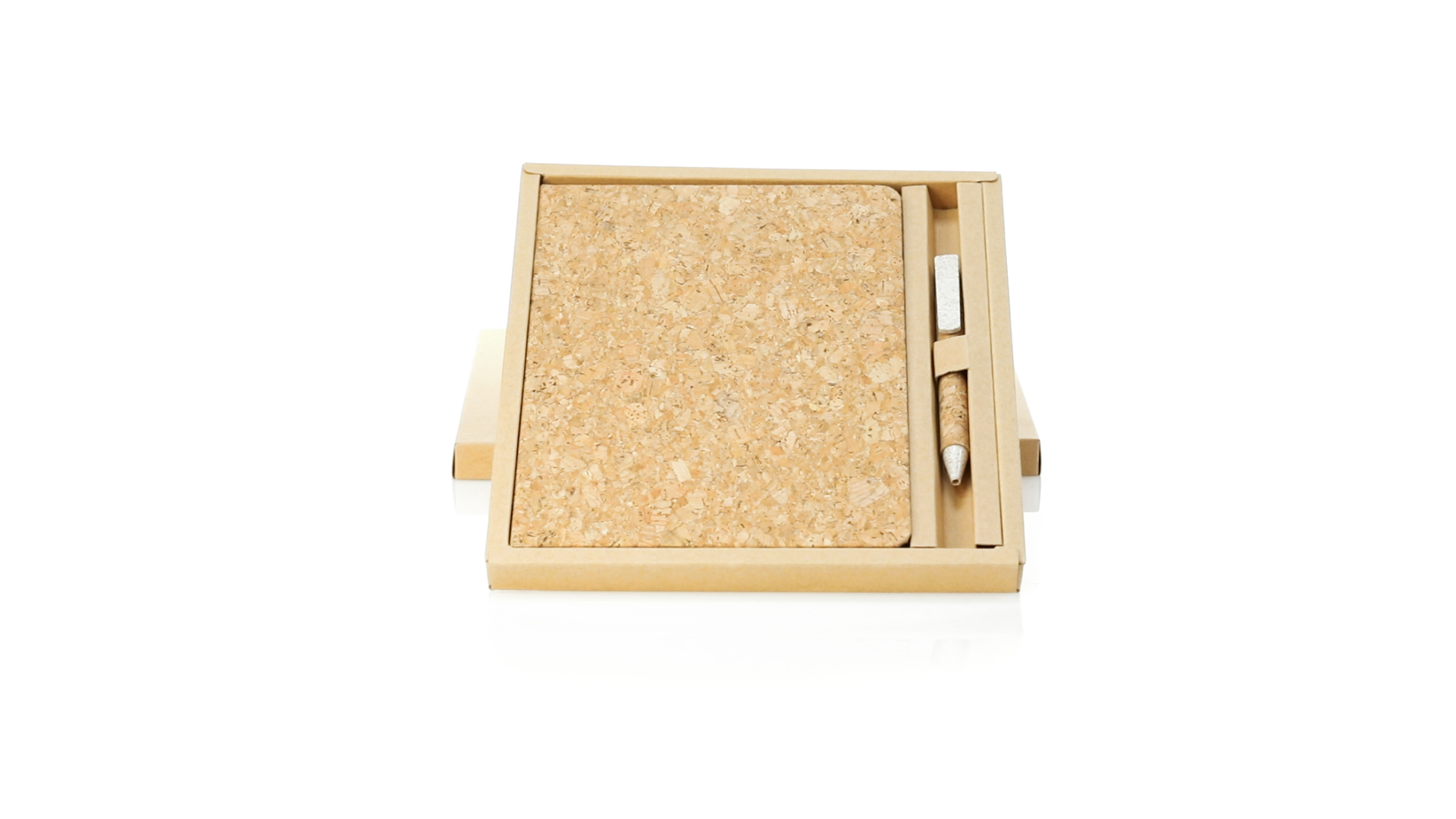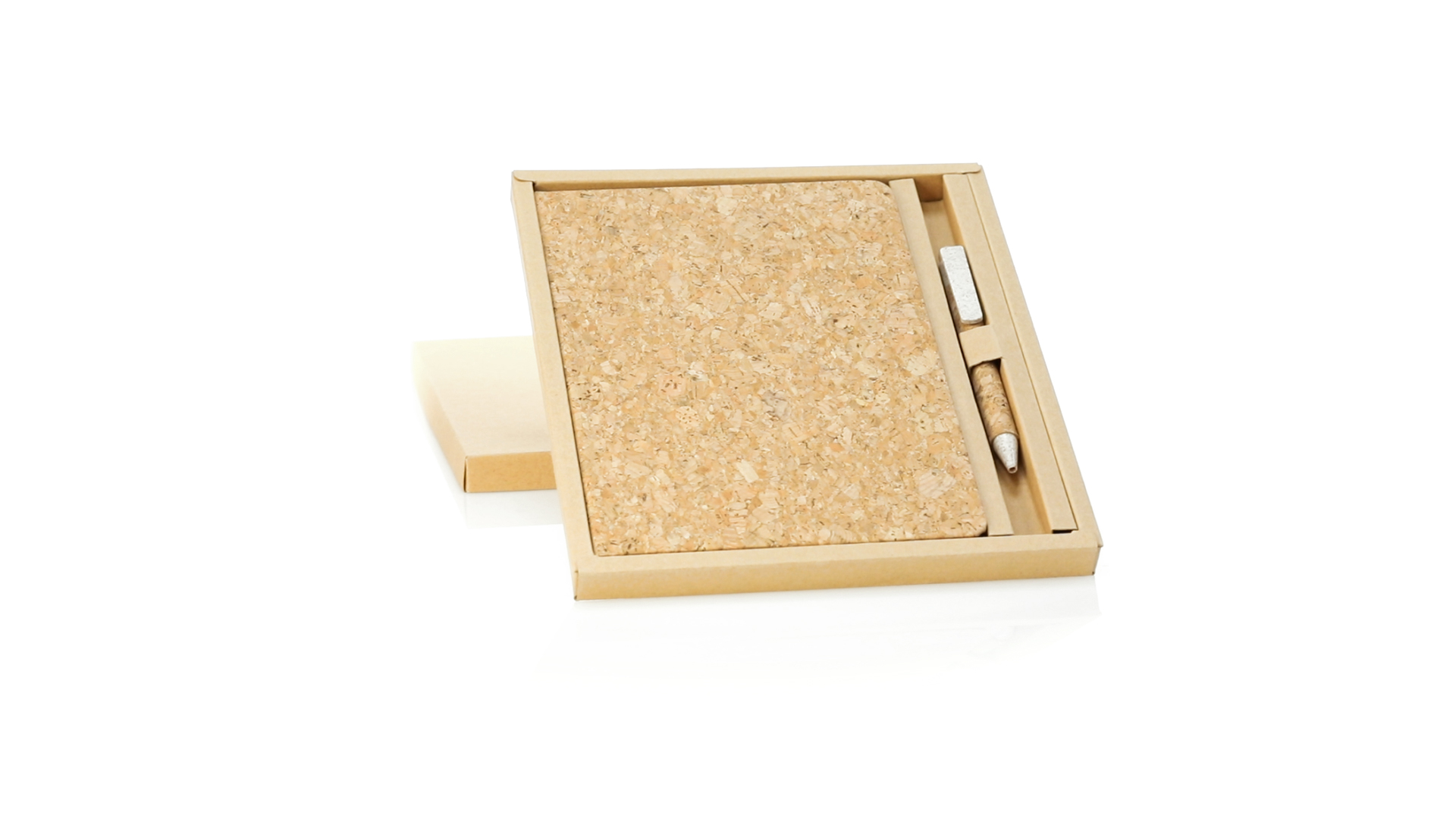 Notizblock und Kugelschreiber aus unserer Naturlinie. Notizbuch mit festem Einband aus Naturkork, mit 80 einfachen Blättern. Kugelschreiber mit Push-up-Mechanismus, mit Naturkorkkörper und Zubehör aus Weizenstroh, um die Verwendung natürlicher Rohstoffe zu fördern und die Schadstoffemissionen zu reduzieren. Präsentiert in einem gestanzten Kartonetui mit Öko-Design. Schwarze Tinte.
