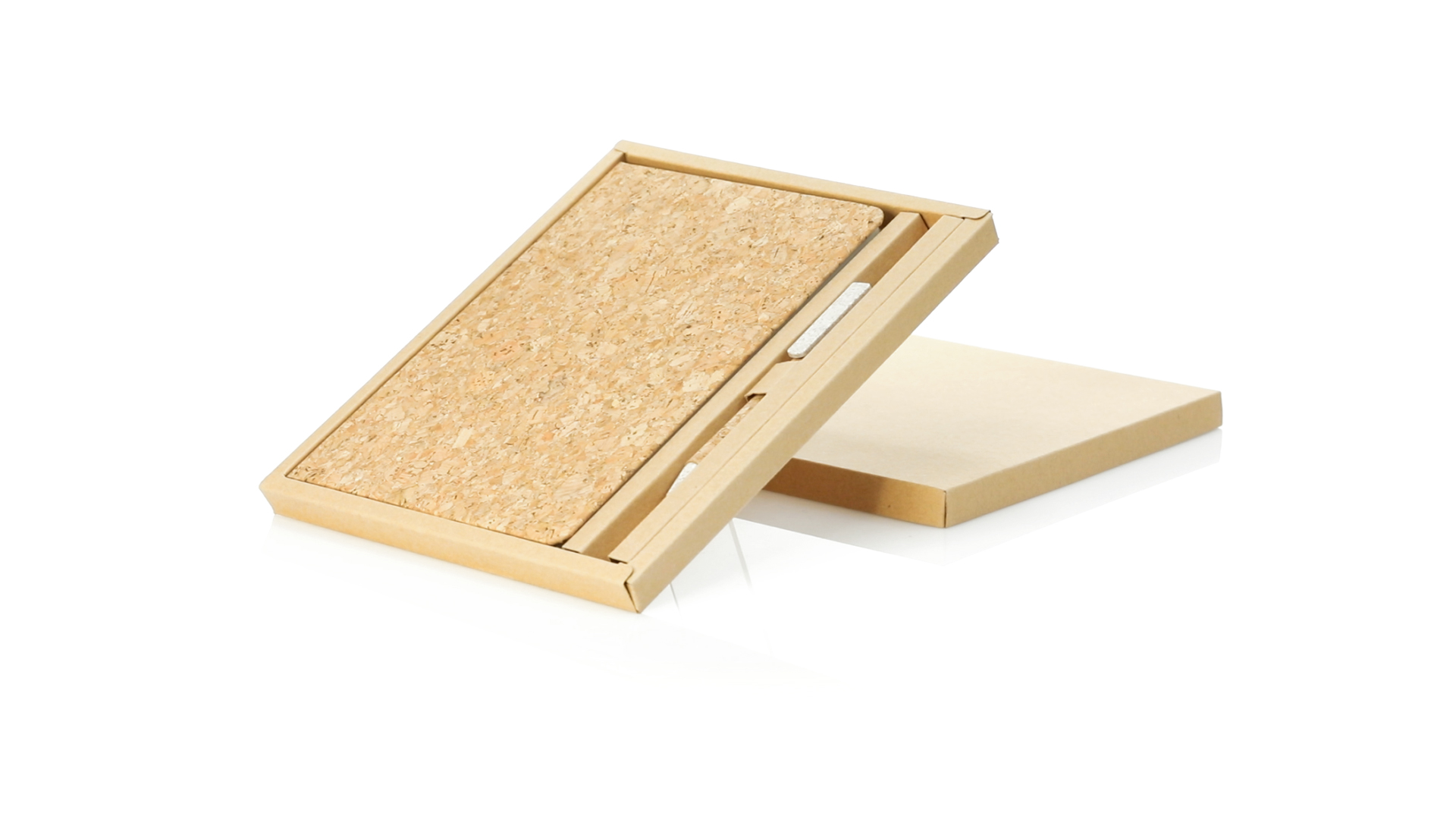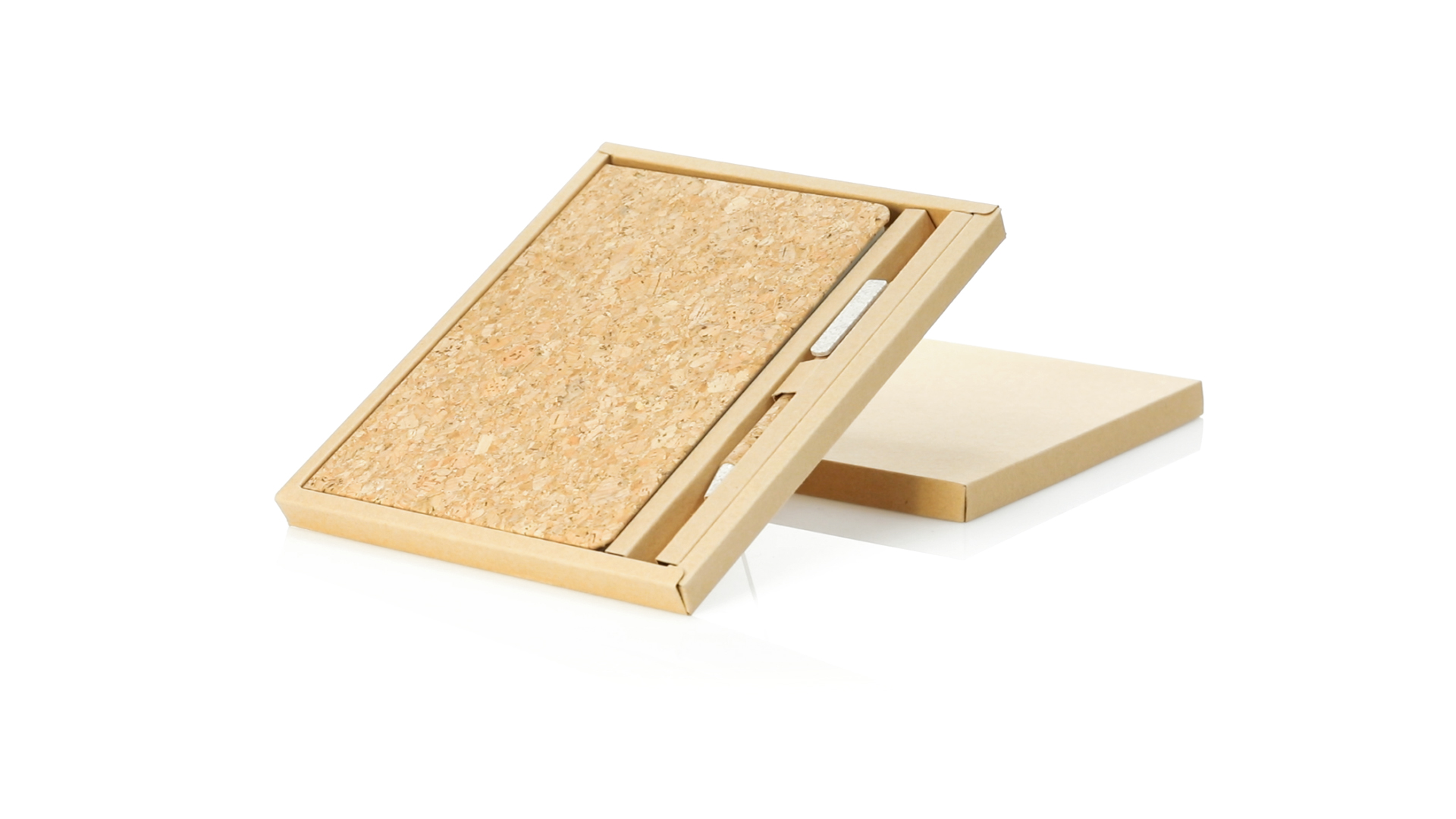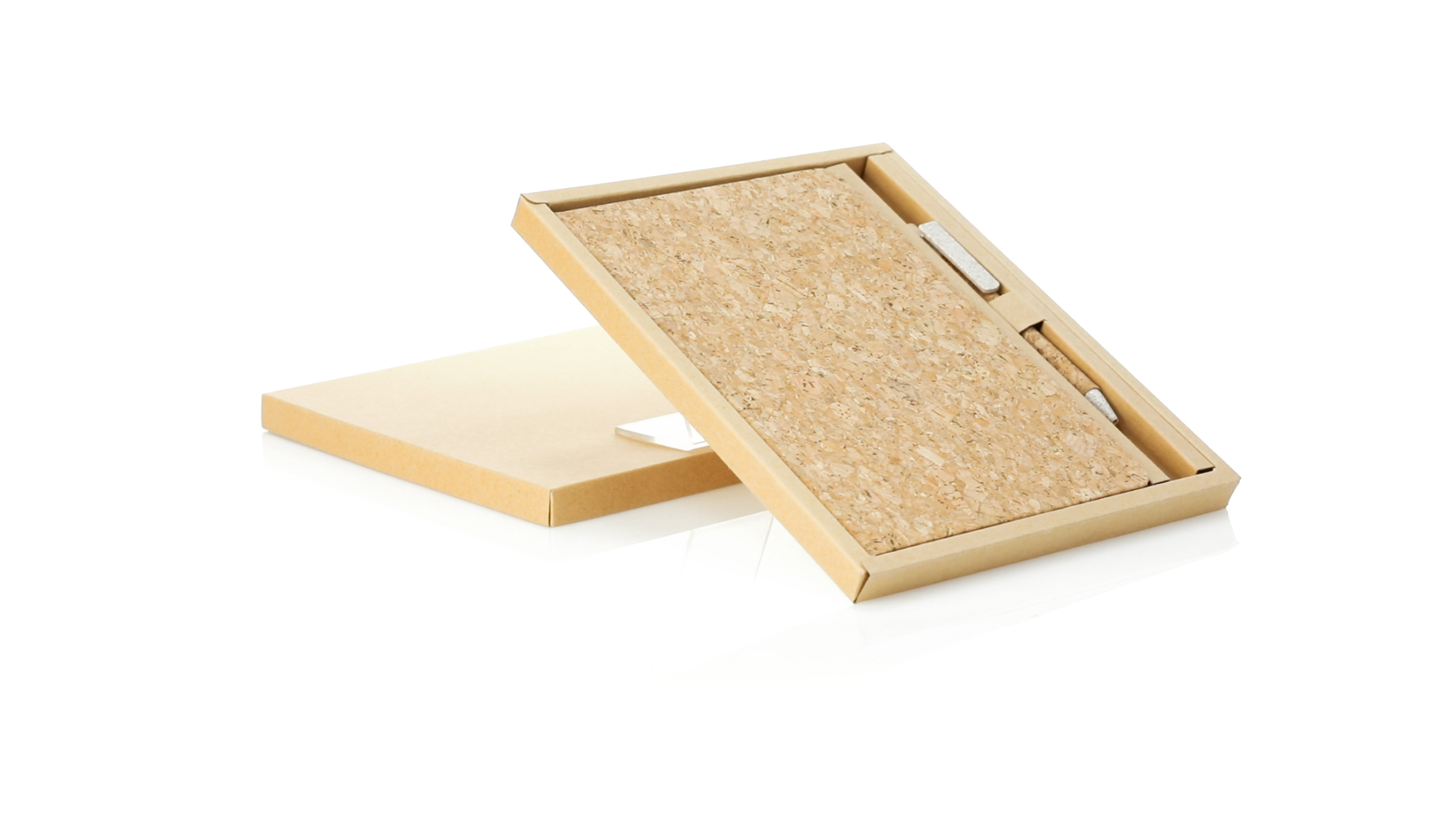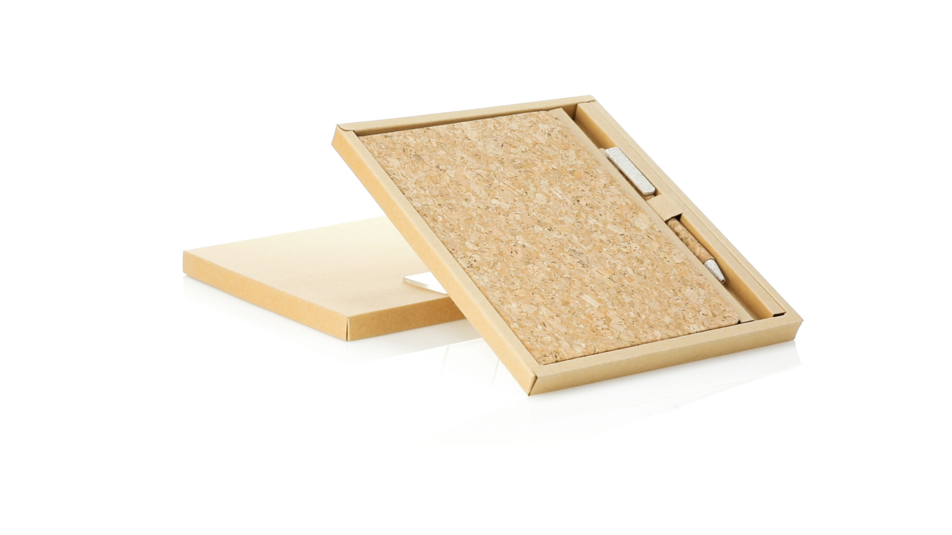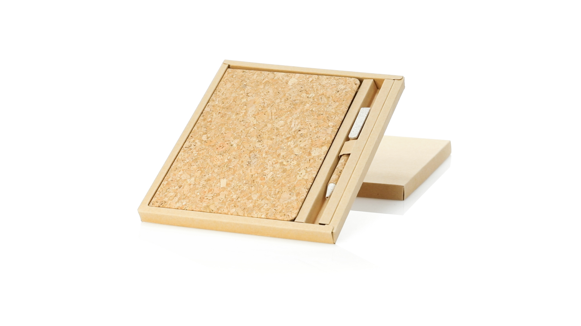 Notizblock und Kugelschreiber aus unserer Naturlinie. Notizbuch mit festem Einband aus Naturkork, mit 80 einfachen Blättern. Kugelschreiber mit Push-up-Mechanismus, mit Naturkorkkörper und Zubehör aus Weizenstroh, um die Verwendung natürlicher Rohstoffe zu fördern und die Schadstoffemissionen zu reduzieren. Präsentiert in einem gestanzten Kartonetui mit Öko-Design. Schwarze Tinte.