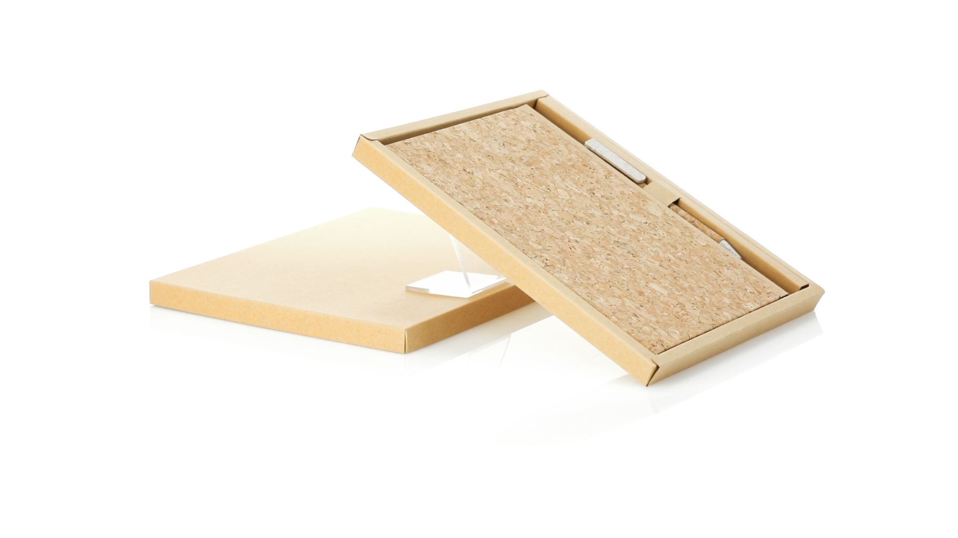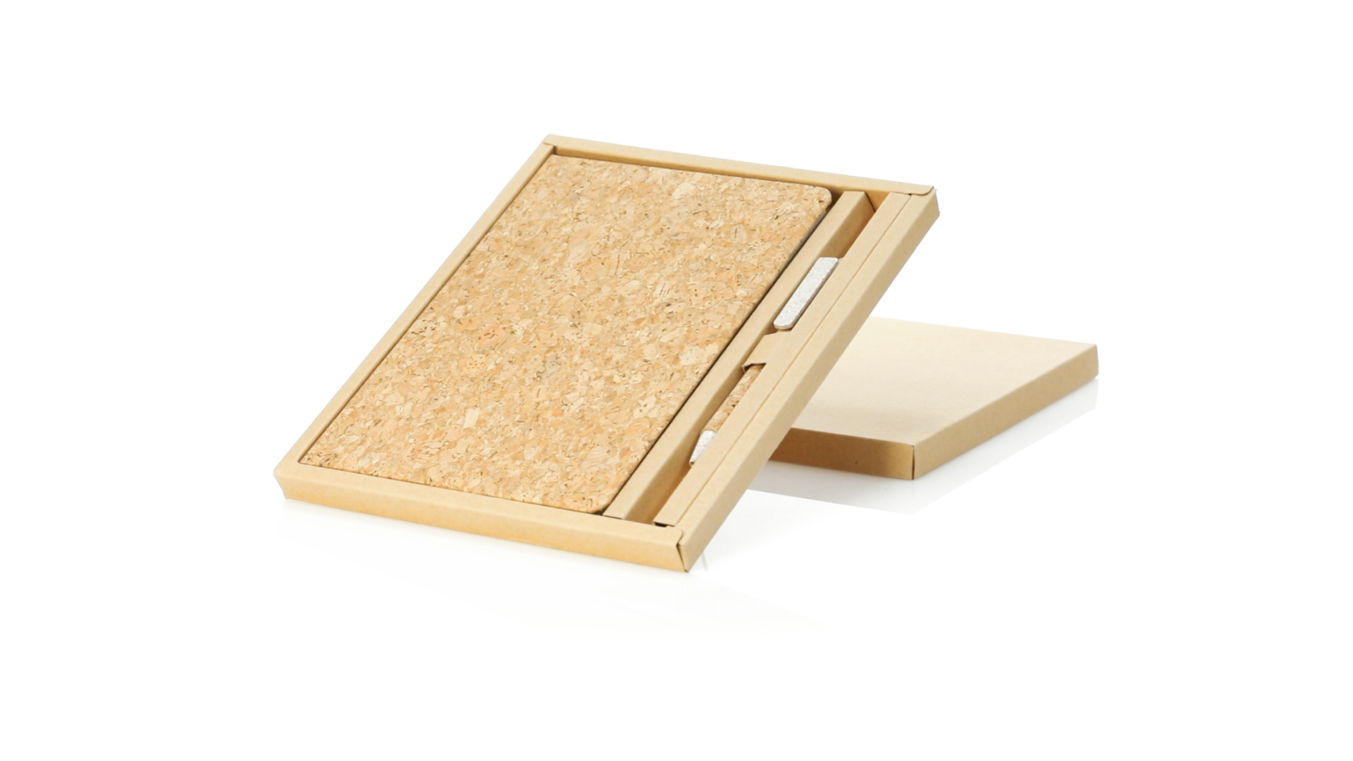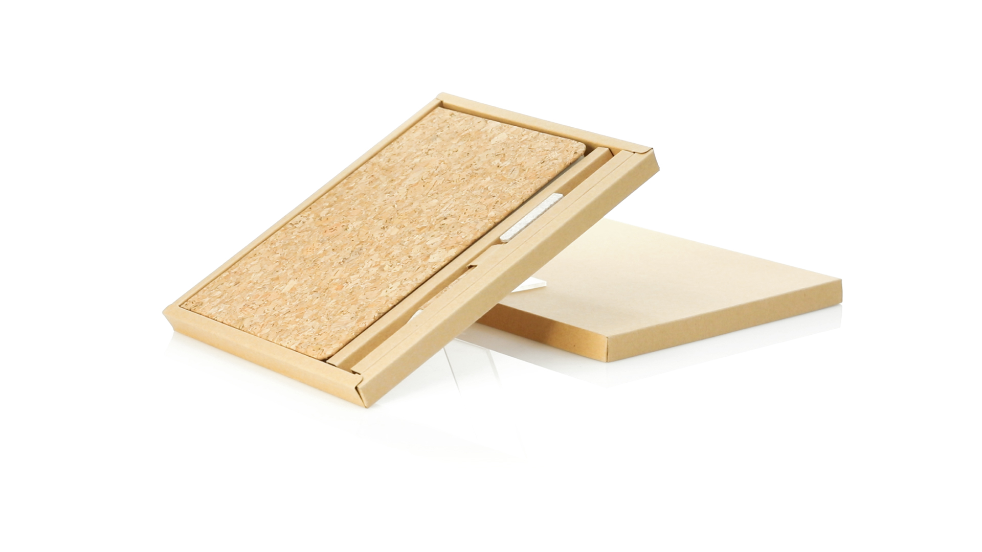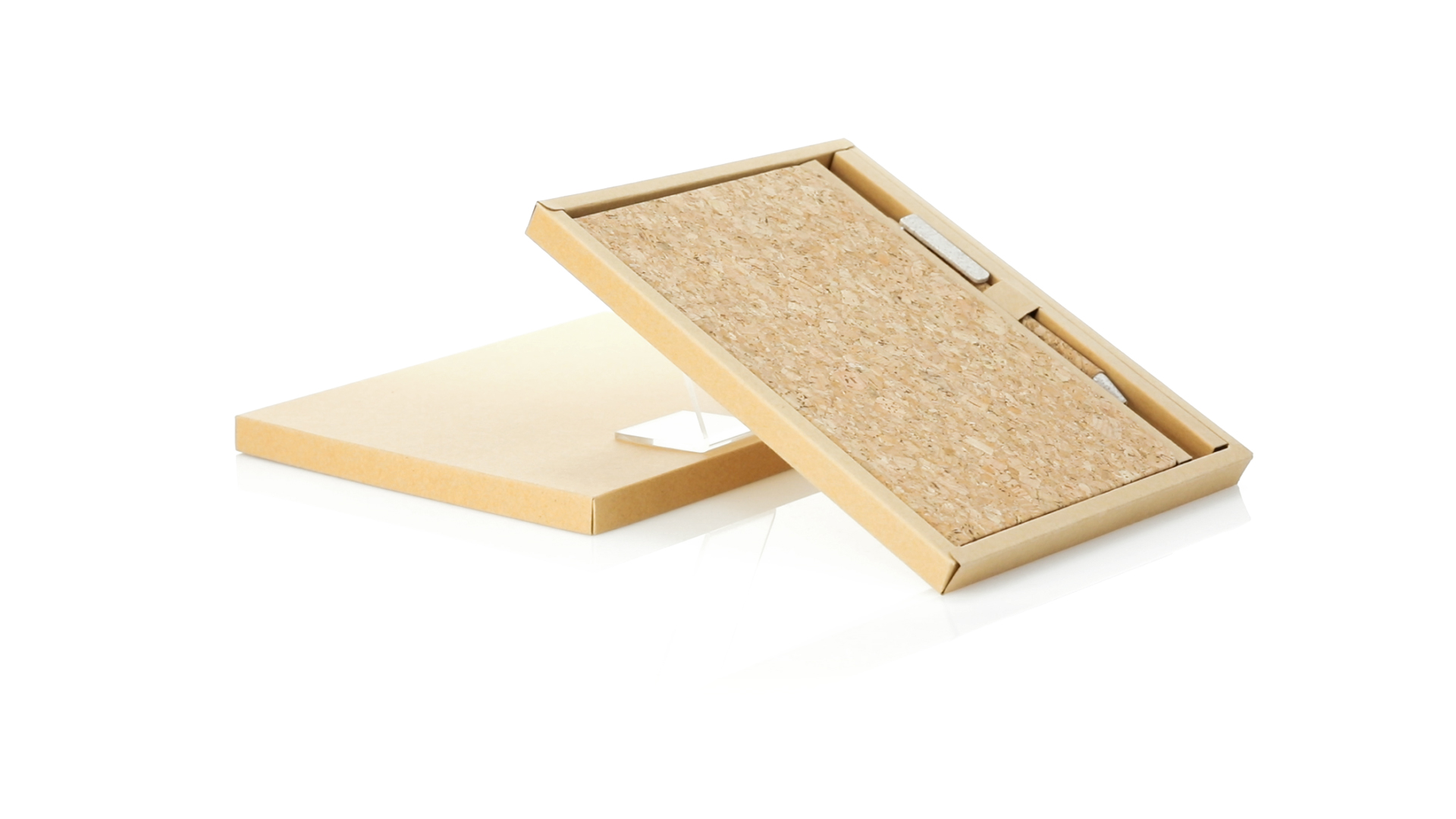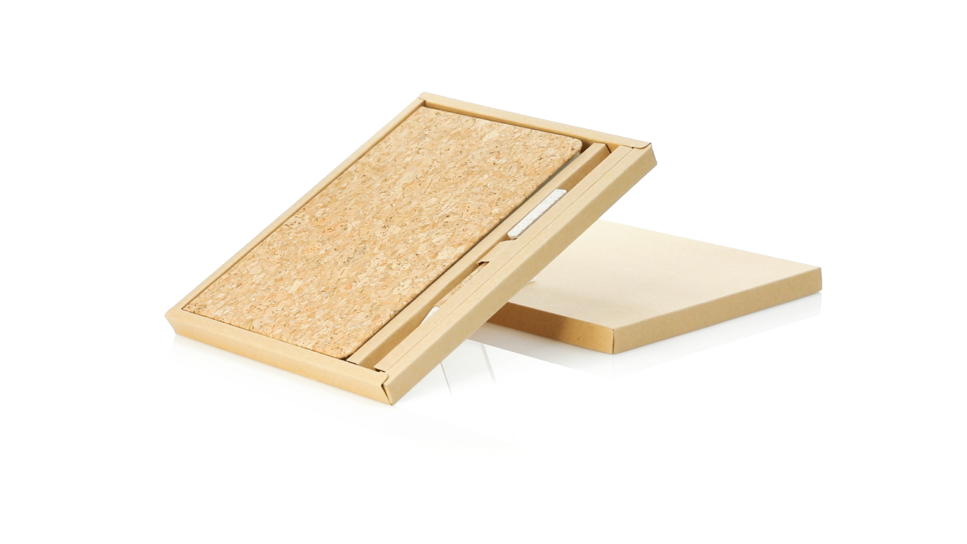 Notizblock und Kugelschreiber aus unserer Naturlinie. Notizbuch mit festem Einband aus Naturkork, mit 80 einfachen Blättern. Kugelschreiber mit Push-up-Mechanismus, mit Naturkorkkörper und Zubehör aus Weizenstroh, um die Verwendung natürlicher Rohstoffe zu fördern und die Schadstoffemissionen zu reduzieren. Präsentiert in einem gestanzten Kartonetui mit Öko-Design. Schwarze Tinte.