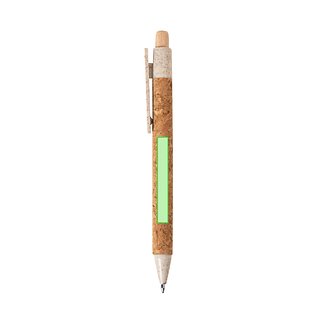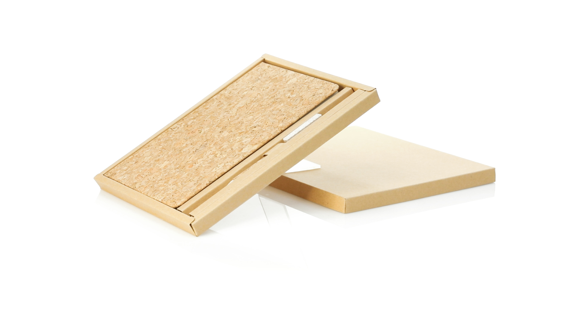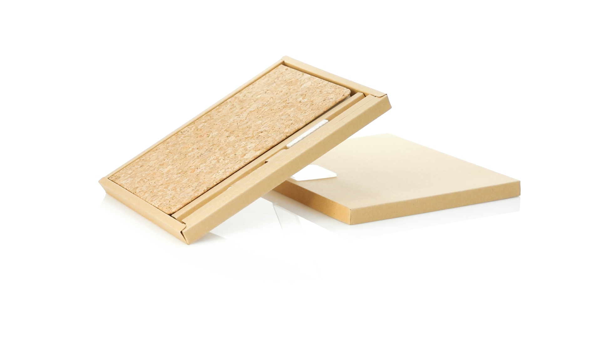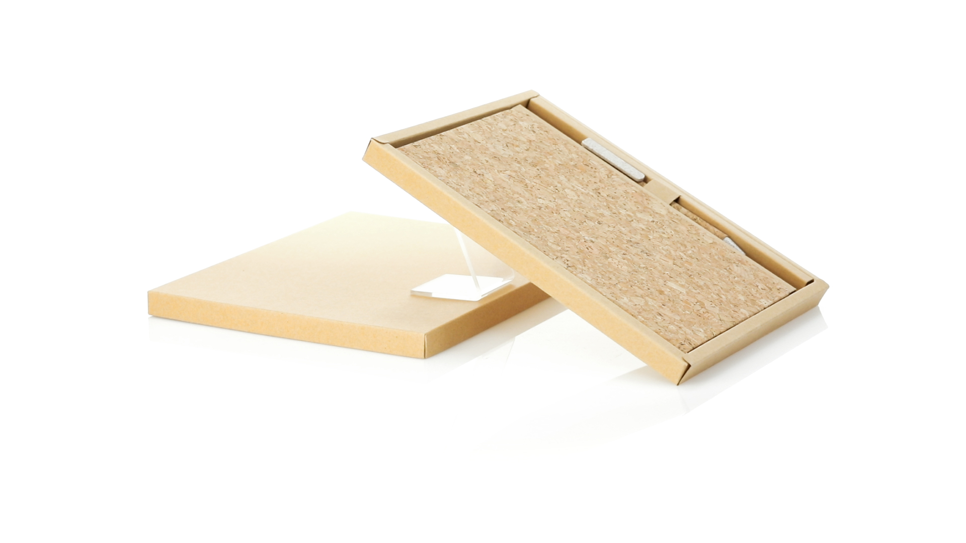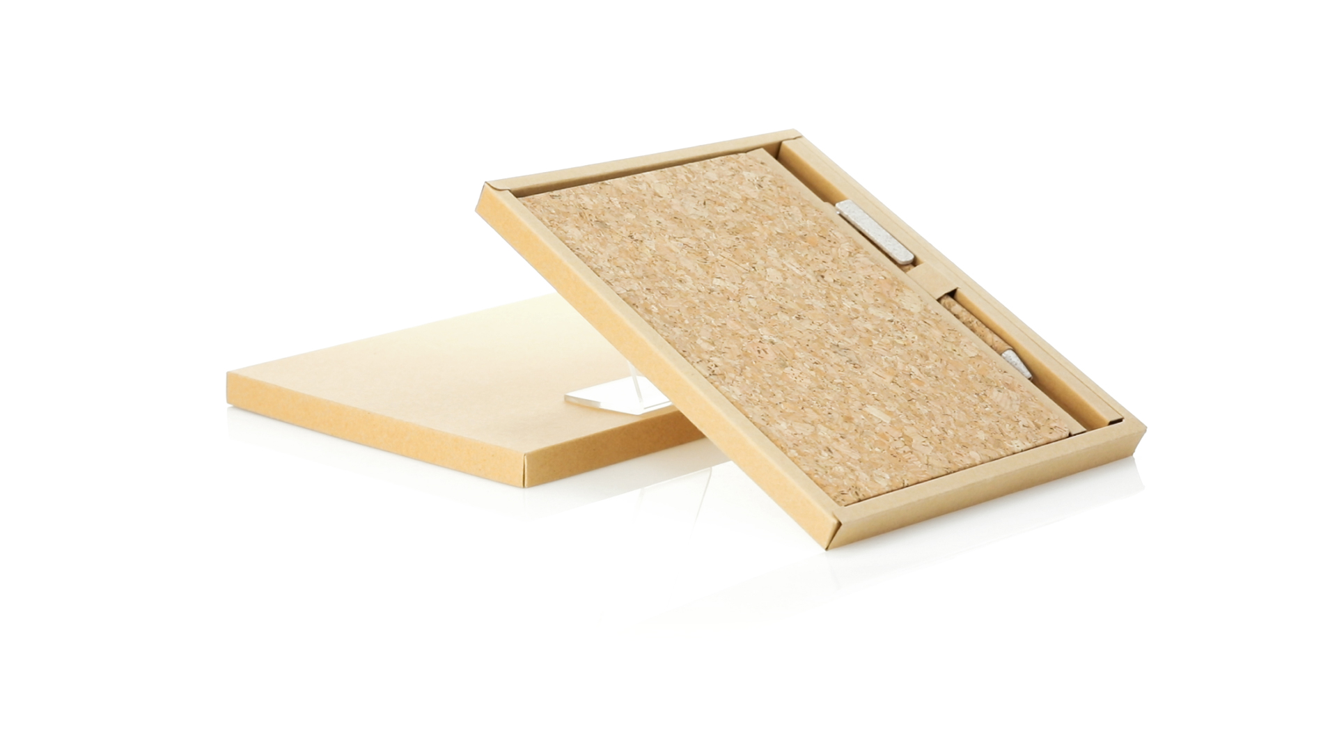 Notizblock und Kugelschreiber aus unserer Naturlinie. Notizbuch mit festem Einband aus Naturkork, mit 80 einfachen Blättern. Kugelschreiber mit Push-up-Mechanismus, mit Naturkorkkörper und Zubehör aus Weizenstroh, um die Verwendung natürlicher Rohstoffe zu fördern und die Schadstoffemissionen zu reduzieren. Präsentiert in einem gestanzten Kartonetui mit Öko-Design. Schwarze Tinte.