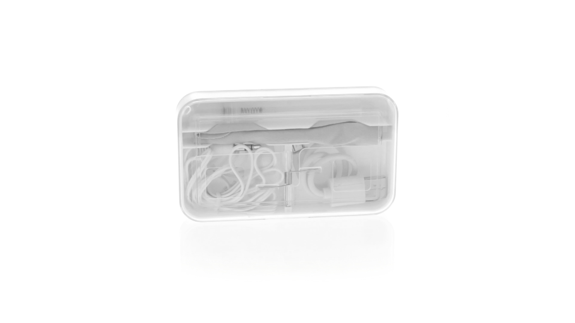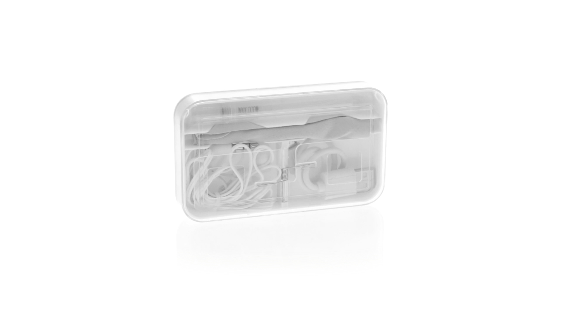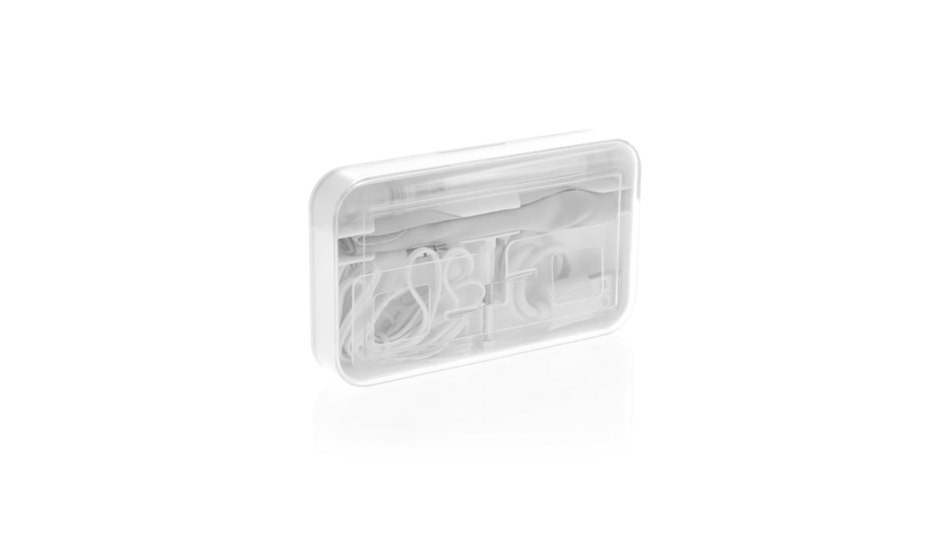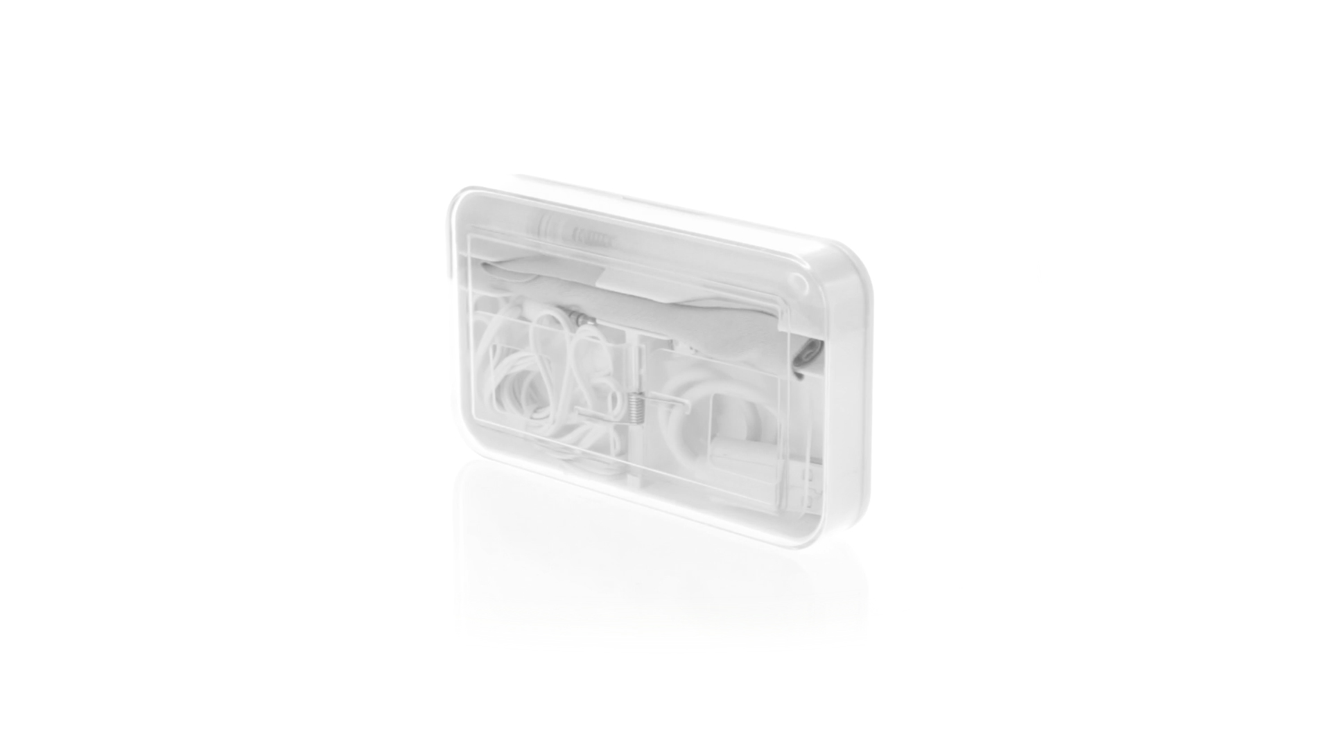 4-in-1 Set aus Kopfhörern, Reinigungstuch, Mini-Sprayflasche und Mini-USB-Kabel. Mit trendigen Kopfhörern in Weiss mit farblich passendem Kabel und 3,5-mm-Klinkenstecker, weissem Mikrofaser-Reinigungstuch und transparenter, wiederbefüllbarer Sprayflasche (ohne Flüssigkeit) sowie Mini-USB-Ladekabel. Präsentiert in einem eleganten Case in passender Farbe.