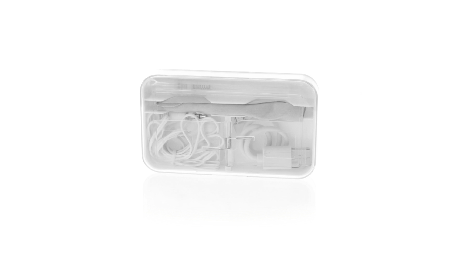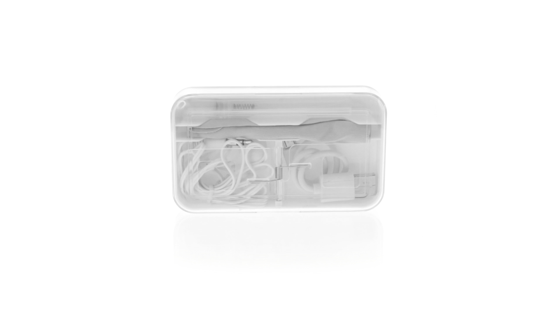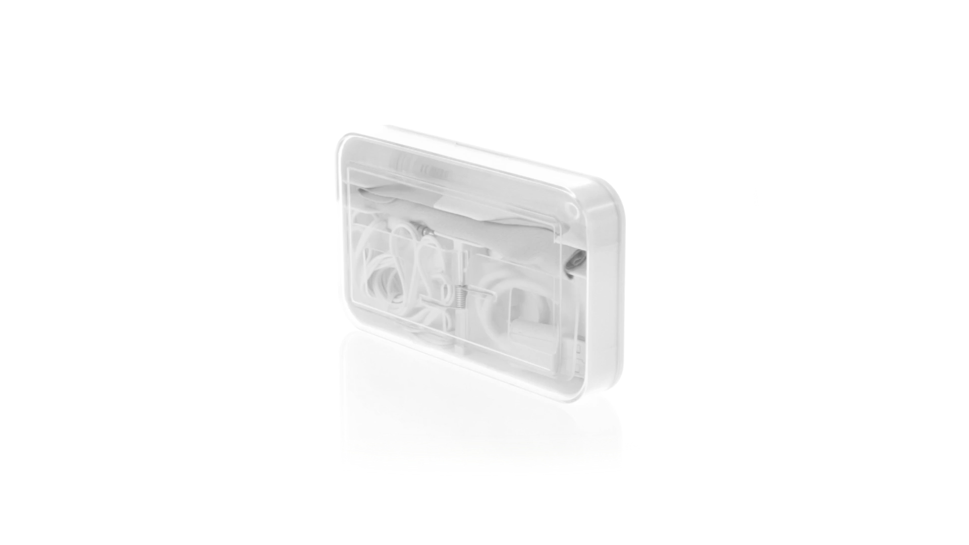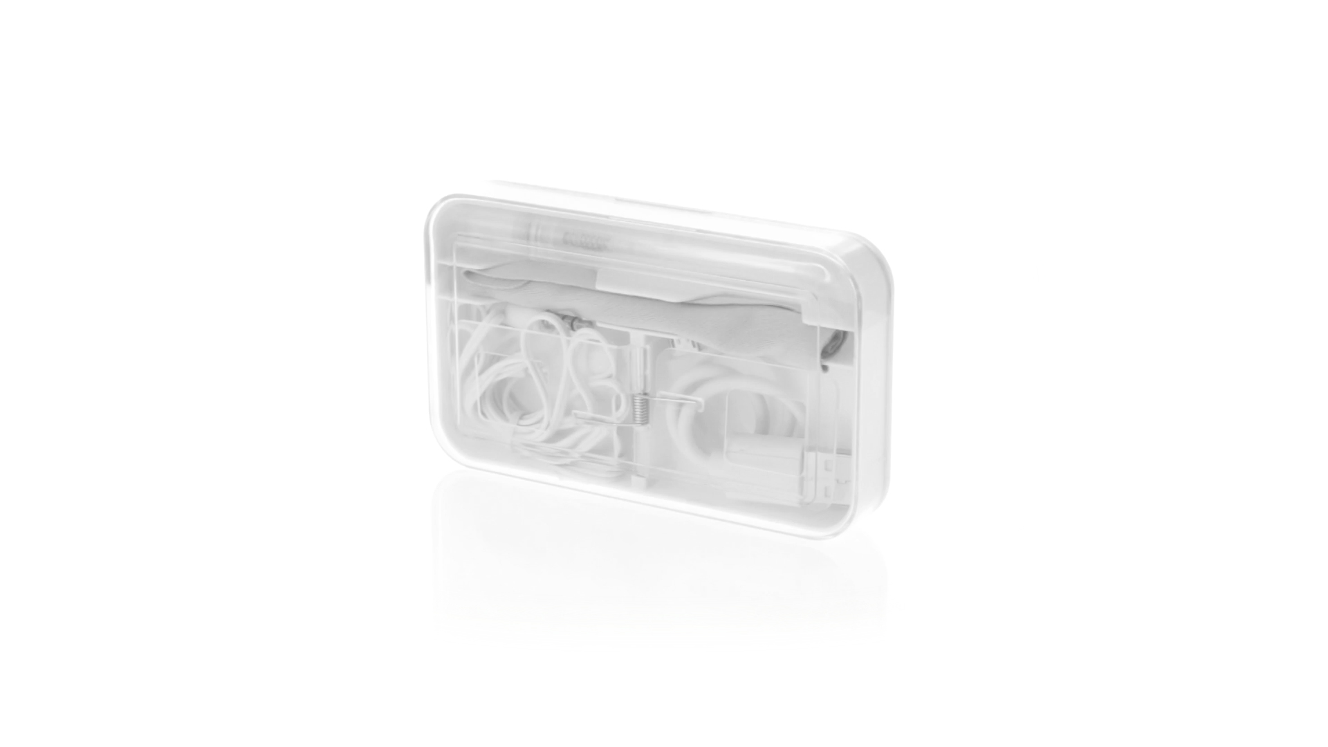 4-in-1 Set aus Kopfhörern, Reinigungstuch, Mini-Sprayflasche und Mini-USB-Kabel. Mit trendigen Kopfhörern in Weiss mit farblich passendem Kabel und 3,5-mm-Klinkenstecker, weissem Mikrofaser-Reinigungstuch und transparenter, wiederbefüllbarer Sprayflasche (ohne Flüssigkeit) sowie Mini-USB-Ladekabel. Präsentiert in einem eleganten Case in passender Farbe.
