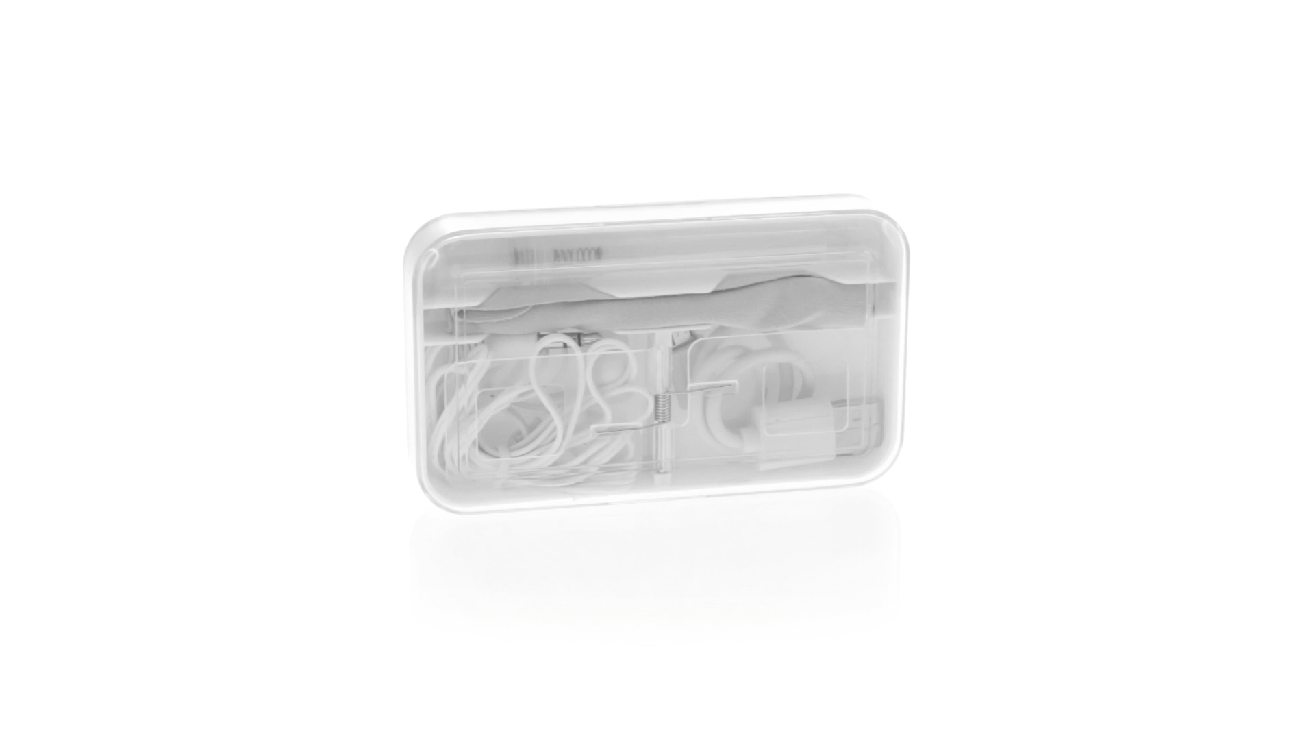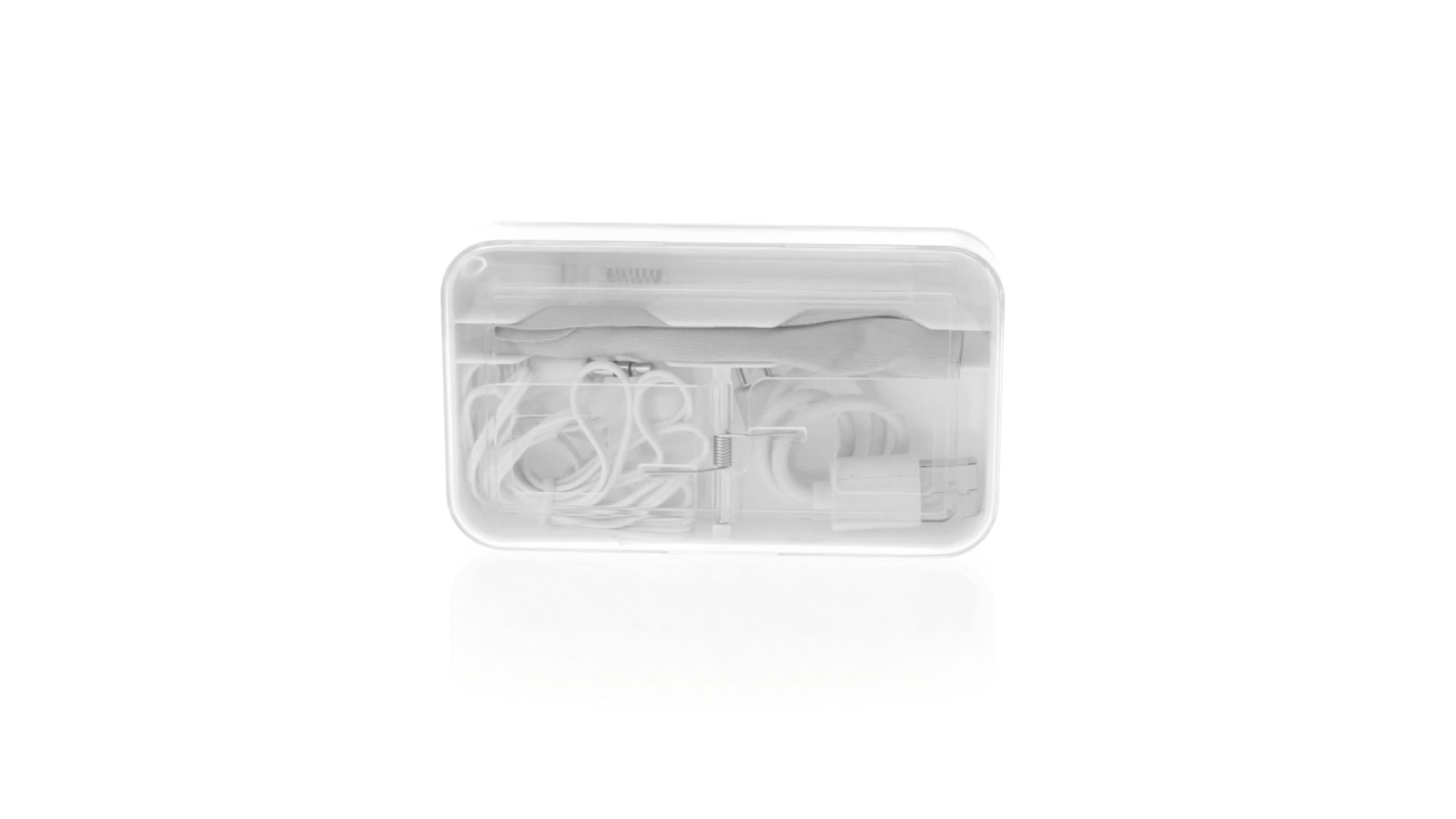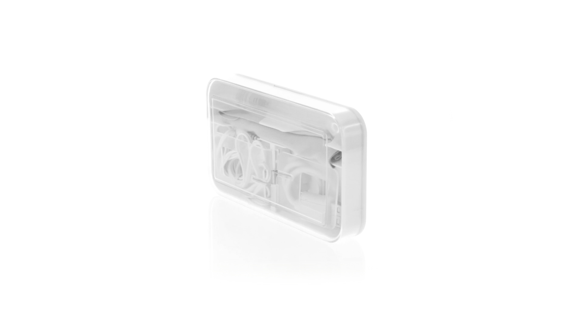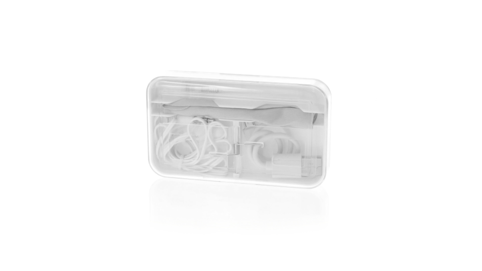 4-in-1 Set aus Kopfhörern, Reinigungstuch, Mini-Sprayflasche und Mini-USB-Kabel. Mit trendigen Kopfhörern in Weiss mit farblich passendem Kabel und 3,5-mm-Klinkenstecker, weissem Mikrofaser-Reinigungstuch und transparenter, wiederbefüllbarer Sprayflasche (ohne Flüssigkeit) sowie Mini-USB-Ladekabel. Präsentiert in einem eleganten Case in passender Farbe.