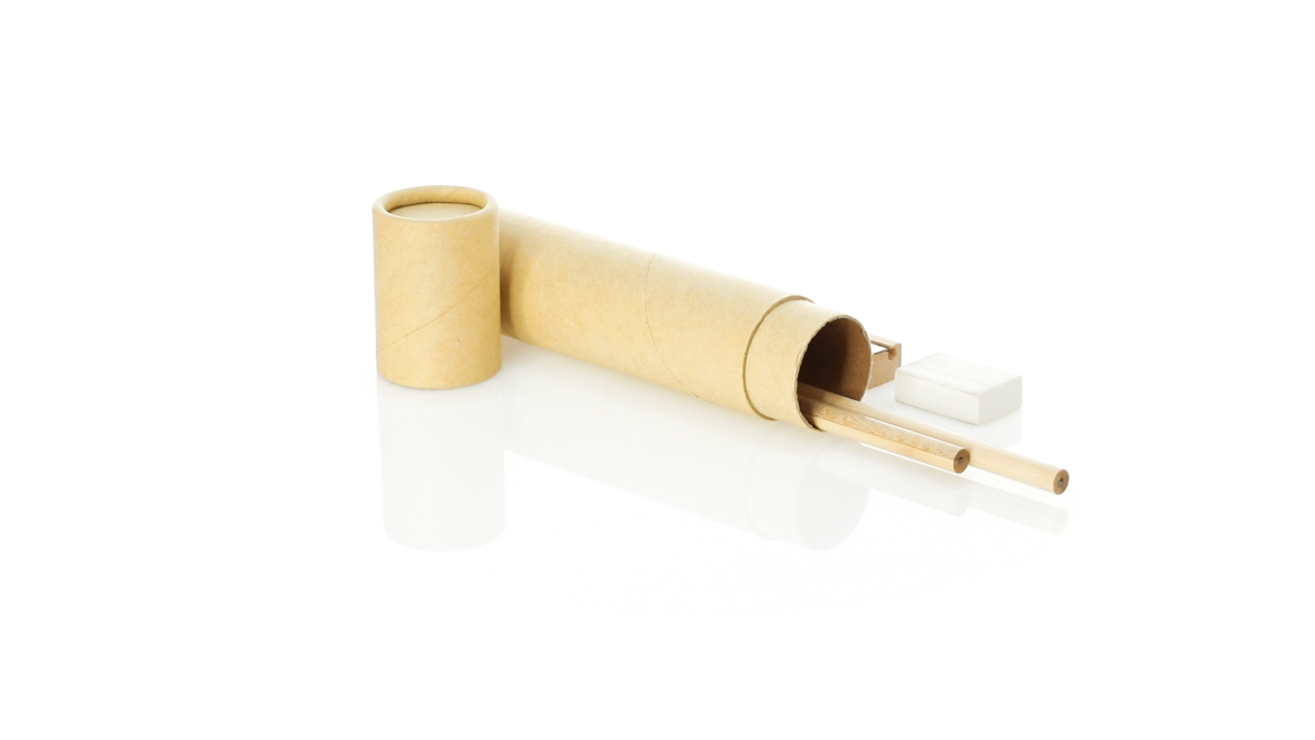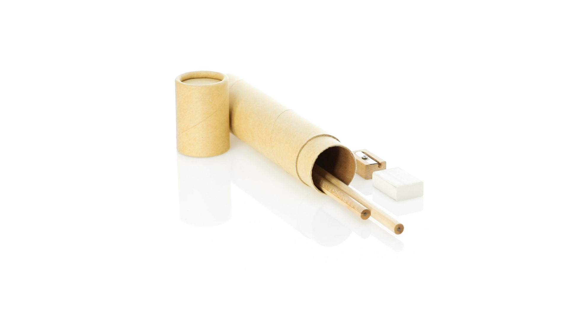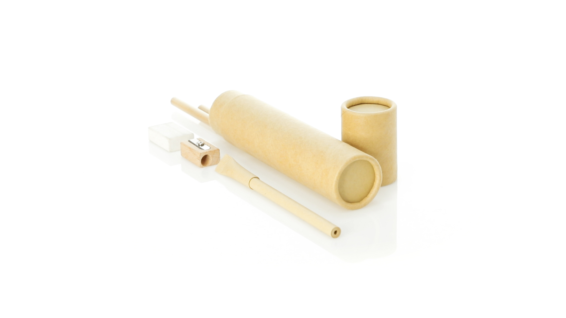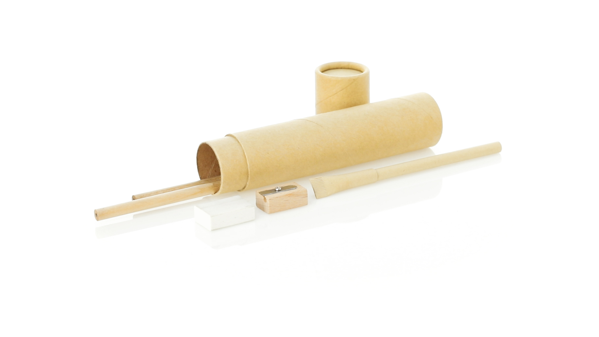 Set aus 5 Teilen in recycelter Pappschachtel. Enthält 2 Holzkugelschreiber (nicht angespitzt) mit zylindrischem Körper und Naturfinish, einen Kugelschreiber aus Karton, einen Holzspitzer und einen Radiergummi.