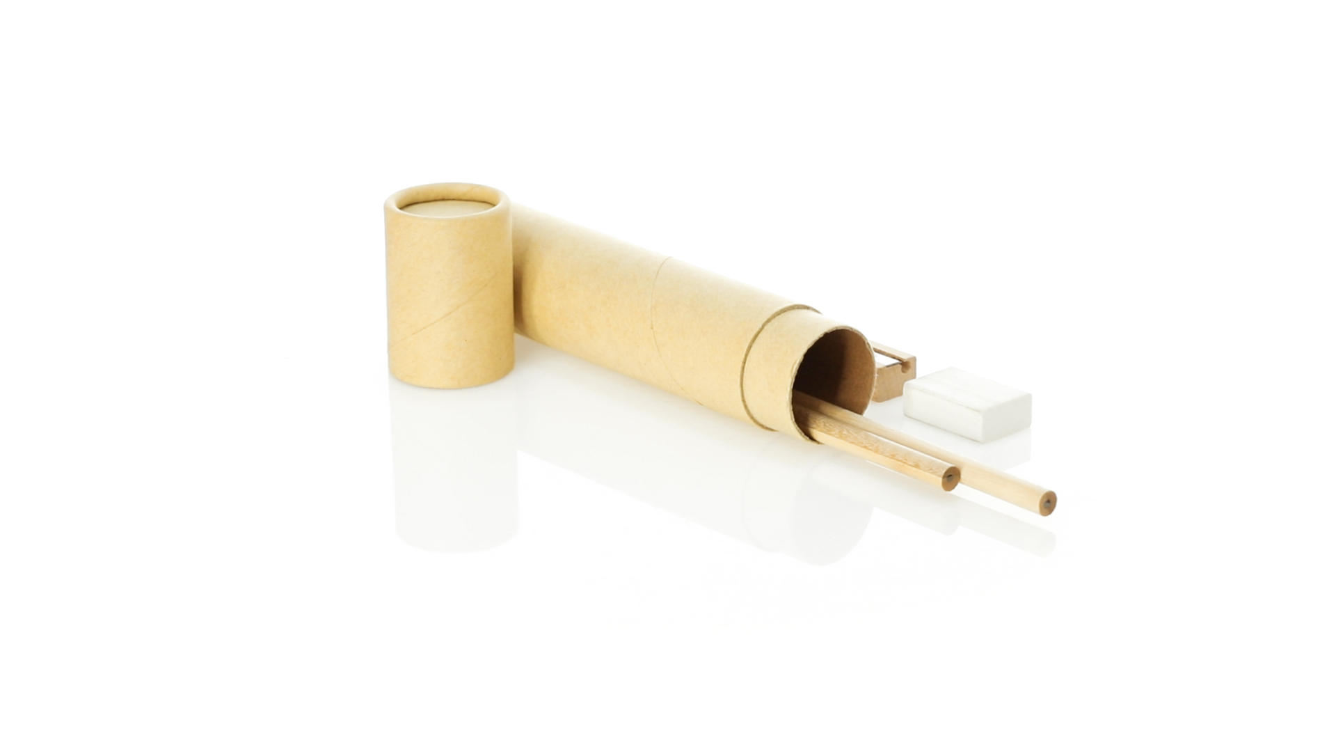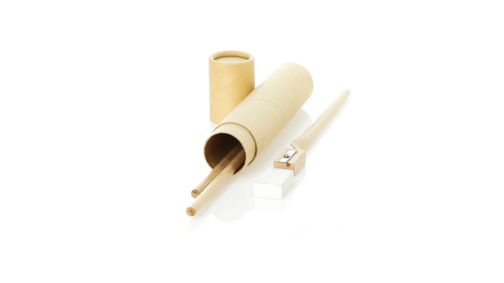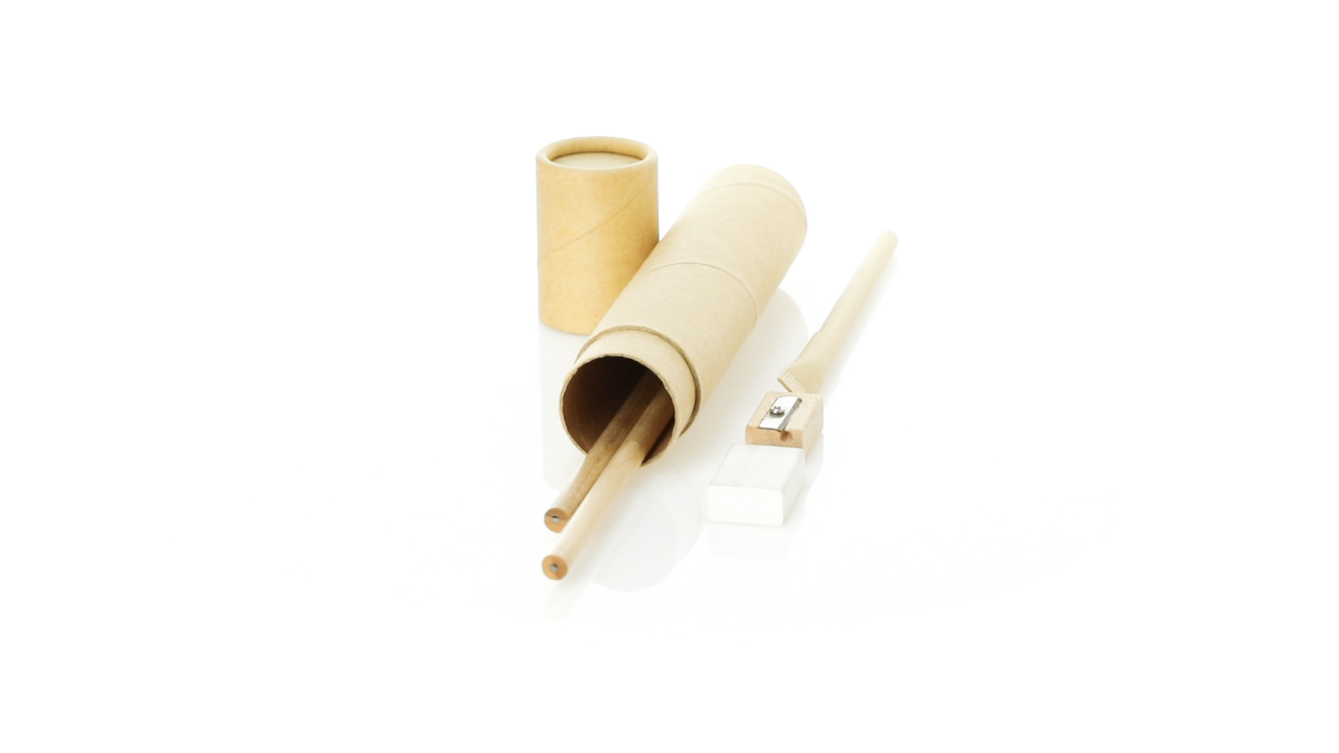 Set aus 5 Teilen in recycelter Pappschachtel. Enthält 2 Holzkugelschreiber (nicht angespitzt) mit zylindrischem Körper und Naturfinish, einen Kugelschreiber aus Karton, einen Holzspitzer und einen Radiergummi.