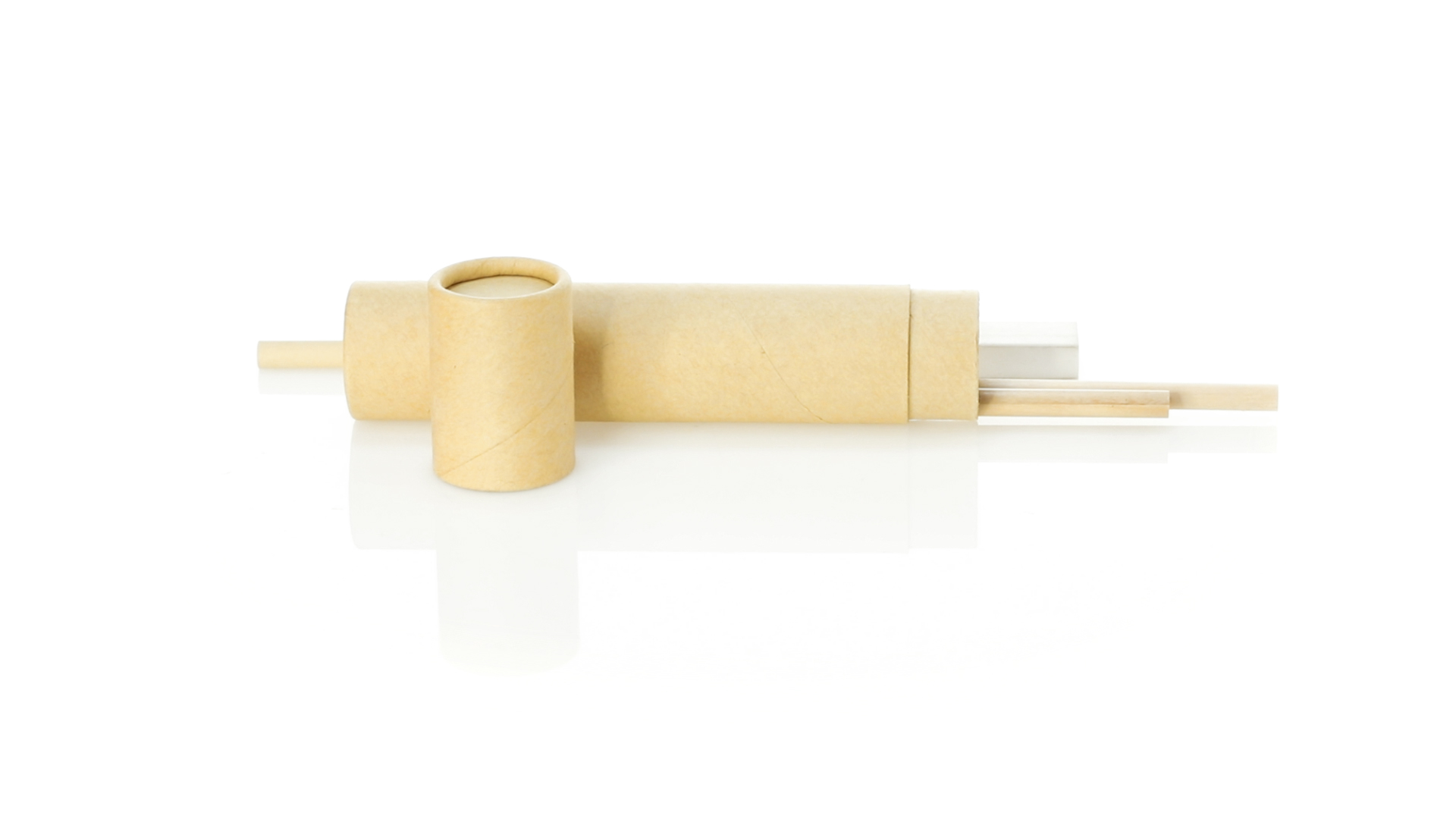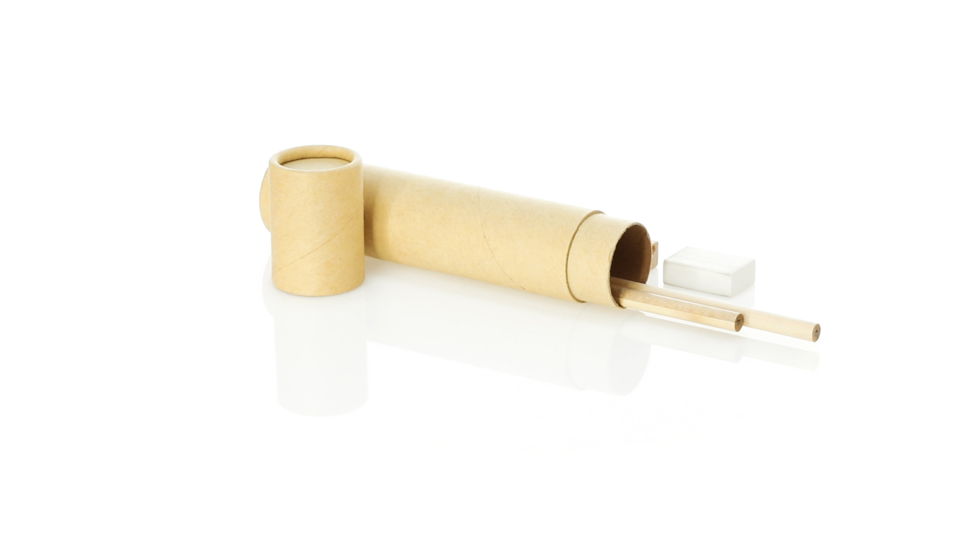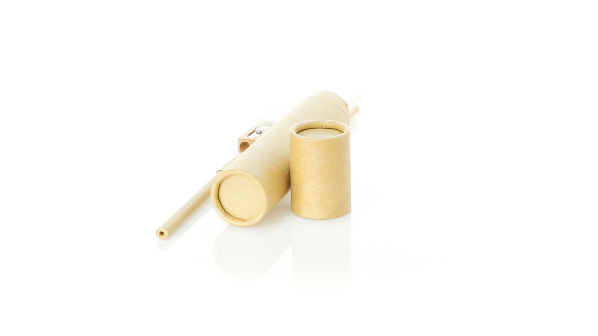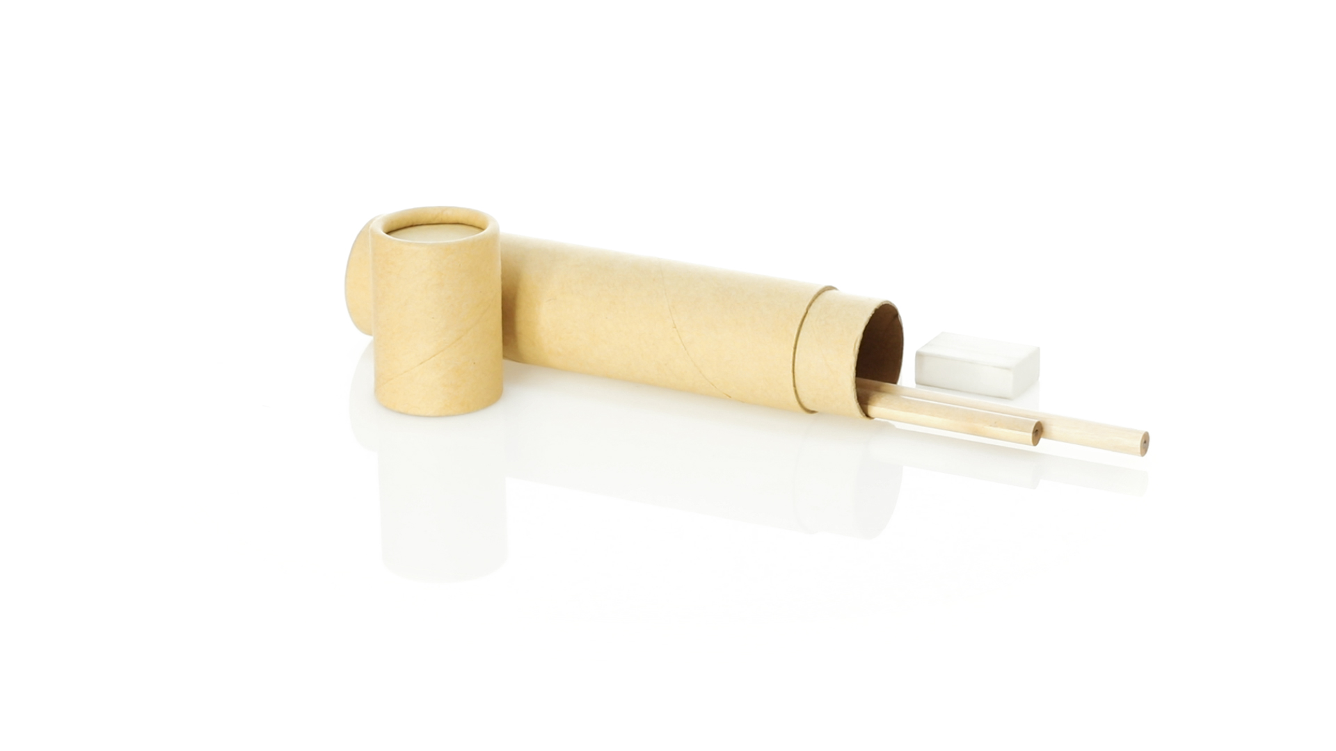 Set aus 5 Teilen in recycelter Pappschachtel. Enthält 2 Holzkugelschreiber (nicht angespitzt) mit zylindrischem Körper und Naturfinish, einen Kugelschreiber aus Karton, einen Holzspitzer und einen Radiergummi.