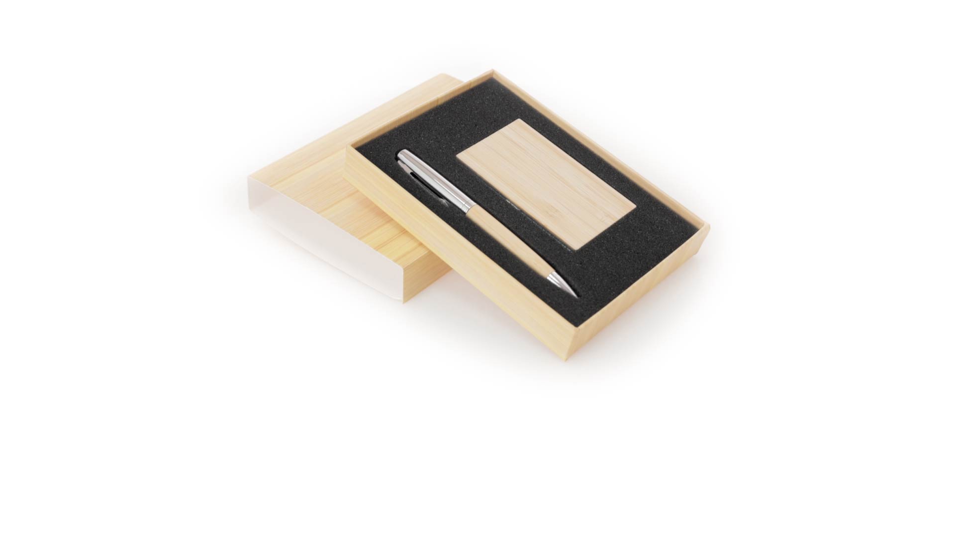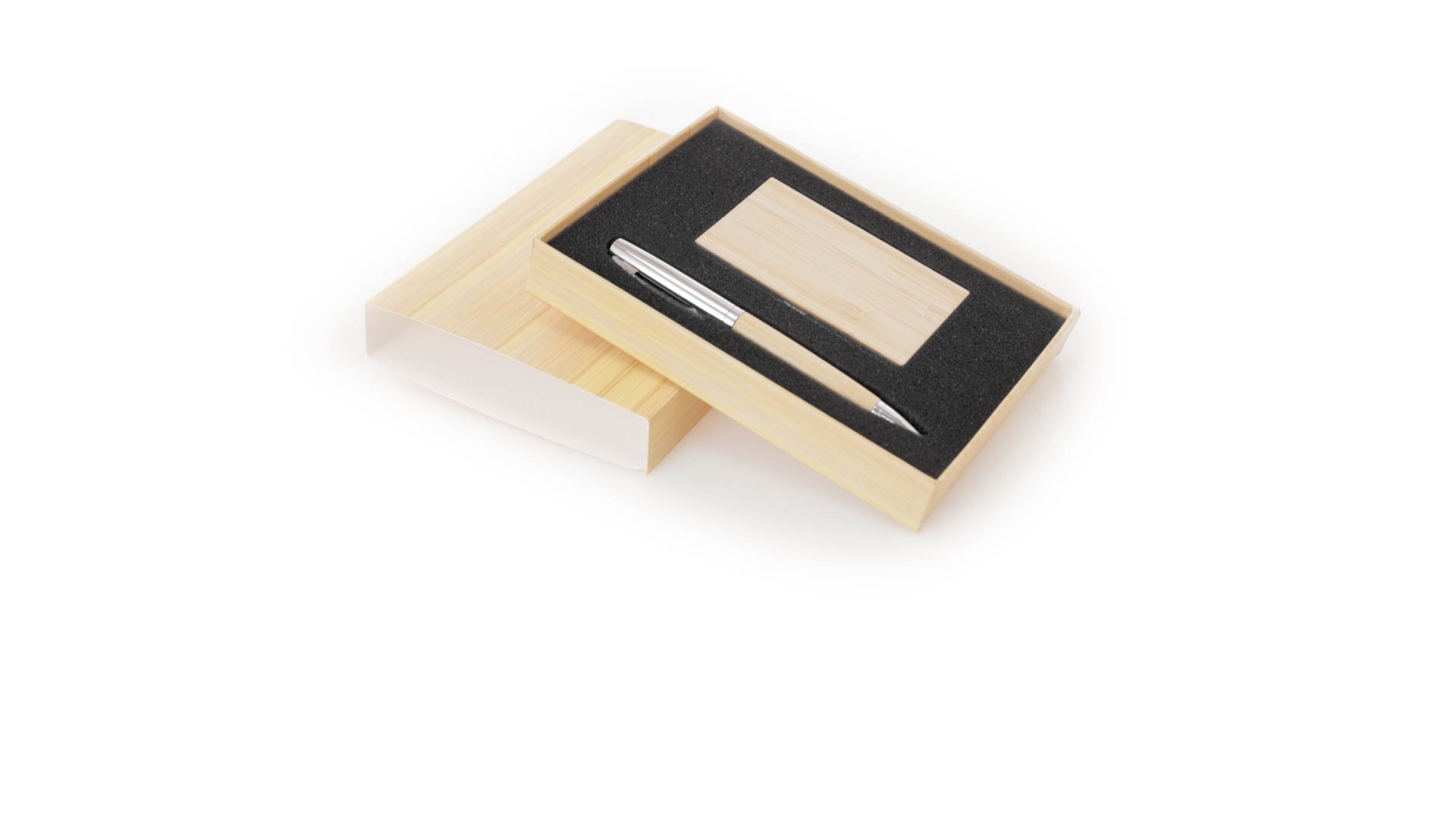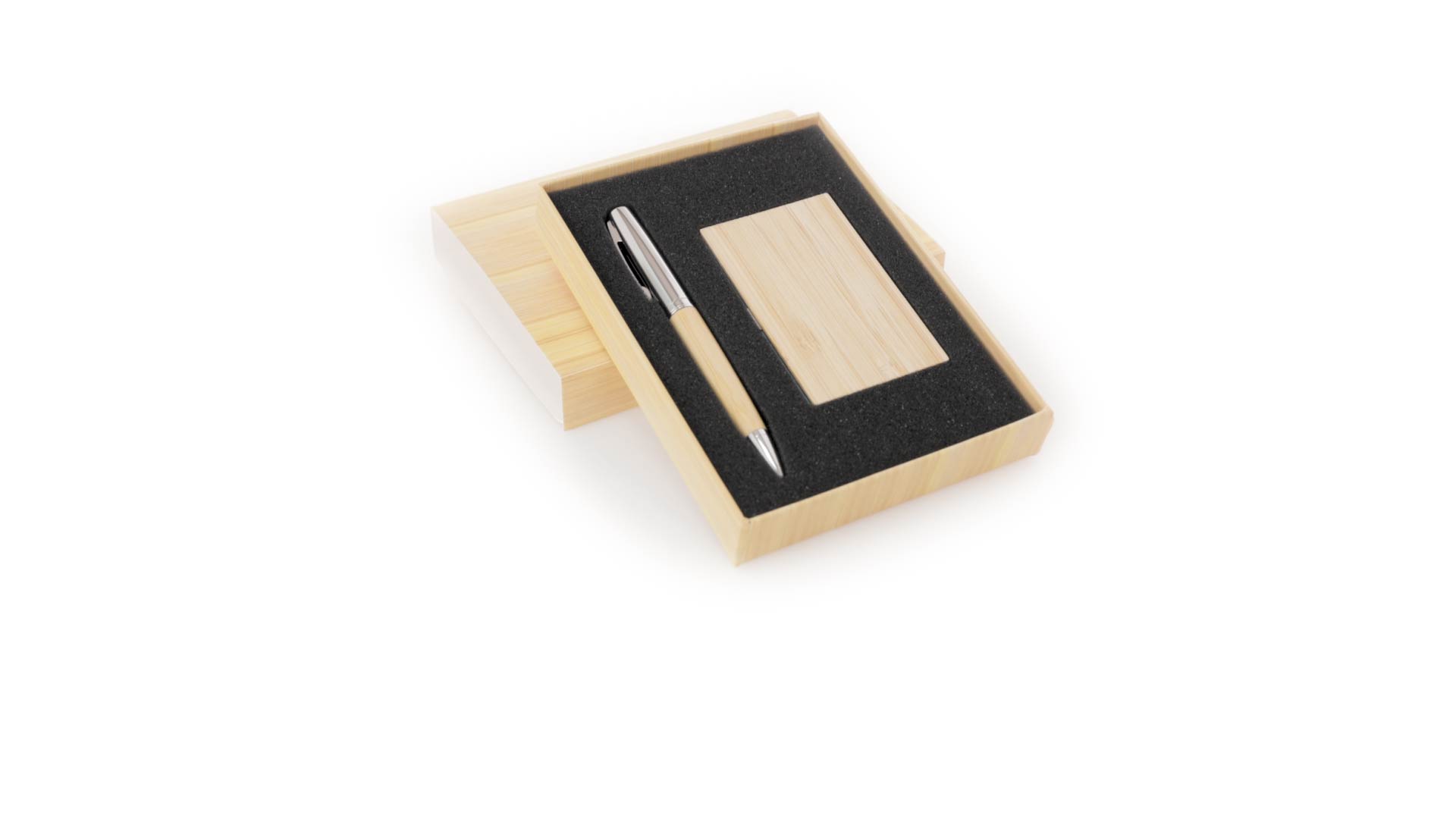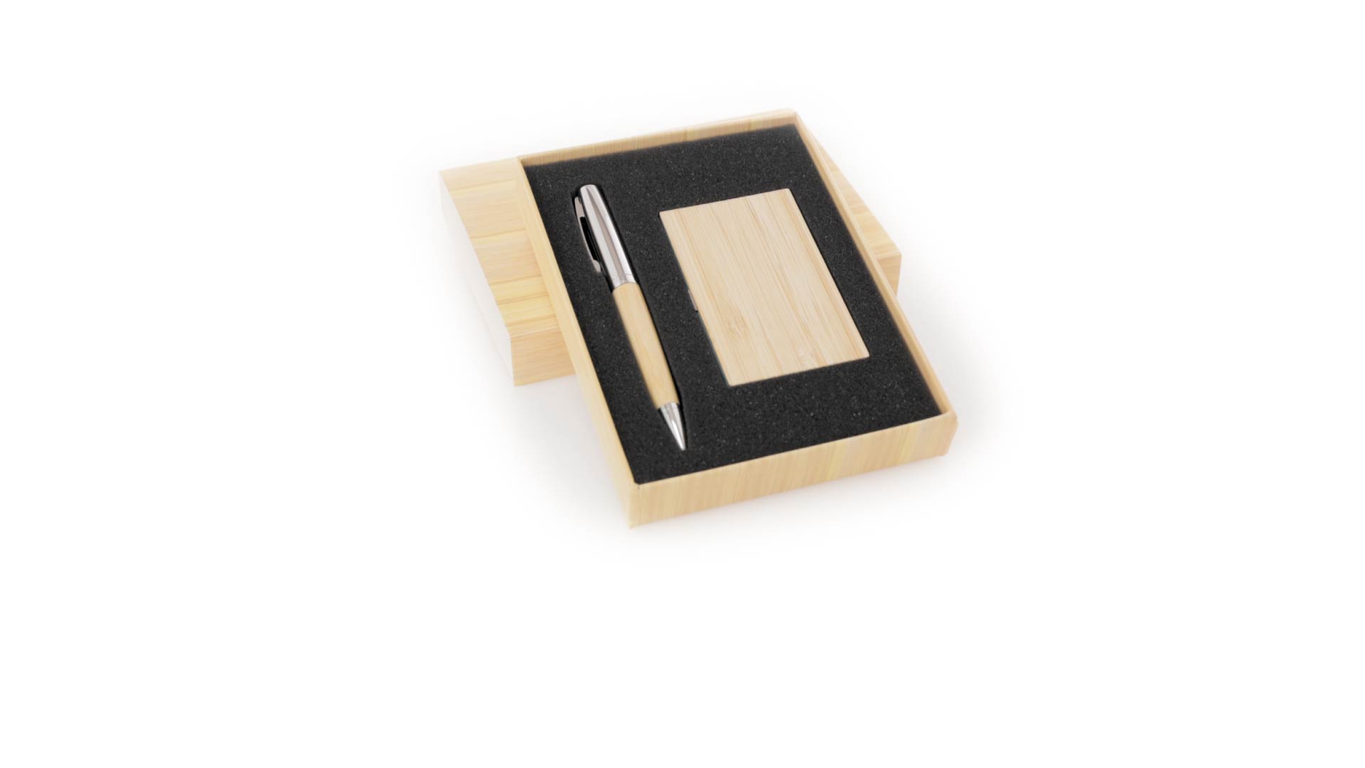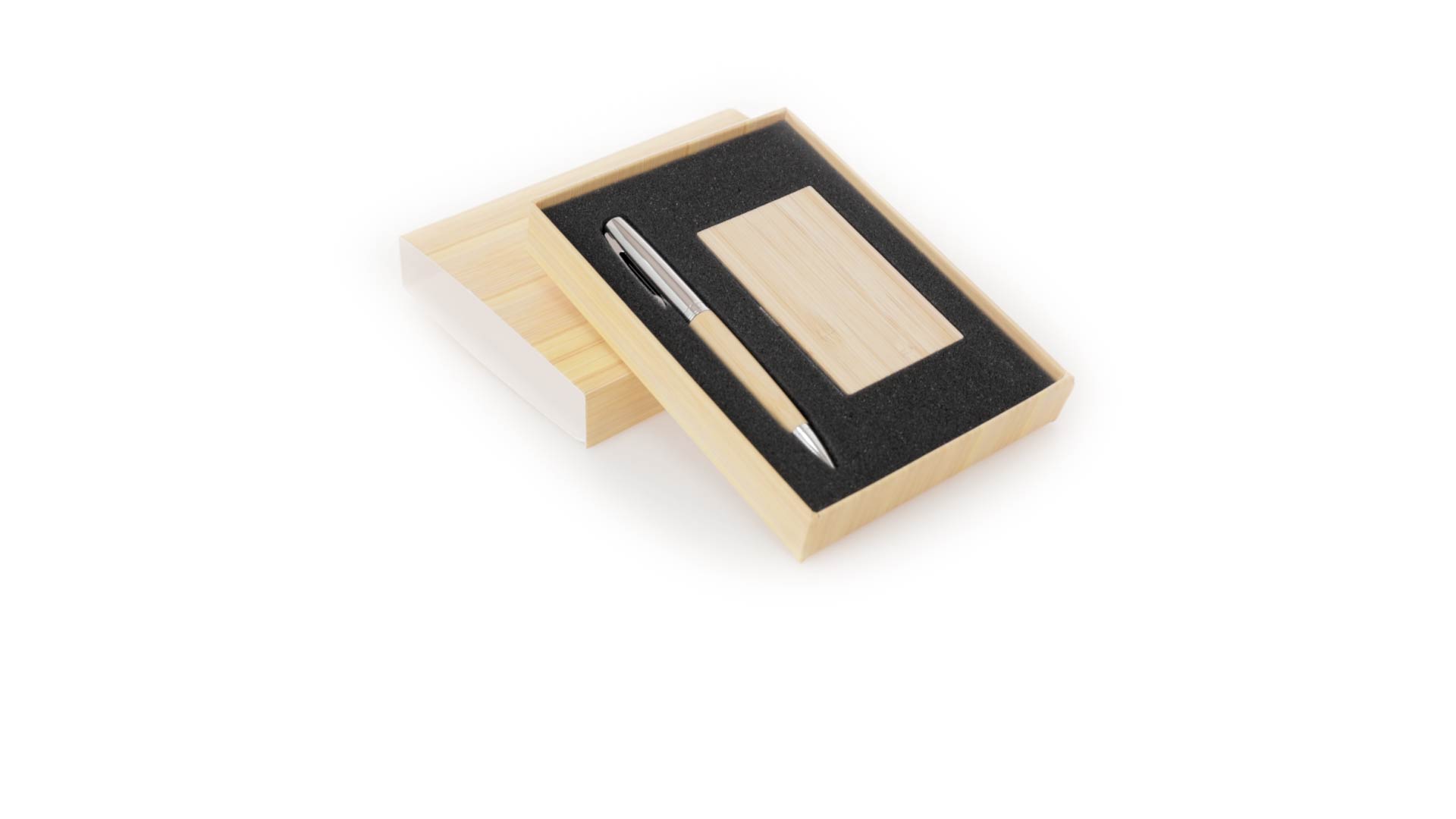 Edles Kugelschreiber- und Kartenetui-Set aus Bambus und Metall. Kugelschreiber mit glänzendem Metallschaft und weichem Bambusgriff, mit Drehmechanismus und blauer Tinte. Enthält einen hervorragenden Kartenhalter mit einem Fach aus glänzendem Metall und einem weichen Bambusbezug. Präsentiert in einer individuellen Bambus-Designbox.