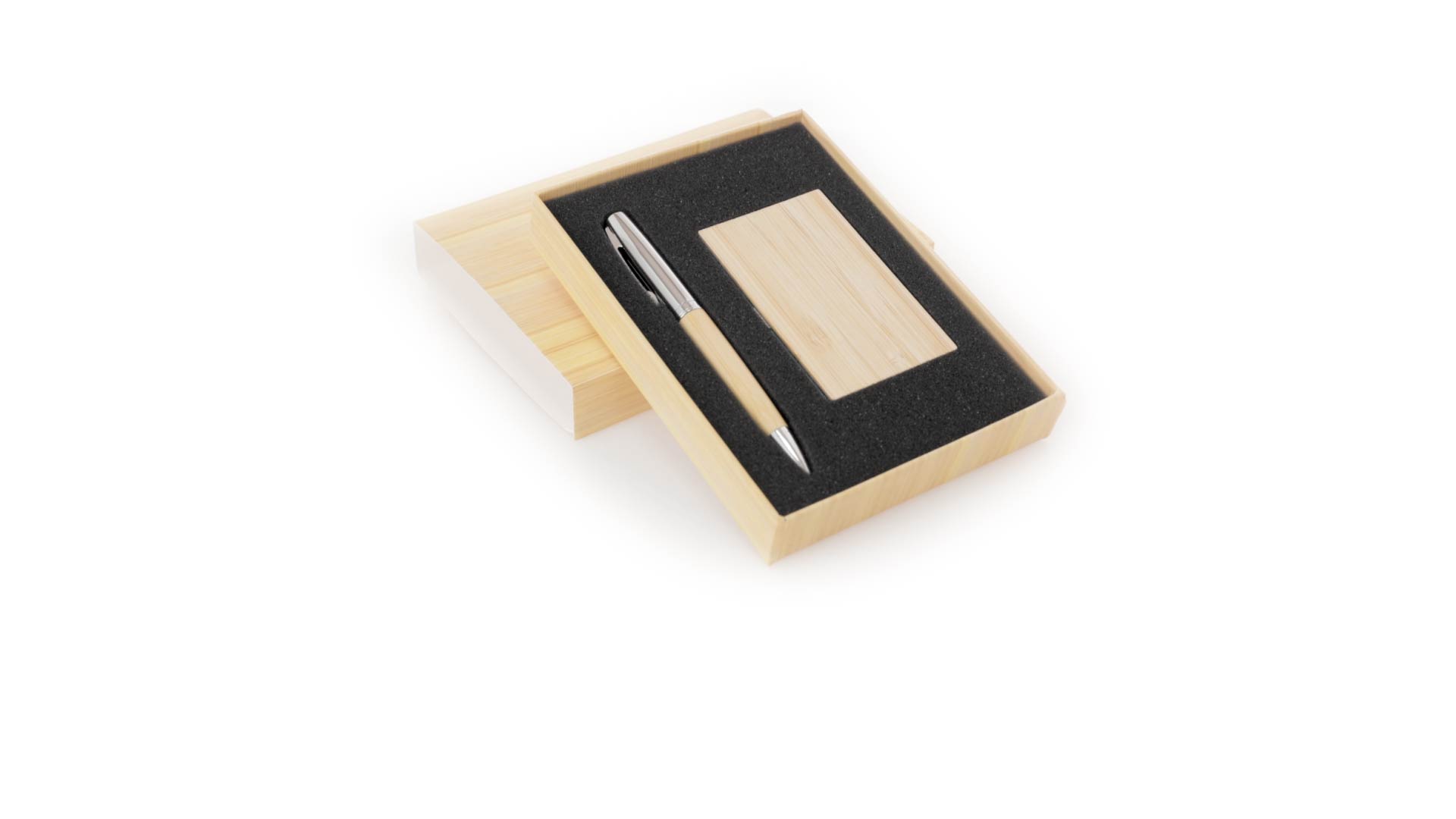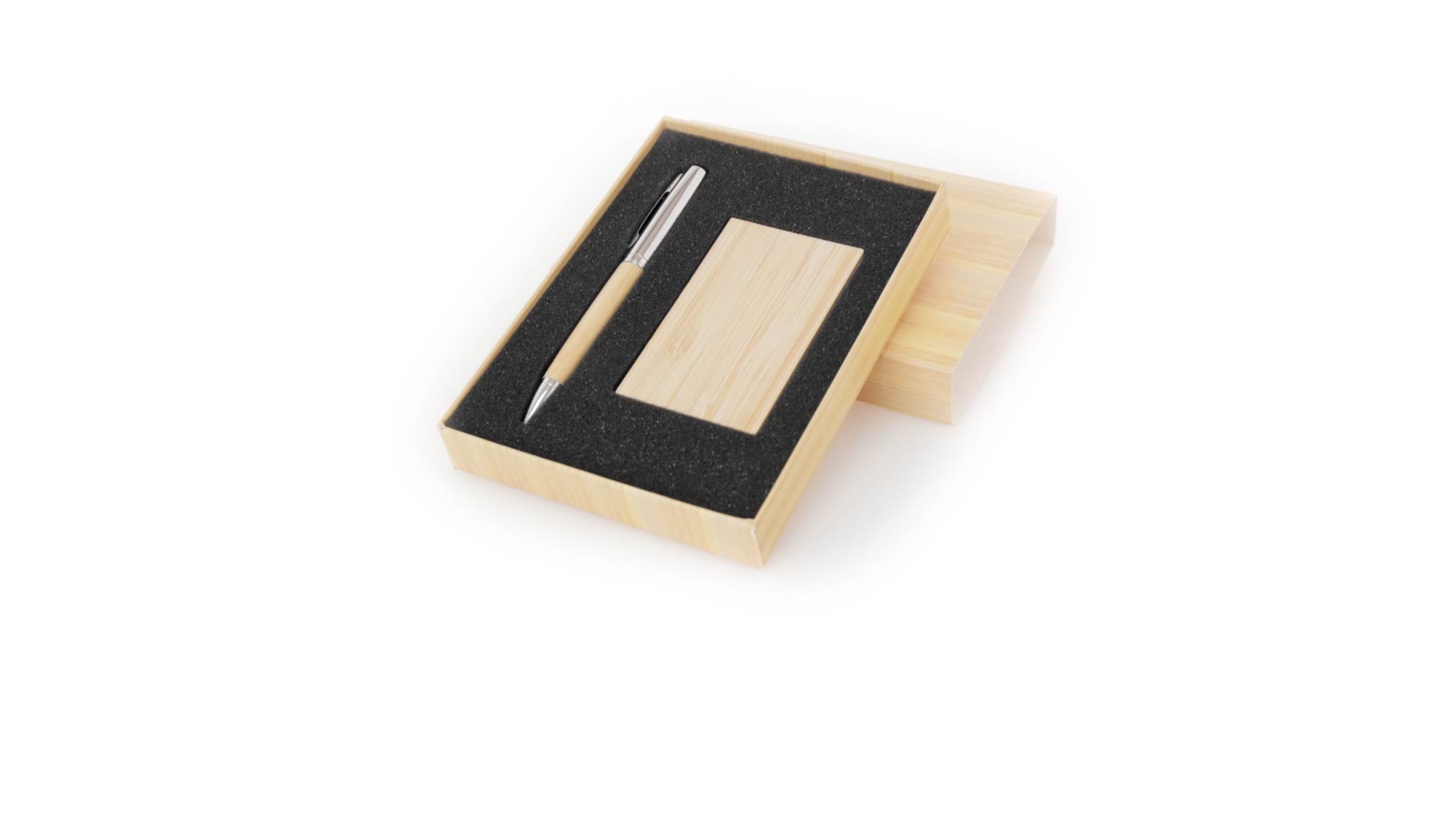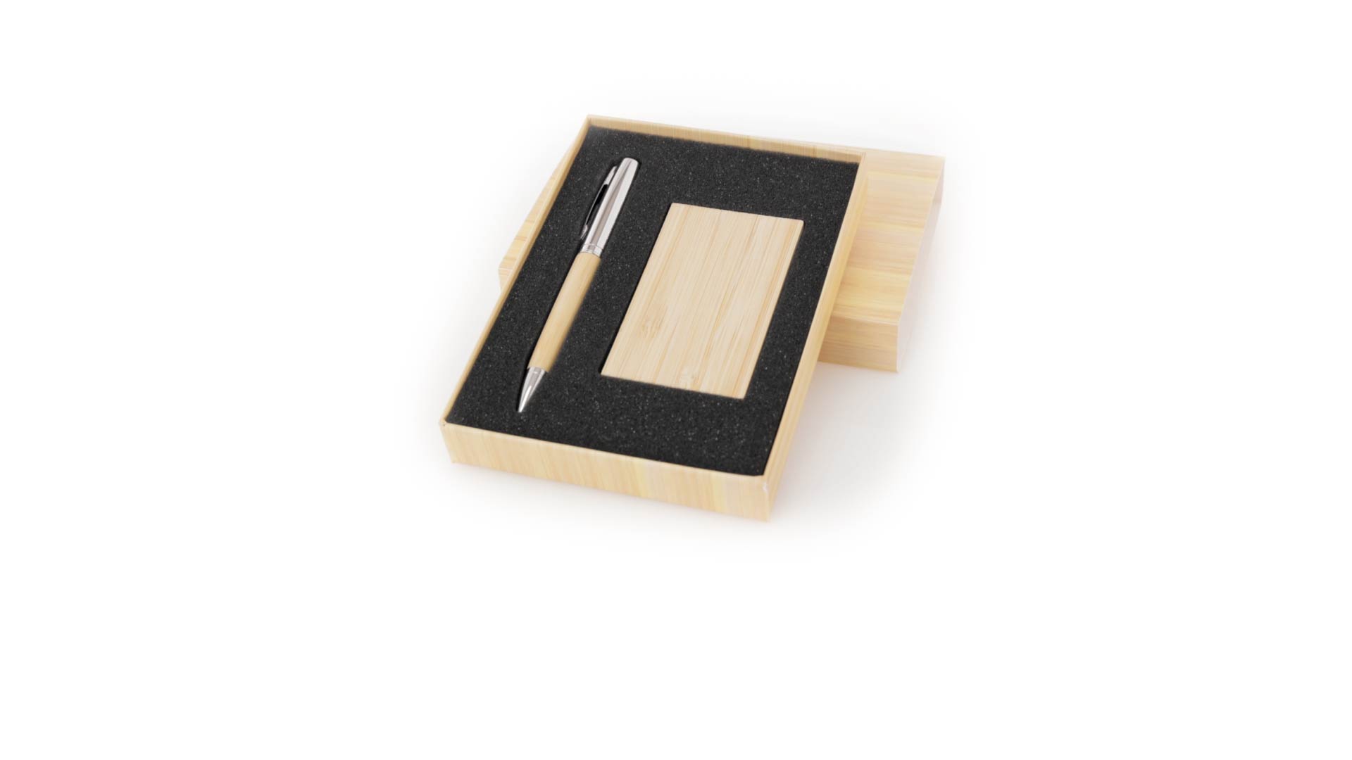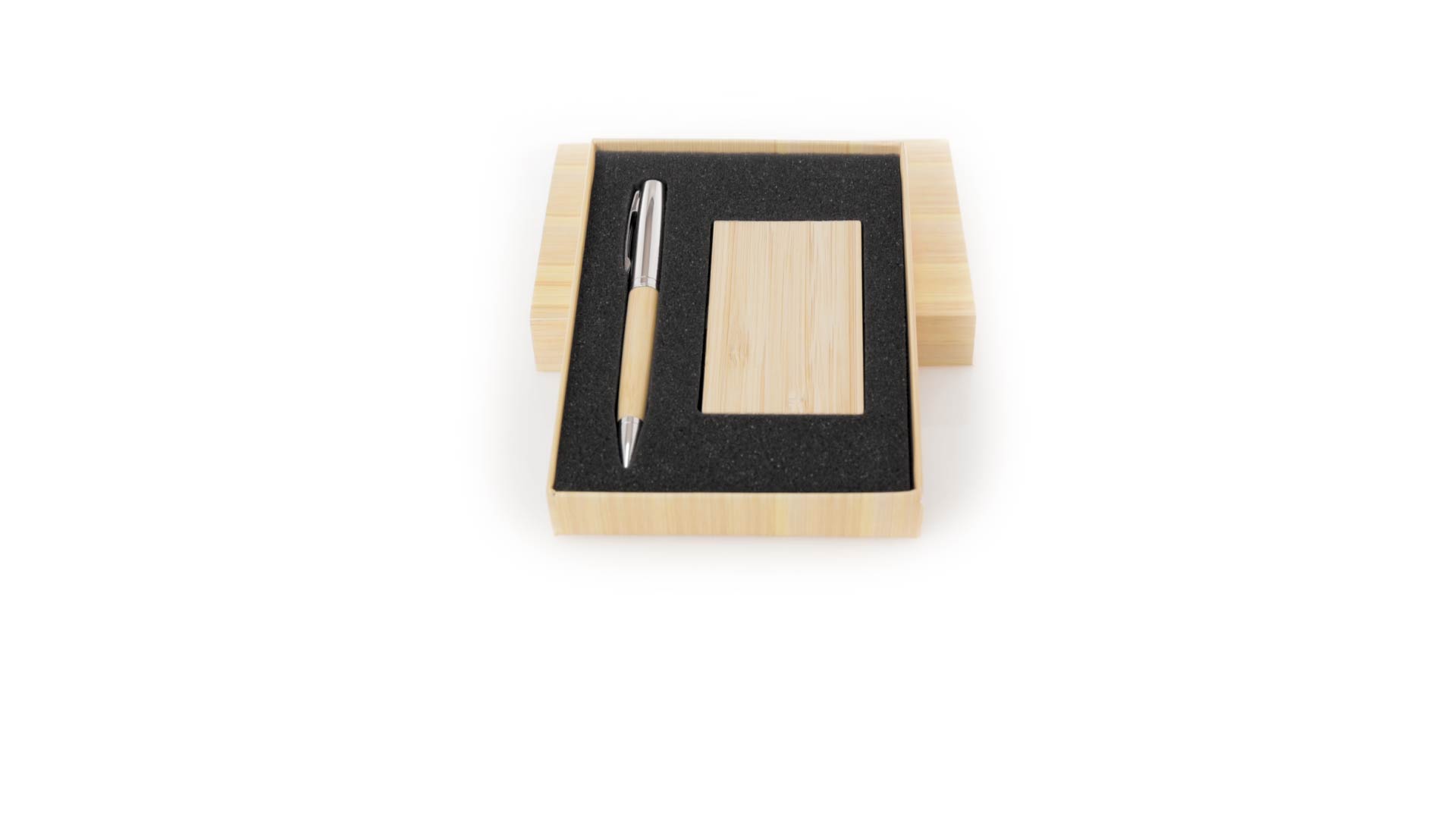 Edles Kugelschreiber- und Kartenetui-Set aus Bambus und Metall. Kugelschreiber mit glänzendem Metallschaft und weichem Bambusgriff, mit Drehmechanismus und blauer Tinte. Enthält einen hervorragenden Kartenhalter mit einem Fach aus glänzendem Metall und einem weichen Bambusbezug. Präsentiert in einer individuellen Bambus-Designbox.
