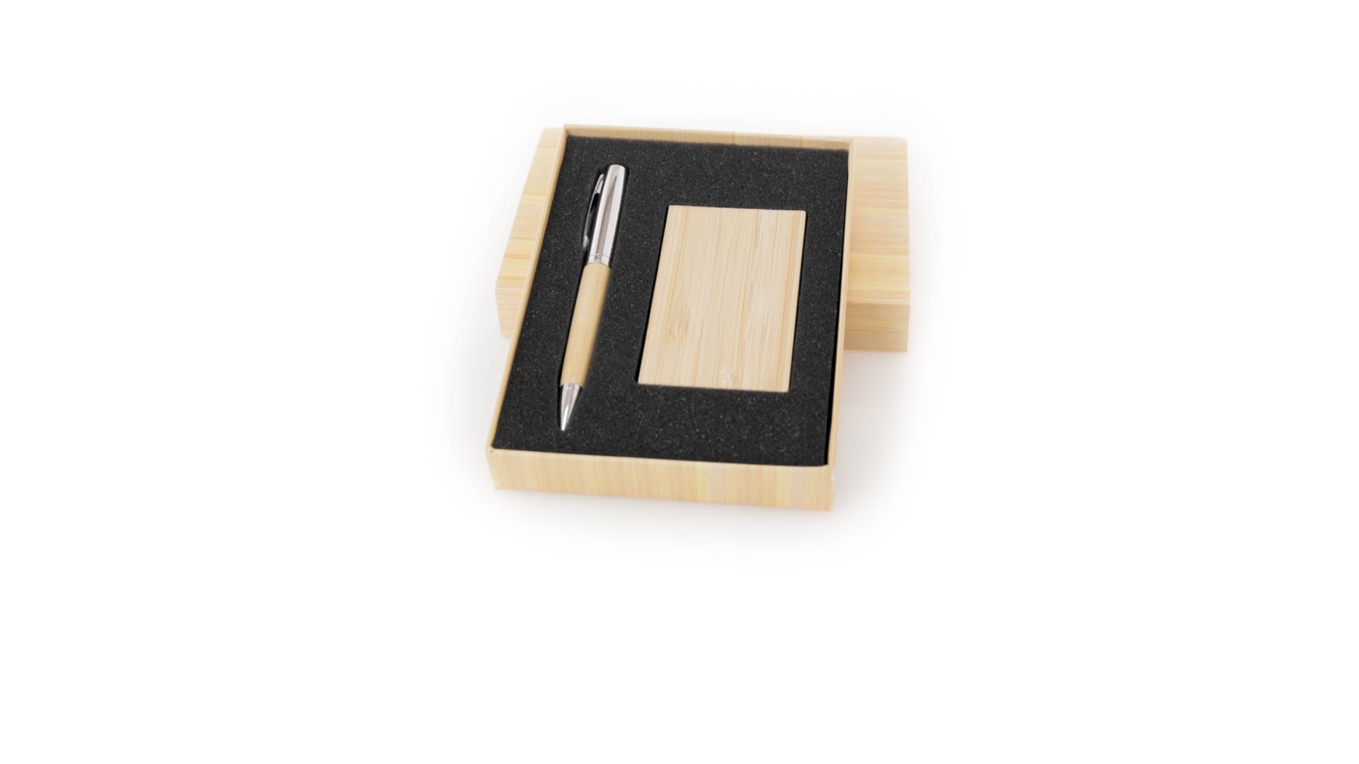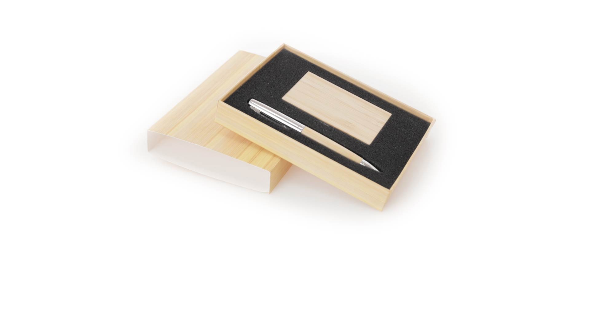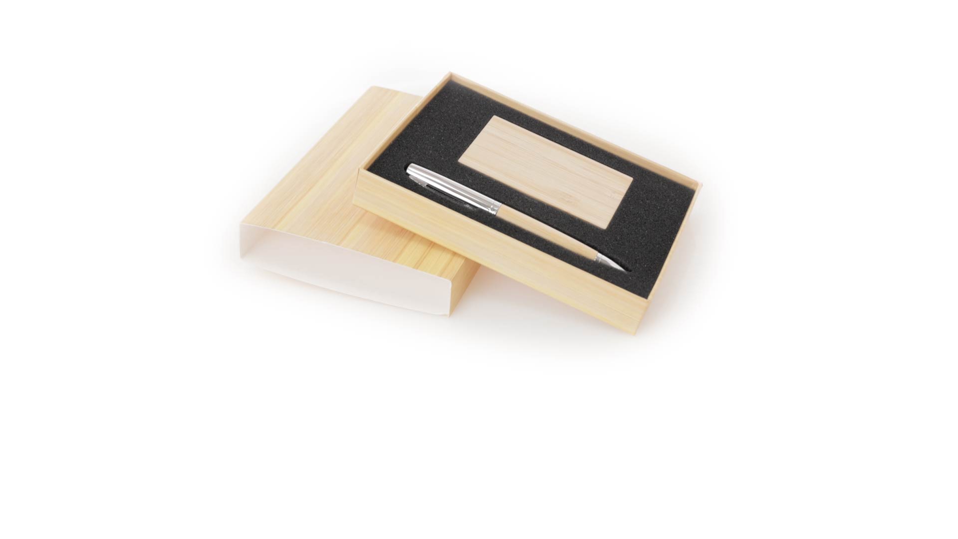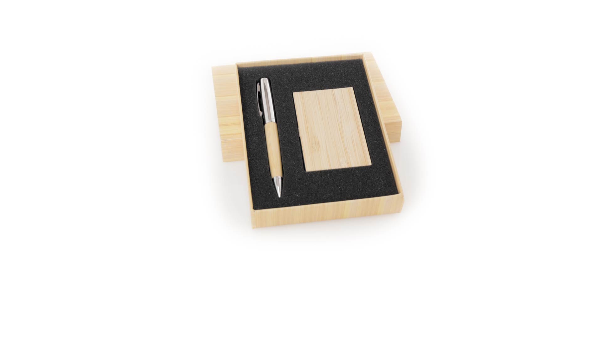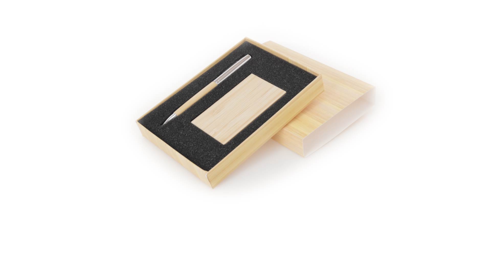 Edles Kugelschreiber- und Kartenetui-Set aus Bambus und Metall. Kugelschreiber mit glänzendem Metallschaft und weichem Bambusgriff, mit Drehmechanismus und blauer Tinte. Enthält einen hervorragenden Kartenhalter mit einem Fach aus glänzendem Metall und einem weichen Bambusbezug. Präsentiert in einer individuellen Bambus-Designbox.