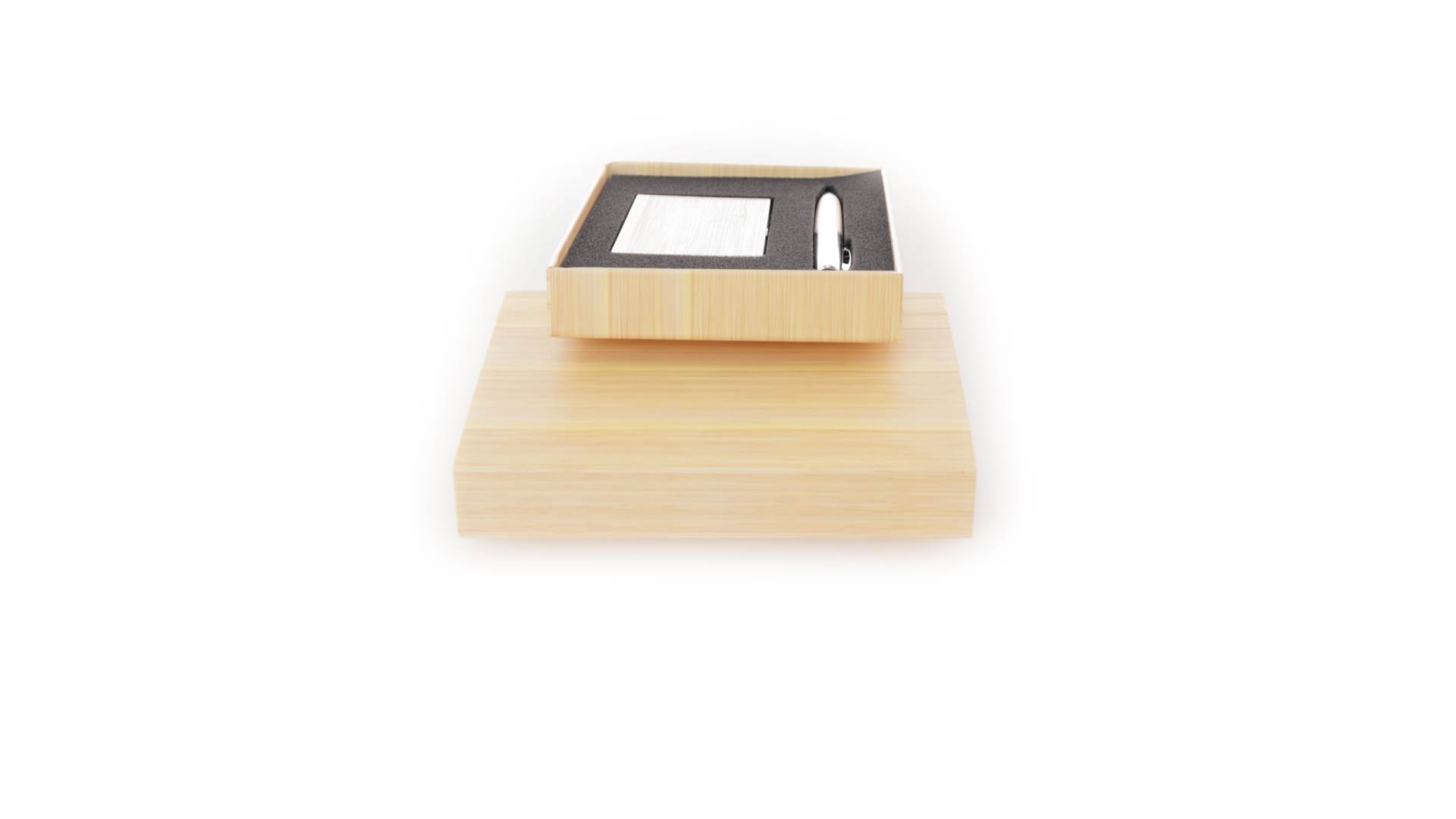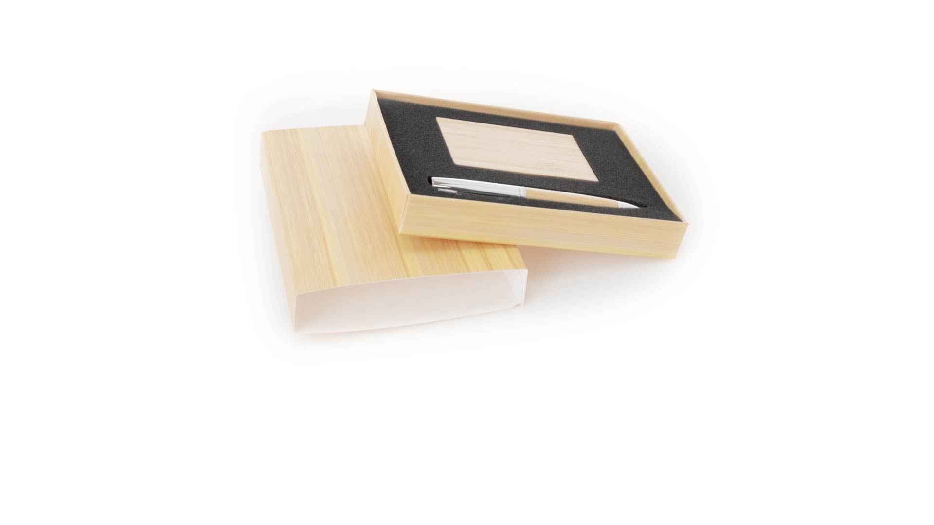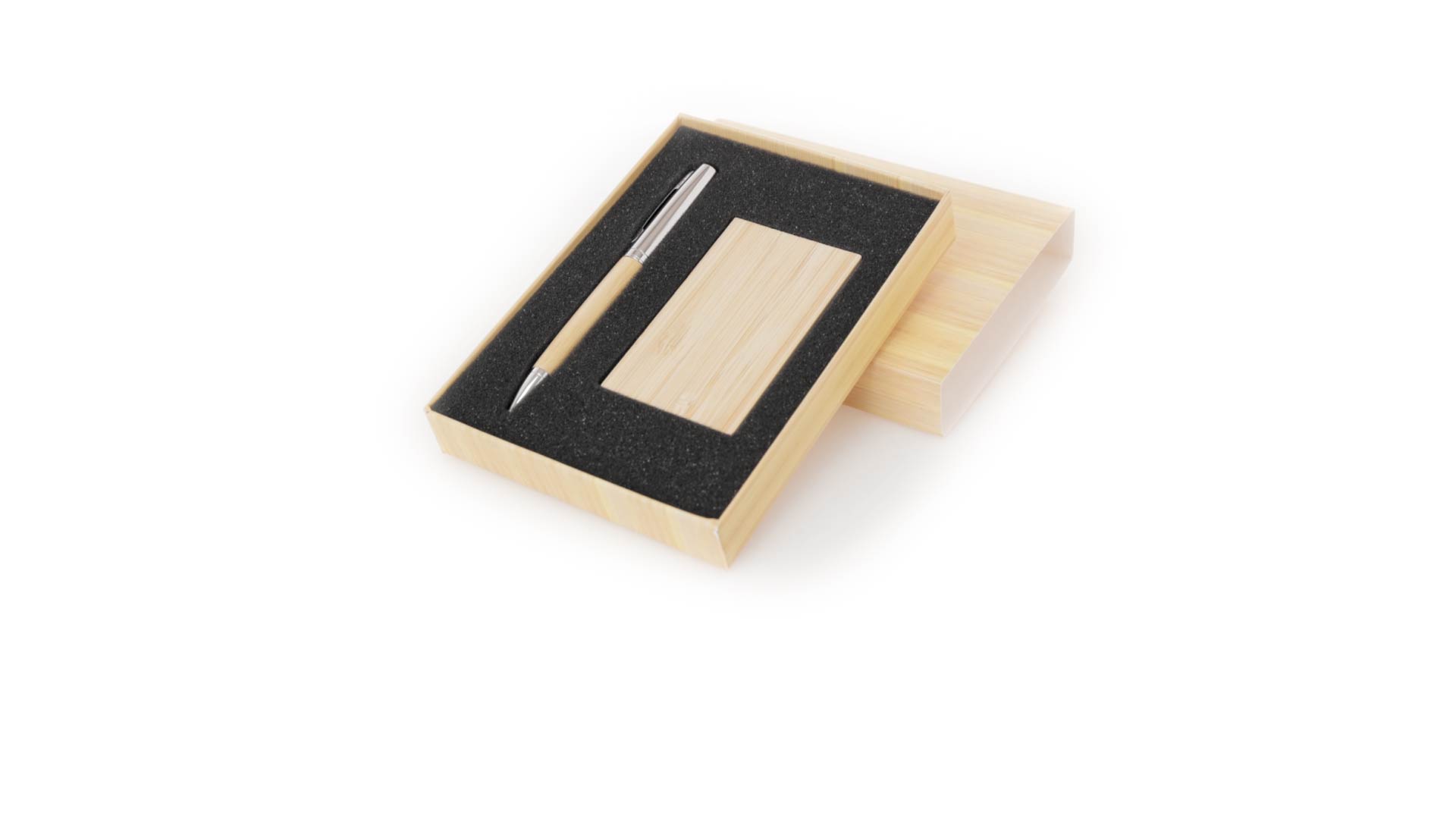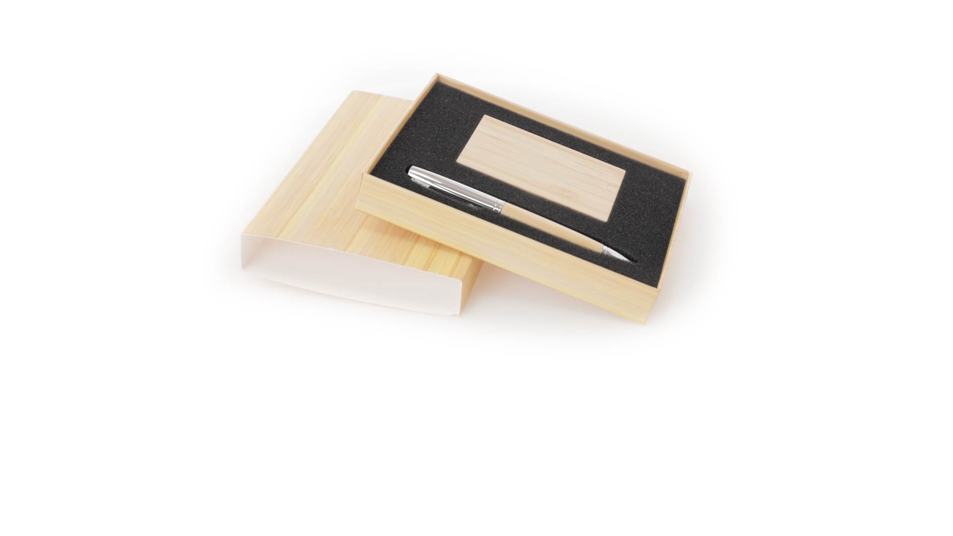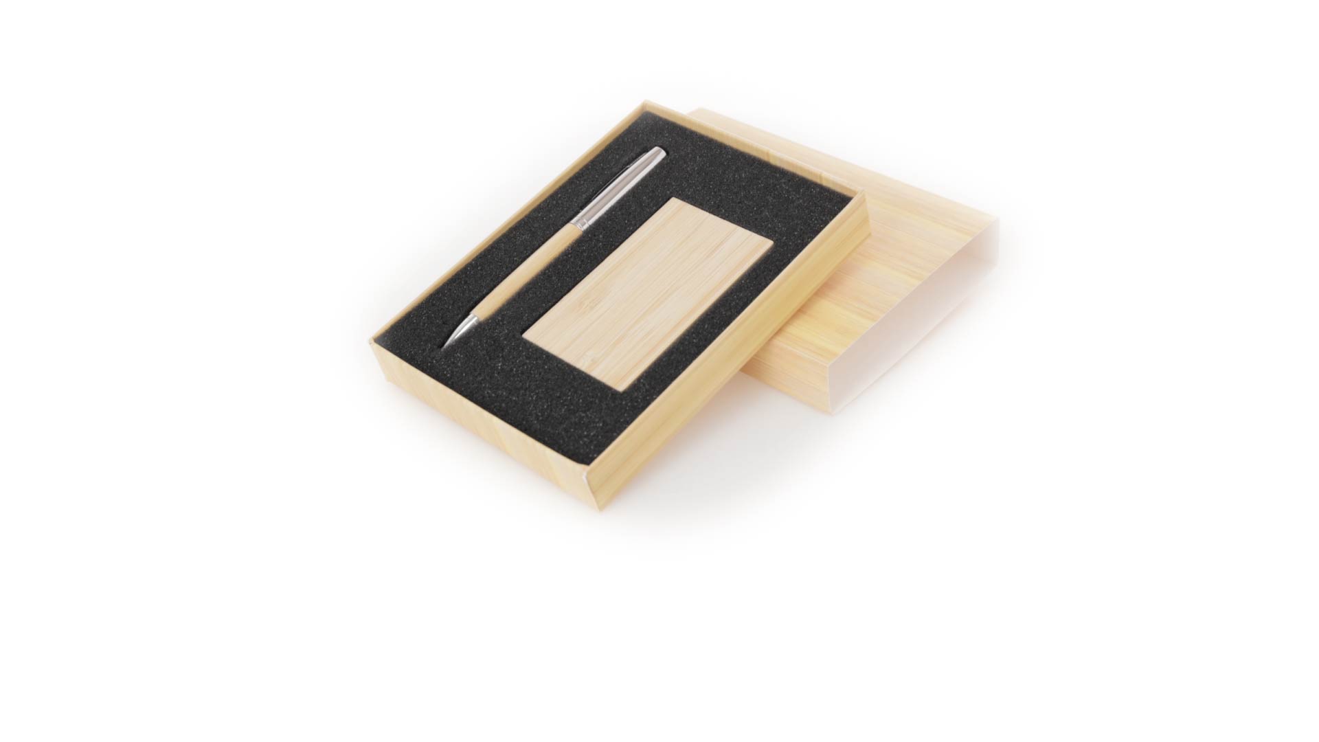 Edles Kugelschreiber- und Kartenetui-Set aus Bambus und Metall. Kugelschreiber mit glänzendem Metallschaft und weichem Bambusgriff, mit Drehmechanismus und blauer Tinte. Enthält einen hervorragenden Kartenhalter mit einem Fach aus glänzendem Metall und einem weichen Bambusbezug. Präsentiert in einer individuellen Bambus-Designbox.
