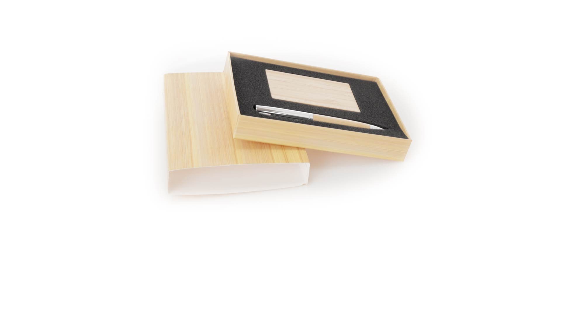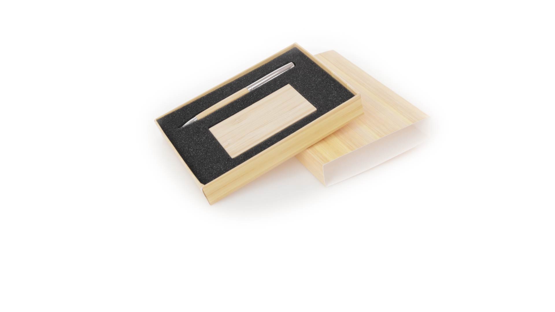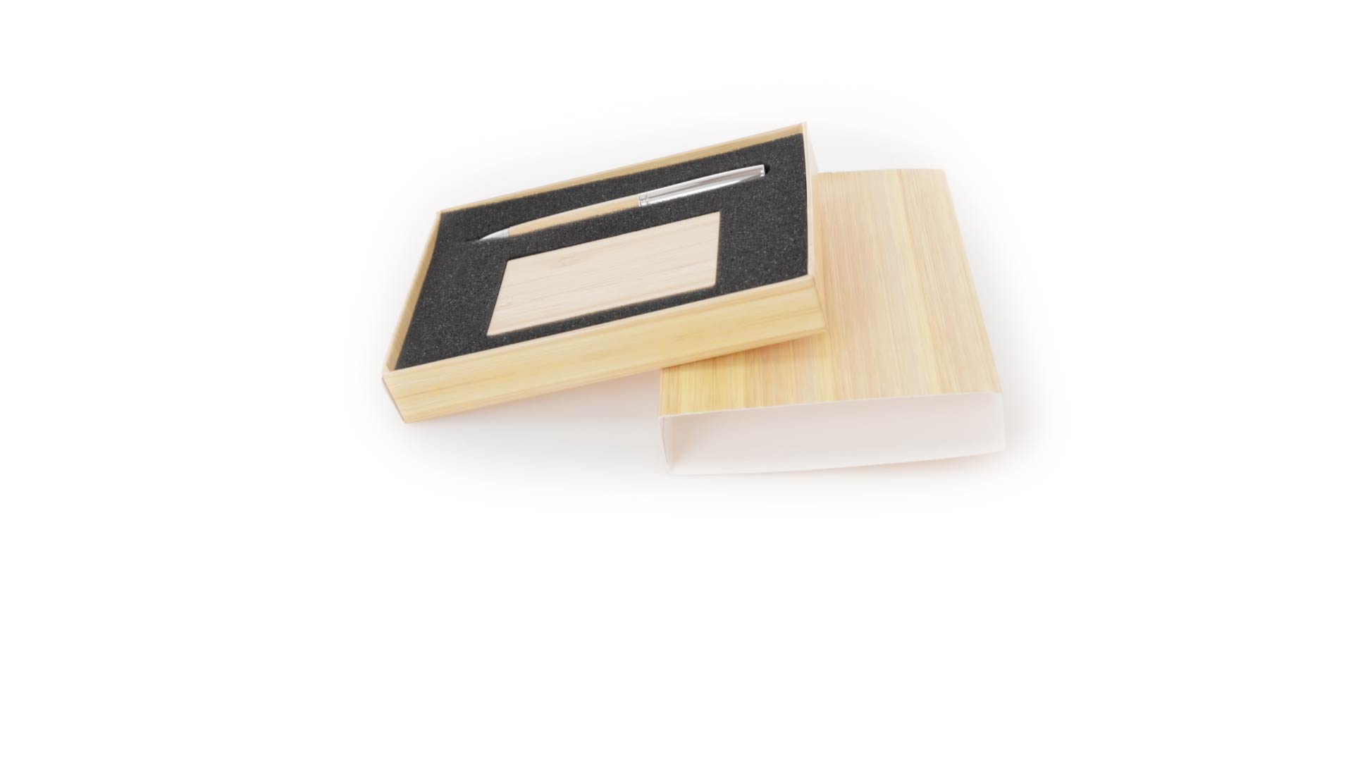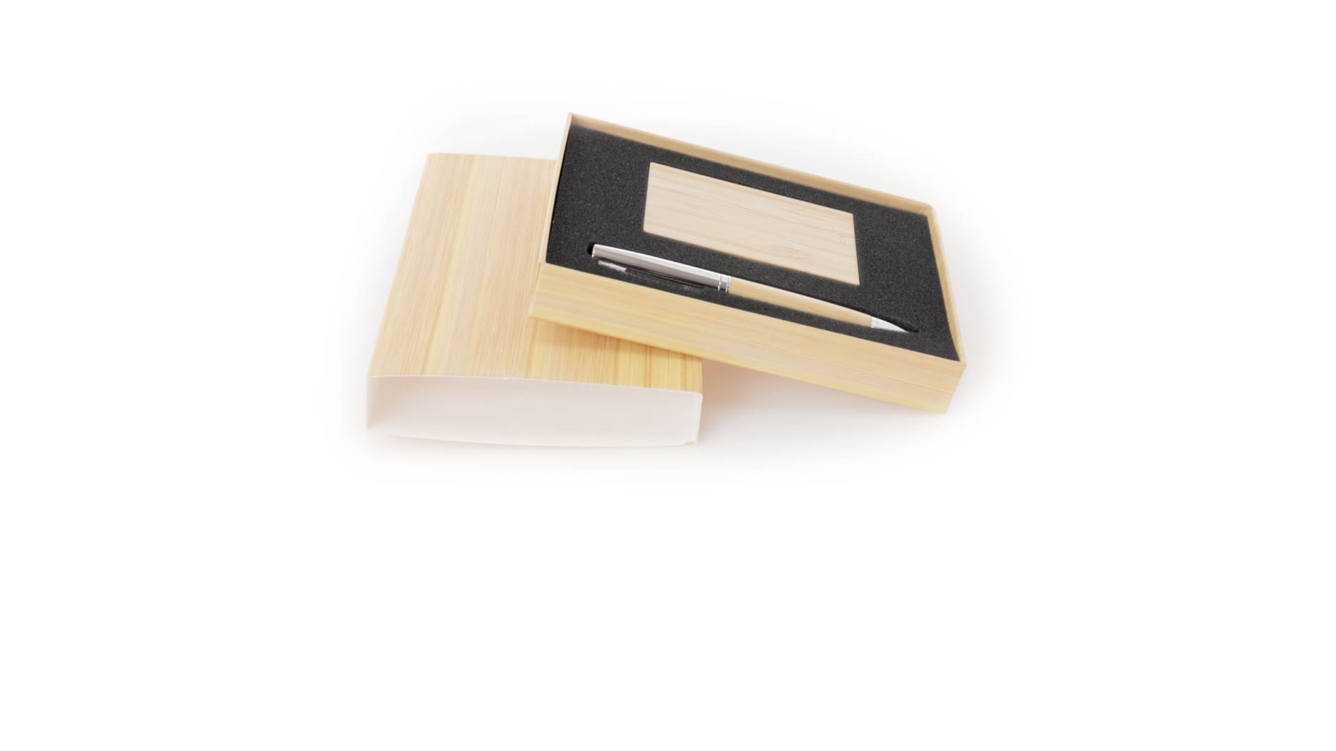 Edles Kugelschreiber- und Kartenetui-Set aus Bambus und Metall. Kugelschreiber mit glänzendem Metallschaft und weichem Bambusgriff, mit Drehmechanismus und blauer Tinte. Enthält einen hervorragenden Kartenhalter mit einem Fach aus glänzendem Metall und einem weichen Bambusbezug. Präsentiert in einer individuellen Bambus-Designbox.