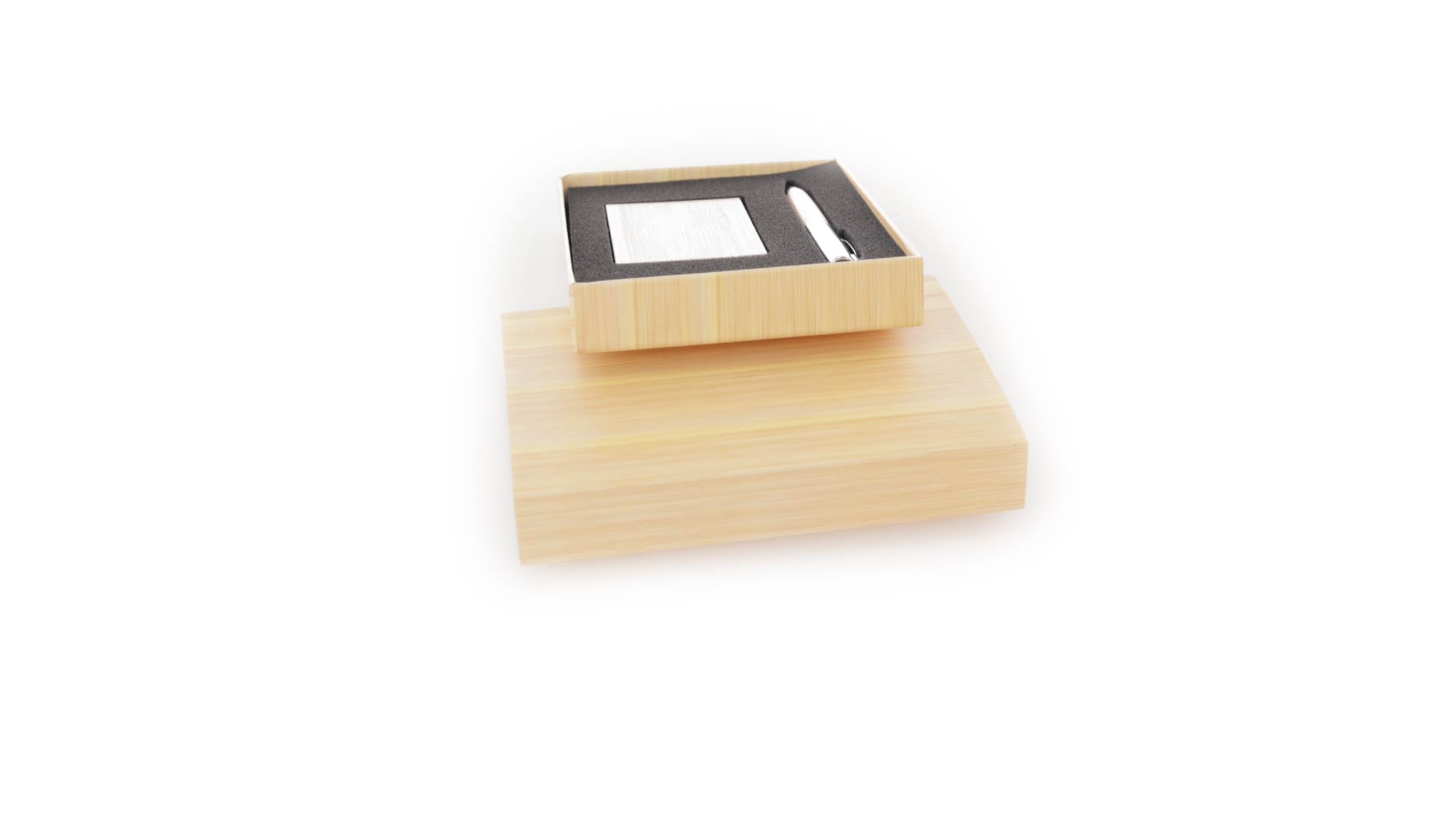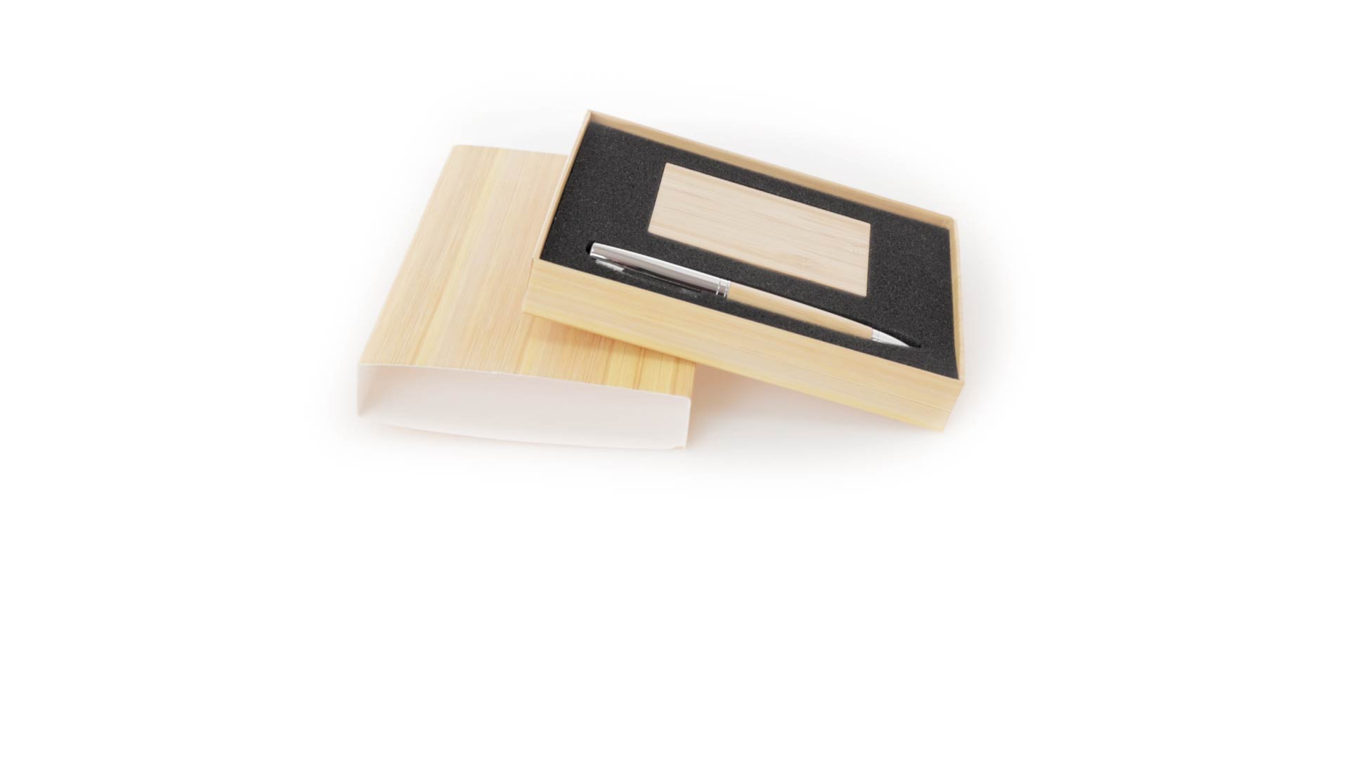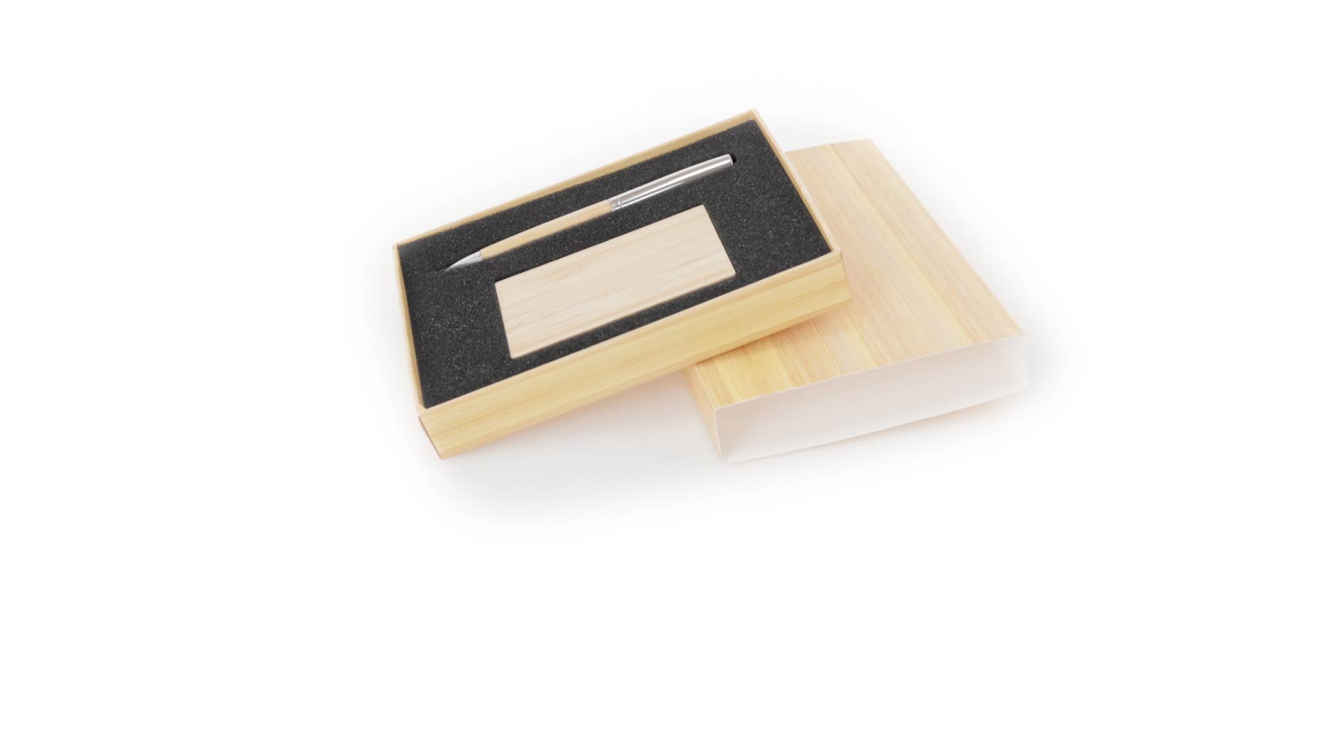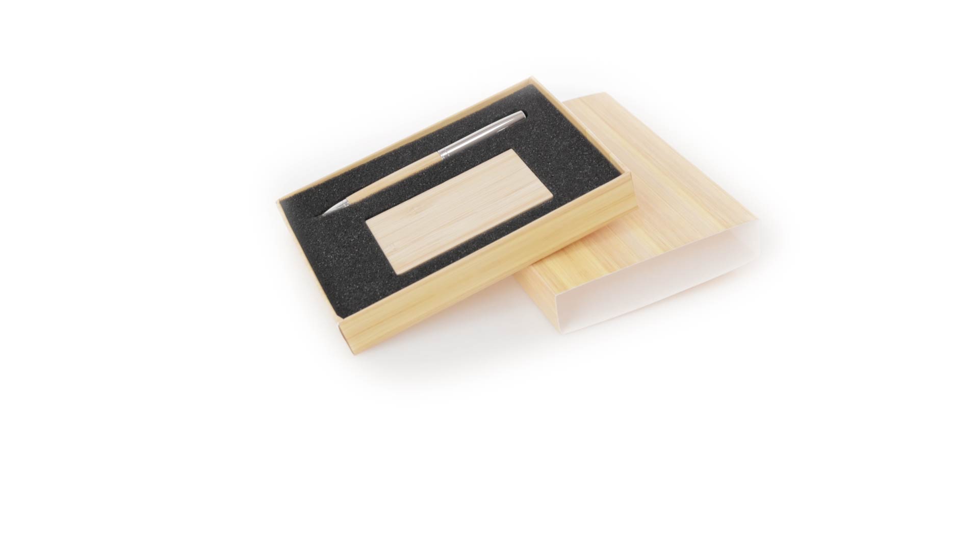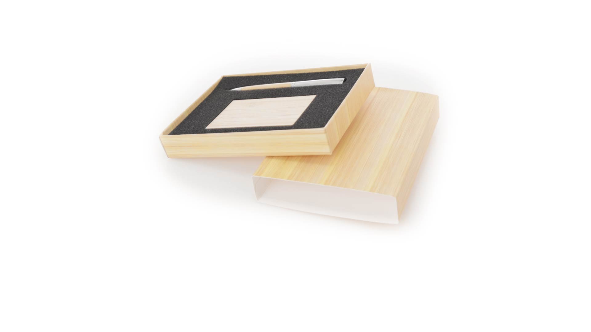 Edles Kugelschreiber- und Kartenetui-Set aus Bambus und Metall. Kugelschreiber mit glänzendem Metallschaft und weichem Bambusgriff, mit Drehmechanismus und blauer Tinte. Enthält einen hervorragenden Kartenhalter mit einem Fach aus glänzendem Metall und einem weichen Bambusbezug. Präsentiert in einer individuellen Bambus-Designbox.