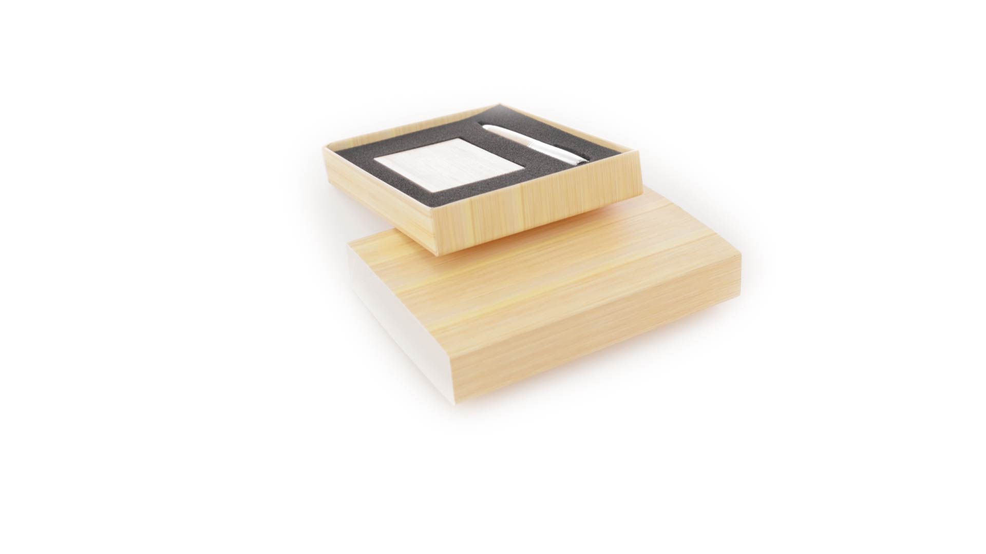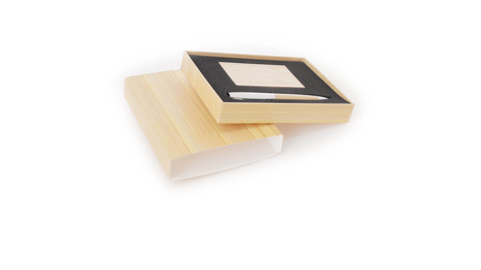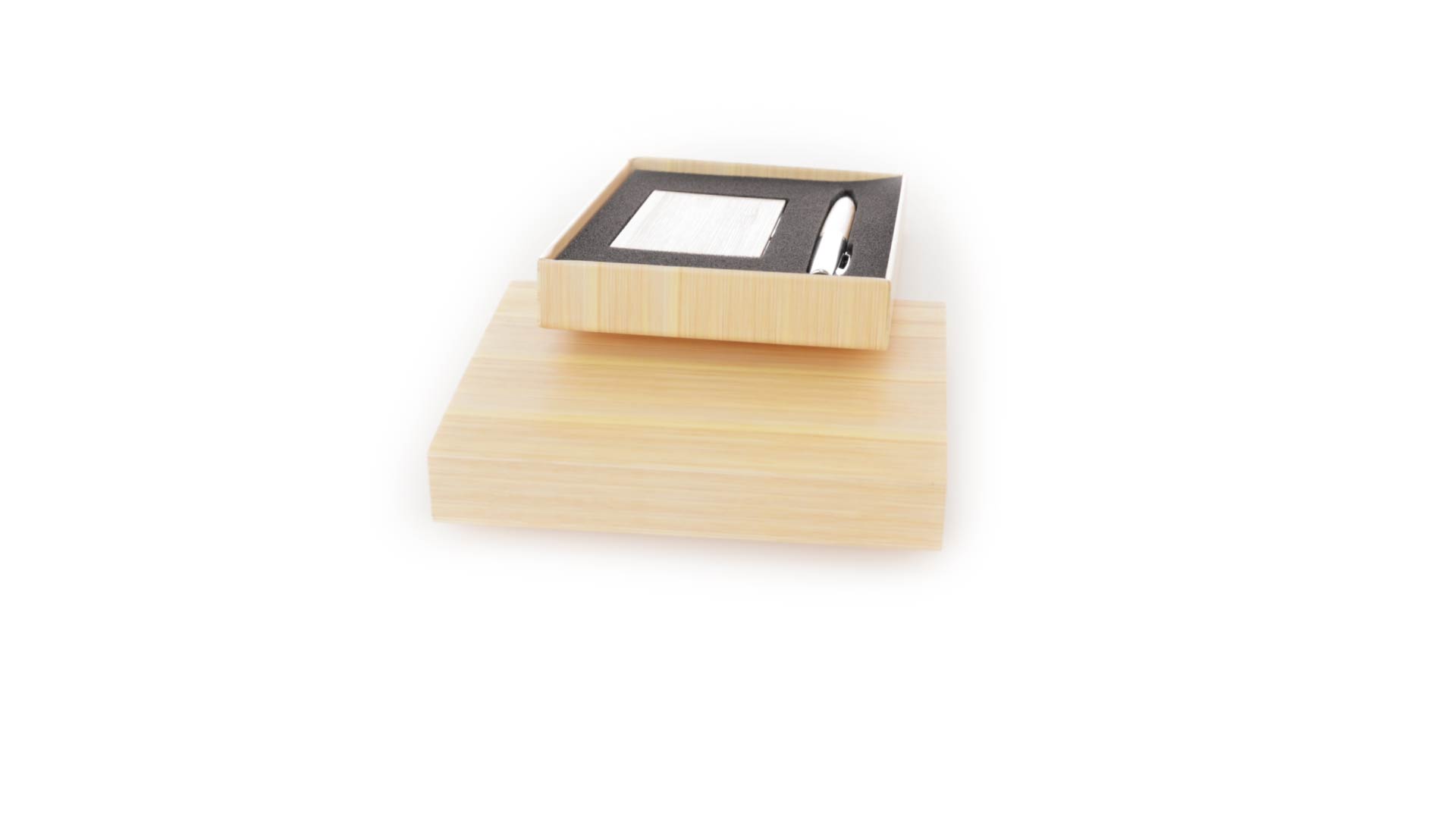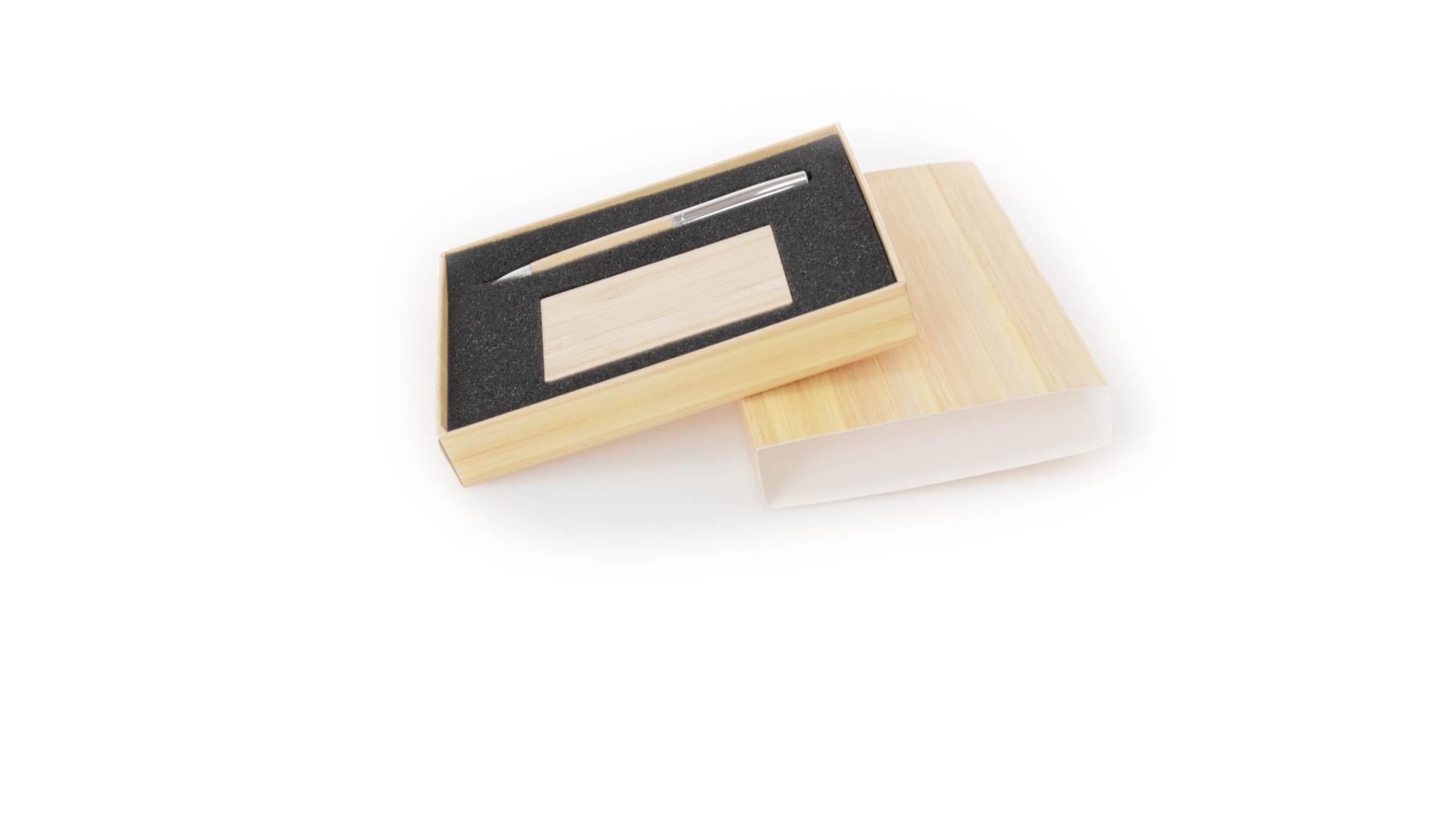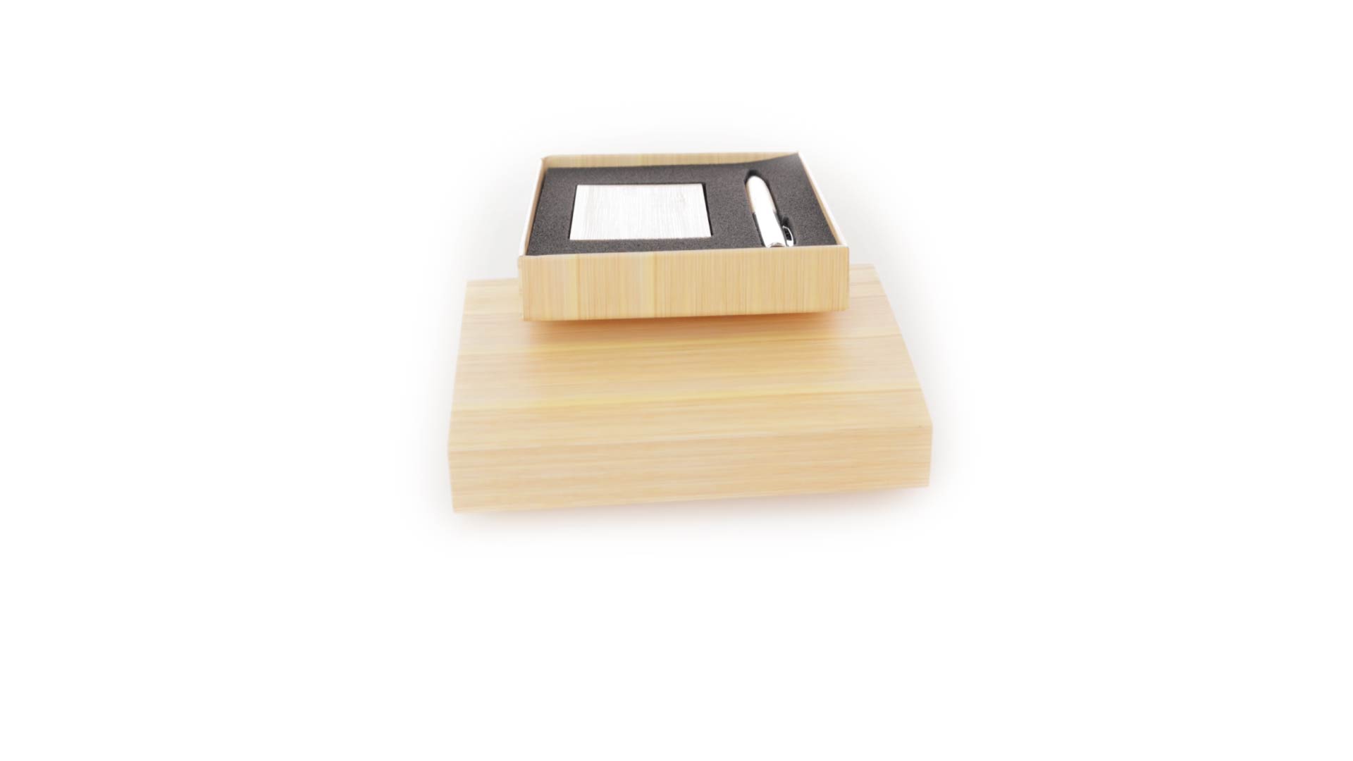 Edles Kugelschreiber- und Kartenetui-Set aus Bambus und Metall. Kugelschreiber mit glänzendem Metallschaft und weichem Bambusgriff, mit Drehmechanismus und blauer Tinte. Enthält einen hervorragenden Kartenhalter mit einem Fach aus glänzendem Metall und einem weichen Bambusbezug. Präsentiert in einer individuellen Bambus-Designbox.