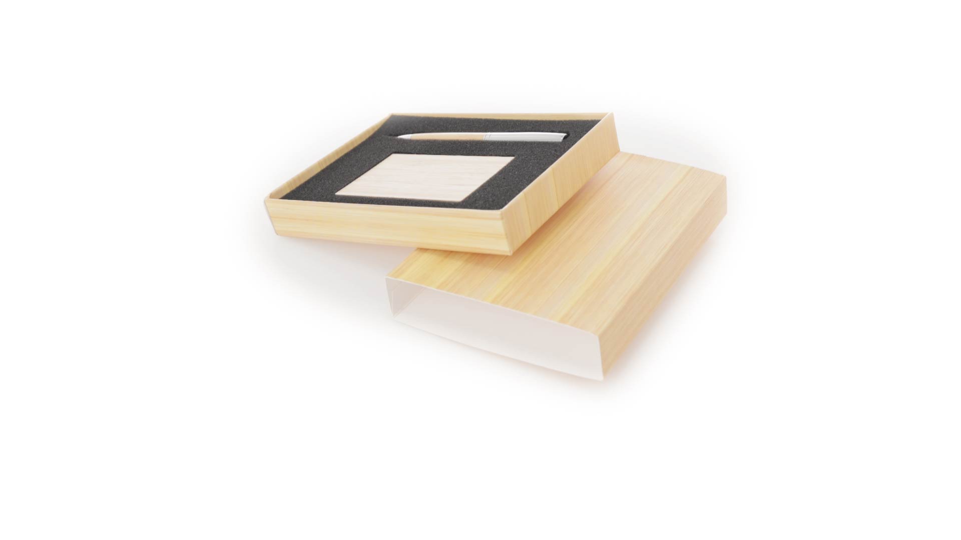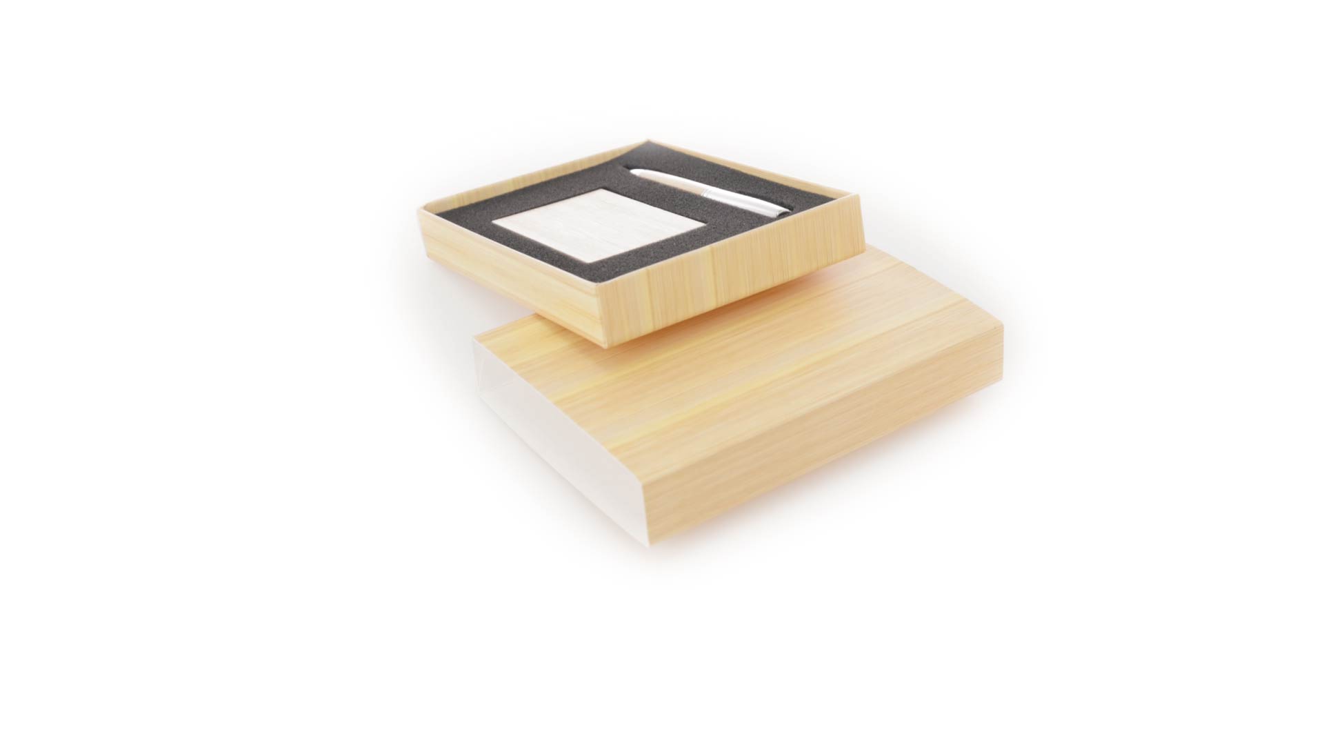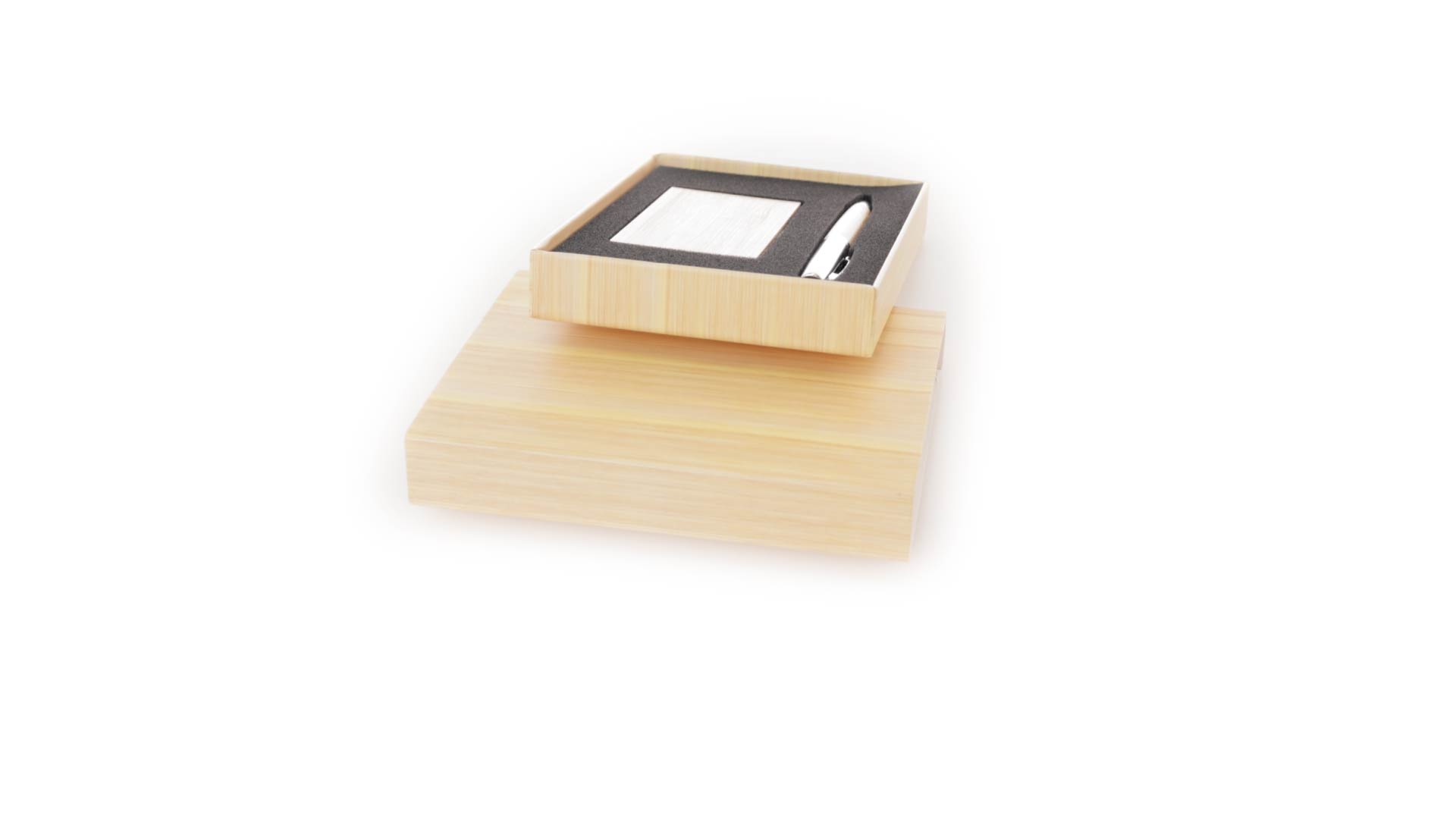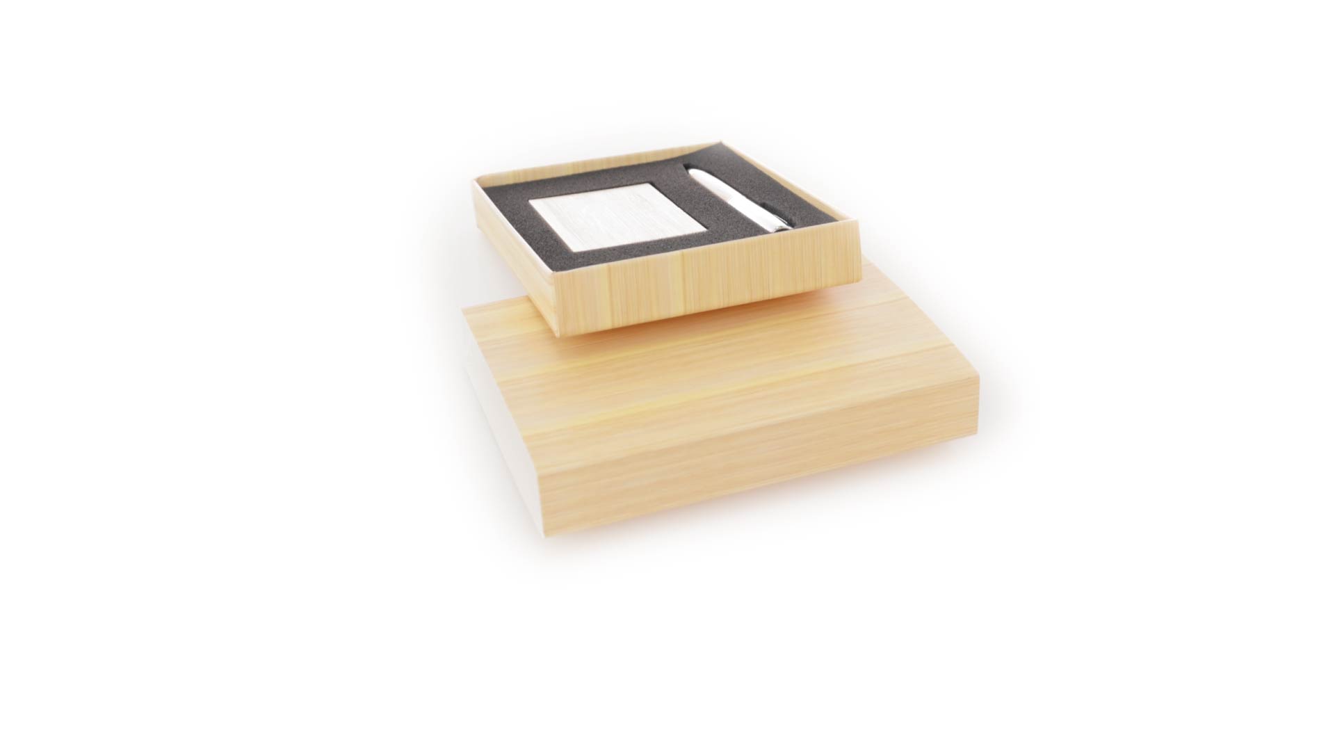 Edles Kugelschreiber- und Kartenetui-Set aus Bambus und Metall. Kugelschreiber mit glänzendem Metallschaft und weichem Bambusgriff, mit Drehmechanismus und blauer Tinte. Enthält einen hervorragenden Kartenhalter mit einem Fach aus glänzendem Metall und einem weichen Bambusbezug. Präsentiert in einer individuellen Bambus-Designbox.