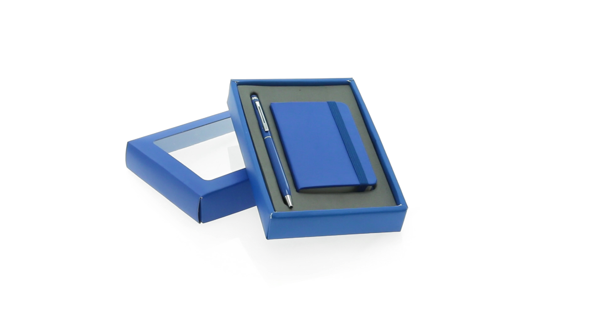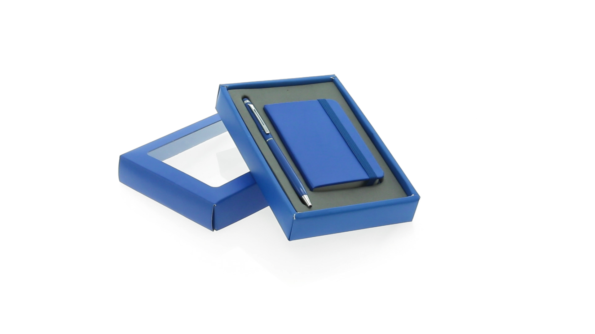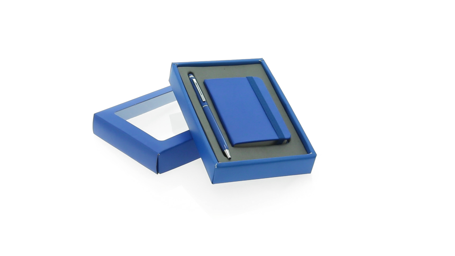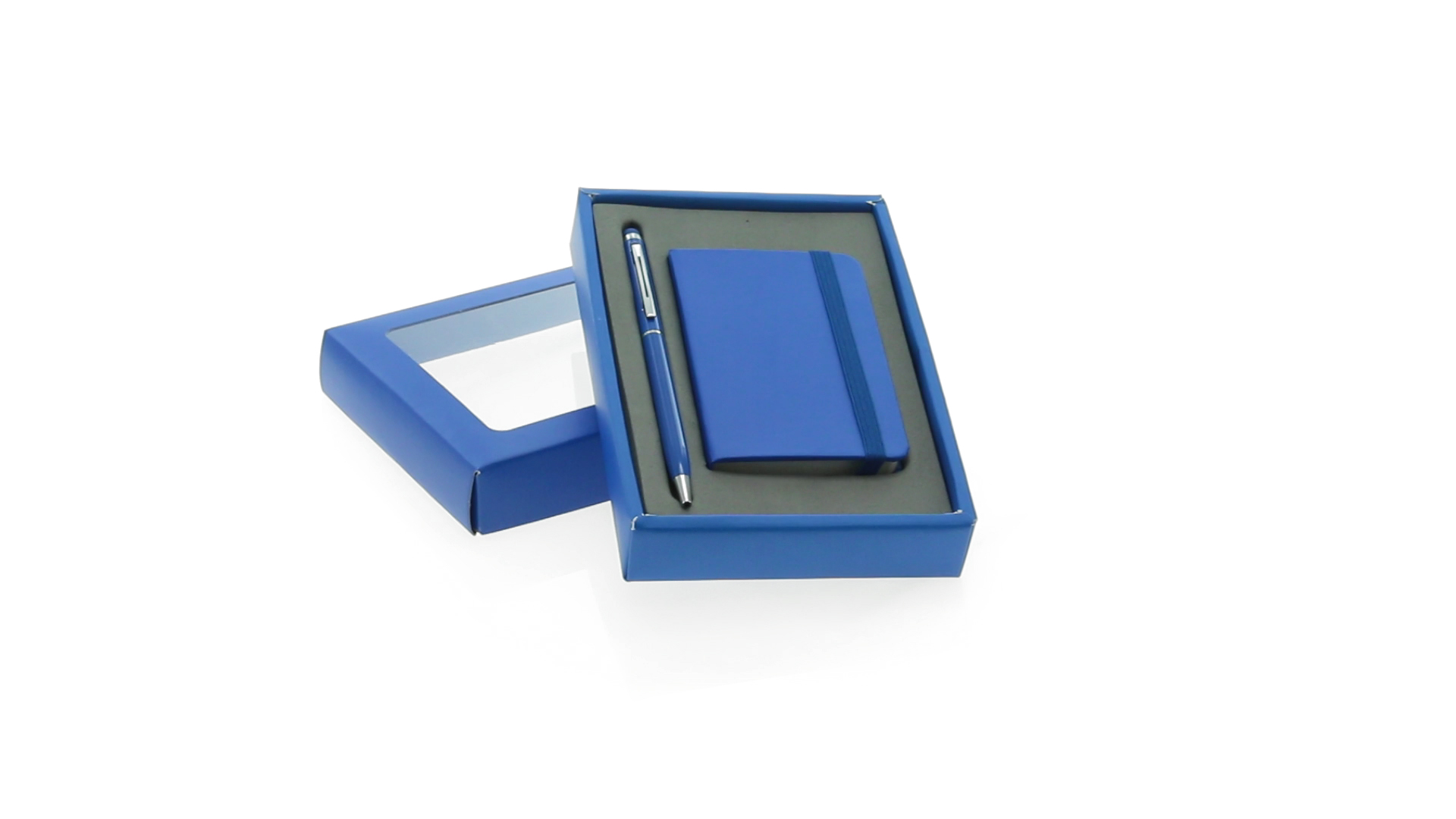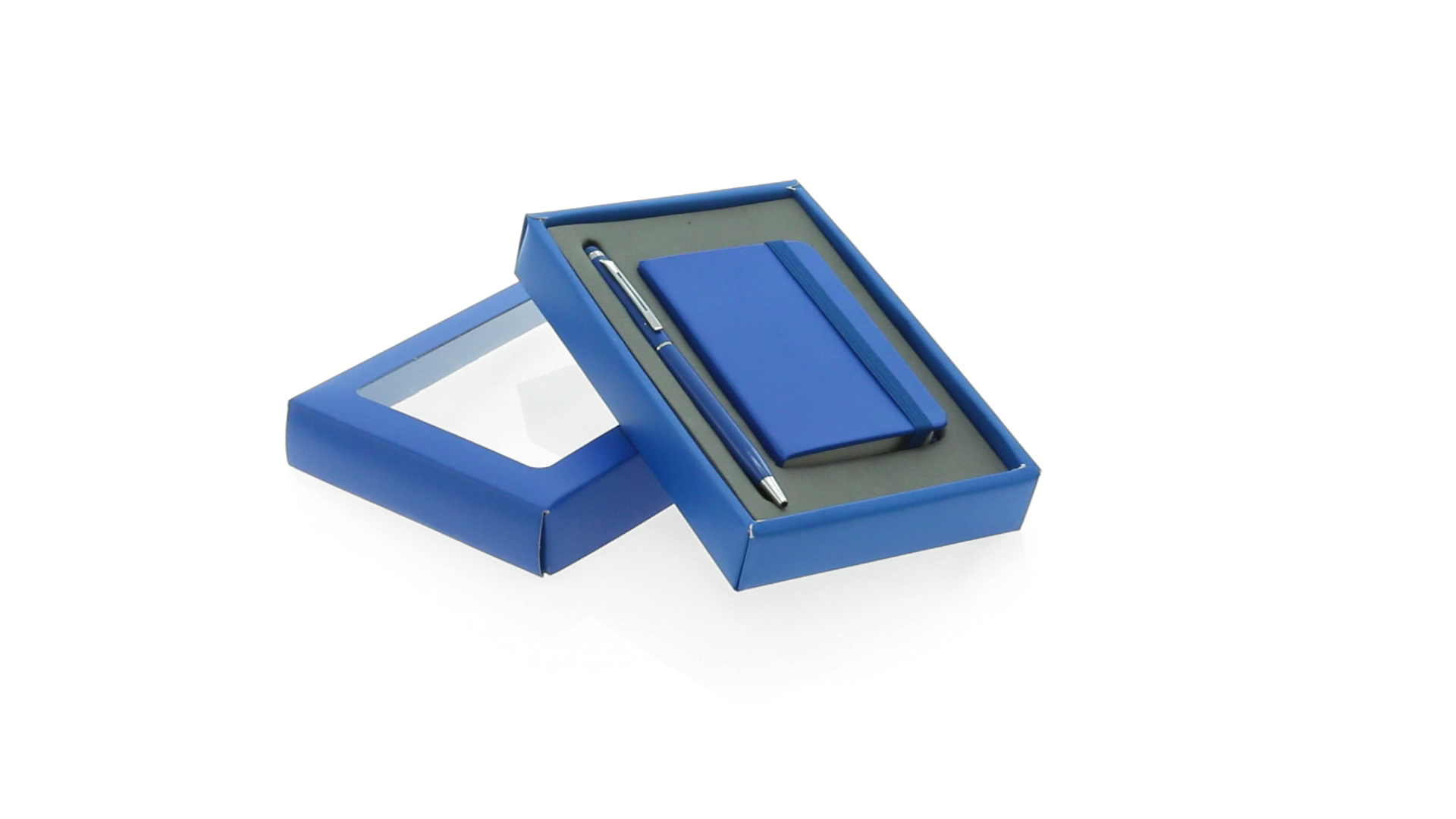 Set aus Notizblock mit Soft-Touch-Cover aus Kunstleder und Aluminium-Kugelschreiber mit farblich passendem Stylus. Mit 80 Blättern, Gummibandverschluss und farblich passendem Lesezeichenband. Präsentiert in einer eleganten Schachtel aus Karton in passender Farbe, mit Fenster und weichem Schaumstoff mit Stanzung im Inneren. Kugelschreiber mit blauer Tinte.