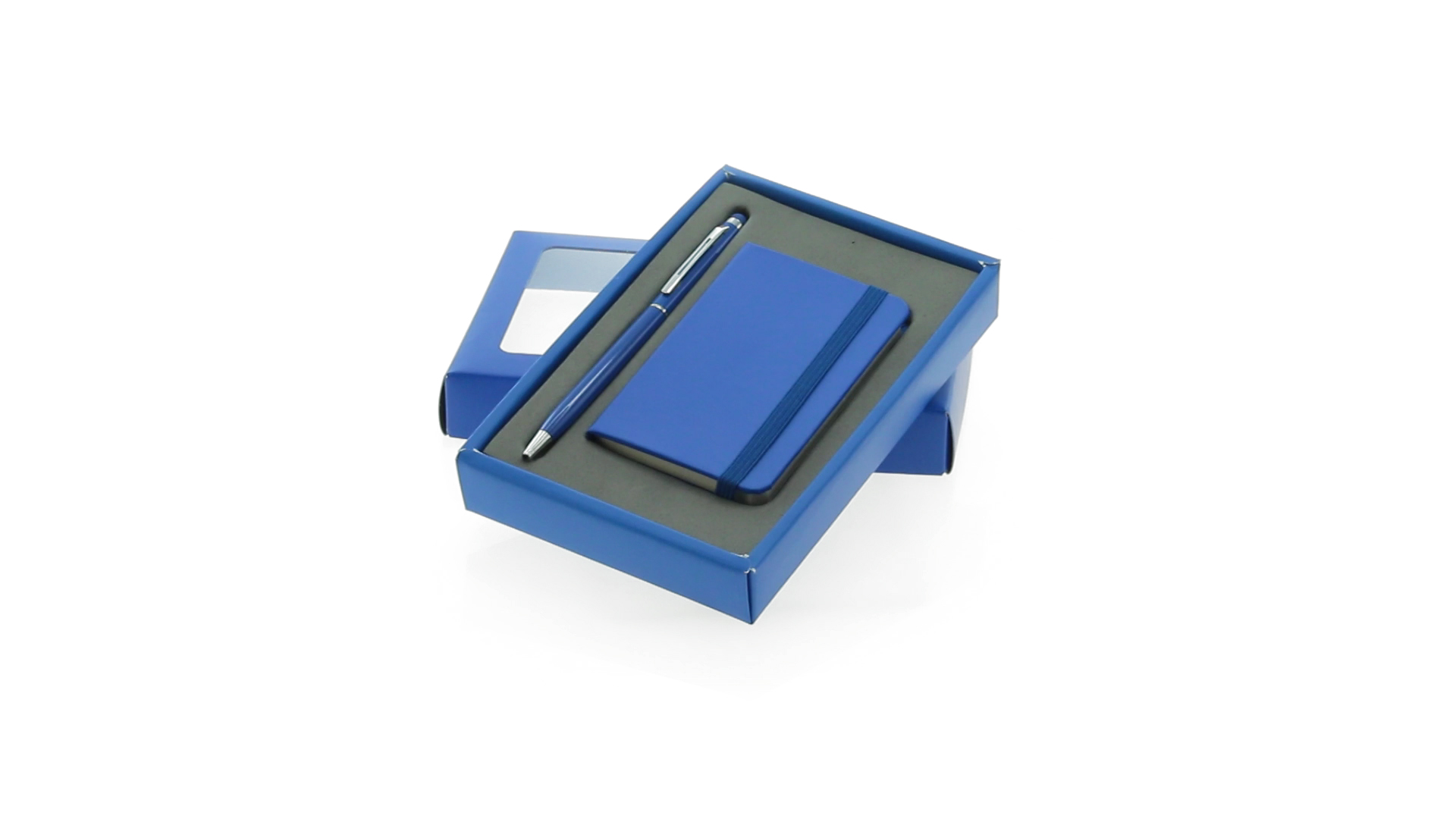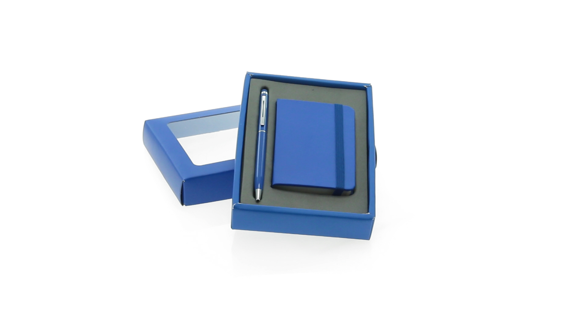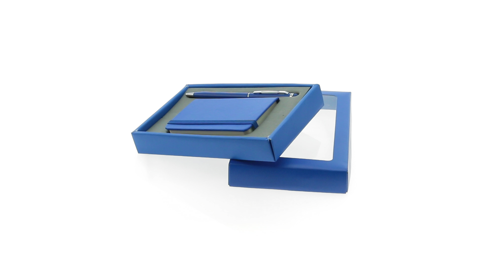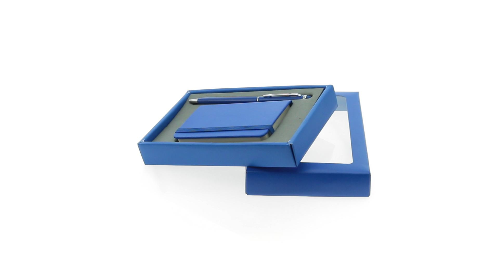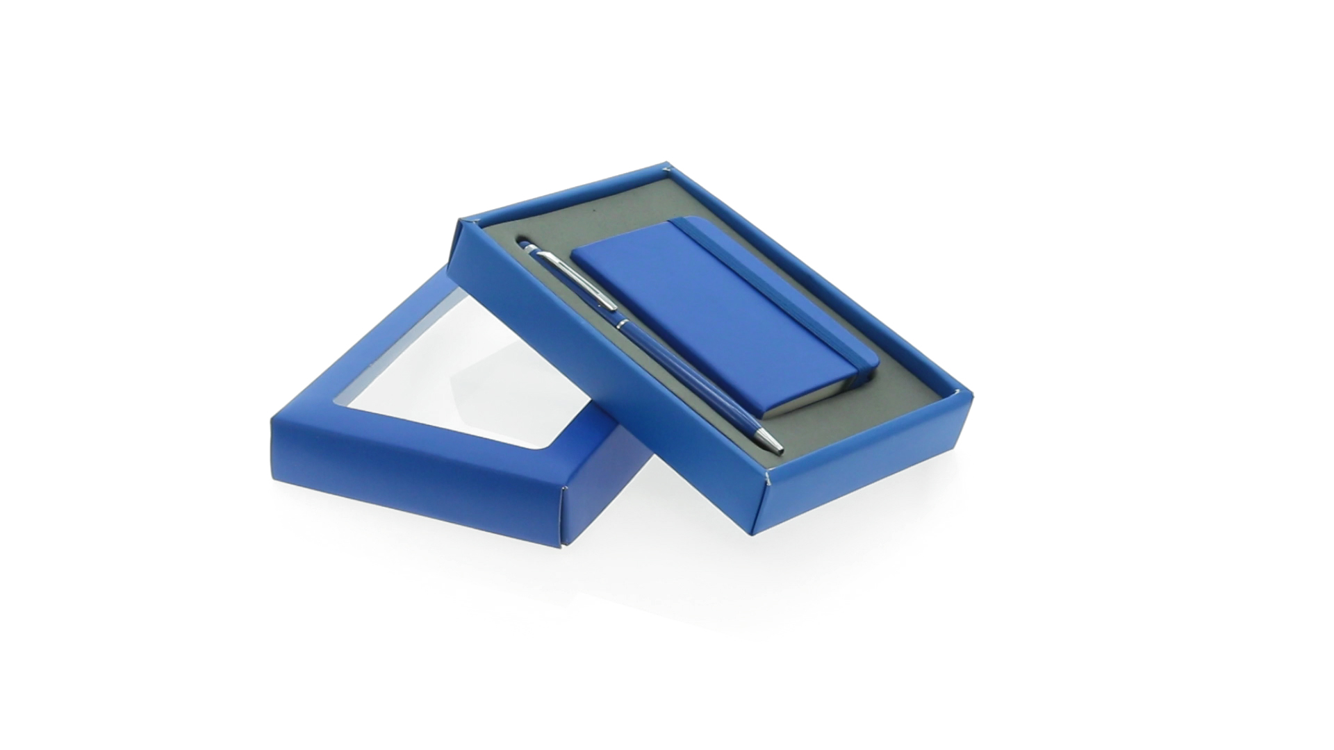 Set aus Notizblock mit Soft-Touch-Cover aus Kunstleder und Aluminium-Kugelschreiber mit farblich passendem Stylus. Mit 80 Blättern, Gummibandverschluss und farblich passendem Lesezeichenband. Präsentiert in einer eleganten Schachtel aus Karton in passender Farbe, mit Fenster und weichem Schaumstoff mit Stanzung im Inneren. Kugelschreiber mit blauer Tinte.