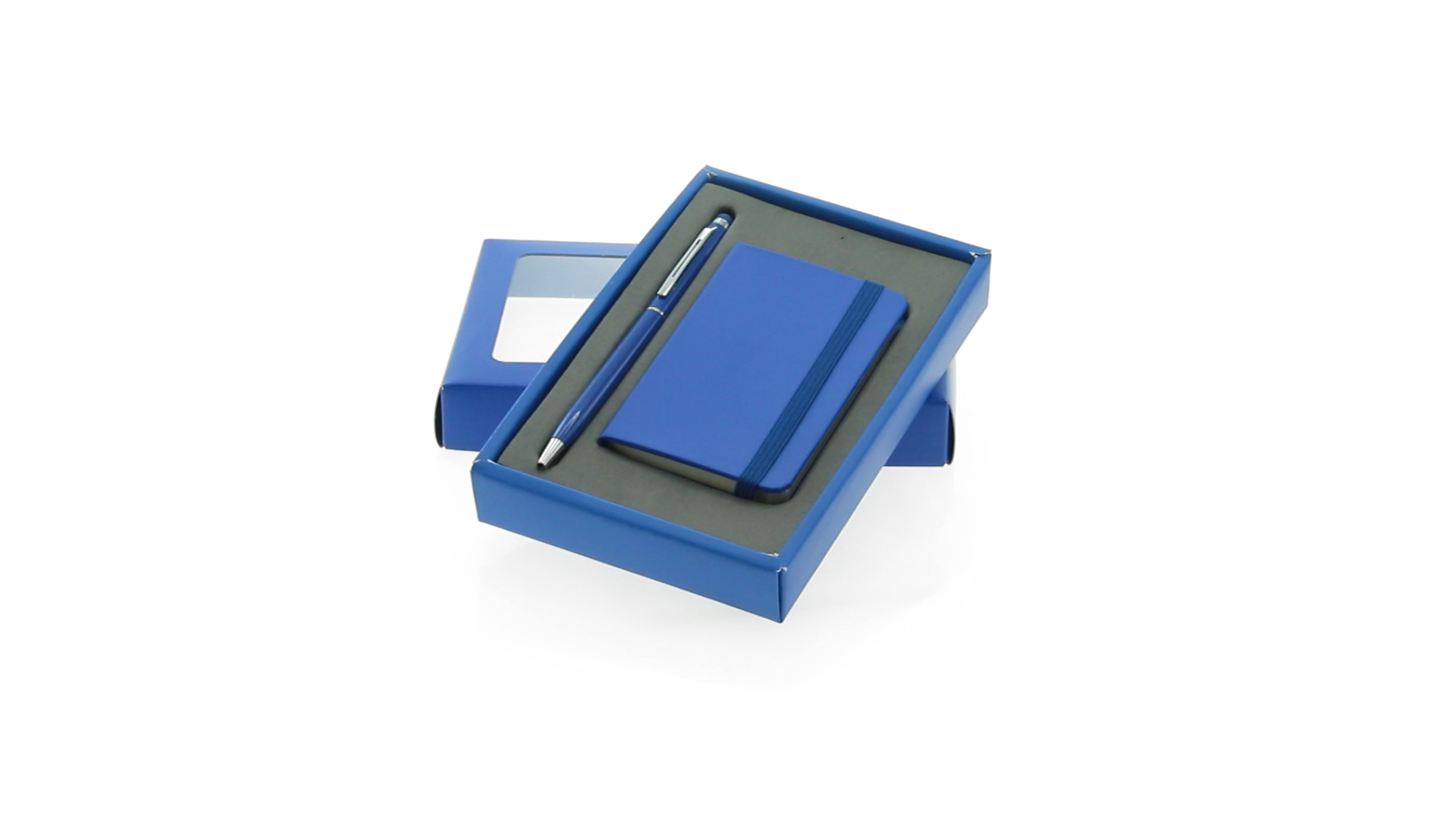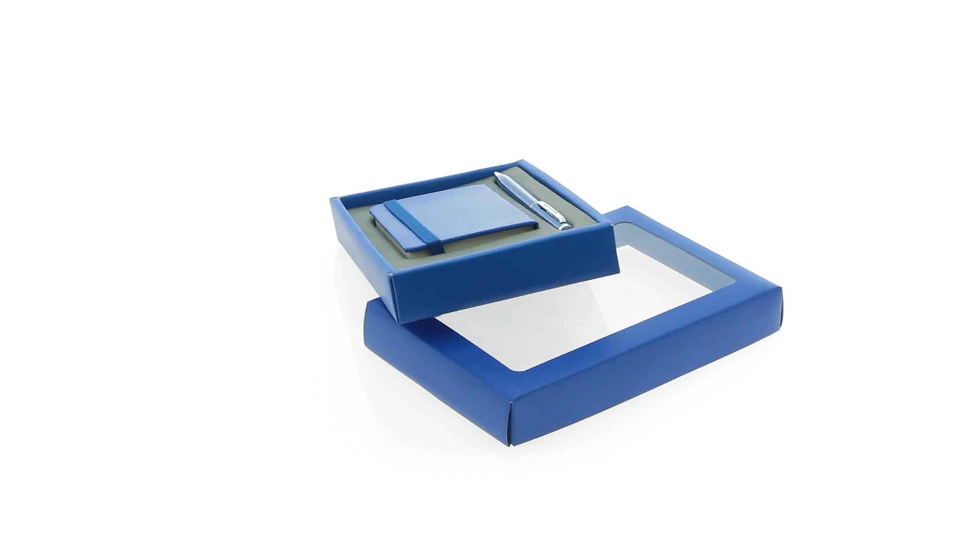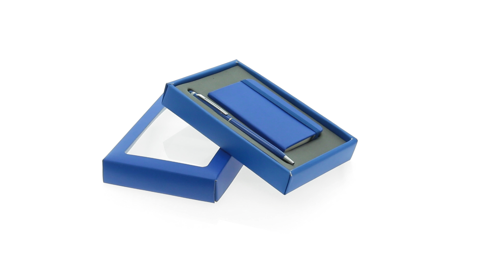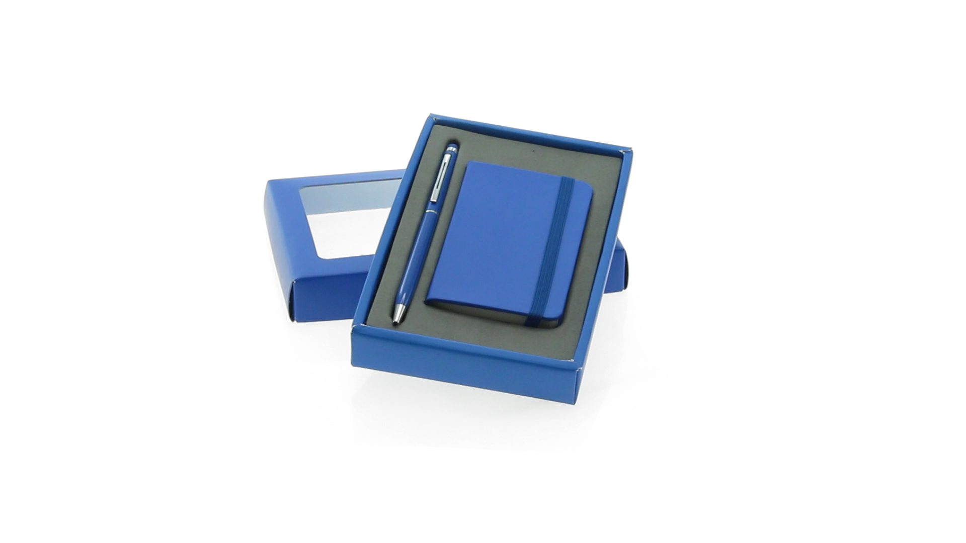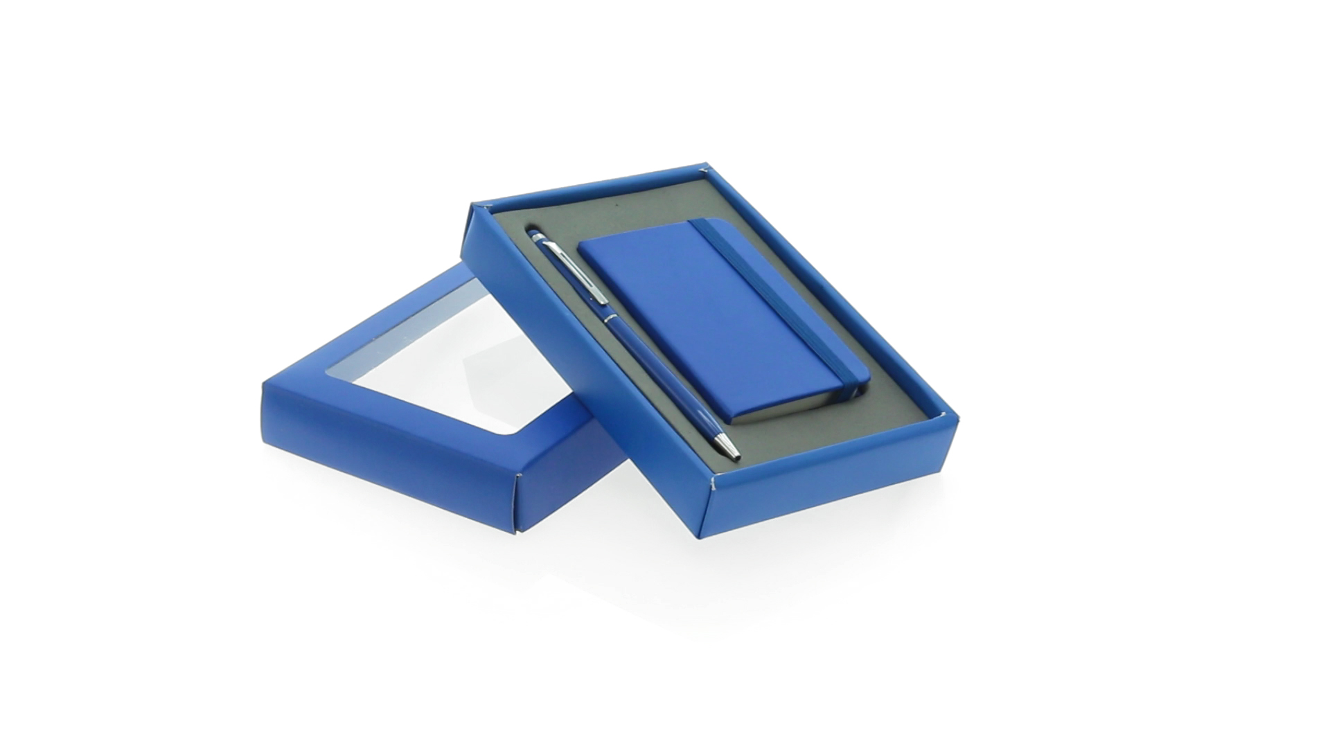 Set aus Notizblock mit Soft-Touch-Cover aus Kunstleder und Aluminium-Kugelschreiber mit farblich passendem Stylus. Mit 80 Blättern, Gummibandverschluss und farblich passendem Lesezeichenband. Präsentiert in einer eleganten Schachtel aus Karton in passender Farbe, mit Fenster und weichem Schaumstoff mit Stanzung im Inneren. Kugelschreiber mit blauer Tinte.