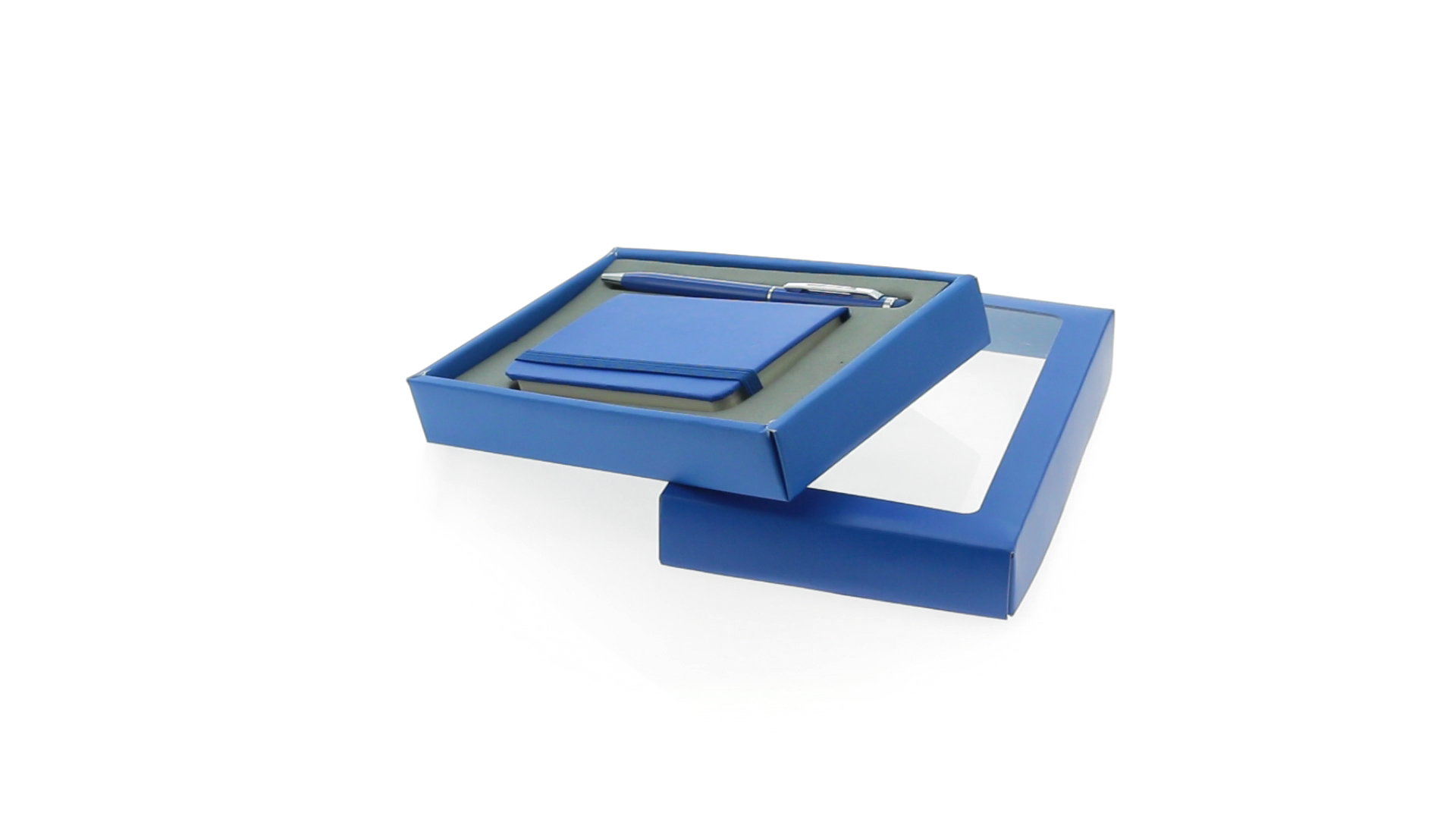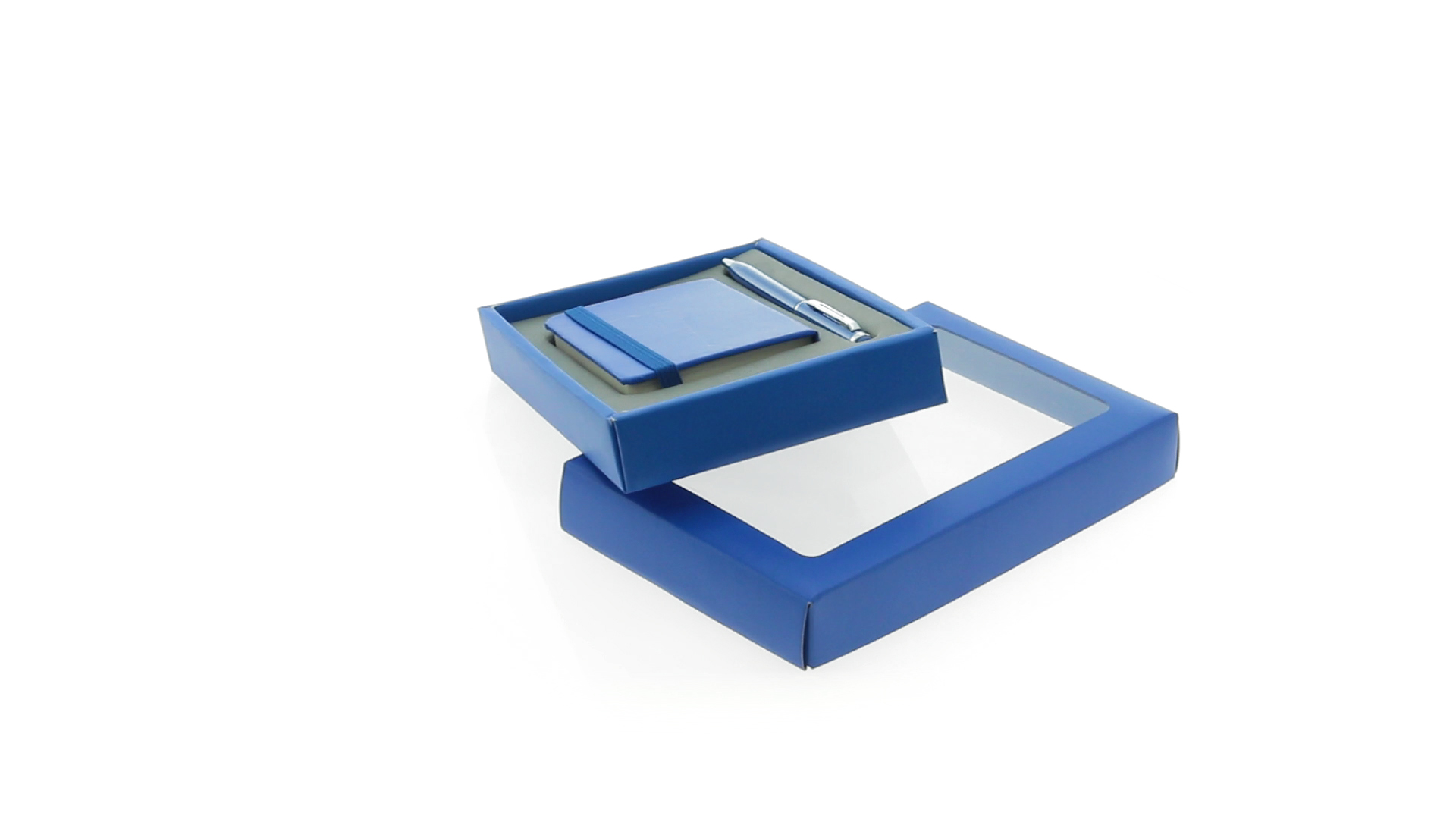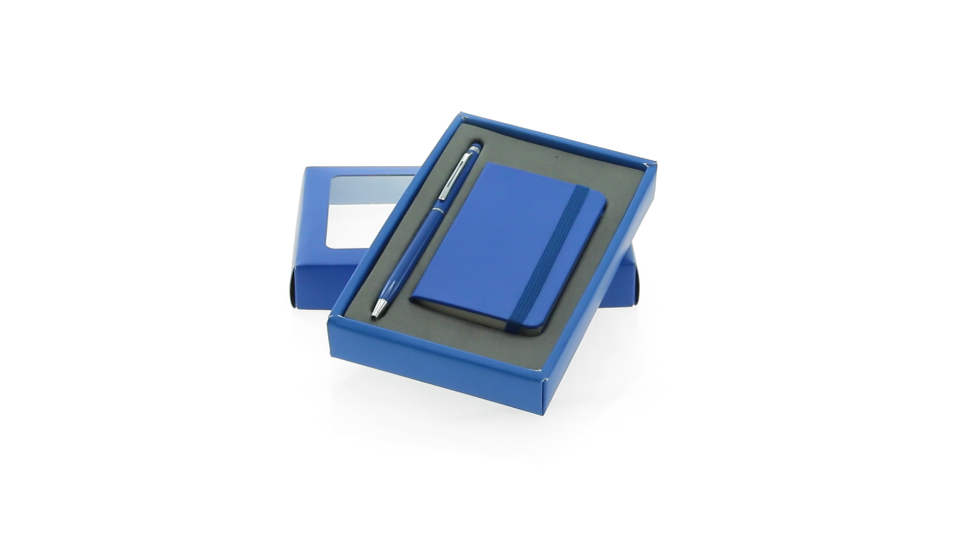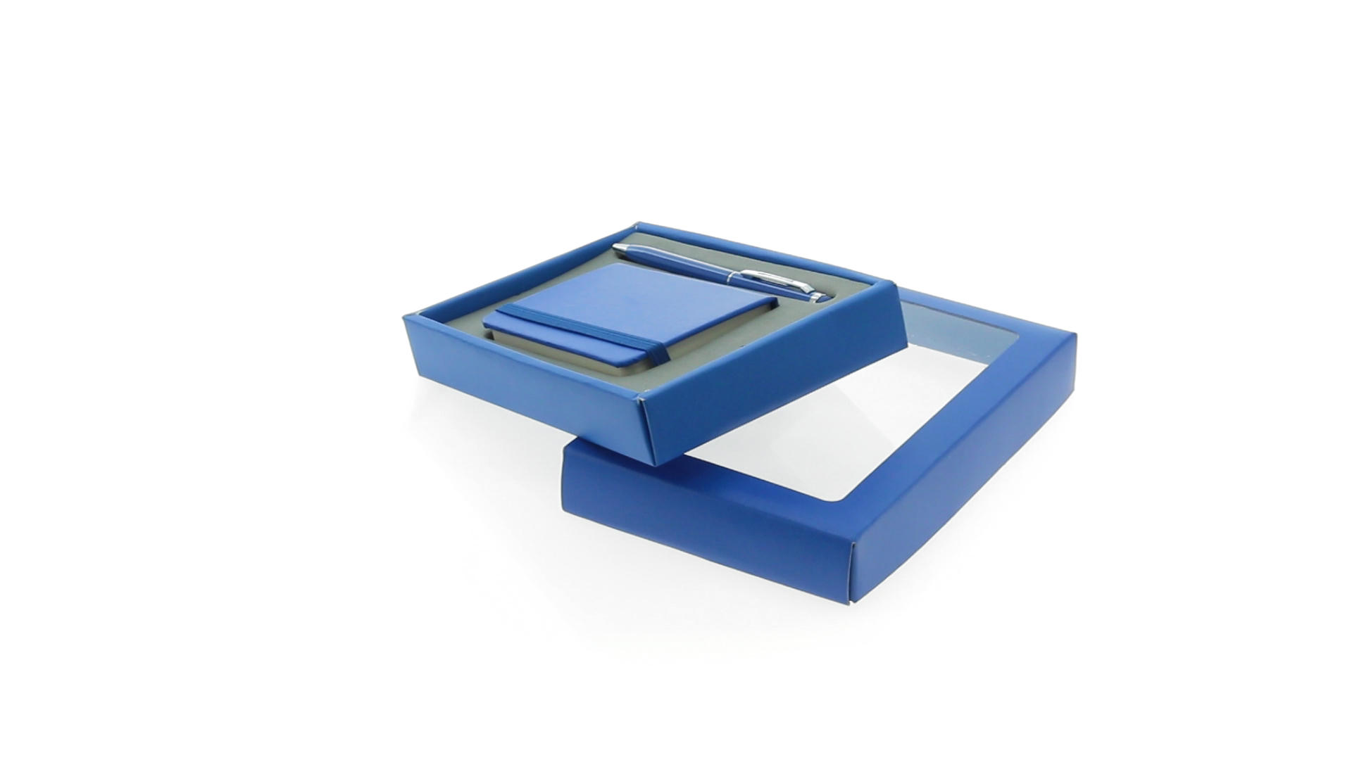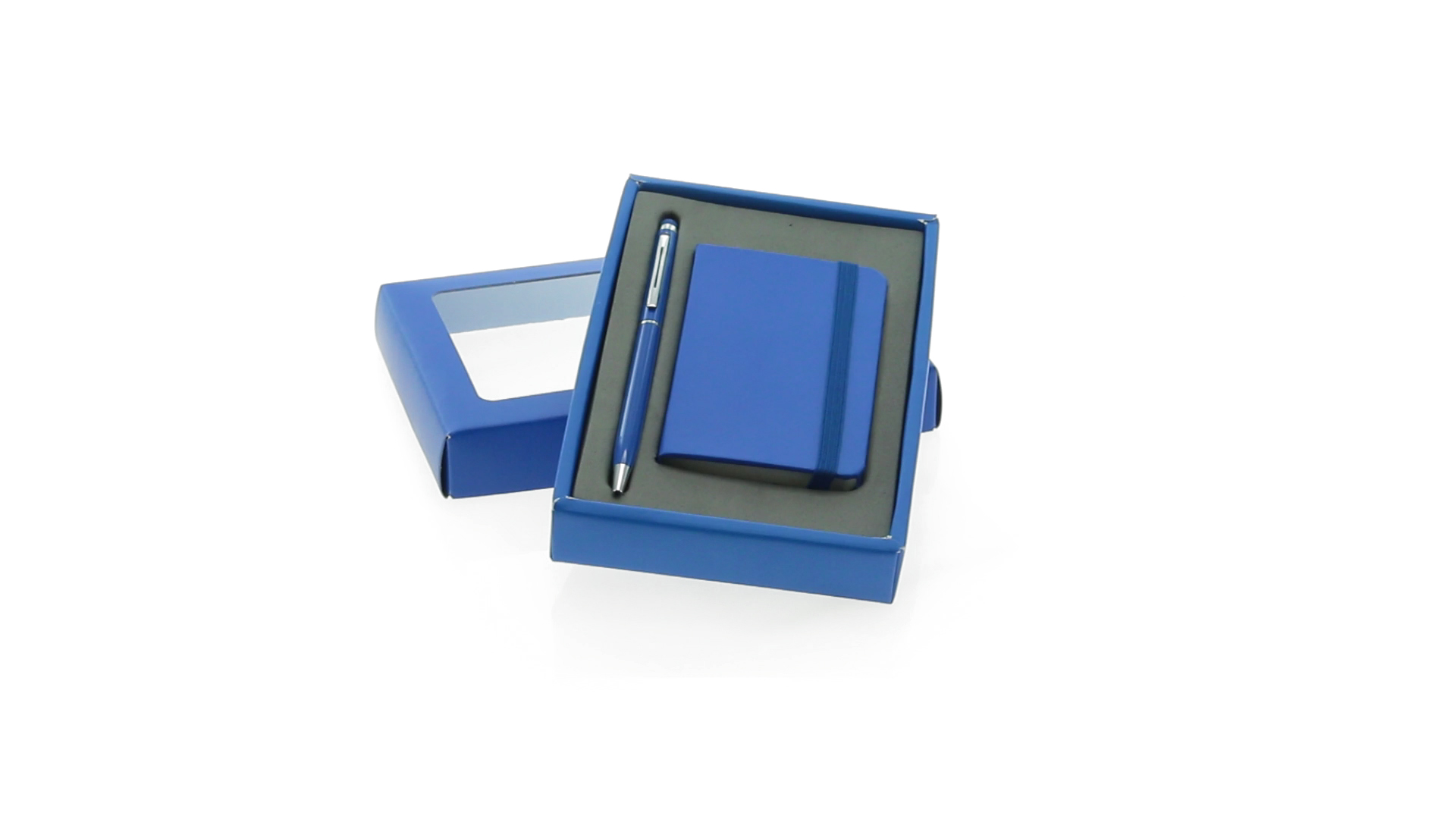 Set aus Notizblock mit Soft-Touch-Cover aus Kunstleder und Aluminium-Kugelschreiber mit farblich passendem Stylus. Mit 80 Blättern, Gummibandverschluss und farblich passendem Lesezeichenband. Präsentiert in einer eleganten Schachtel aus Karton in passender Farbe, mit Fenster und weichem Schaumstoff mit Stanzung im Inneren. Kugelschreiber mit blauer Tinte.