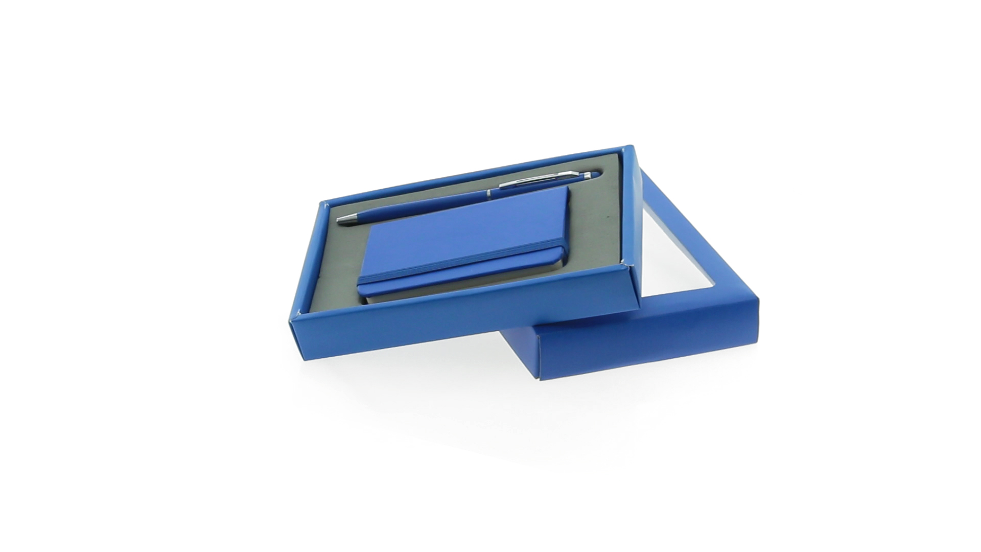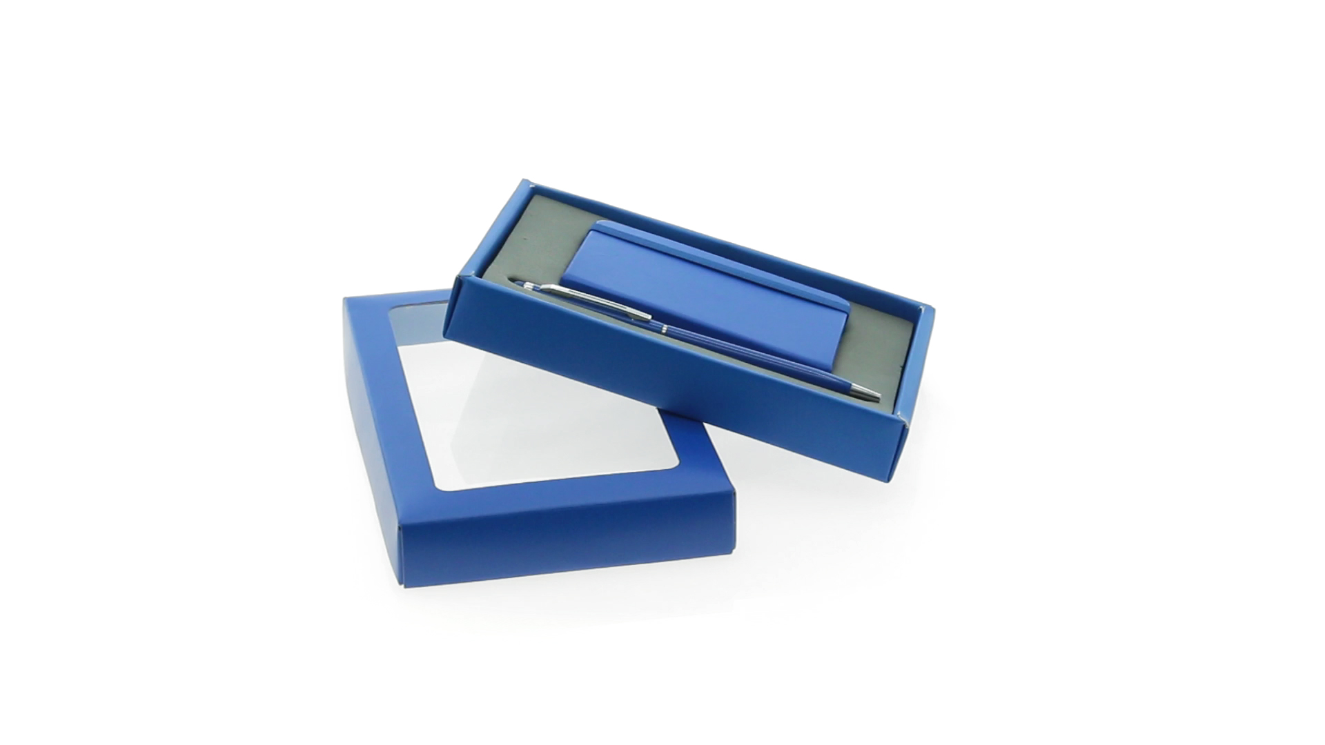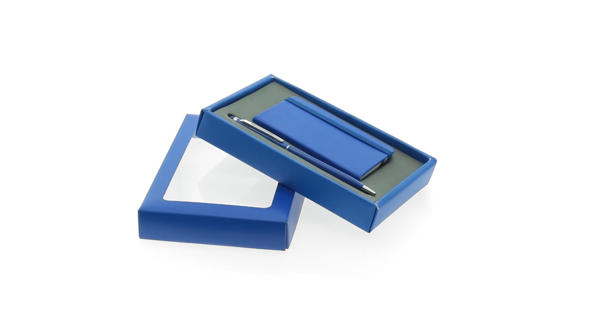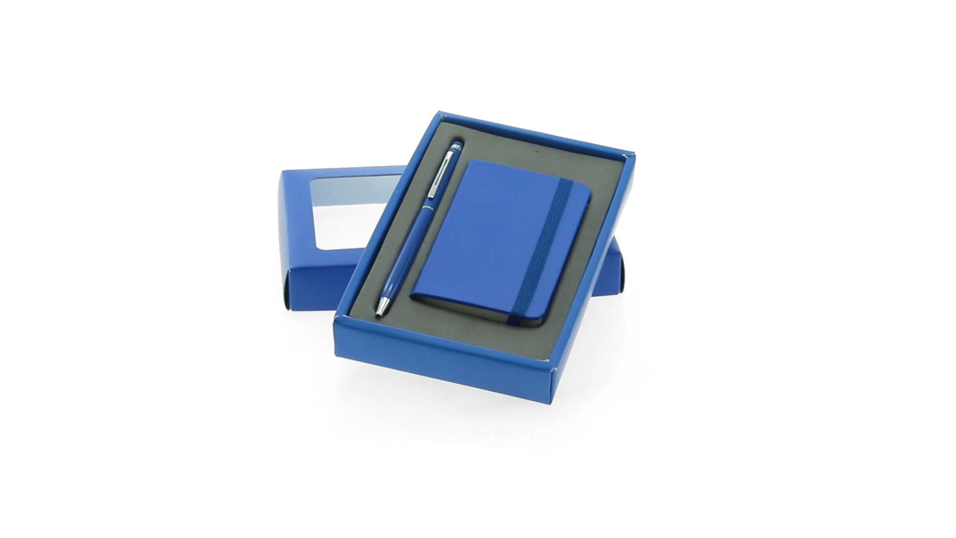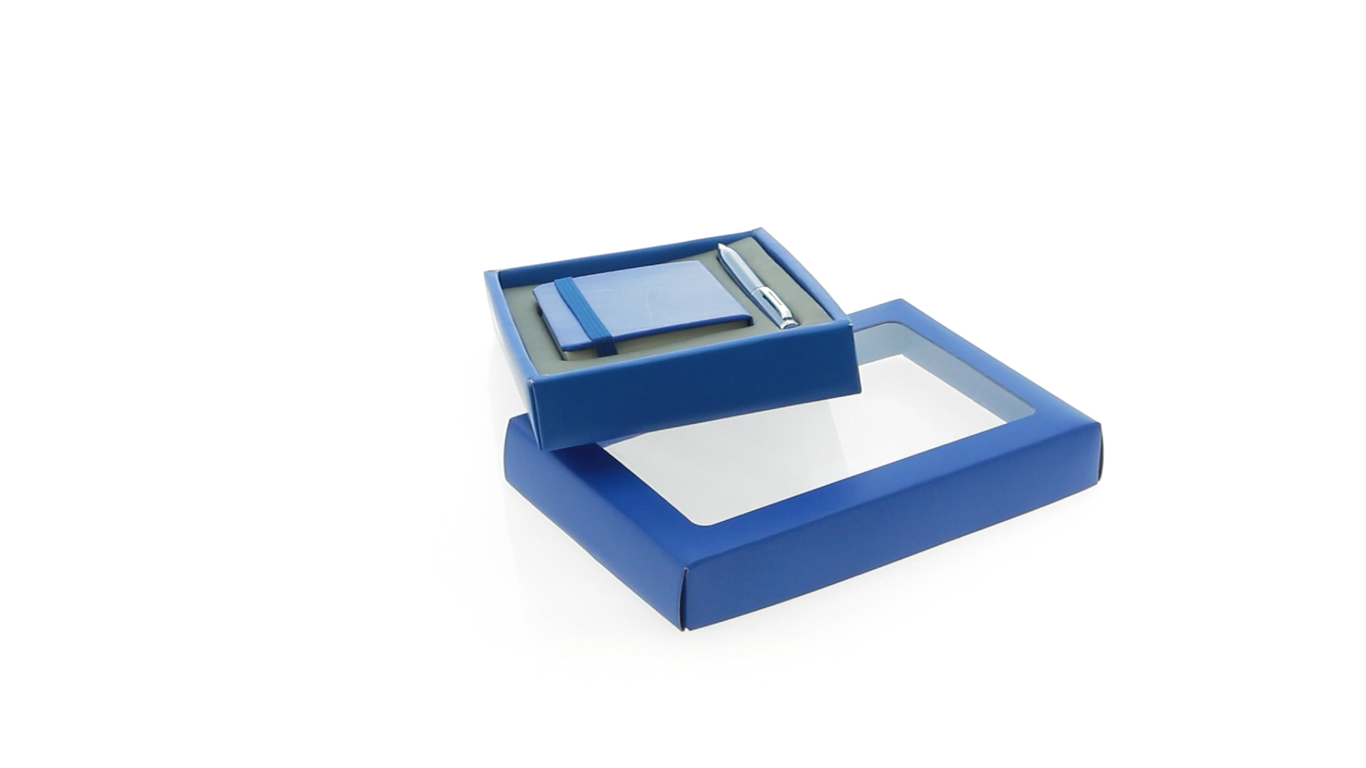 Set aus Notizblock mit Soft-Touch-Cover aus Kunstleder und Aluminium-Kugelschreiber mit farblich passendem Stylus. Mit 80 Blättern, Gummibandverschluss und farblich passendem Lesezeichenband. Präsentiert in einer eleganten Schachtel aus Karton in passender Farbe, mit Fenster und weichem Schaumstoff mit Stanzung im Inneren. Kugelschreiber mit blauer Tinte.
