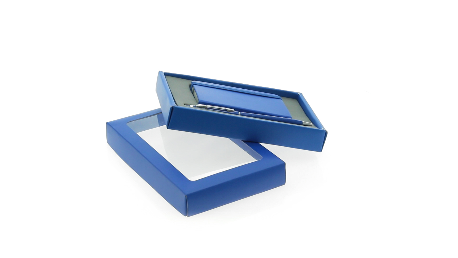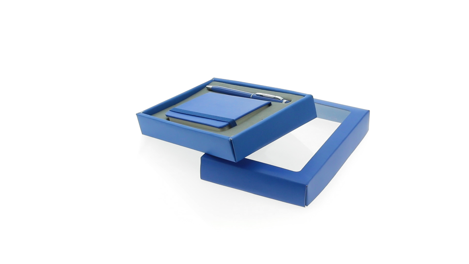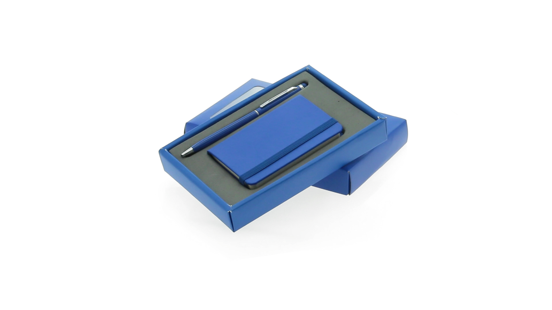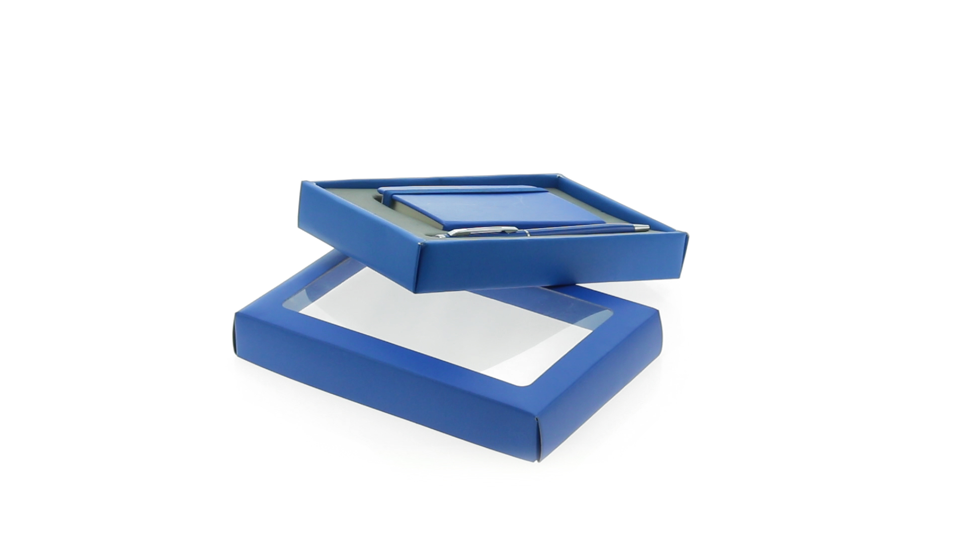 Set aus Notizblock mit Soft-Touch-Cover aus Kunstleder und Aluminium-Kugelschreiber mit farblich passendem Stylus. Mit 80 Blättern, Gummibandverschluss und farblich passendem Lesezeichenband. Präsentiert in einer eleganten Schachtel aus Karton in passender Farbe, mit Fenster und weichem Schaumstoff mit Stanzung im Inneren. Kugelschreiber mit blauer Tinte.