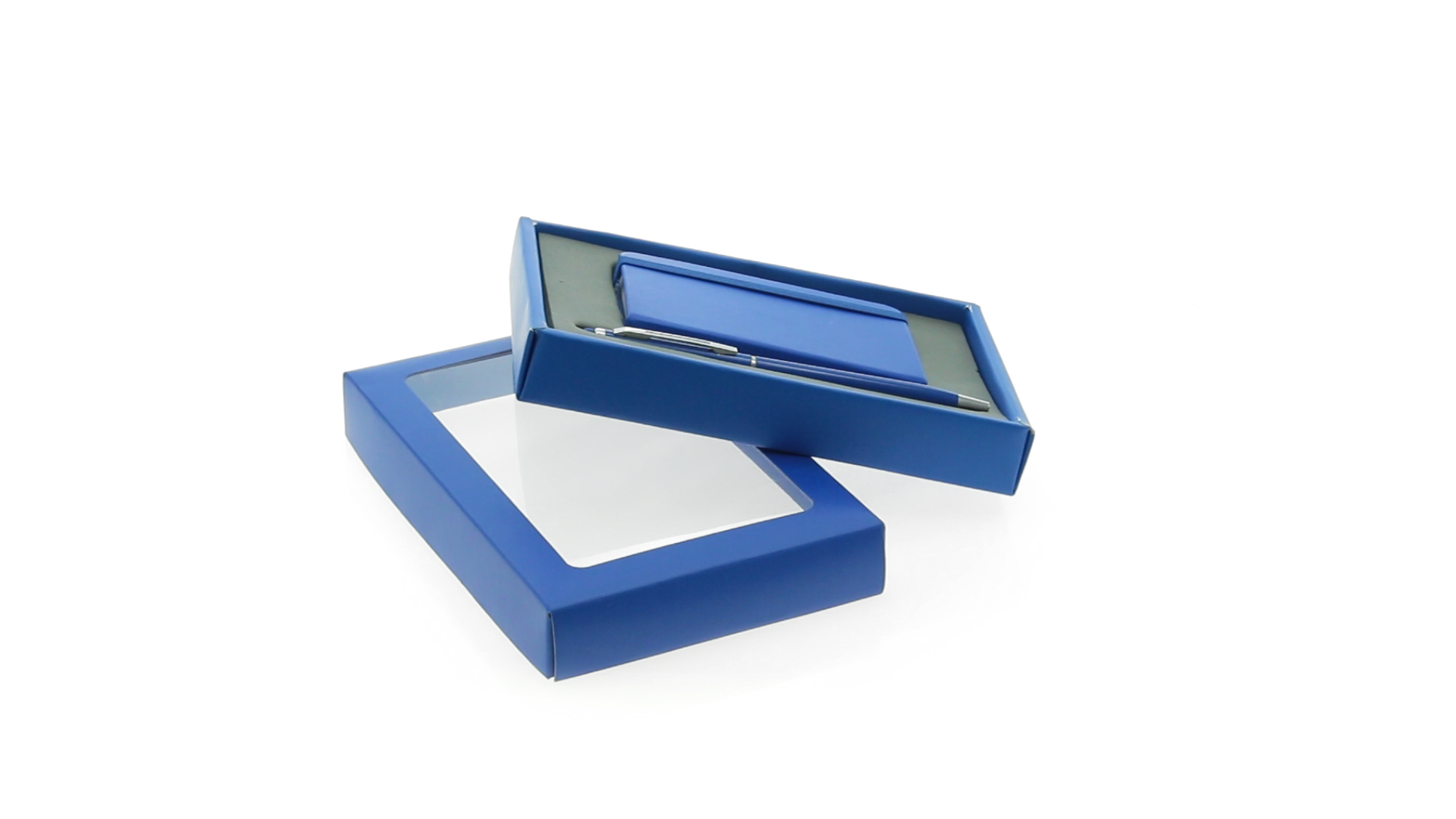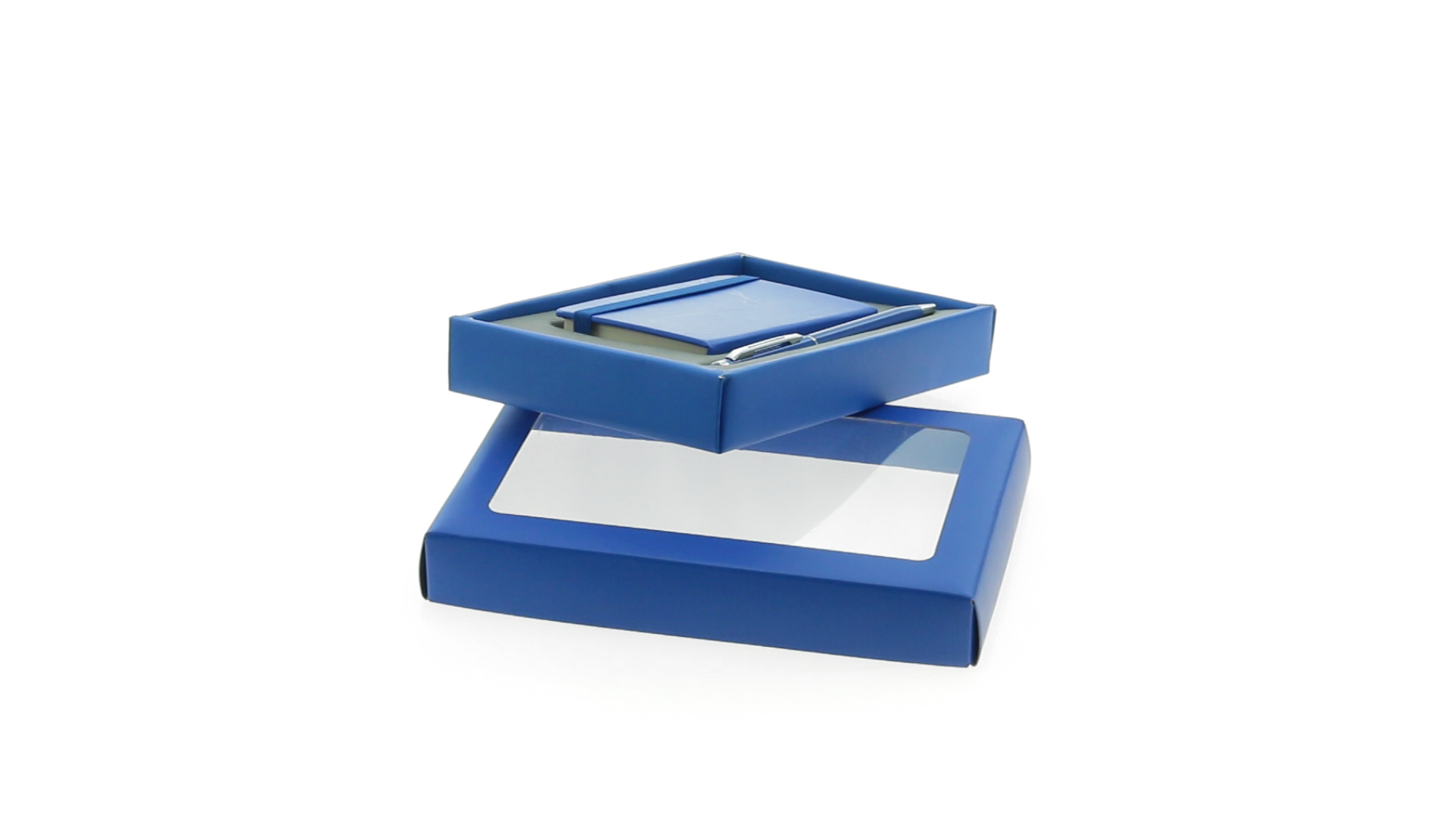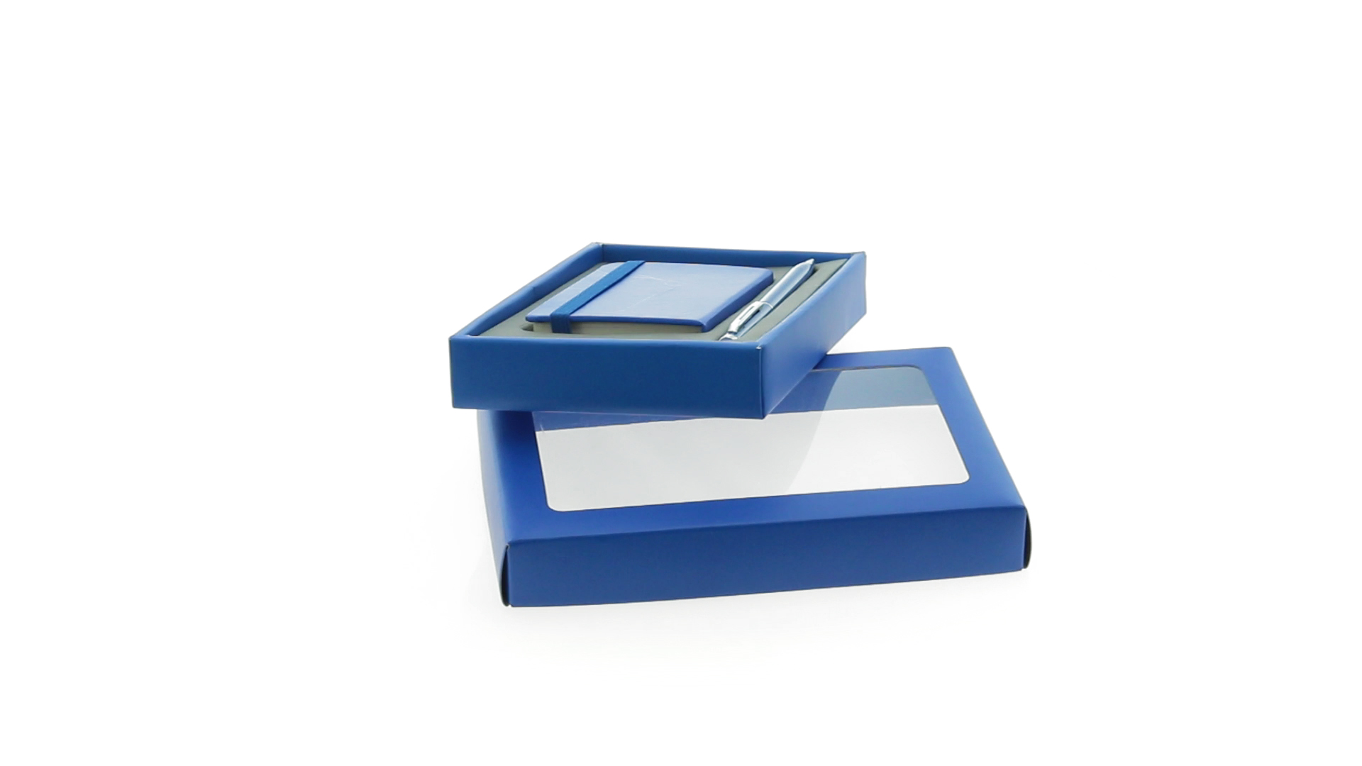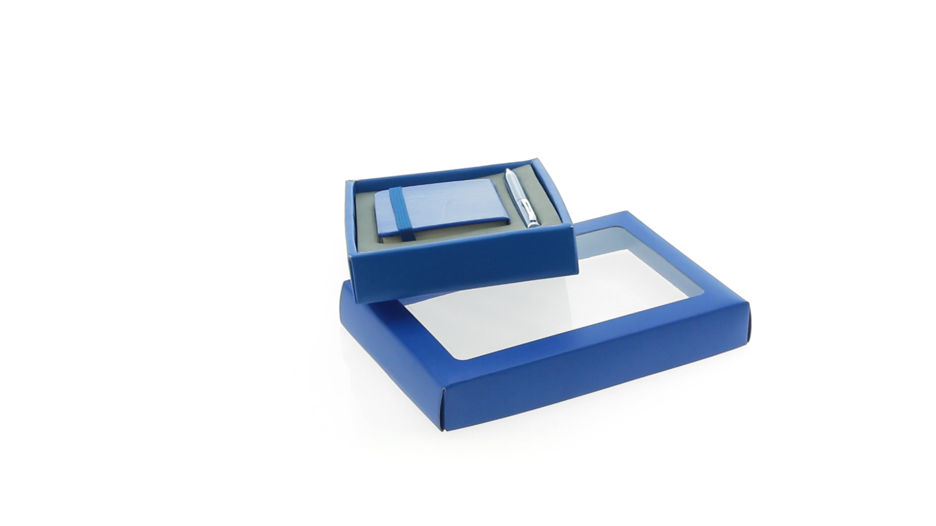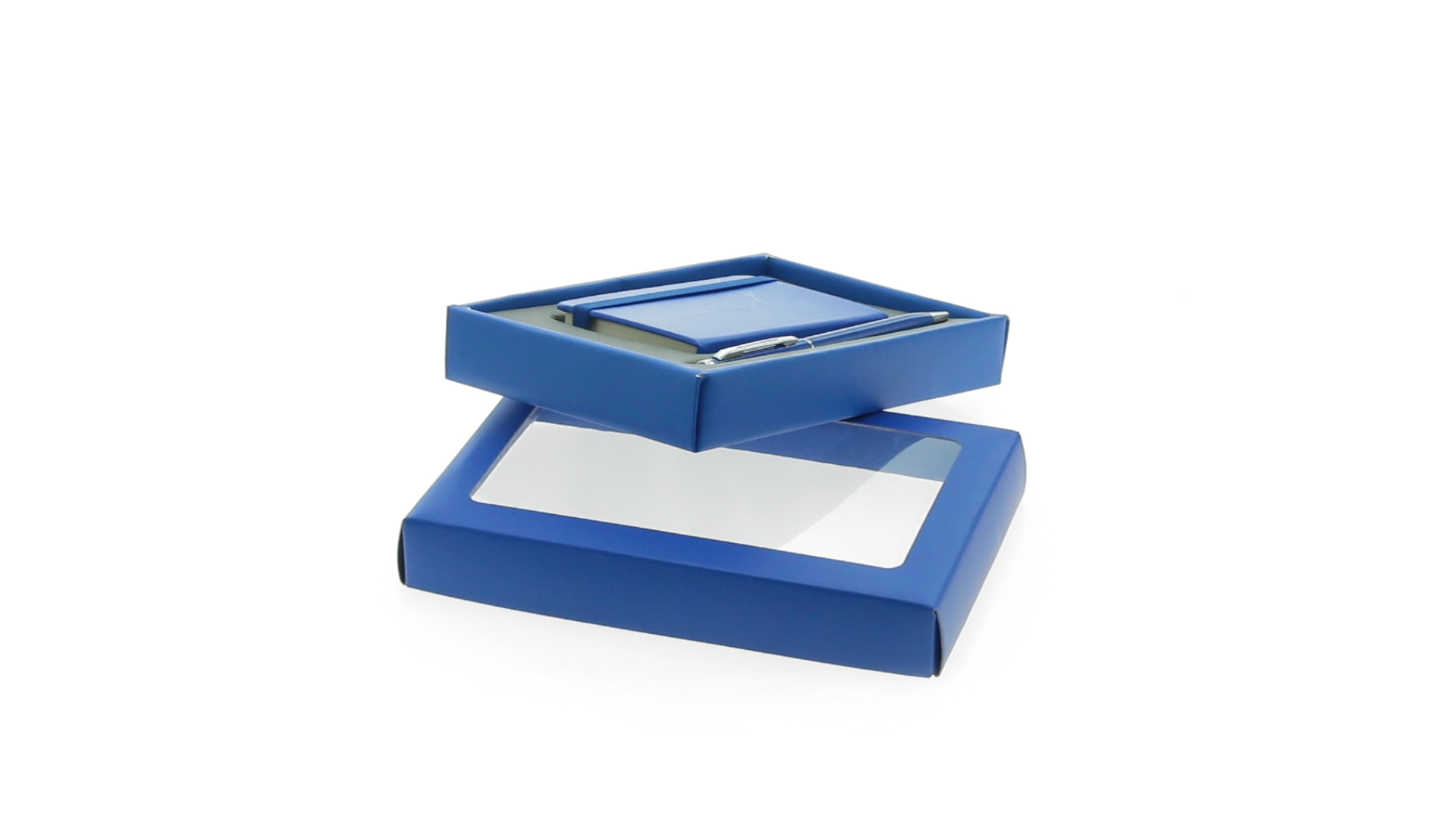 Set aus Notizblock mit Soft-Touch-Cover aus Kunstleder und Aluminium-Kugelschreiber mit farblich passendem Stylus. Mit 80 Blättern, Gummibandverschluss und farblich passendem Lesezeichenband. Präsentiert in einer eleganten Schachtel aus Karton in passender Farbe, mit Fenster und weichem Schaumstoff mit Stanzung im Inneren. Kugelschreiber mit blauer Tinte.