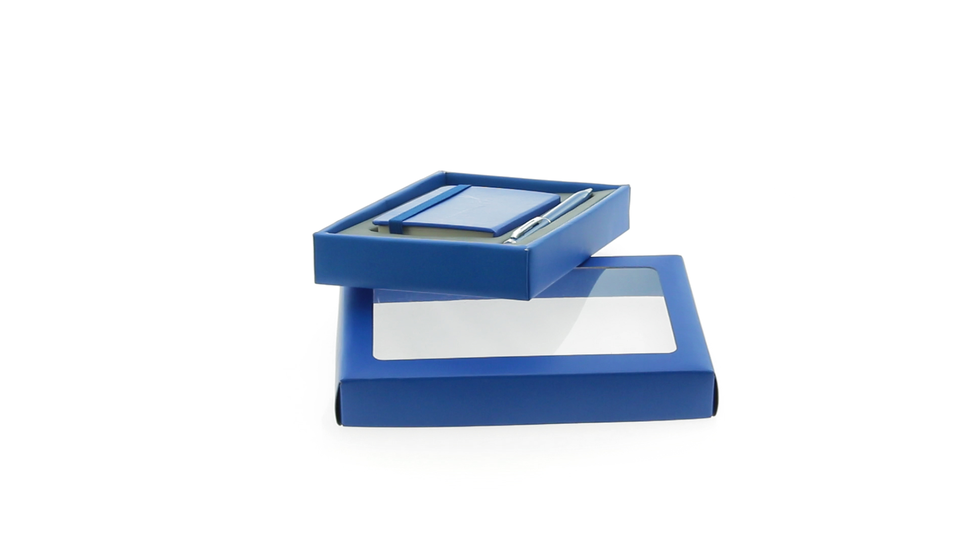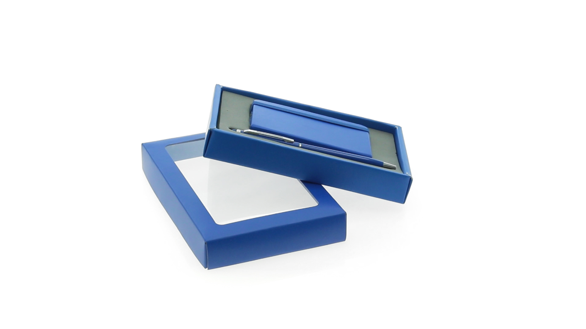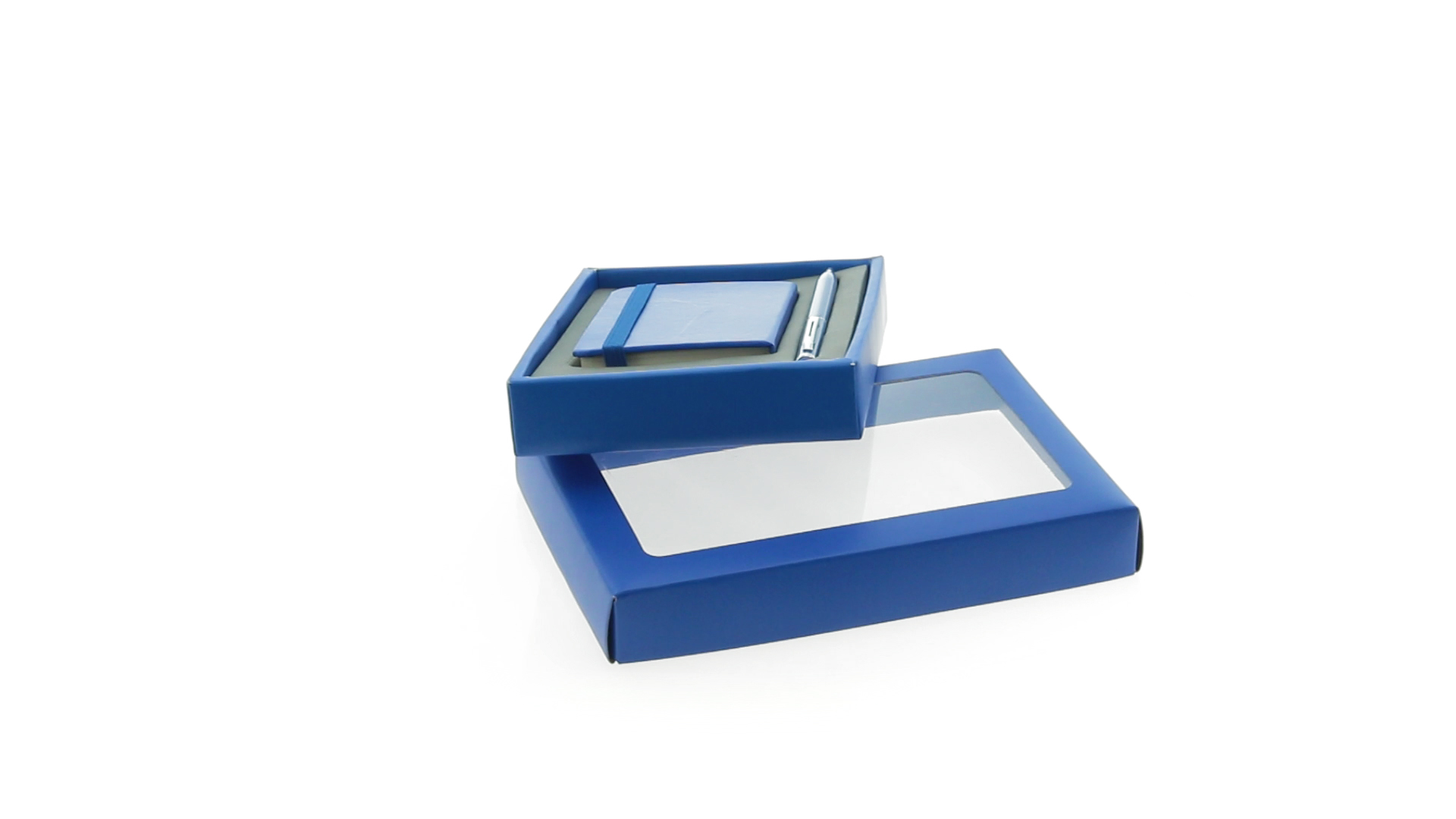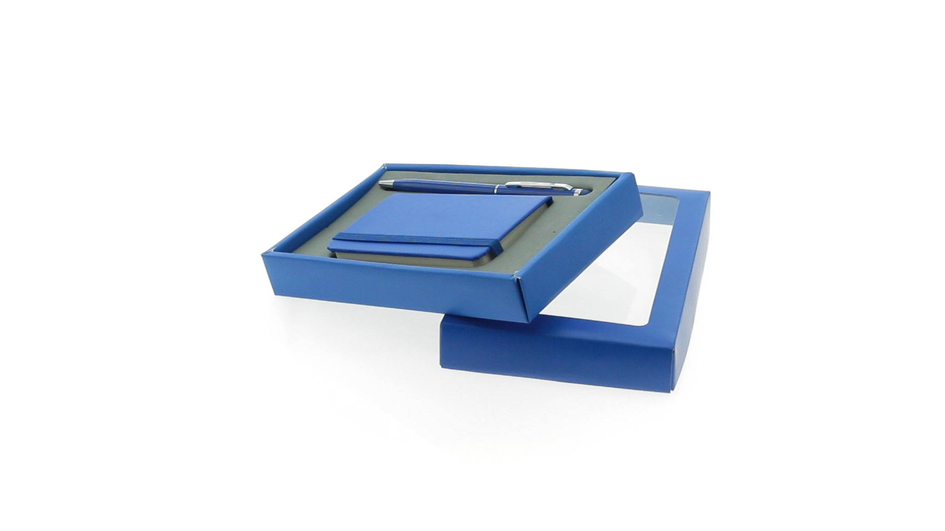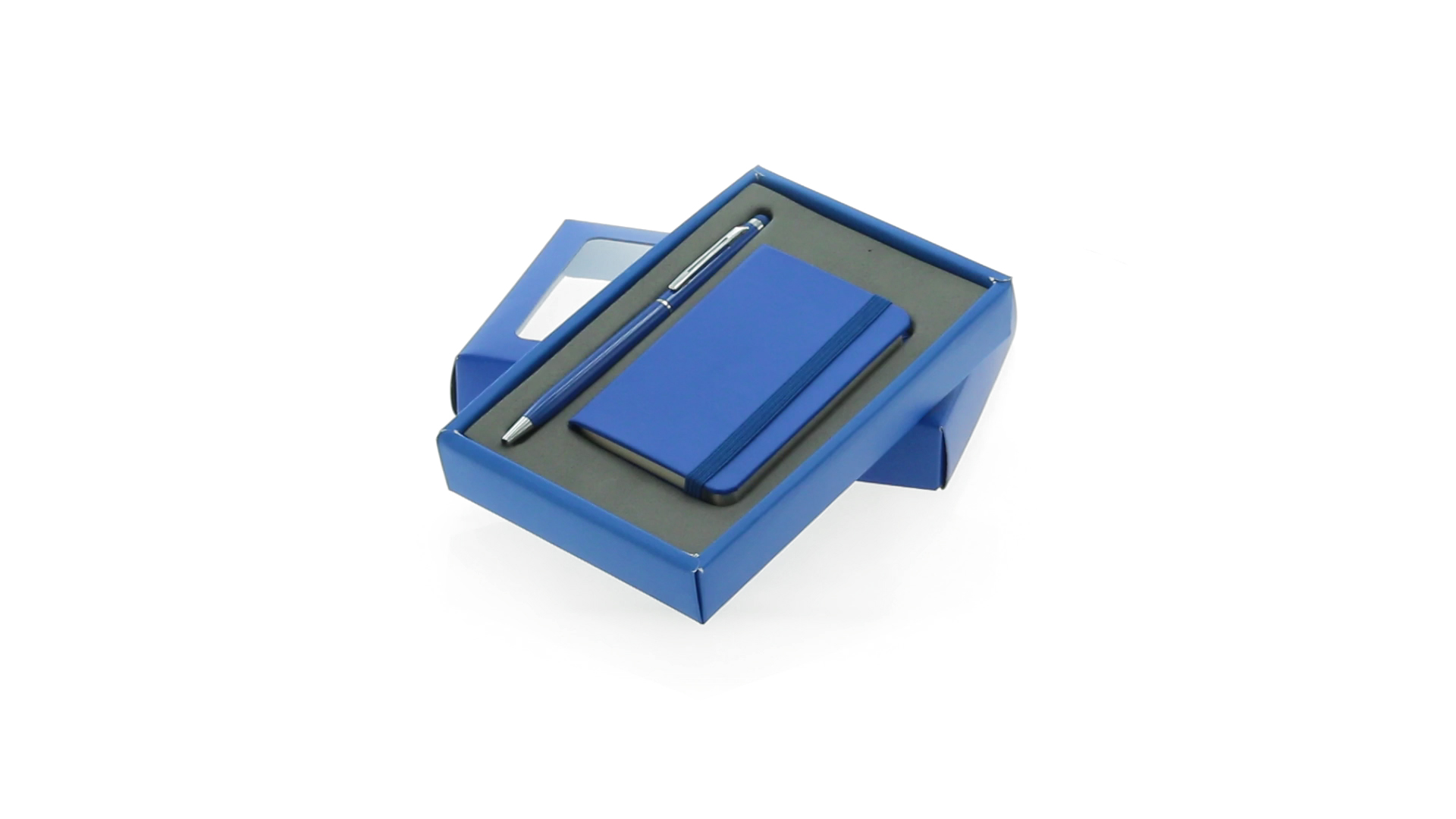 Set aus Notizblock mit Soft-Touch-Cover aus Kunstleder und Aluminium-Kugelschreiber mit farblich passendem Stylus. Mit 80 Blättern, Gummibandverschluss und farblich passendem Lesezeichenband. Präsentiert in einer eleganten Schachtel aus Karton in passender Farbe, mit Fenster und weichem Schaumstoff mit Stanzung im Inneren. Kugelschreiber mit blauer Tinte.