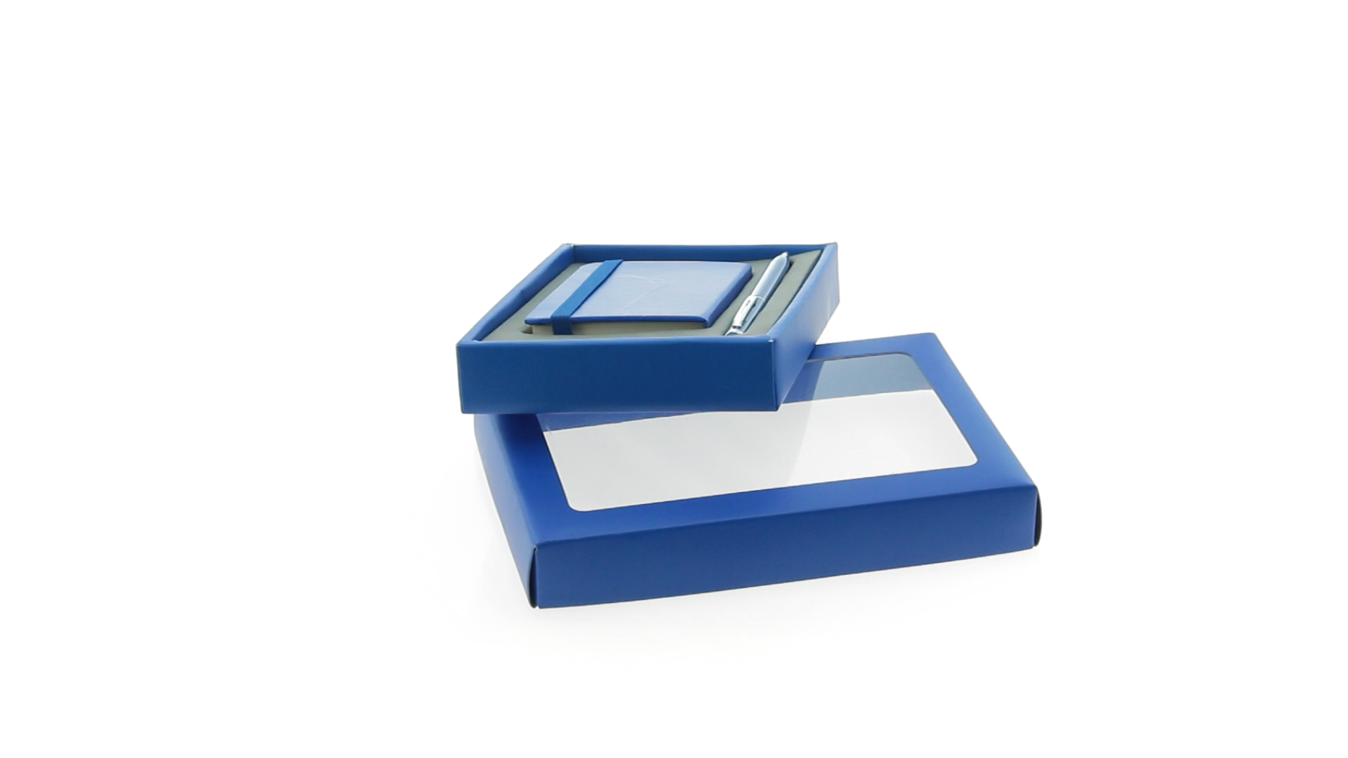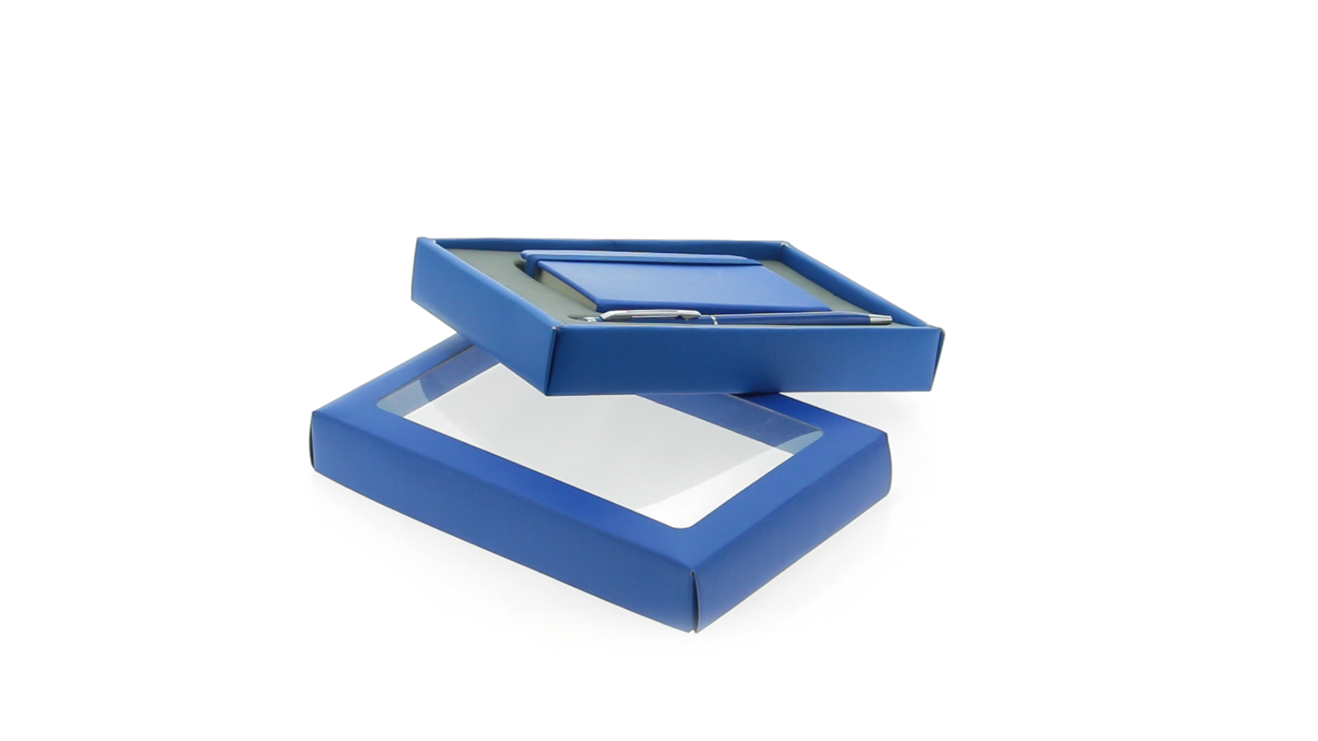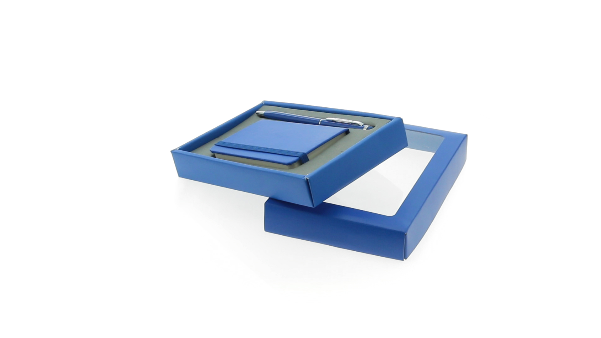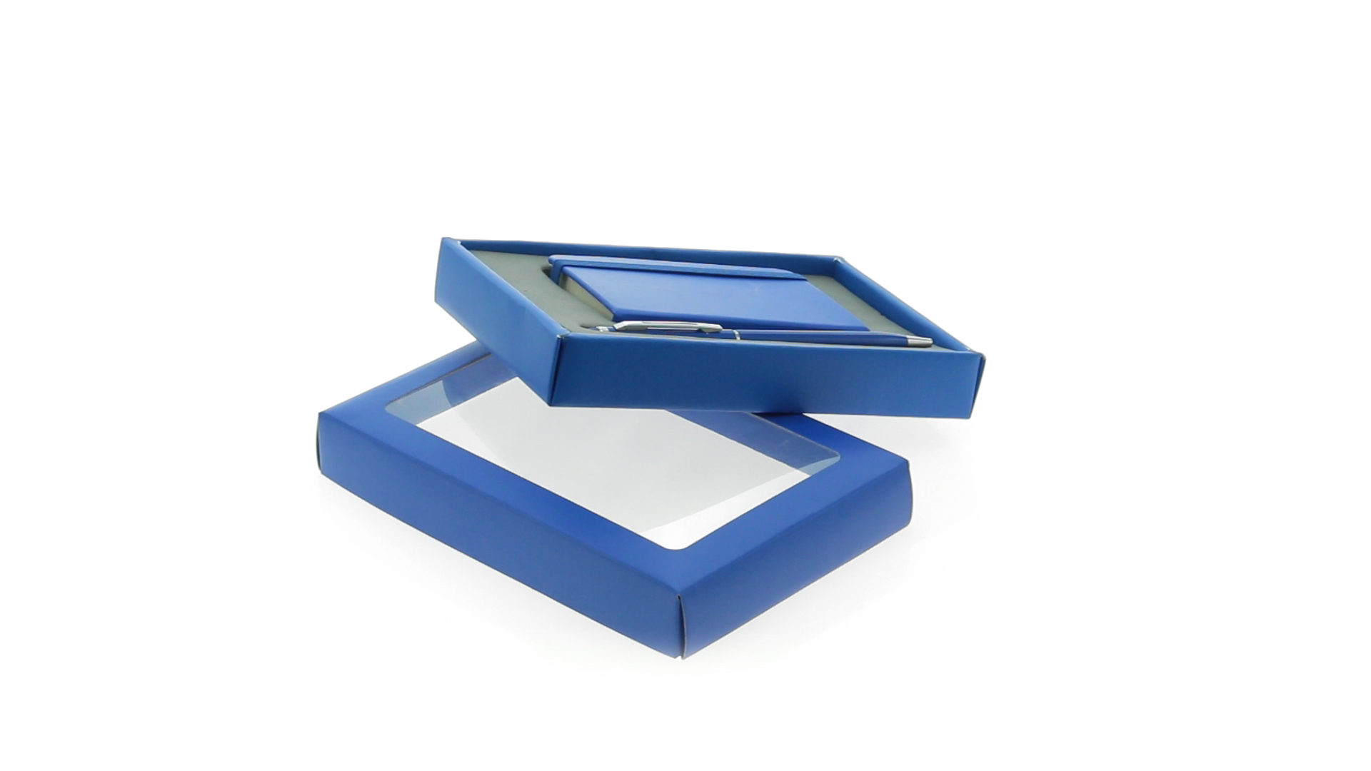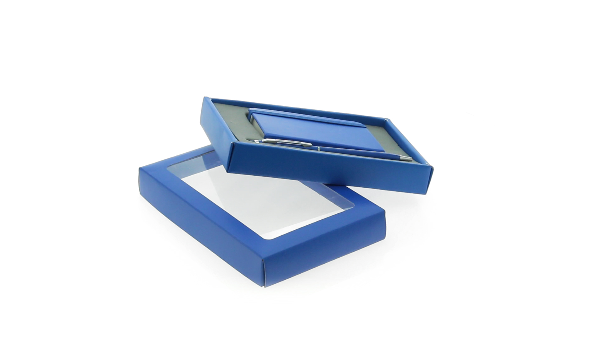 Set aus Notizblock mit Soft-Touch-Cover aus Kunstleder und Aluminium-Kugelschreiber mit farblich passendem Stylus. Mit 80 Blättern, Gummibandverschluss und farblich passendem Lesezeichenband. Präsentiert in einer eleganten Schachtel aus Karton in passender Farbe, mit Fenster und weichem Schaumstoff mit Stanzung im Inneren. Kugelschreiber mit blauer Tinte.
