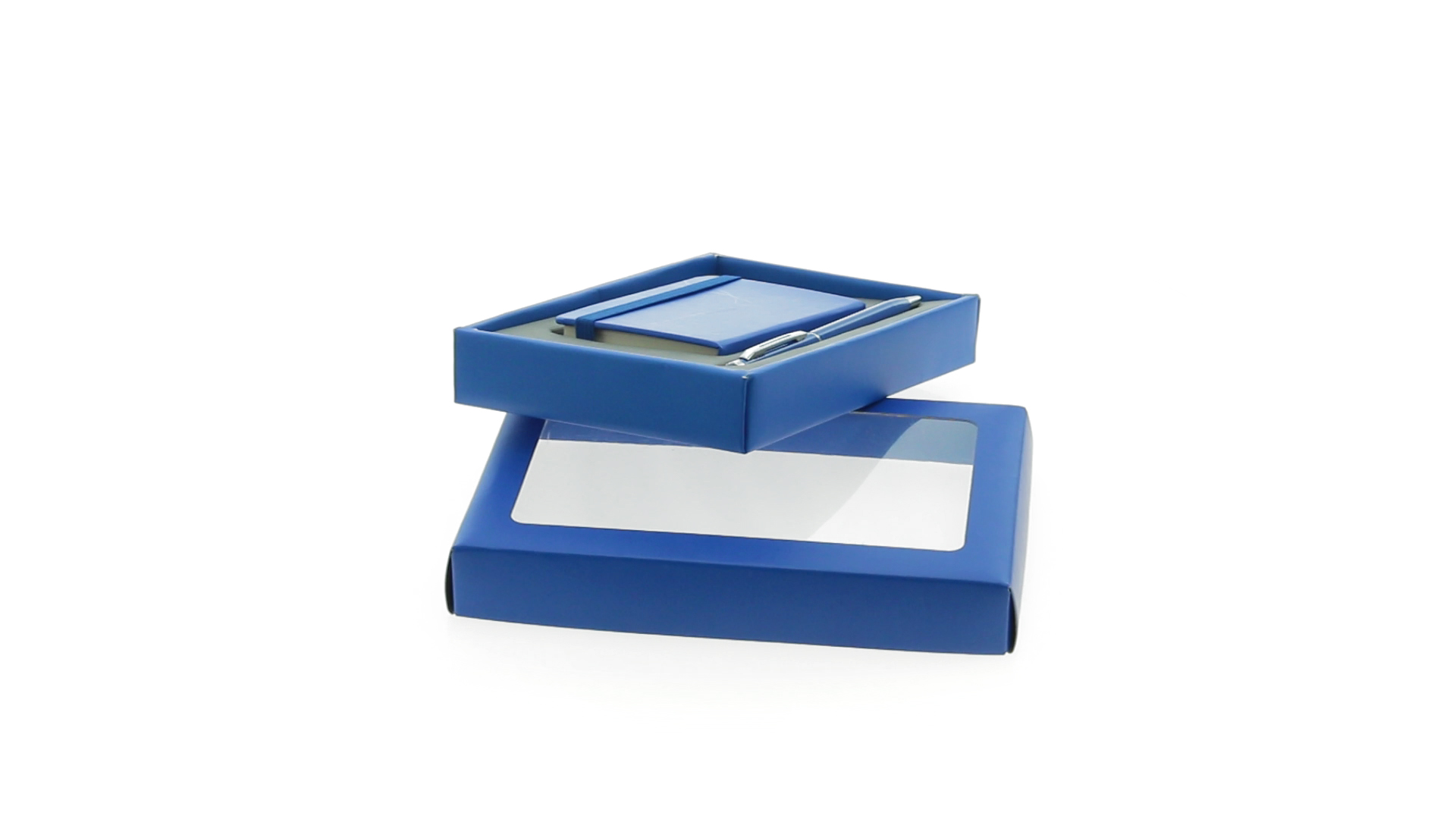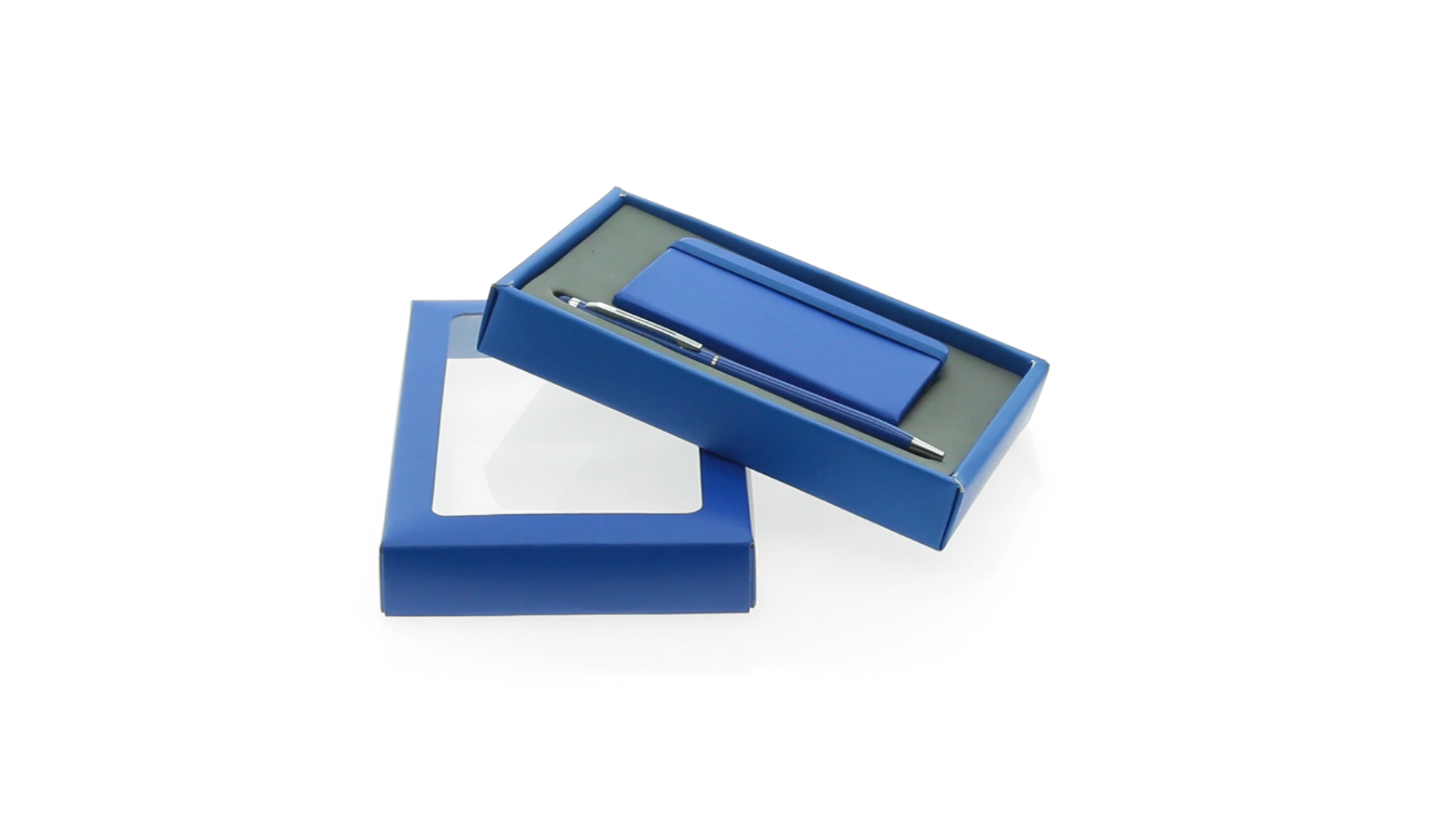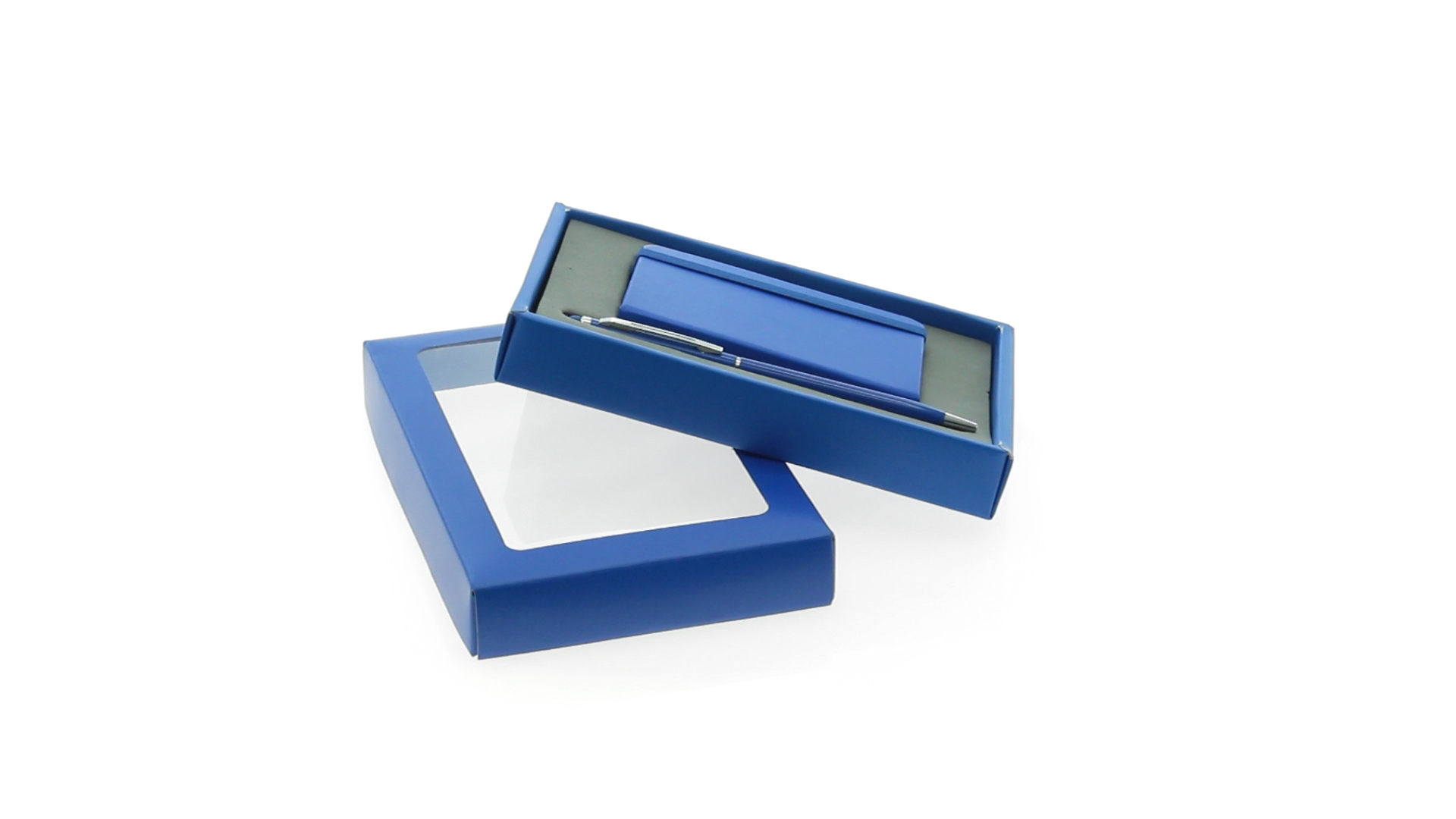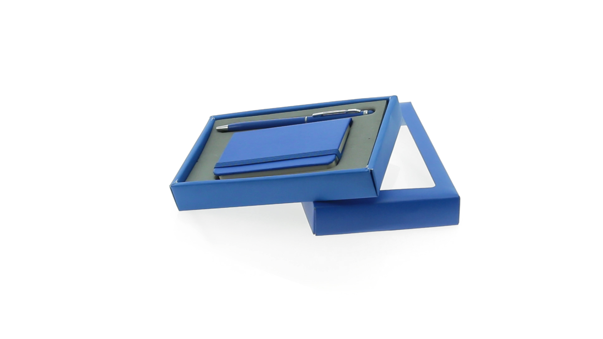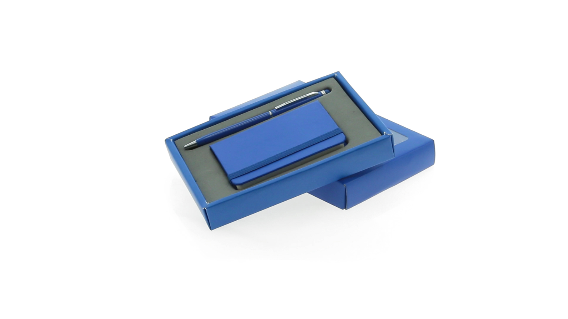 Set aus Notizblock mit Soft-Touch-Cover aus Kunstleder und Aluminium-Kugelschreiber mit farblich passendem Stylus. Mit 80 Blättern, Gummibandverschluss und farblich passendem Lesezeichenband. Präsentiert in einer eleganten Schachtel aus Karton in passender Farbe, mit Fenster und weichem Schaumstoff mit Stanzung im Inneren. Kugelschreiber mit blauer Tinte.