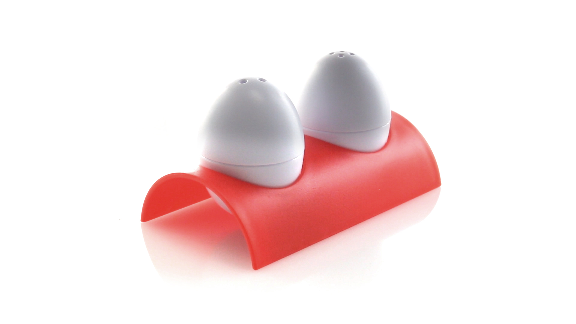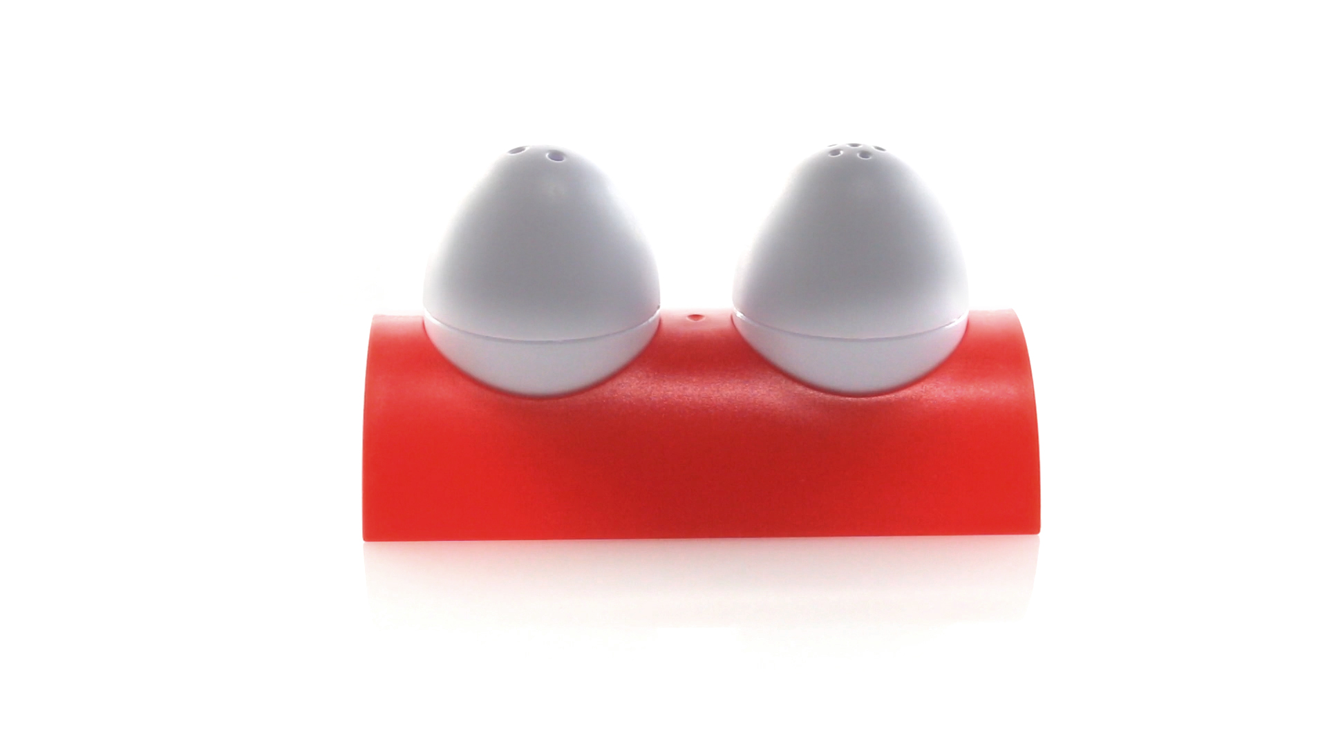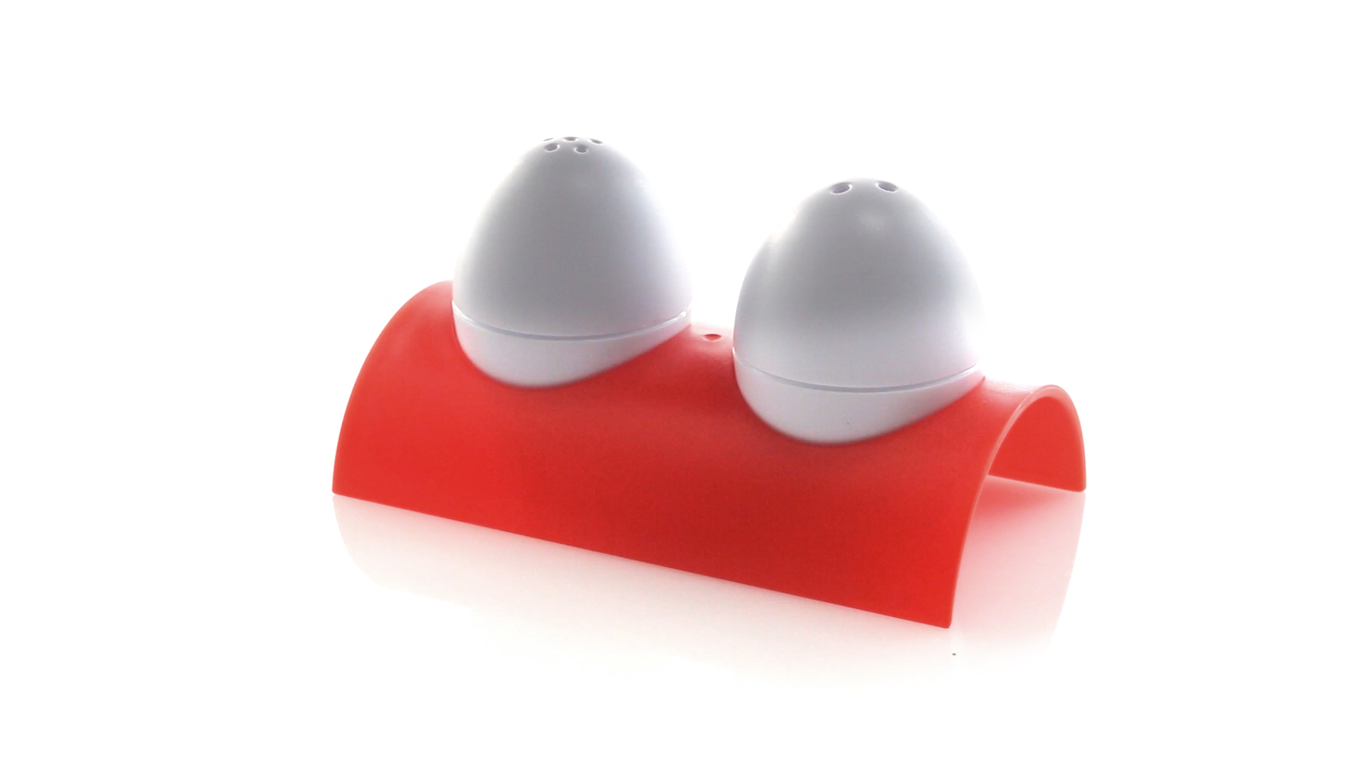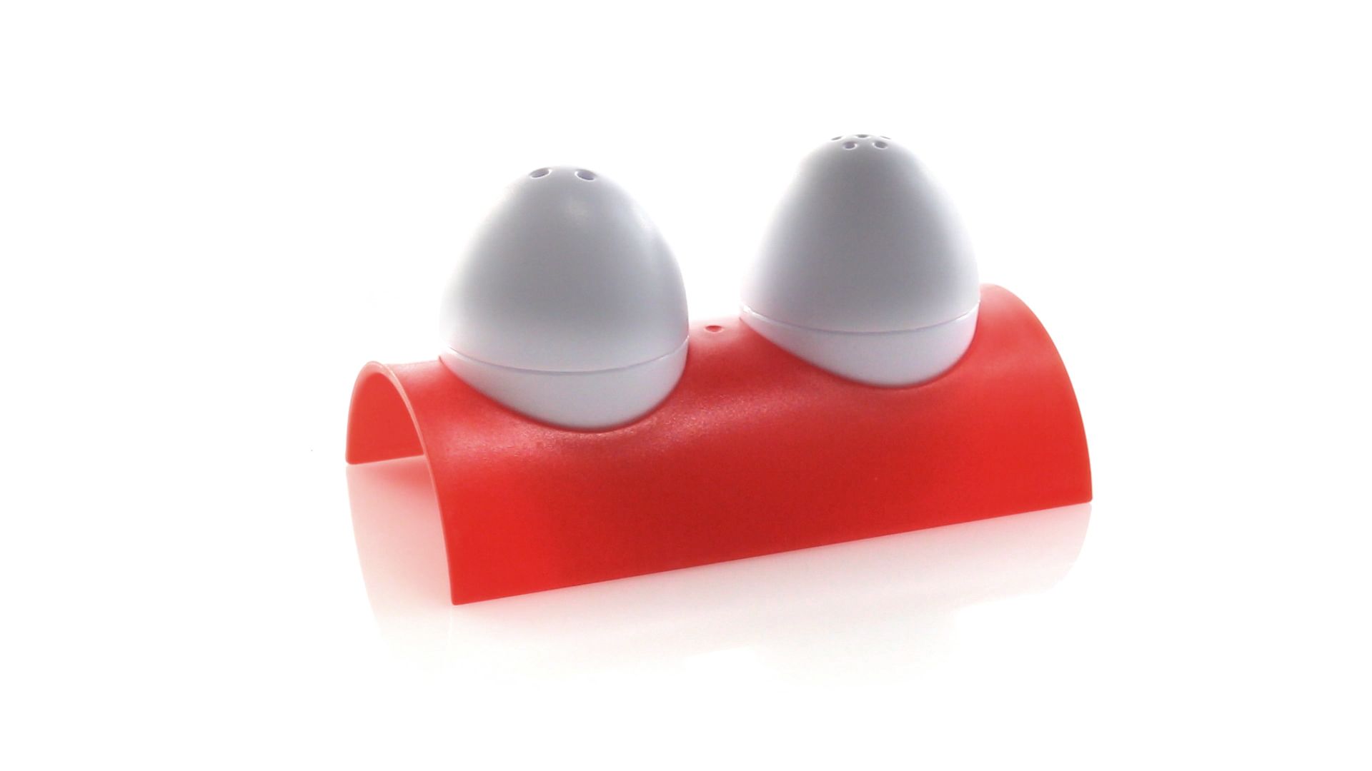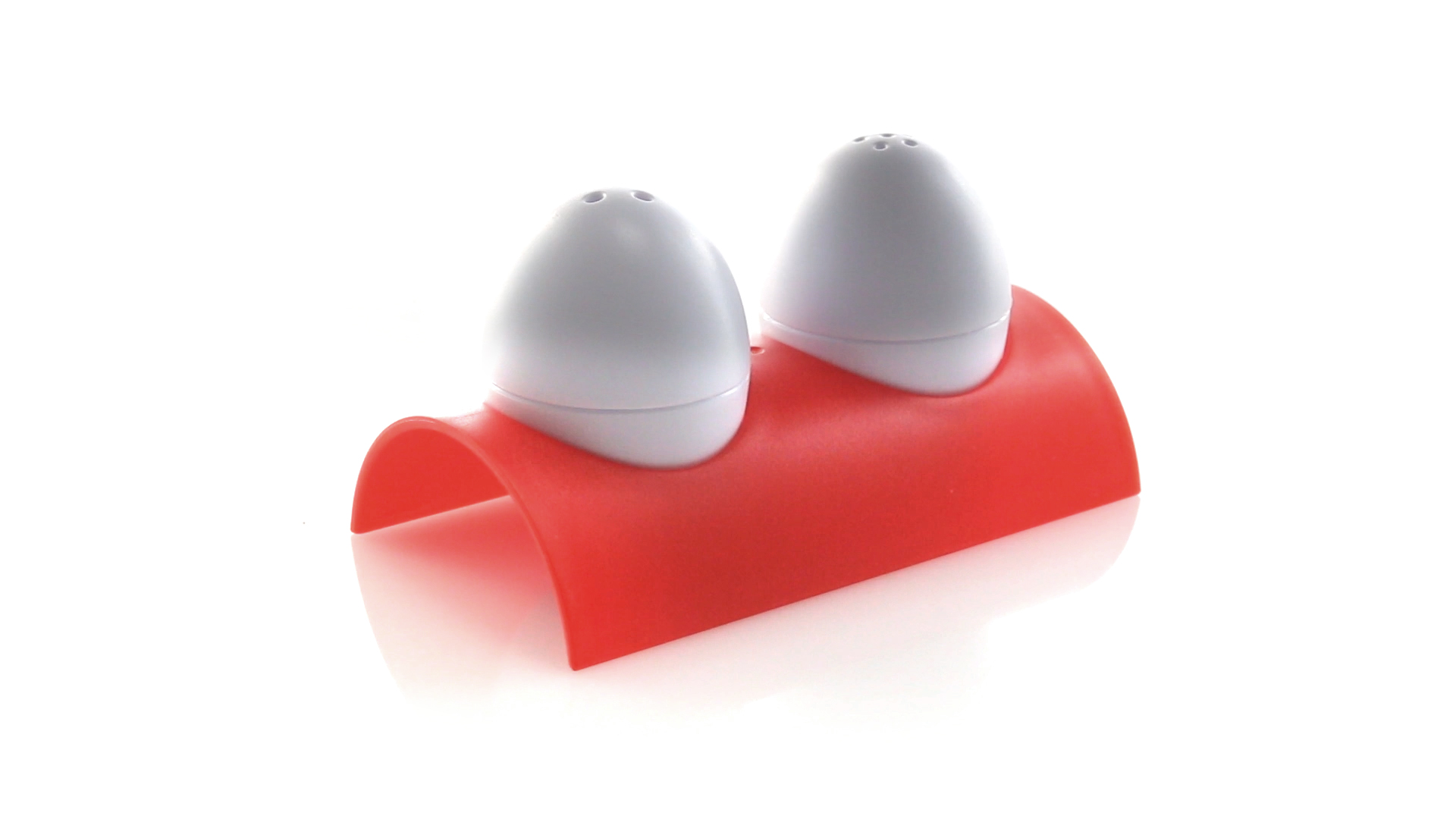 Originelles Set aus Salz- und Pfefferstreuer mit Ständer in verschiedenen Farbkombinationen.