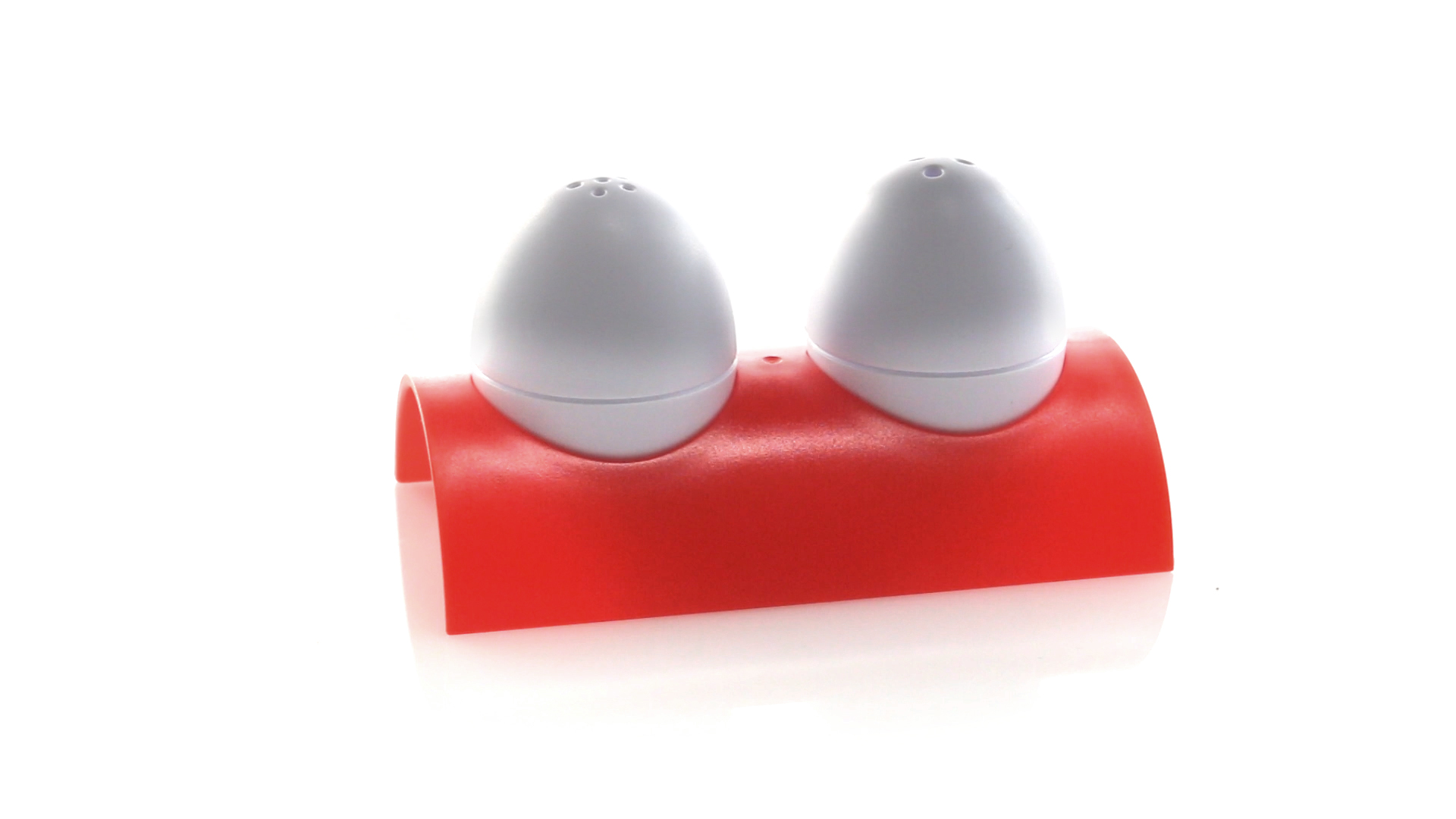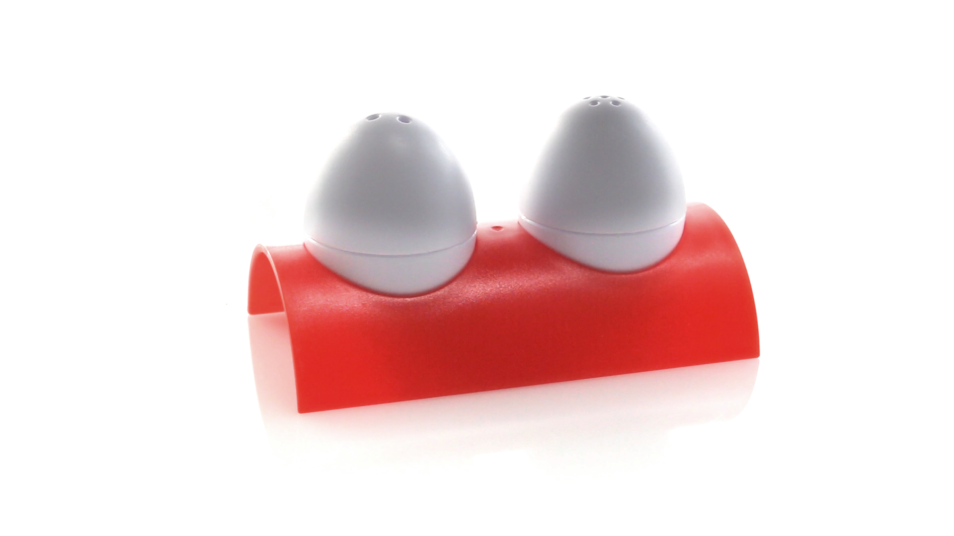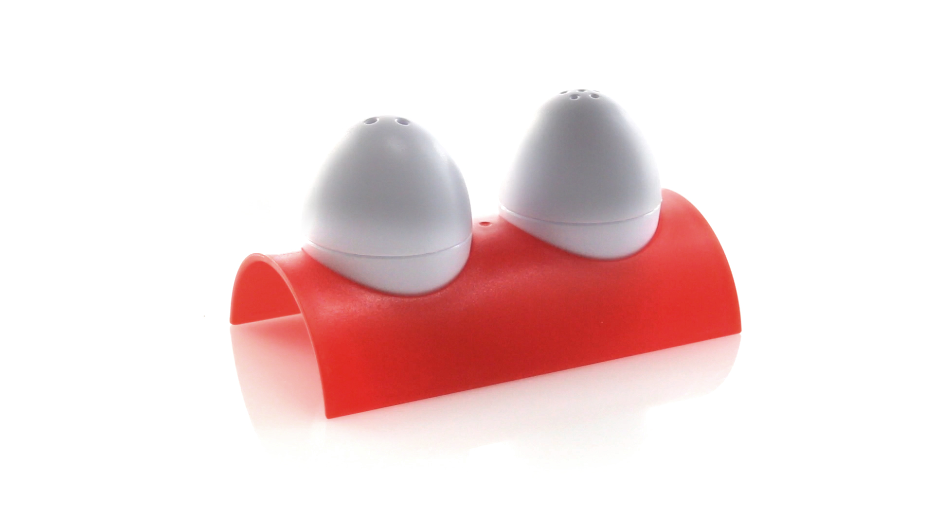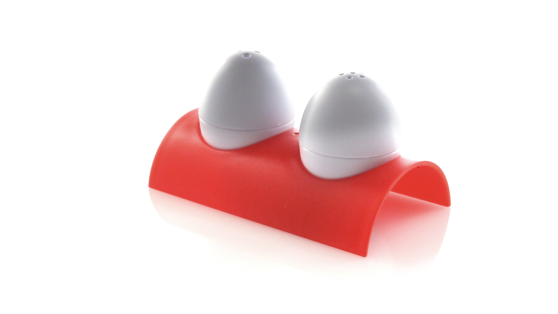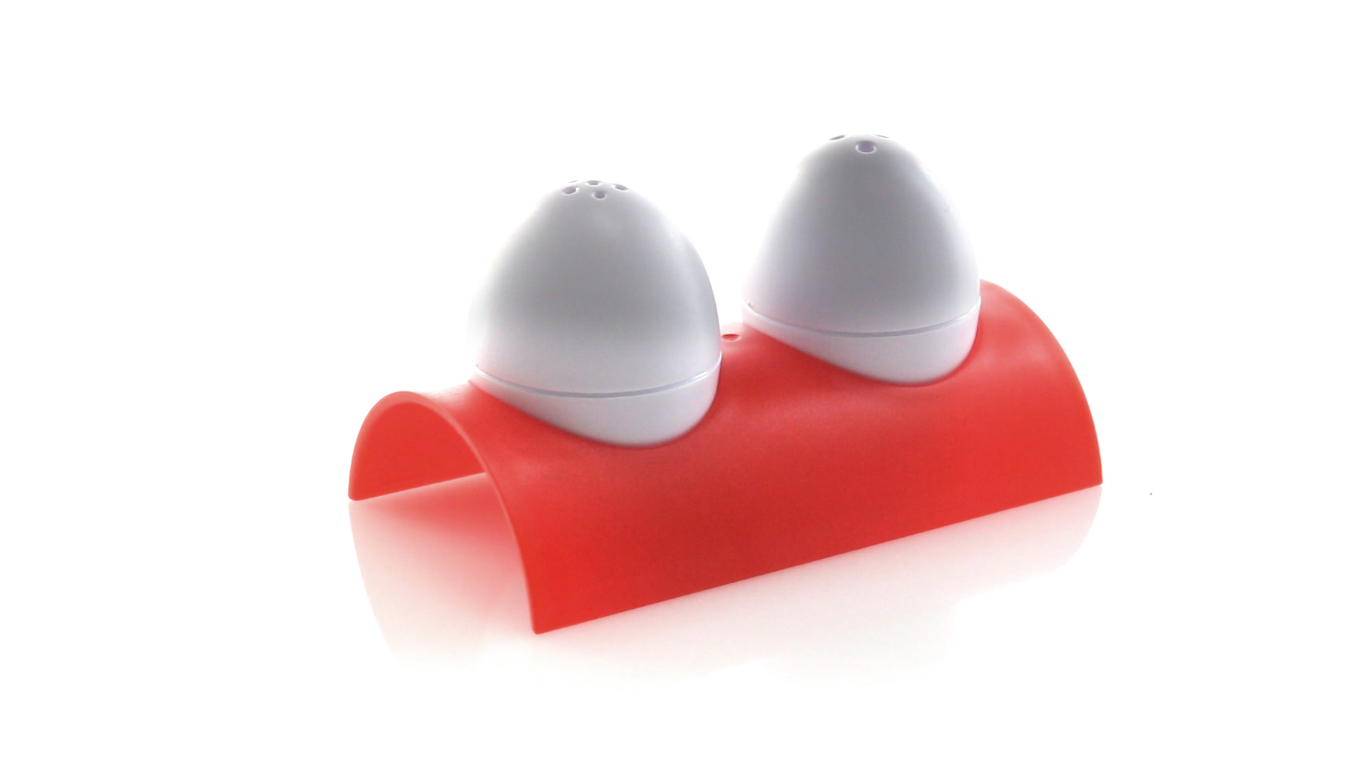 Originelles Set aus Salz- und Pfefferstreuer mit Ständer in verschiedenen Farbkombinationen.