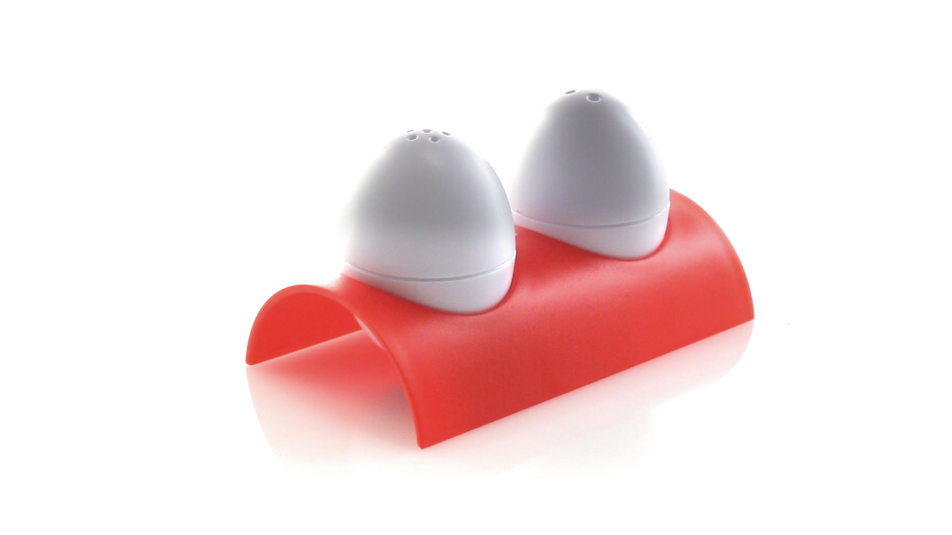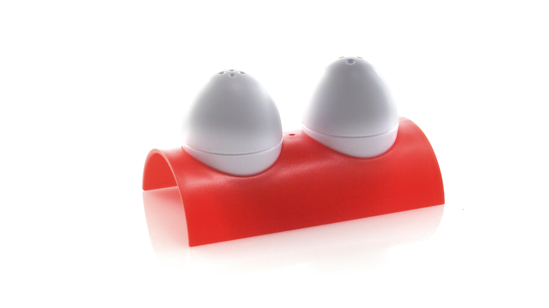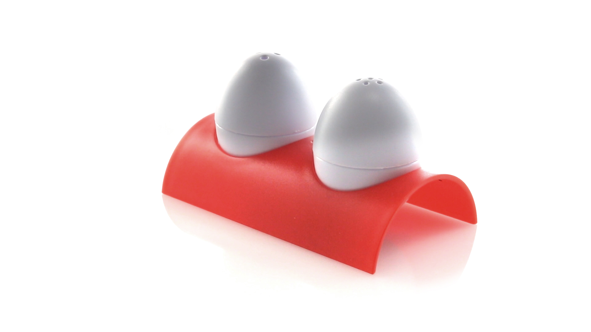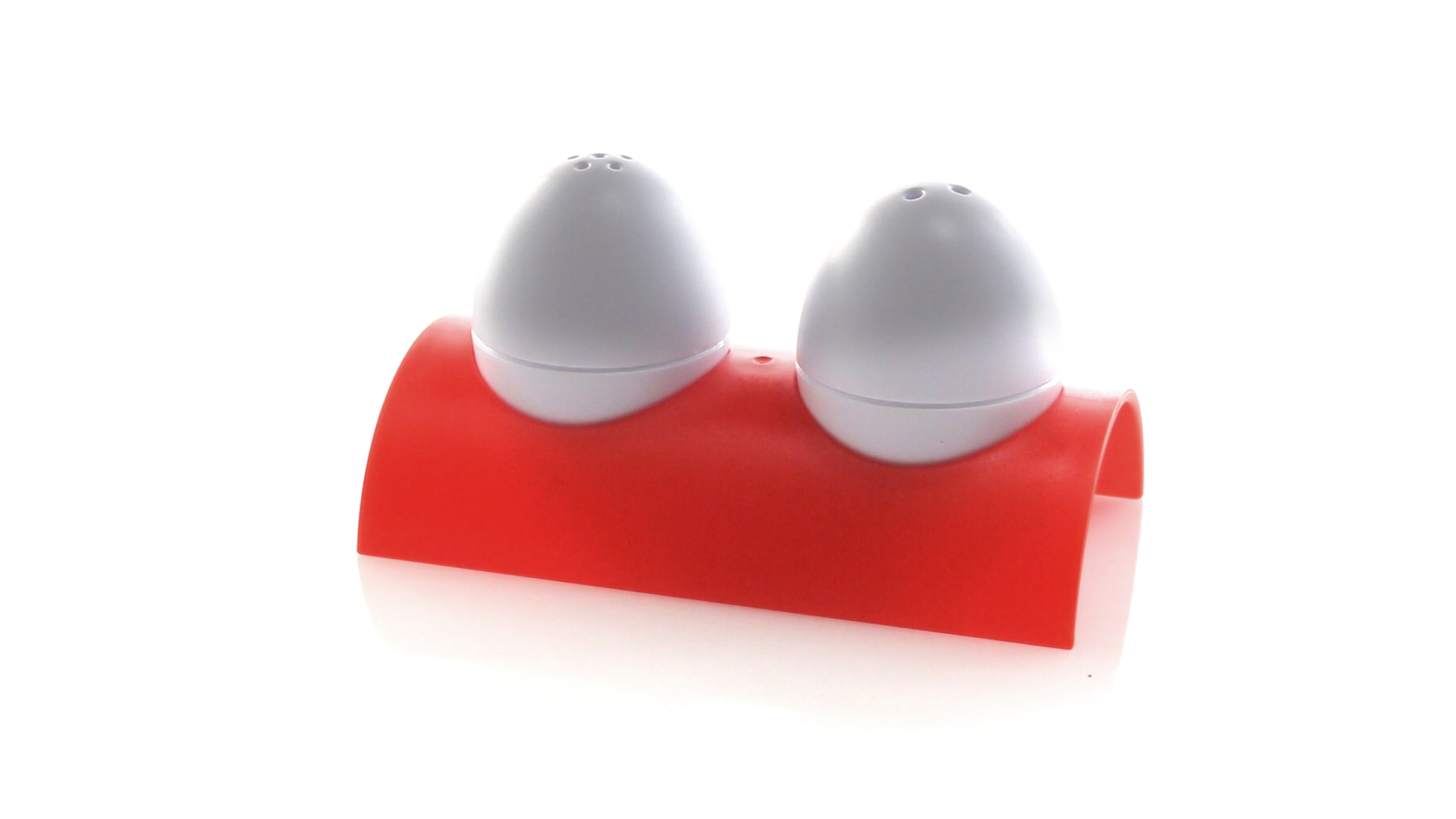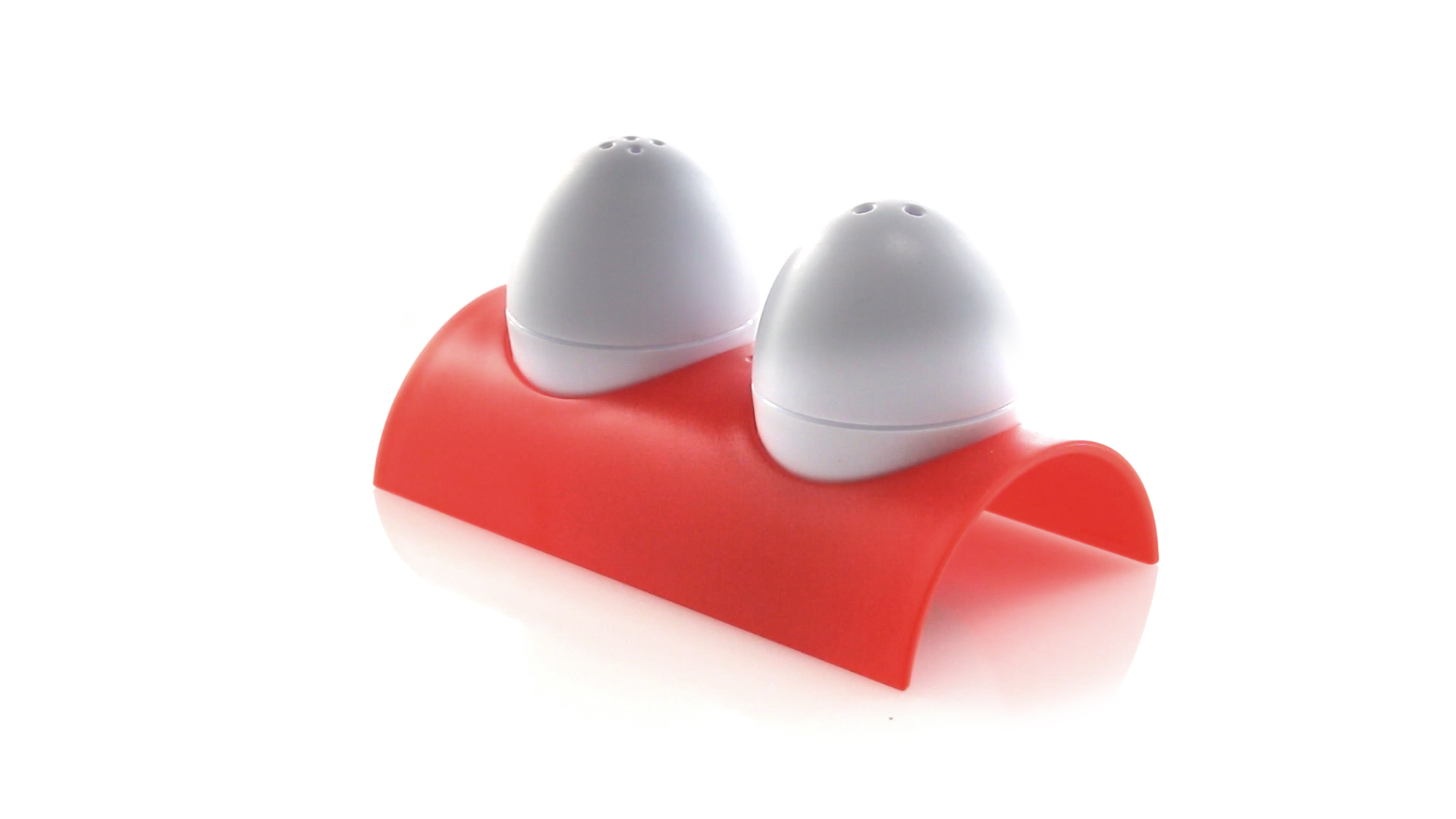 Originelles Set aus Salz- und Pfefferstreuer mit Ständer in verschiedenen Farbkombinationen.