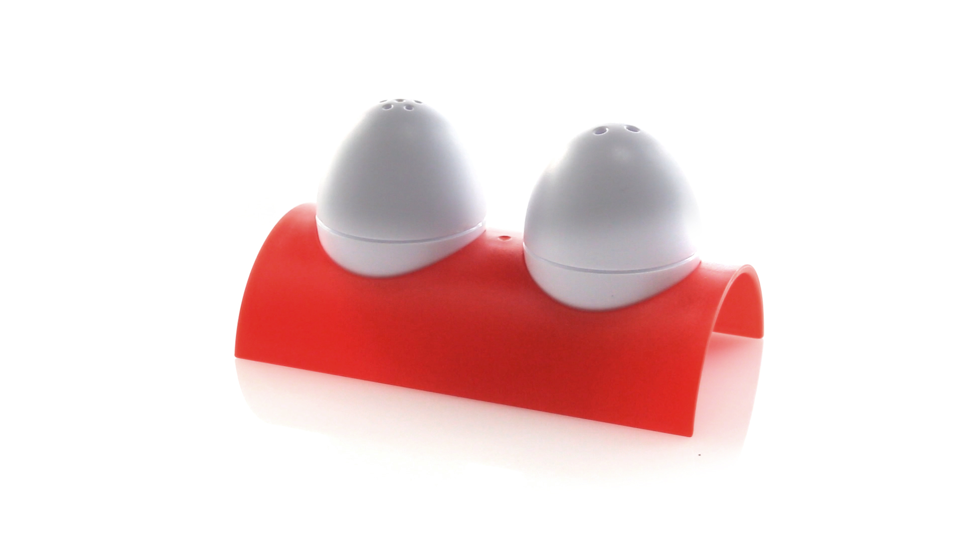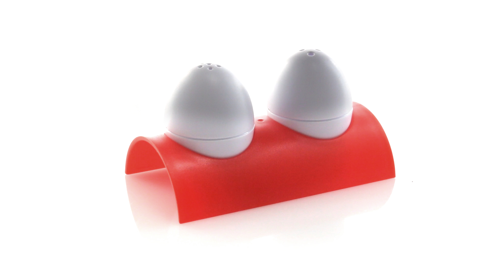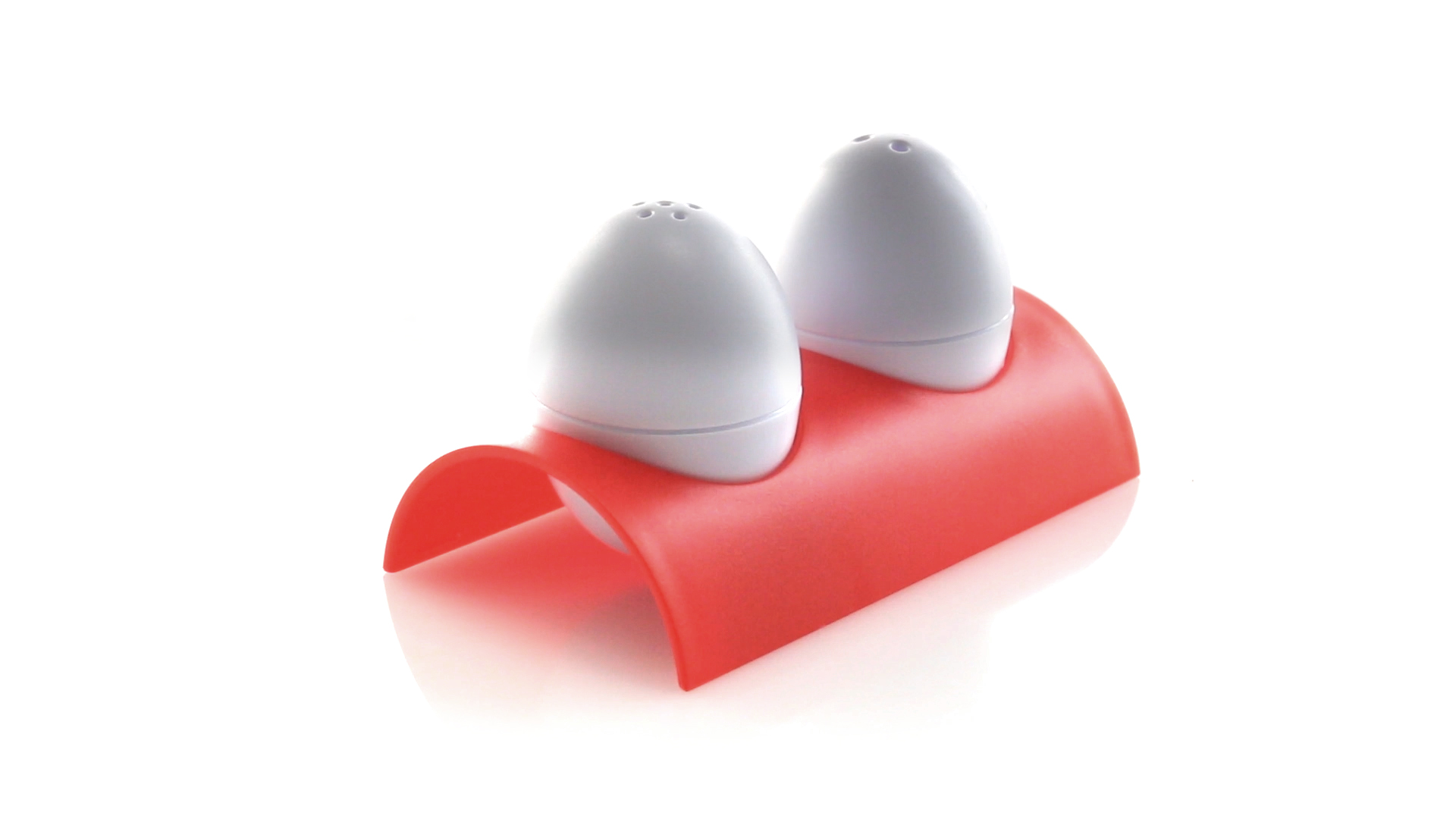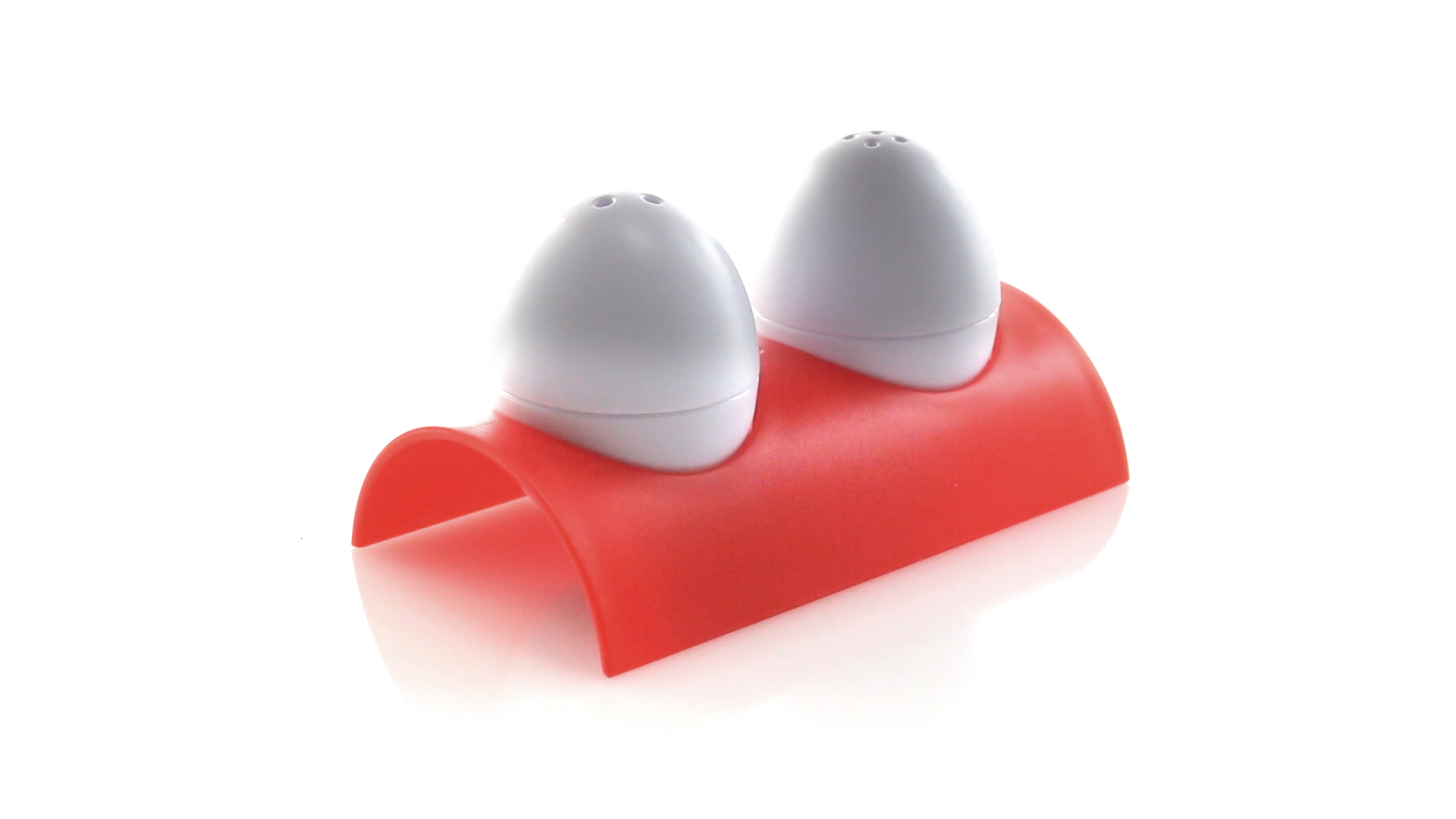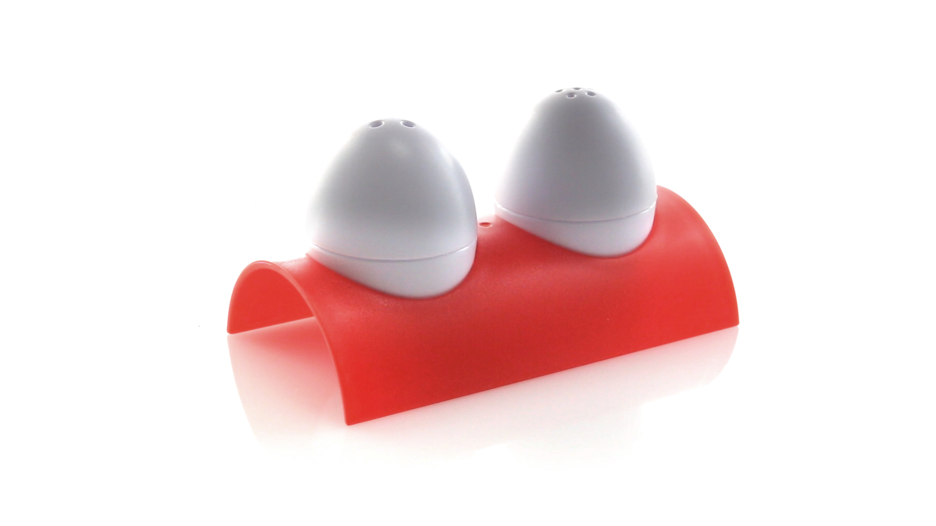 Originelles Set aus Salz- und Pfefferstreuer mit Ständer in verschiedenen Farbkombinationen.