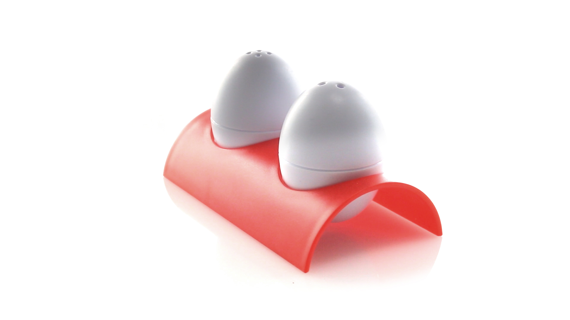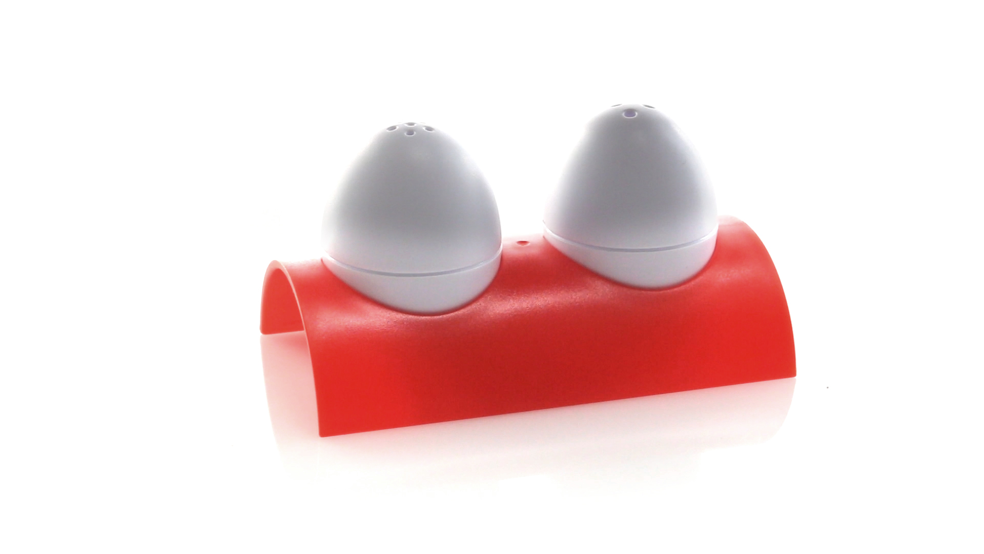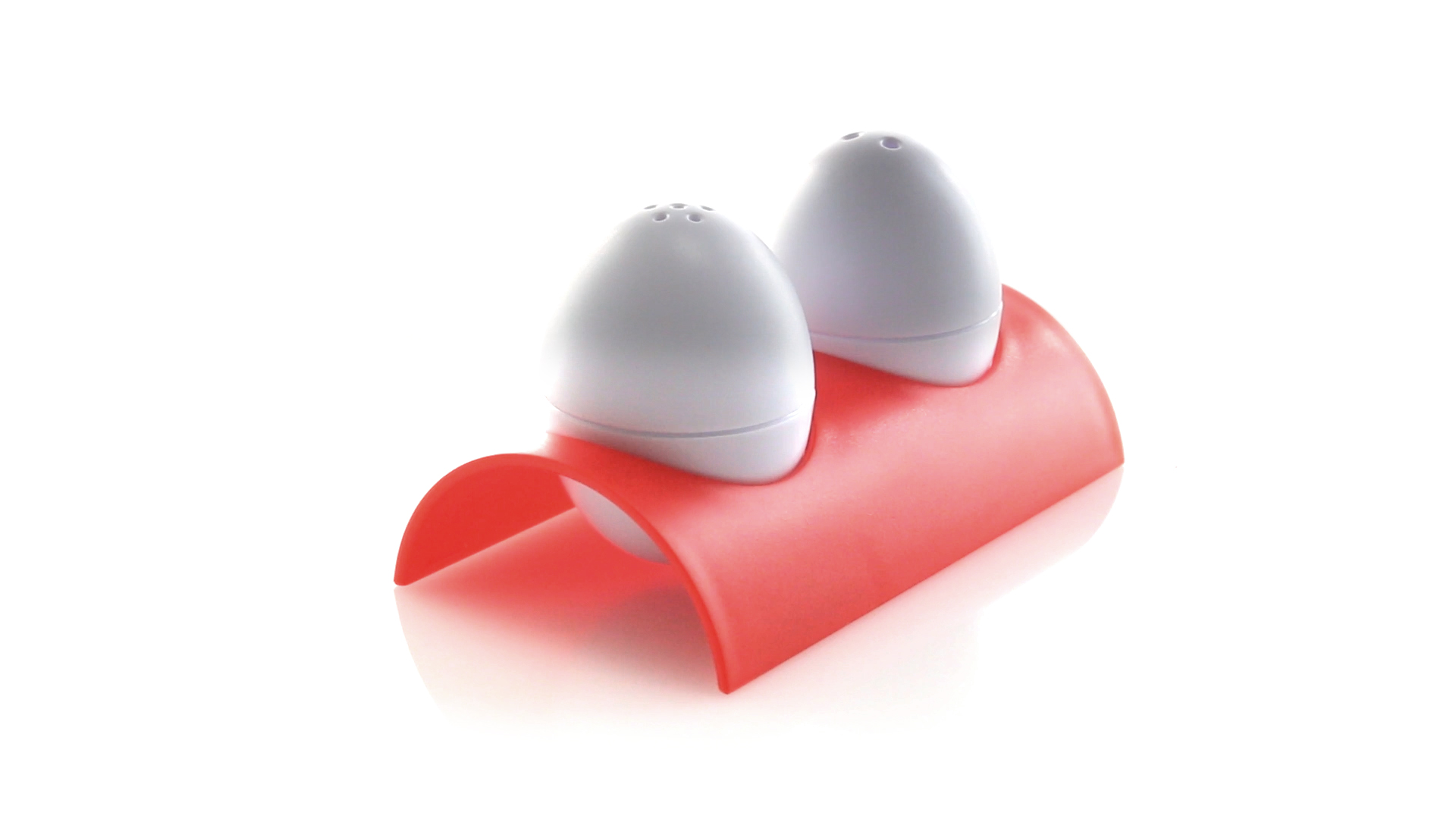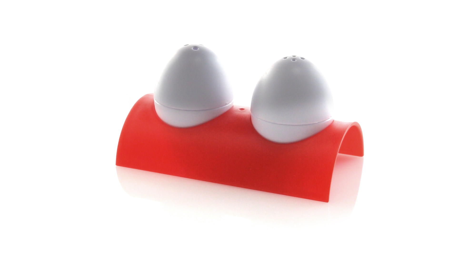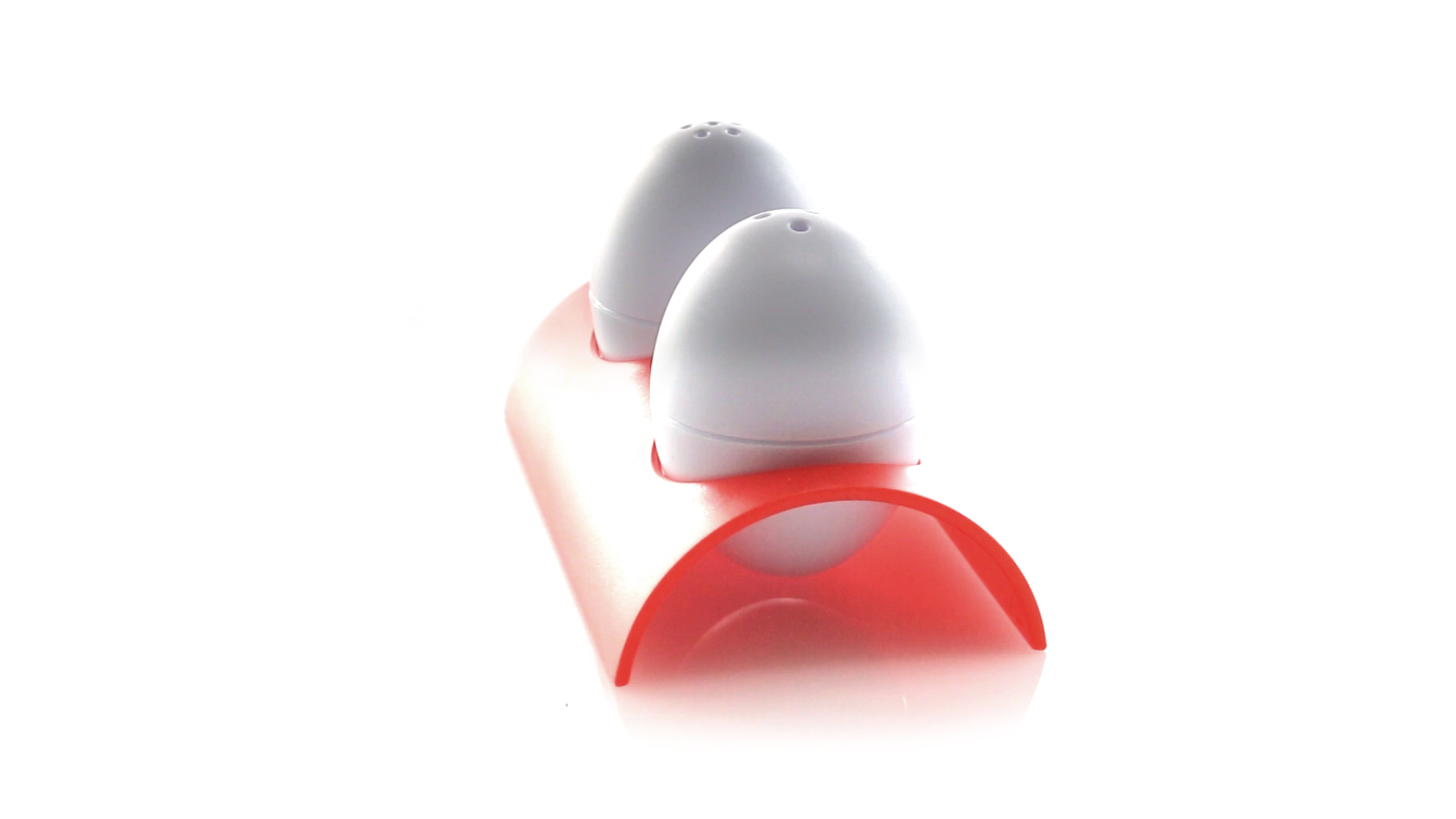 Originelles Set aus Salz- und Pfefferstreuer mit Ständer in verschiedenen Farbkombinationen.